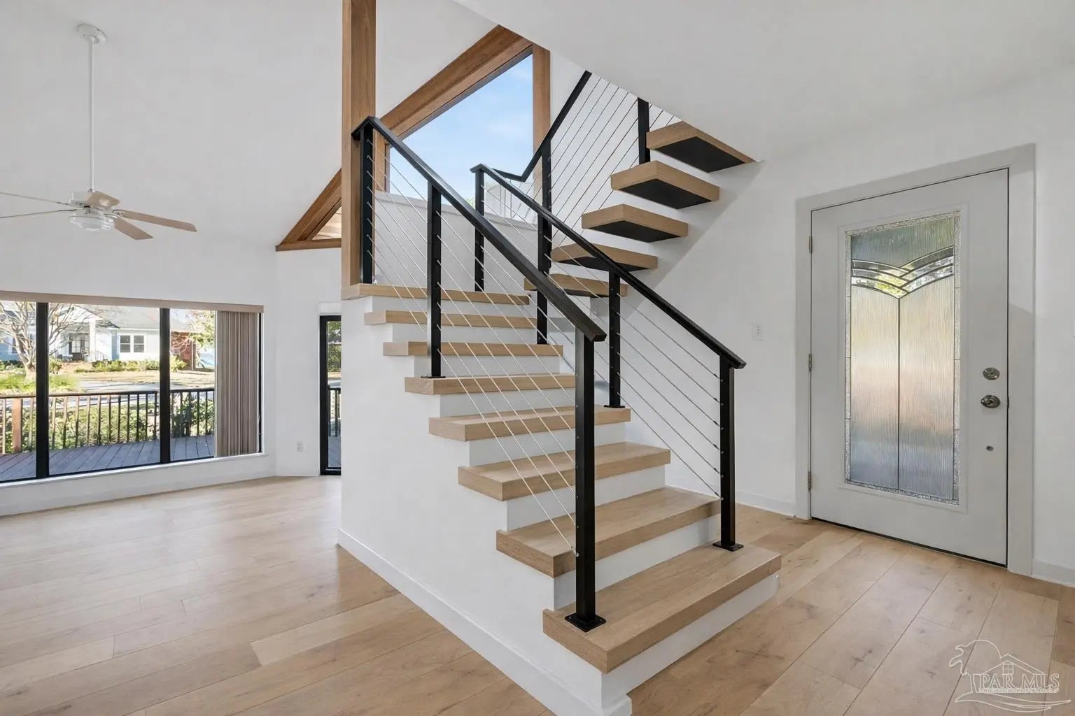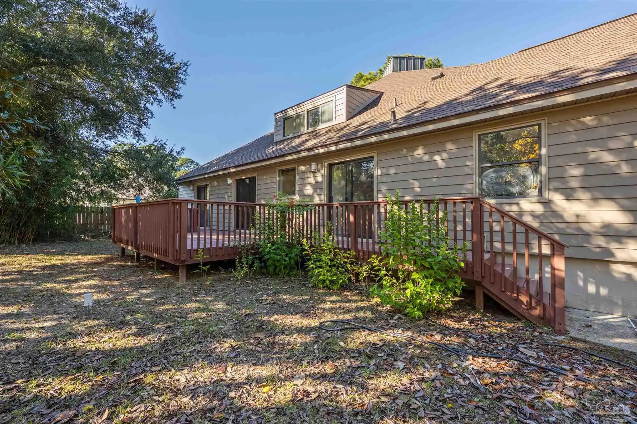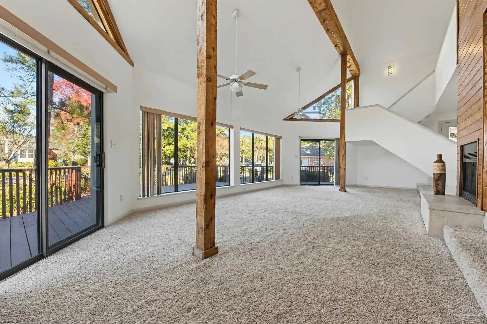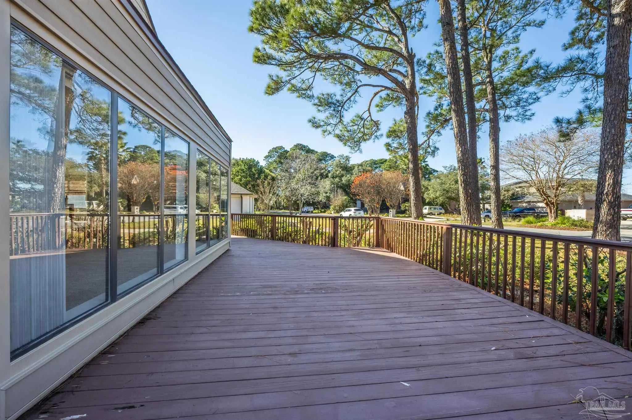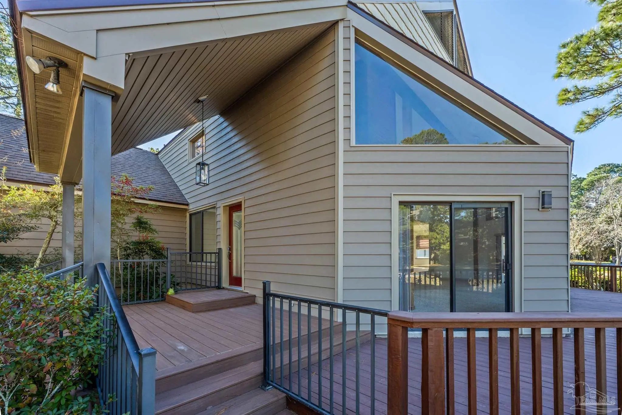 CONTEMPORARY MODERN DESIGN WITH A WATER VIEW and zoned for A-rated Gulf Breeze schools! This spacious, one-of-a-kind home provides 2,913 sf of thoughtfully designed living space in a wonderful, tree-lined, bayfront neighborhood. With four bedrooms and two full bathrooms, you will discover a light drenched, open and functional layout with partial views of the bay across the street. This location is perfect for those desiring to be close to the water, the beautiful beaches and essential amenities. This home immediately stands out with its unique architectural design. Step inside and you'll be greeted by cathedral ceilings, large windows and a mix of beautiful flooring including classic hardwood, sleek tile, and cozy carpet, each thoughtfully placed to enhance the home's charm and character. A sunken living room surrounded by huge windows, a beautiful wooden beam and a soaring wooden fireplace is the perfect place to relax. The centerpiece of the home is its stunning kitchen, featuring gleaming granite countertops and a ton of cabinets which provide ample space for cooking and entertaining. A breakfast/ dining room just off of the kitchen allows enough space for a large dining set and offers water views through the sliding glass door leading onto the expansive front deck. Three additional bedrooms and one bath are also located on the first level, with all bedrooms having direct access to the large back deck. The back yard offers privacy and a park-like setting with enough room for a pool! The entire second floor contains the primary suite dreams are made of, complete with full bath, vaulted ceilings, a lovely sitting area and a fireplace. The thoughtful design of the home creates inviting spaces for gatherings or quiet evenings at home, yet enough privacy for all dwellers and guests. Enjoy a 2 car garage and amazing wrap around porches on the front and back. Must be seend in person to fully appreciate all that this remarkable home has to offer! Schedule your showing!
