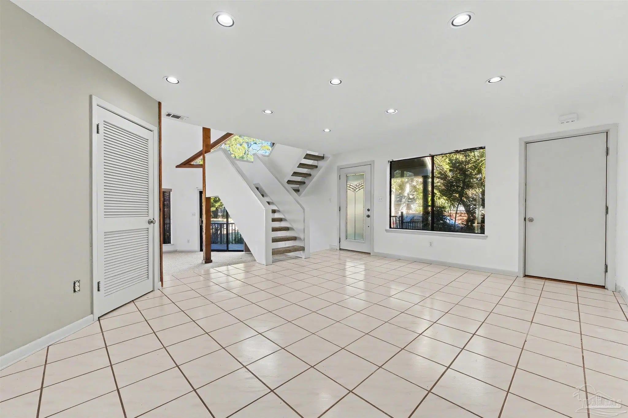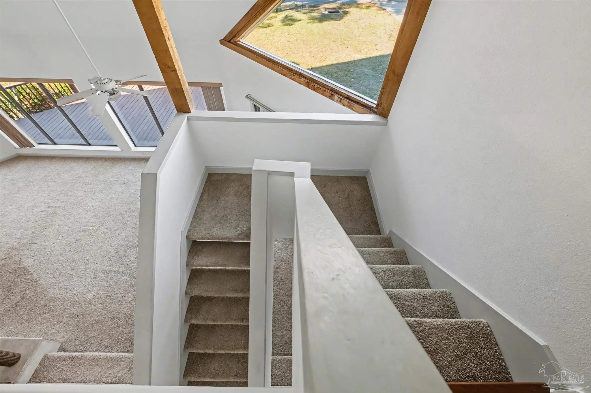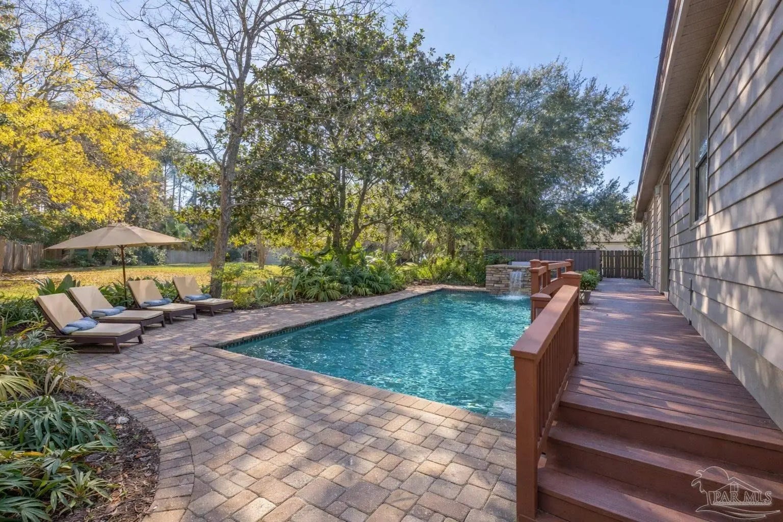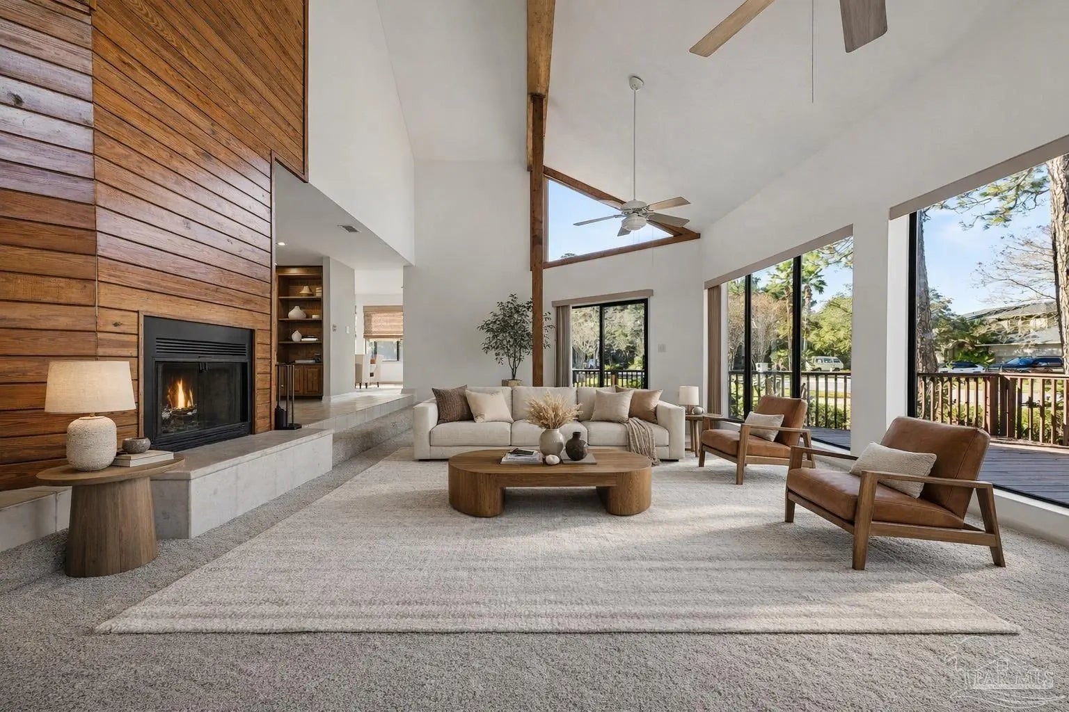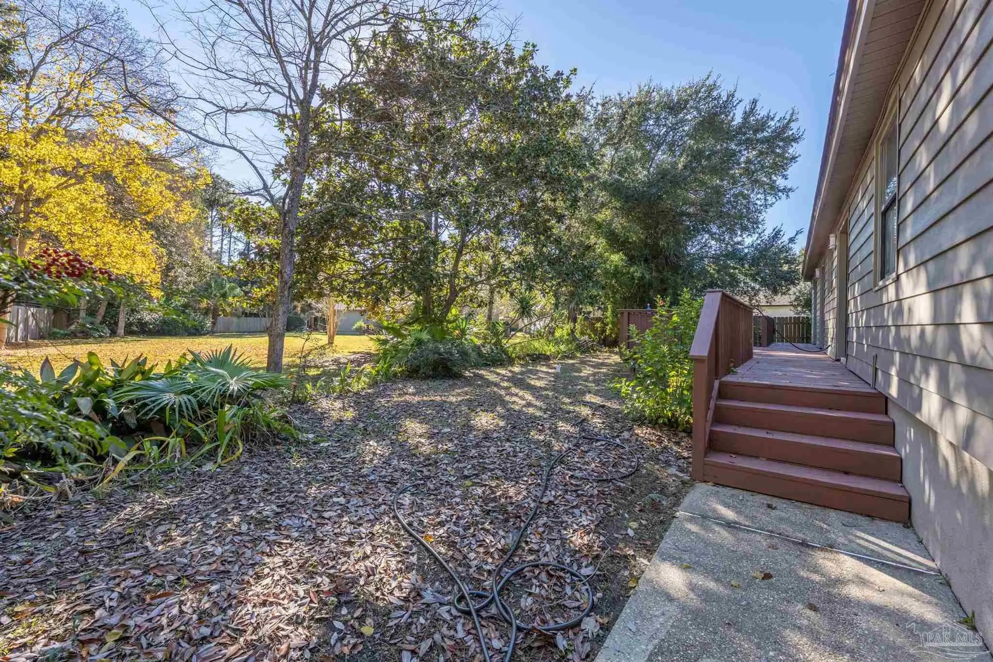 CONTEMPORARY MODERN DESIGN WITH A WATER VIEW and zoned for A-rated Gulf Breeze schools! This spacious, one-of-a-kind home provides 2,913 sf of thoughtfully designed living space in a wonderful, tree-lined, bayfront neighborhood. With four bedrooms and two full bathrooms, you will discover a light drenched, open and functional layout with partial views of the bay across the street. This location is perfect for those desiring to be close to the water, the beautiful beaches and essential amenities. This home immediately stands out with its unique architectural design. Step inside and you'll be greeted by cathedral ceilings, large windows and a mix of beautiful flooring including classic hardwood, sleek tile, and cozy carpet, each thoughtfully placed to enhance the home's charm and character. A sunken living room surrounded by huge windows, a beautiful wooden beam and a soaring wooden fireplace is the perfect place to relax. The centerpiece of the home is its stunning kitchen, featuring gleaming granite countertops and a ton of cabinets which provide ample space for cooking and entertaining. A breakfast/ dining room just off of the kitchen allows enough space for a large dining set and offers water views through the sliding glass door leading onto the expansive front deck. Three additional bedrooms and one bath are also located on the first level, with all bedrooms having direct access to the large back deck. The back yard offers privacy and a park-like setting with enough room for a pool! The entire second floor contains the primary suite dreams are made of, complete with full bath, vaulted ceilings, a lovely sitting area and a fireplace. The thoughtful design of the home creates inviting spaces for gatherings or quiet evenings at home, yet enough privacy for all dwellers and guests. Enjoy a 2 car garage and amazing wrap around porches on the front and back. Must be seend in person to fully appreciate all that this remarkable home has to offer! Schedule your showing!