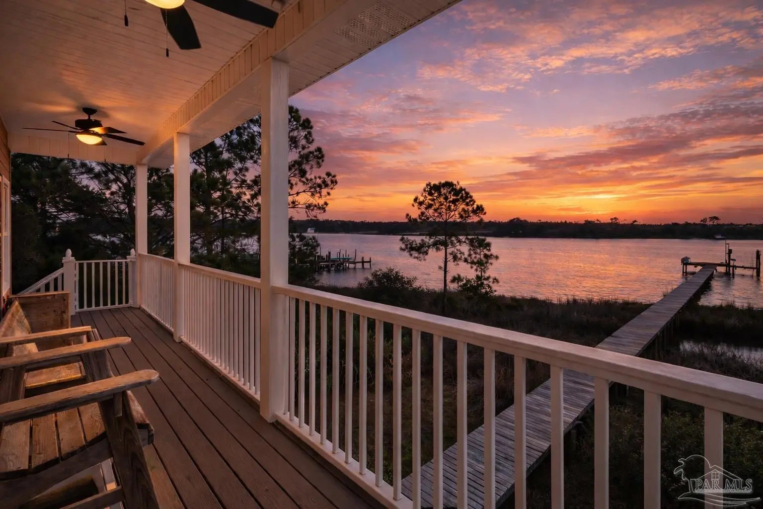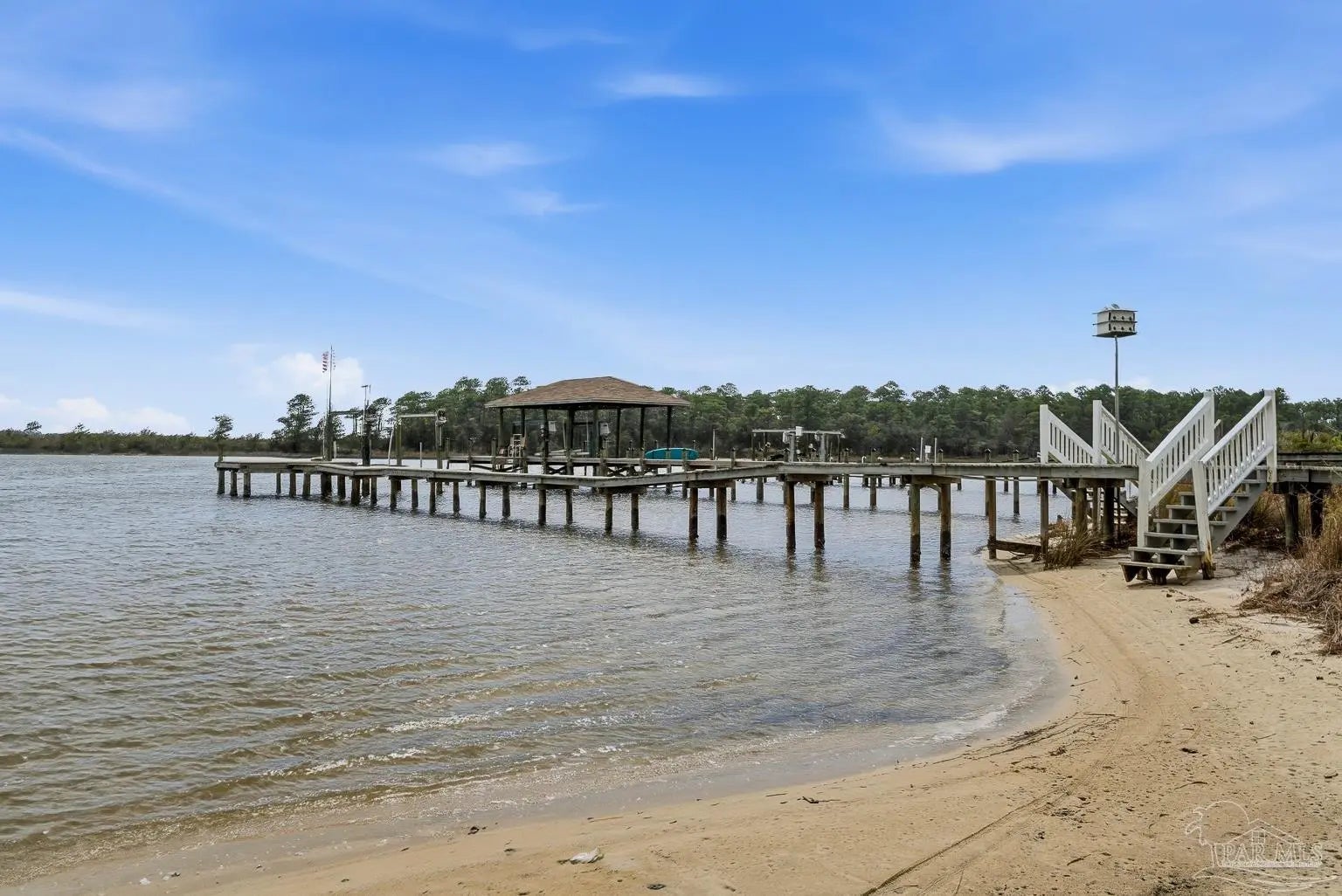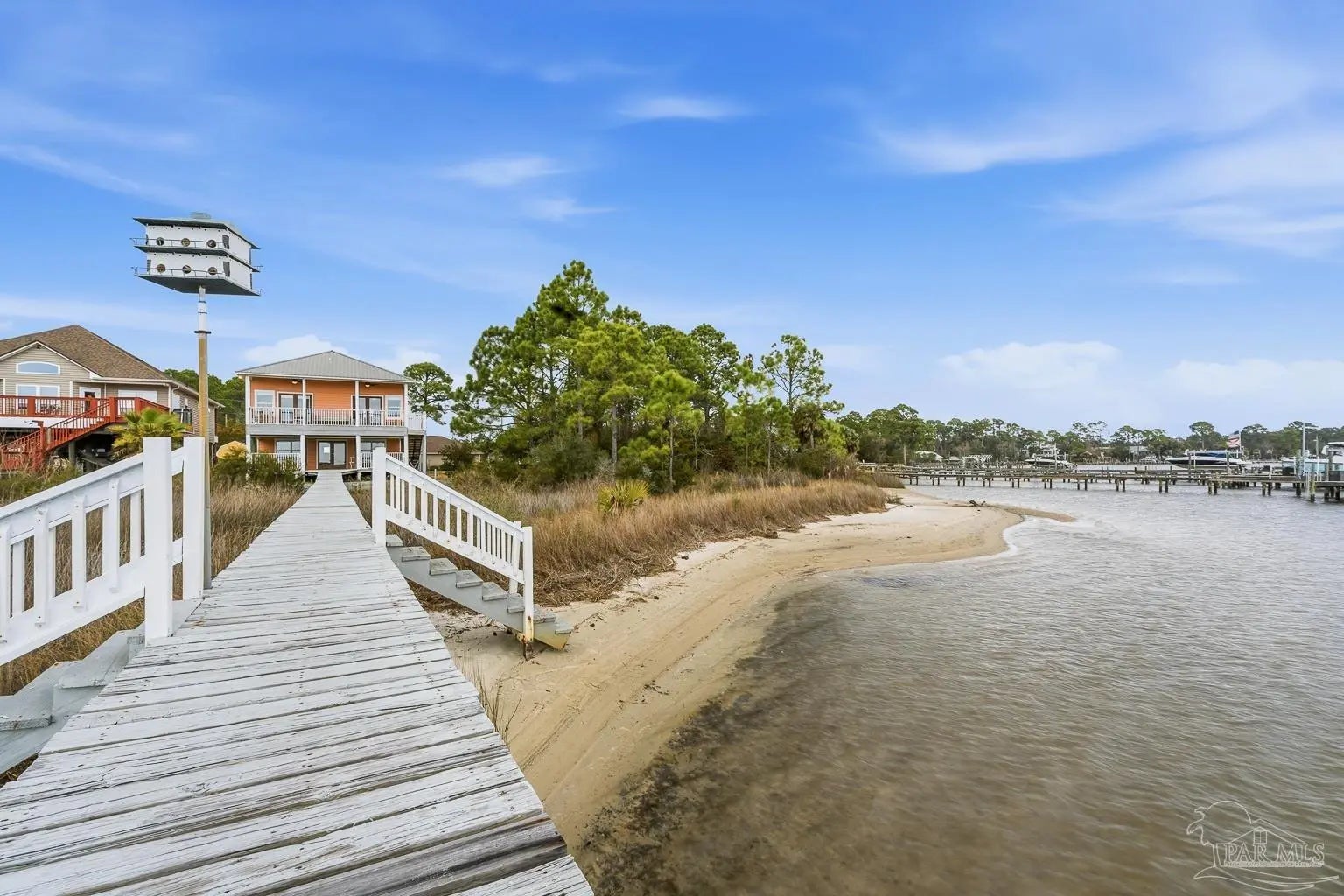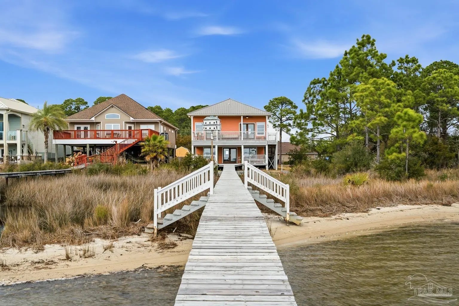Custom-Built Waterfront Retreat on Bayou Grande -One of the Best Spots to watch the U.S. Navy Blue Angels on the Bayou! This home features a Dock complete with Boat lift & beachfront area for all the fun in the sun. Experience coastal living at its finest in this beautifully crafted 3-bedroom, 3-bath waterfront home with a versatile bonus room that can easily serve as a 4th bedroom, downstairs primary suite, guest quarters, or an entertainment space tailored to your needs. This thoughtfully designed home features high ceilings and solid surface flooring throughout, including beautiful hardwood and tile for durability, easy maintenance, and timeless coastal style. The open-concept living and kitchen area is built for entertaining, complete with solid surface countertops, stainless steel appliances, and expansive gathering space perfect for hosting family and friends. Step outside to your covered back deck, where you can relax and take in breathtaking sunsets over the bayou — plus enjoy a front-row seat to the Blue Angels practice flights right from your backyard. Water enthusiasts will love the private boat dock with boat lift and your own sandy beach area, ideal for launching kayaks, docking your boat, or simply enjoying the shoreline. Located on Bayou Grande, you’ll have easy boat access to the Bay and Pensacola Beach & convenient to NAS Pensacola, Perdido Key & Downtown Pensacola.