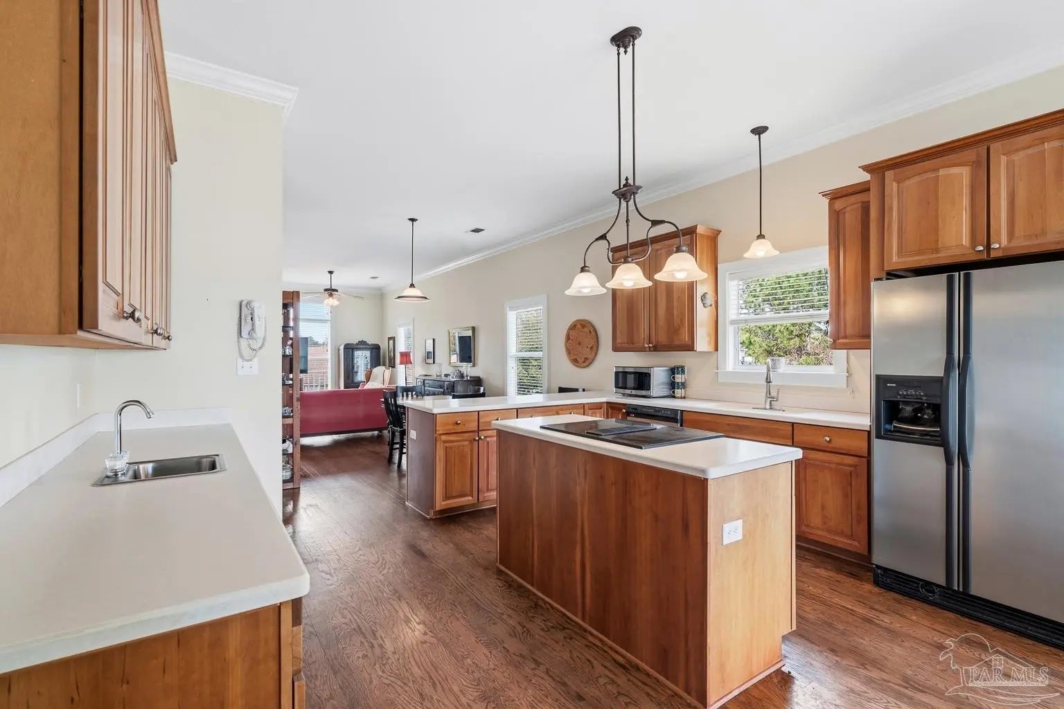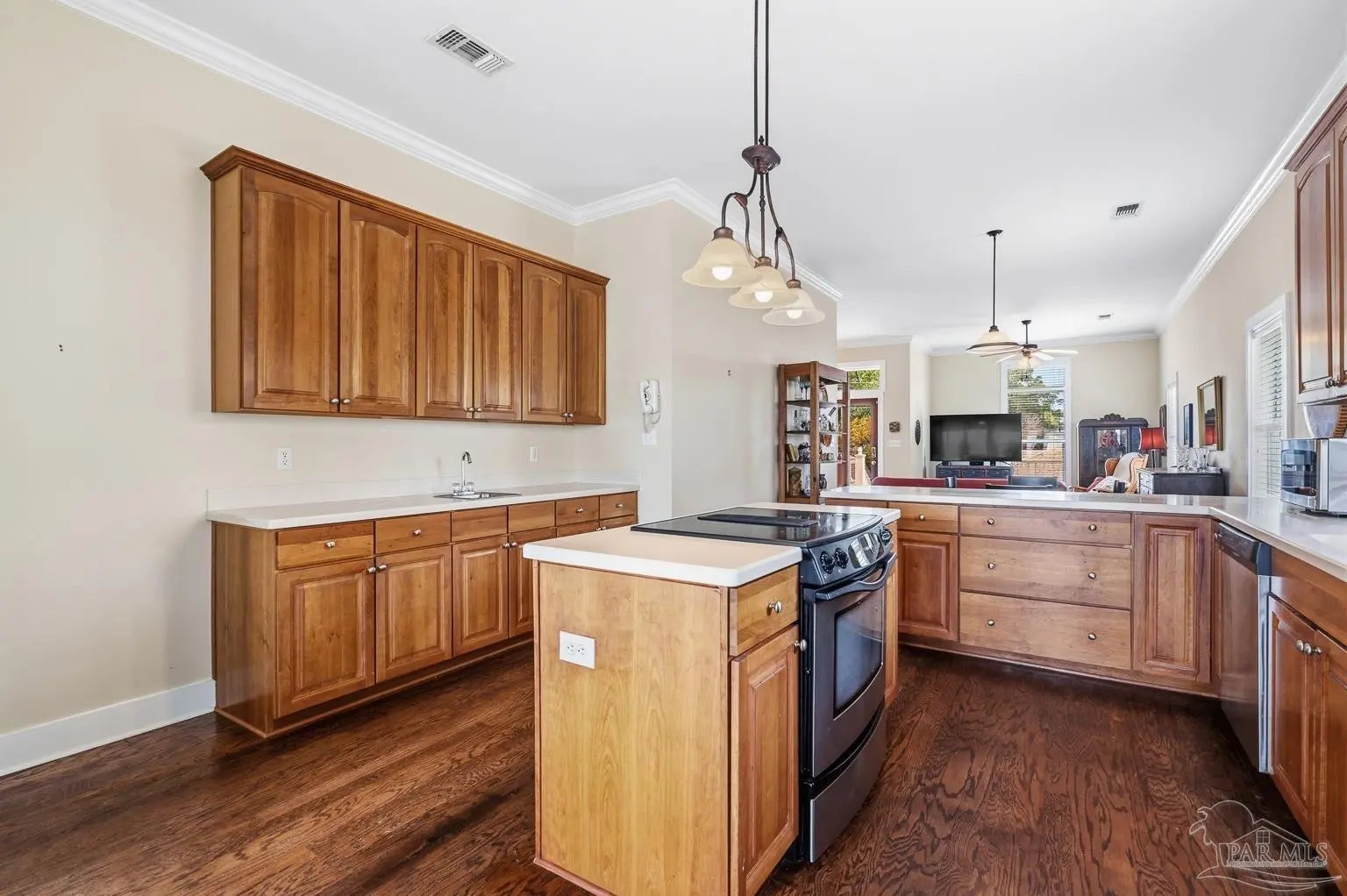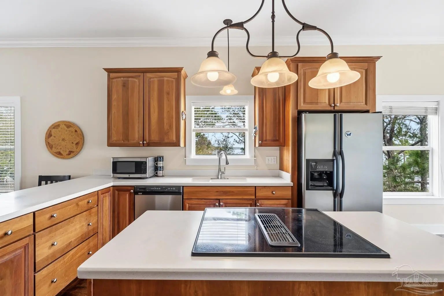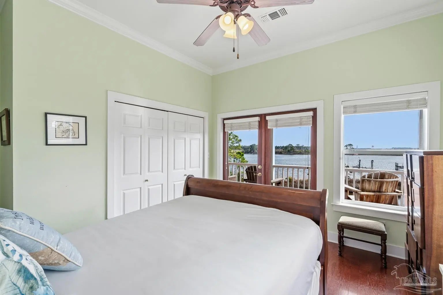 Custom-Built Waterfront Retreat on Bayou Grande -One of the Best Spots to watch the U.S. Navy Blue Angels on the Bayou! This home features a Dock complete with Boat lift & beachfront area for all the fun in the sun. Experience coastal living at its finest in this beautifully crafted 3-bedroom, 3-bath waterfront home with a versatile bonus room that can easily serve as a 4th bedroom, downstairs primary suite, guest quarters, or an entertainment space tailored to your needs. This thoughtfully designed home features high ceilings and solid surface flooring throughout, including beautiful hardwood and tile for durability, easy maintenance, and timeless coastal style. The open-concept living and kitchen area is built for entertaining, complete with solid surface countertops, stainless steel appliances, and expansive gathering space perfect for hosting family and friends. Step outside to your covered back deck, where you can relax and take in breathtaking sunsets over the bayou — plus enjoy a front-row seat to the Blue Angels practice flights right from your backyard. Water enthusiasts will love the private boat dock with boat lift and your own sandy beach area, ideal for launching kayaks, docking your boat, or simply enjoying the shoreline. Located on Bayou Grande, you’ll have easy boat access to the Bay and Pensacola Beach & convenient to NAS Pensacola, Perdido Key & Downtown Pensacola.