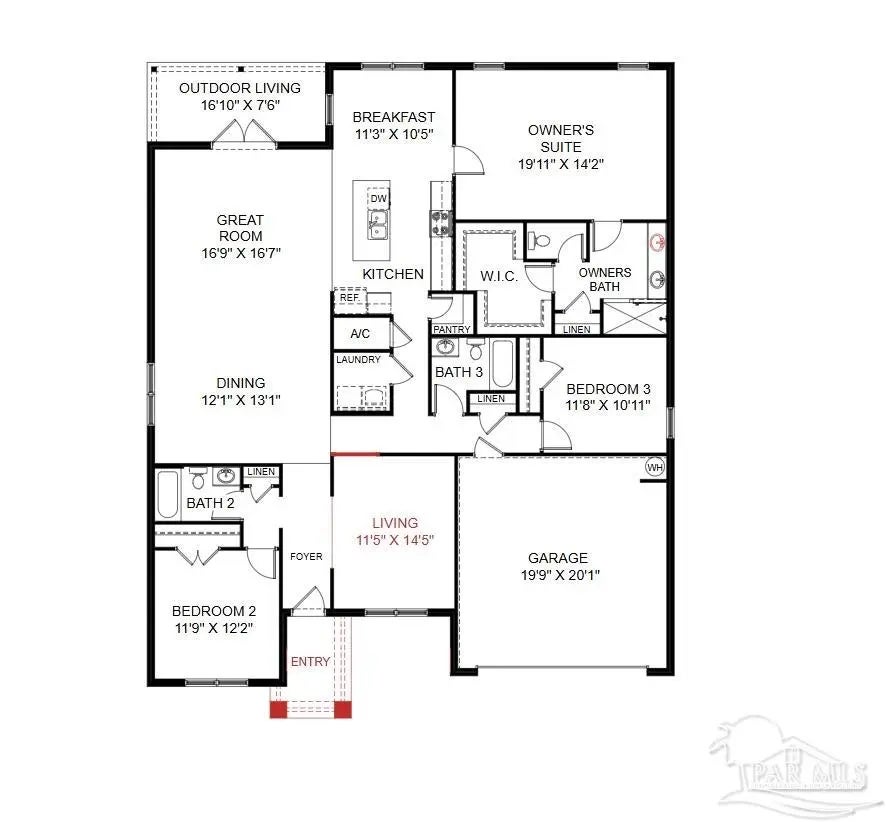Introducing the Carlton, a forward-thinking floorplan from the Cornerstone collection by Holiday Builders. This home offers a well-designed layout that allows multi-generational living or roommate potential since each bedroom is in a different part of the home with easy access to a bathroom for ultimate privacy. Upon entering the foyer, you'll immediately notice a guest retreat to the left, complete with a bedroom, separate full bathroom and linen closet. This arrangement provides privacy and convenience for guests or family members. To the right, a long wall presents the perfect opportunity for showcasing your cherished family photographs, adding a personal touch to your home. As you continue past the front bedroom, you'll find an open dining room and great room, creating an inviting and spacious atmosphere for entertaining and relaxation. Just off the great room, an outdoor living area awaits, offering an ideal space for enjoying fresh air and creating lasting memories. The great room seamlessly connects to the breakfast nook and kitchen, forming the heart of the home. The kitchen features an island with a sink and dishwasher, ensuring a convenient and efficient workspace. Whether you're cooking a delicious meal or hosting a casual gathering, the open layout allows for easy interaction and conversation with family and friends.