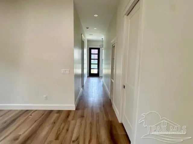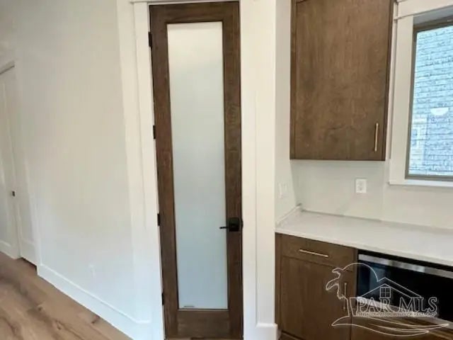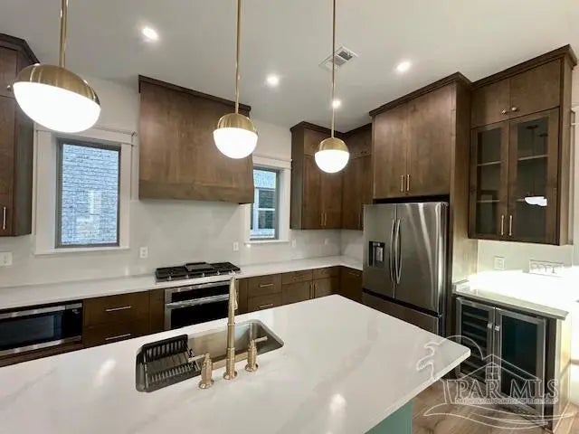 Modern upscale elegance. Live, work, play in this Unparalleled access to the modern downtown lifestyle; easy walk/golf cart to everything downtown has to offer, including our award winning "Wahoo's Stadium" (1 mile), and 1/2 mile to 5 Sister's Blues Cafe. This "Custom Built" 4 bdrm 3 1/2 bth offers Brick, oversized 1 car garage, Exquisite Custom European Floor to ceiling soft close Wood Cabinets, 2x6 studs, 2225 sq ft living, 2845 under roof with garage, lanai and porch, with upgrades abound on this interior located/ Private alley drive and rear entry garage. Has powered & lighted columns ready for your gated remote entry if desired. Features include: All Exterior doors and windows impact resistant, 8ft exterior and 8ft interior sold core doors, Heat pump HVAC with humidity control (with 4 yr warranty), Stainless appliance's (w/4yr warranty) Gas Cooktop, Quartz counters and quartz backsplash, dual /cocktail frig ice maker, dual zone frost free wine/beverage cooler, Gas tankless water heater, optional (plumbed) porch lantern, , custom tiled bathrooms with seamless glass enclosures, Lighted Mirrors, Floating Cabinets in the primary, with quartz countertops and separate water closet and skirted toilets, High End 20 ply LVP interior flooring, with porcelain tile, high end faucets, , Custom closets throughout, including walk in pantry and linen, Laundry Room cabinets, remote controlled Electric Fireplace, LED lighting thru out, LED lighting /power in soffits, tongue and groove porches, Smooth Textured walls, and 10 ft ceilings downstairs, with Custom cased windows and doors. The home has spray foam attic insulation along with R19 in the walls, 2 attic pull down storage areas, double insulated Garage door , belt drive, bluetooth MyQ technology & battery back up. Roof SWB(Ins savings), Includes a smart security system with exterior cameras, monitor, app control, remote access, and much more.... Must see.