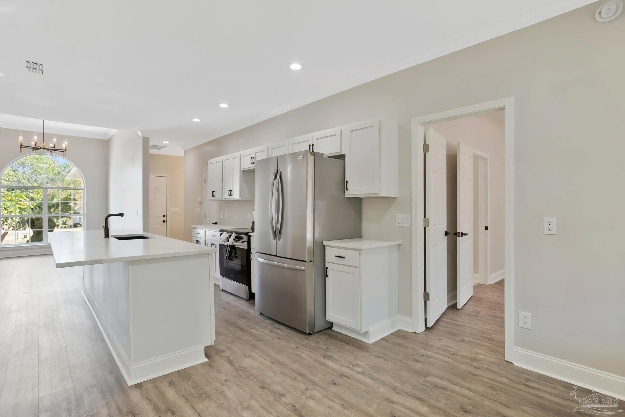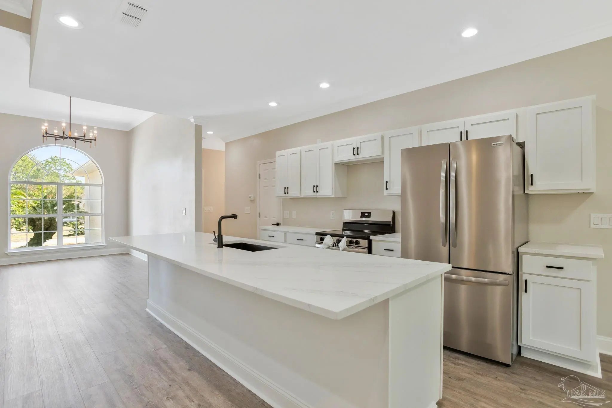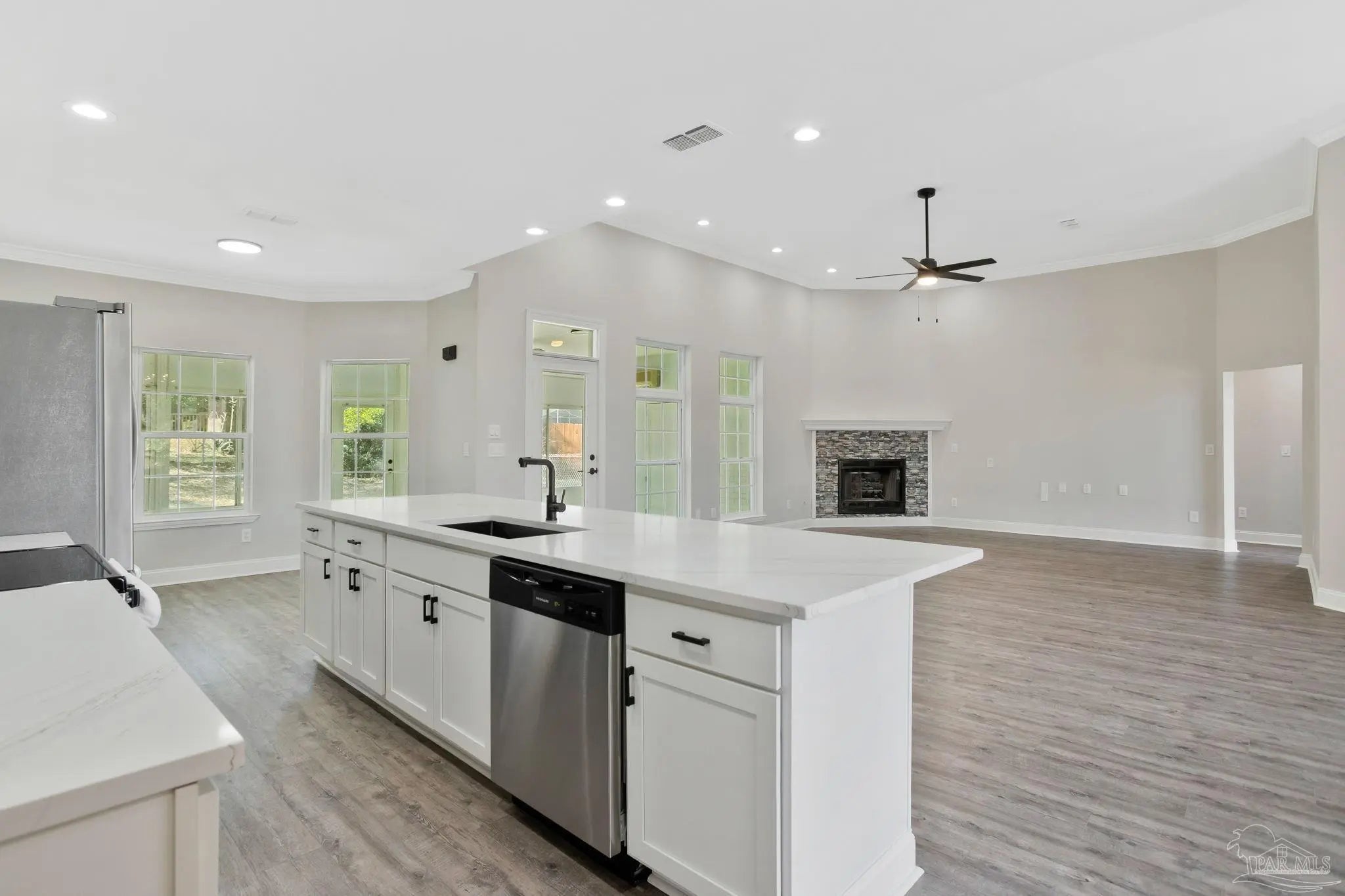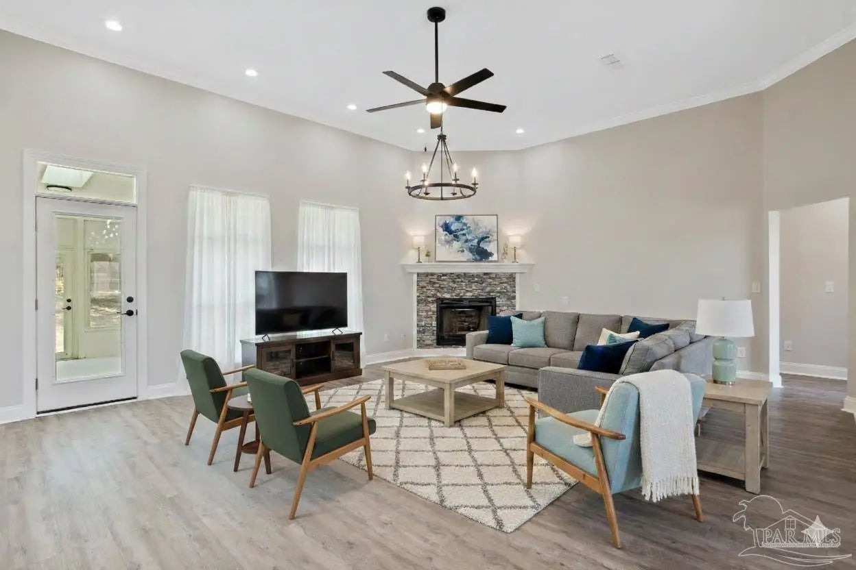 White painted brick, soaring ceilings, and an open layout that practically says, “host Thanksgiving at my house”, this home is ready to impress from the start. Perched slightly on a hill, it offers great curb appeal and a welcoming first impression the moment you pull up. Step inside to a bright, open-concept floor plan featuring brand-new LVP (luxury vinyl plank) flooring throughout the main living areas and bedrooms. The spacious living room centers around a fireplace and flows seamlessly into the dining area, breakfast nook, and kitchen, making it the perfect setup for entertaining and everyday living. Plus, the entire home has been freshly painted, giving it a clean, move-in-ready feel. The kitchen has white cabinetry, quartz countertops, a large island, stainless steel appliances, and a pantry for extra storage. The primary suite is privately situated and offers natural light and space for a king-sized bed. The ensuite bath features dual, separate vanities with quartz counters, tile flooring, a tiled walk-in shower, a freestanding soaking tub, dual closets, and a private water closet, your own personal retreat at the end of the day. Just off the oversized garage entry, you’ll find a generously sized laundry room complete with a utility sink. On the opposite side of the home are three additional bedrooms, all nicely sized, along with a full bathroom featuring dual vanities, tile floors, a linen closet, and a tub/shower combination. And don’t miss the sunroom off the living area, the perfect spot for morning coffee, a good book, or simply relaxing and enjoying the Florida sunshine. This home is ready to wow and let you plant your roots.