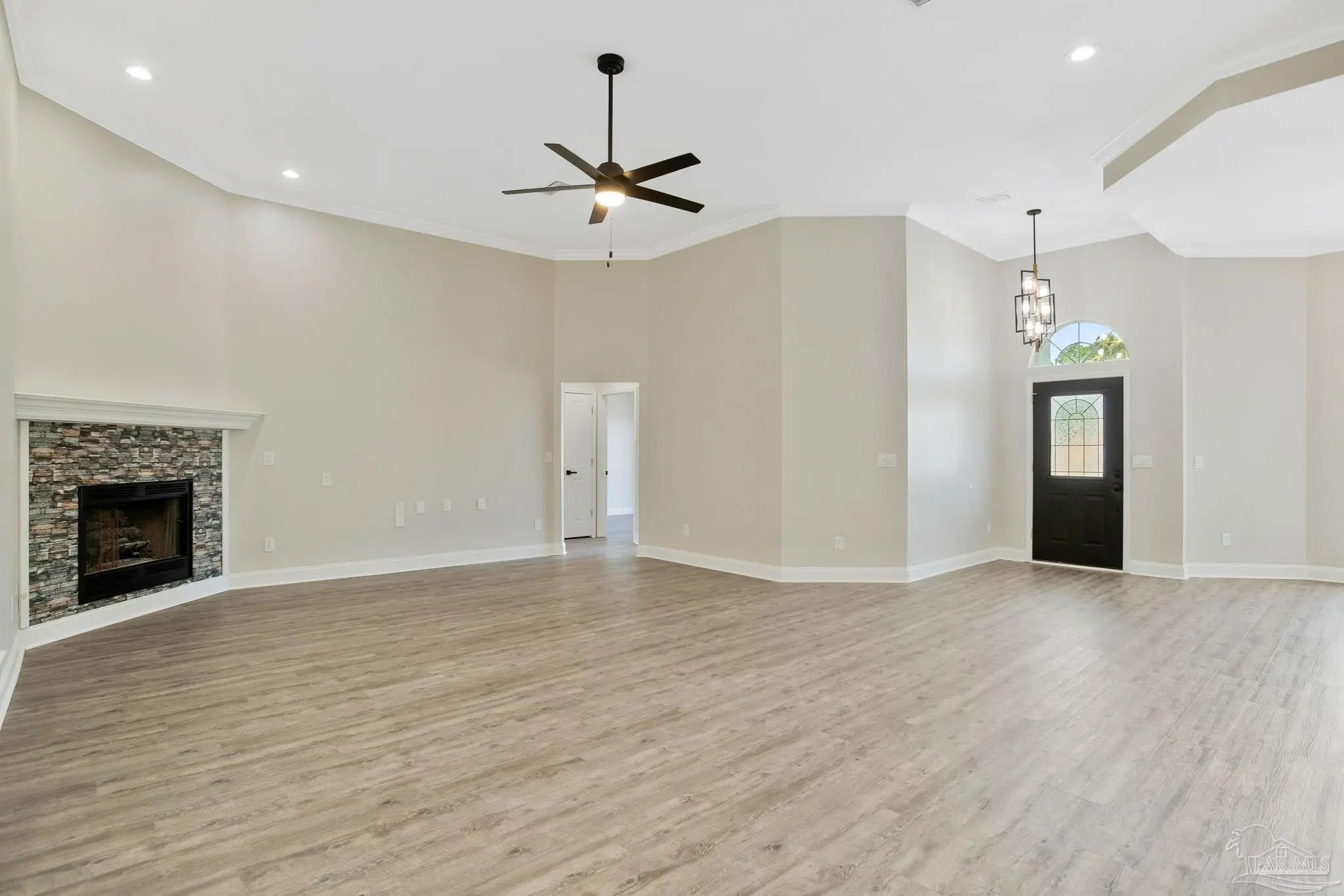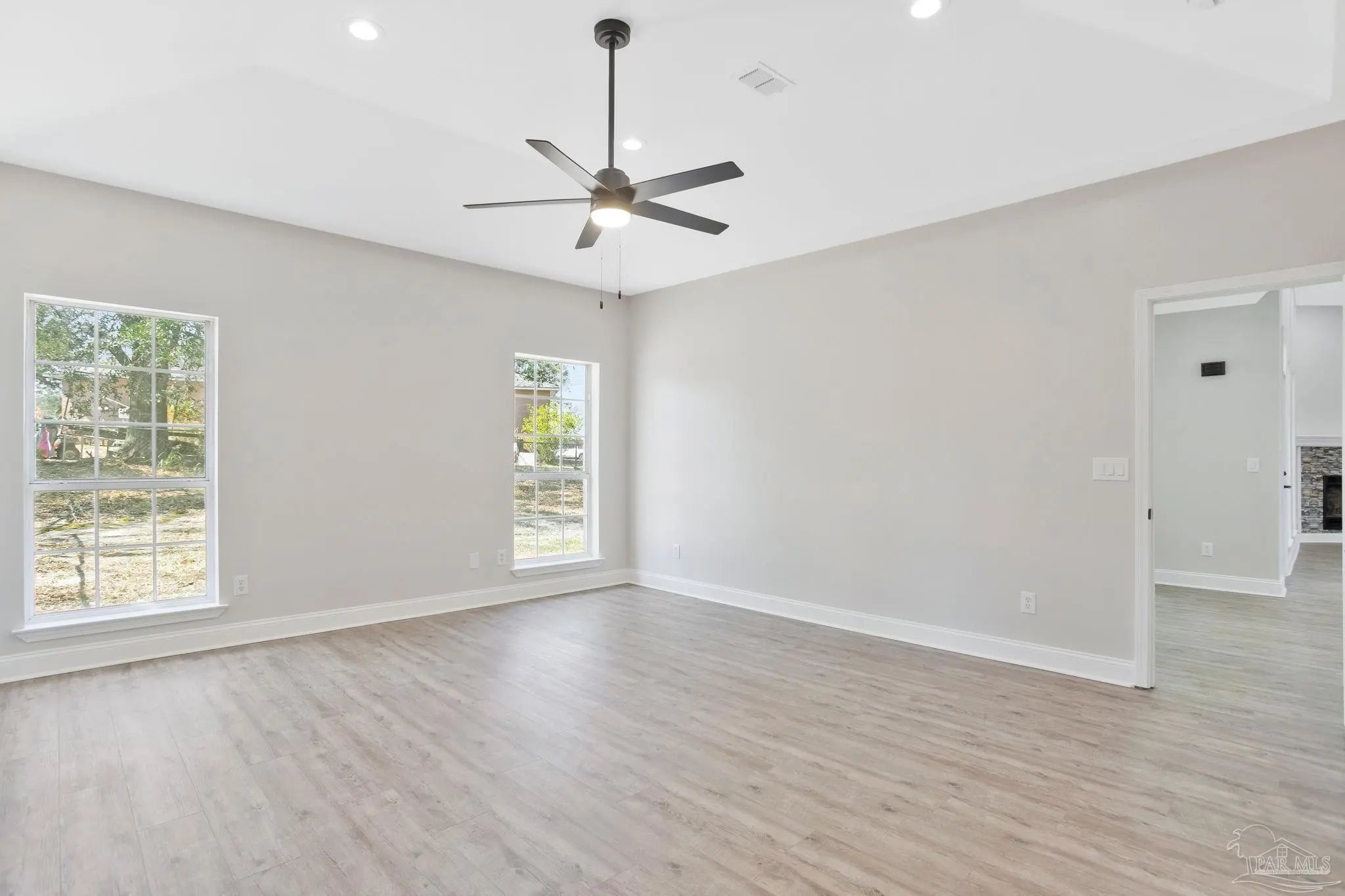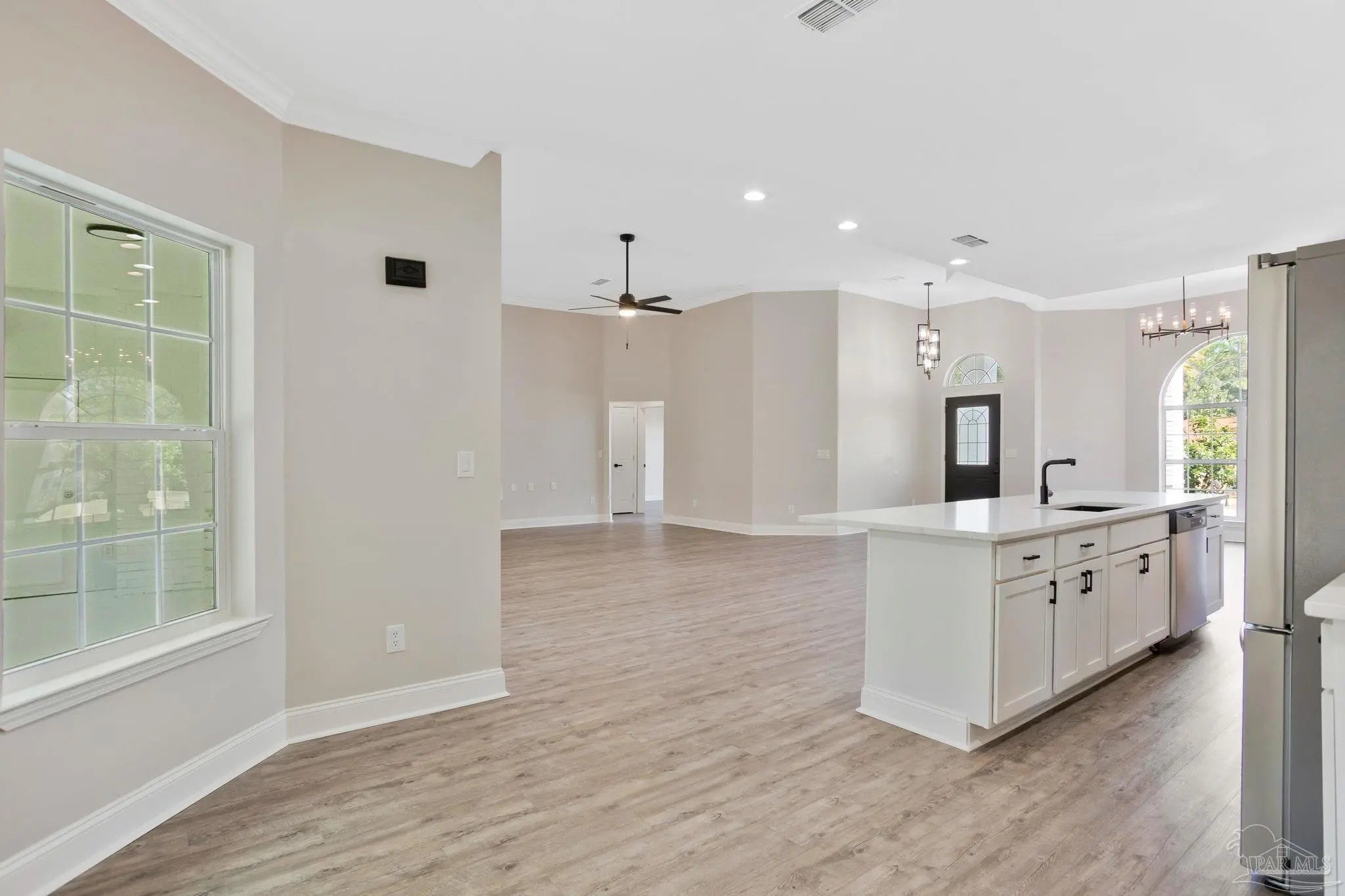 White painted brick, soaring ceilings, and an open layout that practically says, “host Thanksgiving at my house”, this home is ready to impress from the start. Perched slightly on a hill, it offers great curb appeal and a welcoming first impression the moment you pull up. Step inside to a bright, open-concept floor plan featuring brand-new LVP (luxury vinyl plank) flooring throughout the main living areas and bedrooms. The spacious living room centers around a fireplace and flows seamlessly into the dining area, breakfast nook, and kitchen, making it the perfect setup for entertaining and everyday living. Plus, the entire home has been freshly painted, giving it a clean, move-in-ready feel. The kitchen has white cabinetry, quartz countertops, a large island, stainless steel appliances, and a pantry for extra storage. The primary suite is privately situated and offers natural light and space for a king-sized bed. The ensuite bath features dual, separate vanities with quartz counters, tile flooring, a tiled walk-in shower, a freestanding soaking tub, dual closets, and a private water closet, your own personal retreat at the end of the day. Just off the oversized garage entry, you’ll find a generously sized laundry room complete with a utility sink. On the opposite side of the home are three additional bedrooms, all nicely sized, along with a full bathroom featuring dual vanities, tile floors, a linen closet, and a tub/shower combination. And don’t miss the sunroom off the living area, the perfect spot for morning coffee, a good book, or simply relaxing and enjoying the Florida sunshine. This home is ready to wow and let you plant your roots.