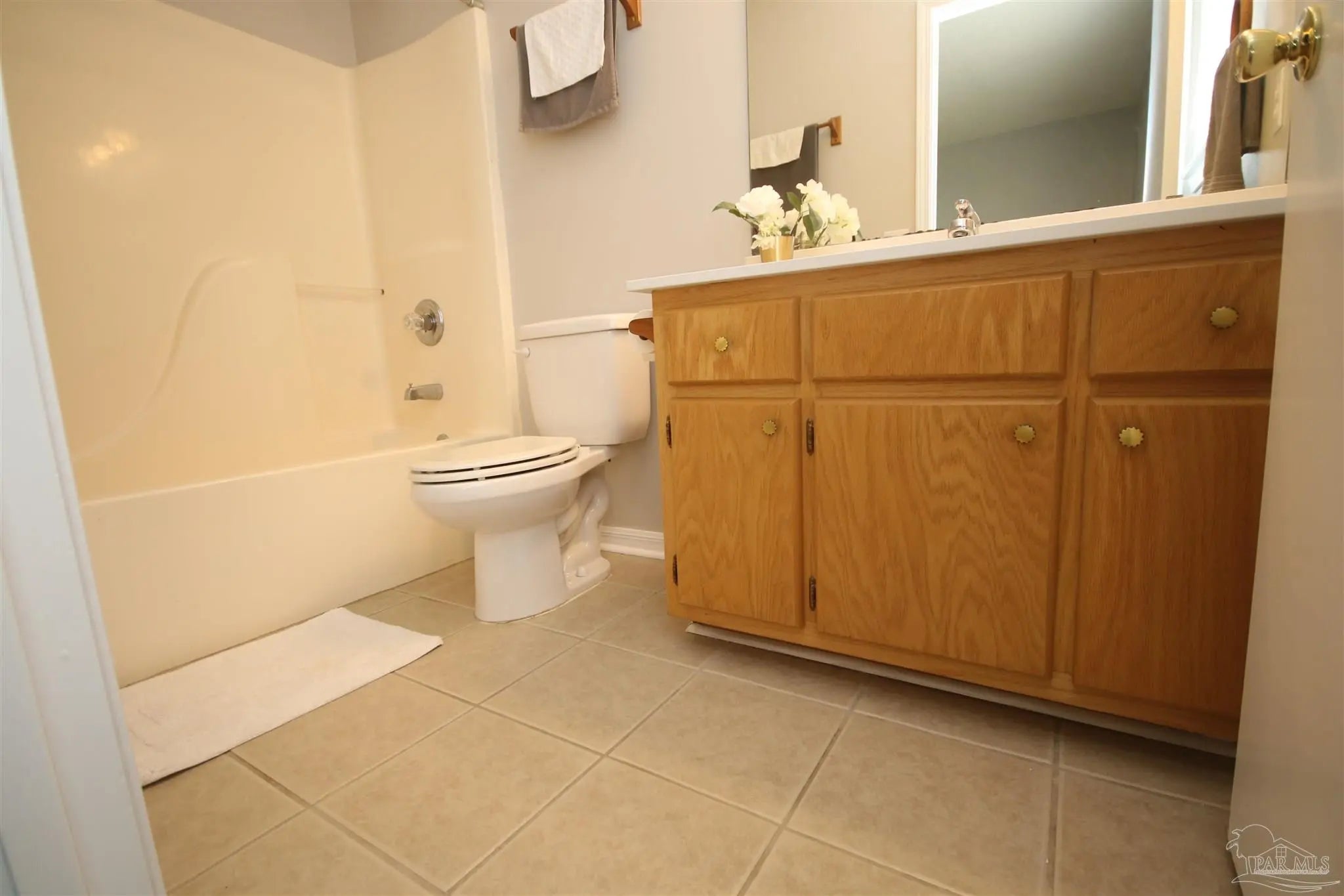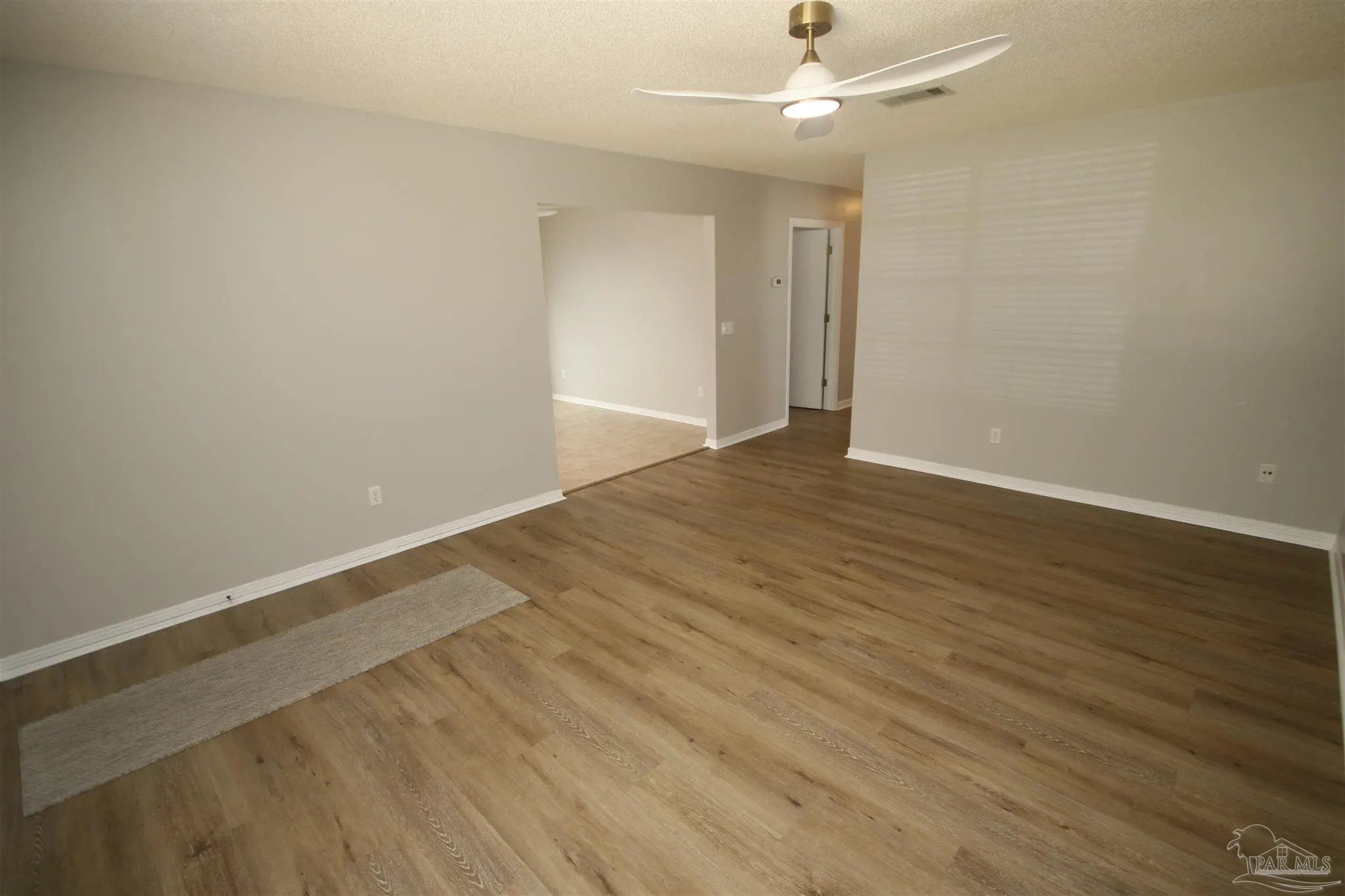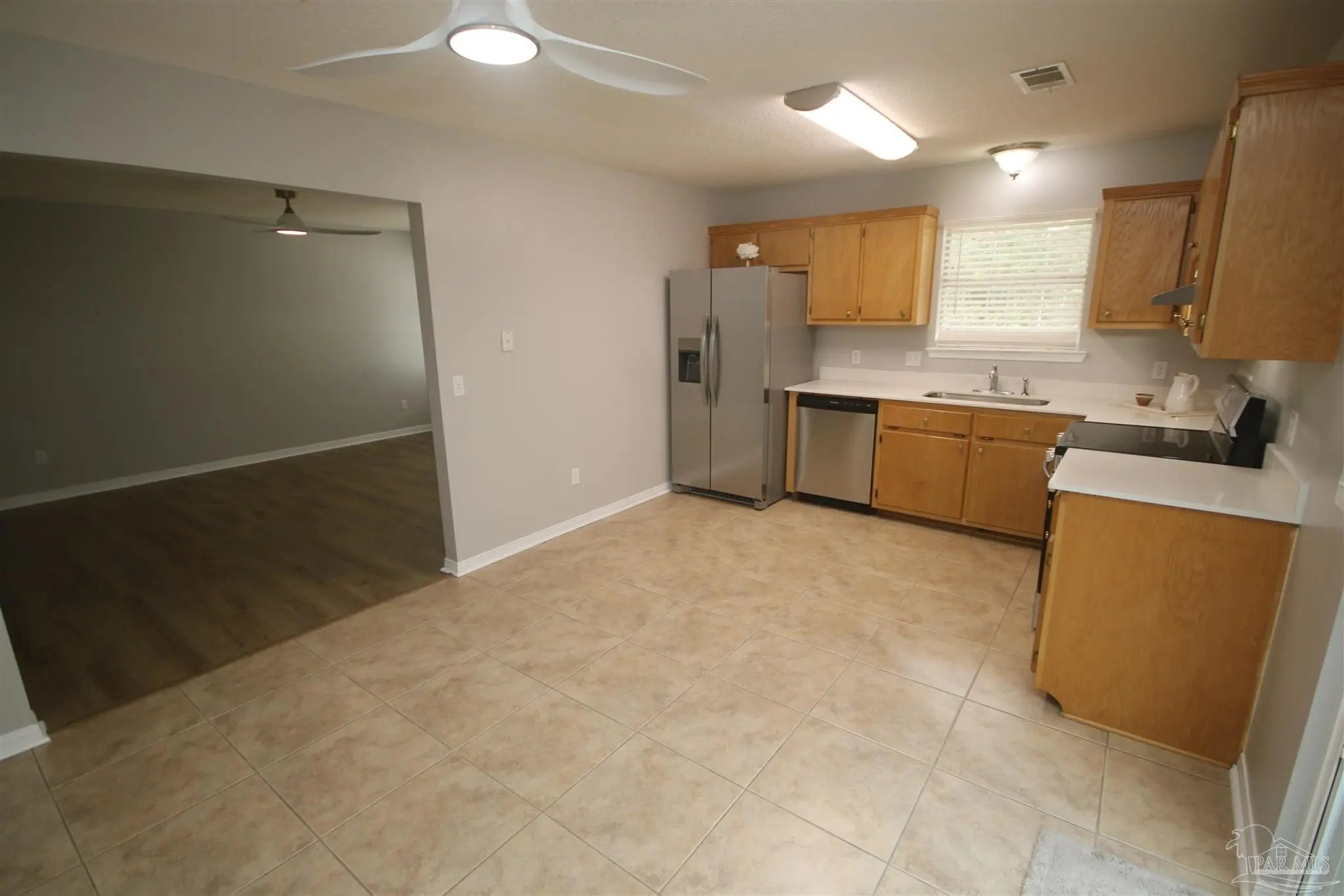 Adorable, home updated in 2026 with no detail overlooked. Luxury vinyl plank flooring runs throughout, complemented by tile in the kitchen and bathrooms. The kitchen shines with brand-new stainless-steel appliances, quartz countertops, updated cabinet hardware, and opens seamlessly to the spacious family room. A new sliding glass patio door with built-in blinds leads to the outdoor patio, creating an easy indoor-outdoor connection. Additional updates include new ceiling fans, window treatments, interior doors, and fresh interior paint on walls, doors, and trim. Both the bathrooms and kitchen feature new quartz countertops and updated cabinet pulls. The laundry room is generously sized and filled with natural light from a large window. The home offers three bedrooms located at the rear for added privacy, including a primary bedroom with a walk-in closet, plus a second bedroom also featuring a walk-in. The oversized hall bath provides ample space and functionality. The private primary suite is tucked away at the back of the home. Exterior improvements include new front landscaping and walkway enhancements. Major systems have been updated with a 20-year architectural dimensional roof installed in July 2020 and a new Ameristar 14-SEER heat pump with air handler, also installed in July 2020. List of all updates attached in the document section of the MLS. This home is truly move-in ready!