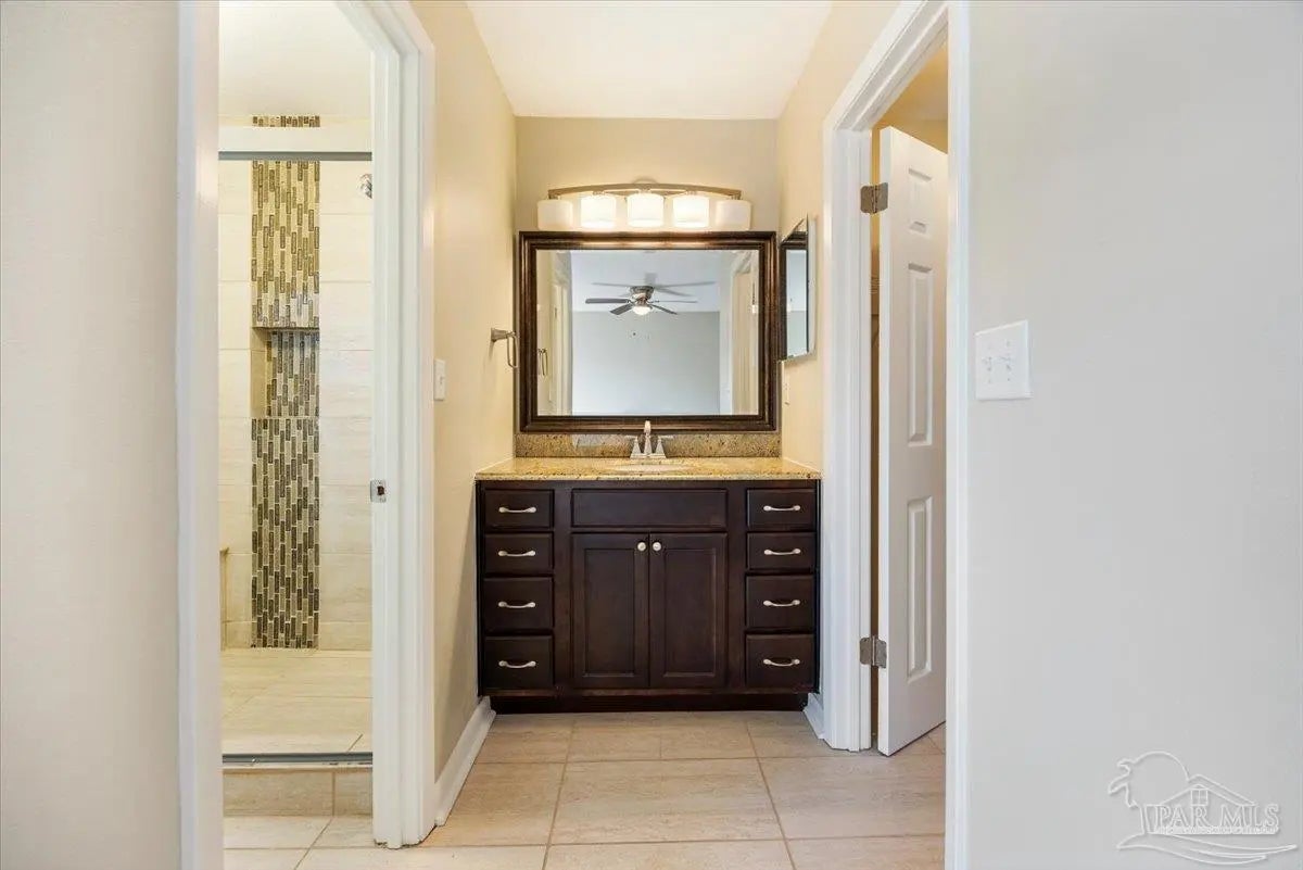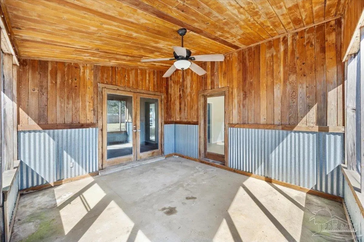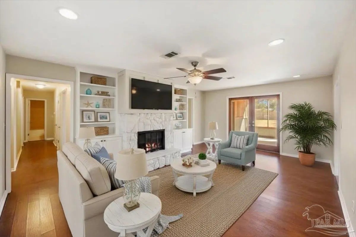 Welcome to 2990 Ranchette Road in Gulf Breeze, where comfort, character, and space come together on a generous fenced lot. This well-maintained home offers a warm and inviting first impression with mature trees, classic exterior detailing, and a welcoming covered entry. Inside, you’ll find rich wood flooring flowing through the main living areas, recessed lighting, and a spacious living room anchored by a beautiful stone wood-burning fireplace. French doors lead to a screened porch, creating a seamless transition between indoor comfort and outdoor living. The kitchen is thoughtfully designed with granite countertops, stainless appliances with 2 refrigerators for extra storage, ample cabinet storage, and a functional layout that opens to both the living and dining areas. A bright dining space with tile flooring and backyard views provides the perfect setting for everyday meals or entertaining guests. The primary suite features plush carpet, a ceiling fan, and a beautifully updated ensuite bath with a granite vanity and a tiled walk-in shower accented with decorative mosaic inlay. Additional bedrooms are generously sized with good closet space and natural light. The secondary bath also includes granite countertops and tiled shower walls for a cohesive, updated feel. One of the standout features of this home is the screened porch with wood-paneled ceiling and corrugated metal accents, offering a unique, rustic charm and an ideal space for relaxing year-round. Step outside to a large, fully fenced backyard with plenty of room for gatherings, pets, play, or future enhancements. A large storage building and carport cover provide ample storage for lawn equipment or a boat or RV. Located in Gulf Breeze with convenient access to shopping, schools, and the beaches, this home blends functionality, charm, and space in a desirable setting.