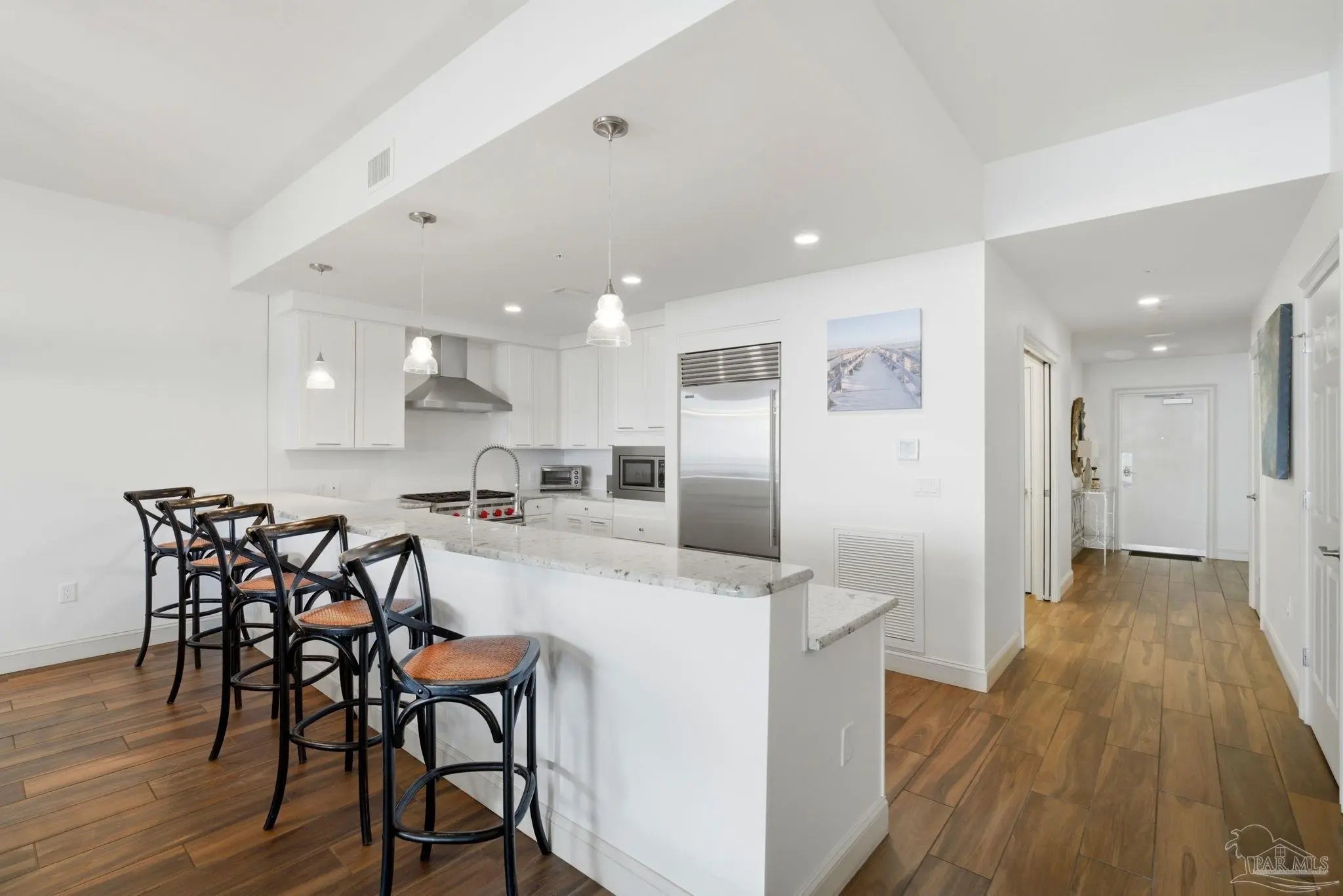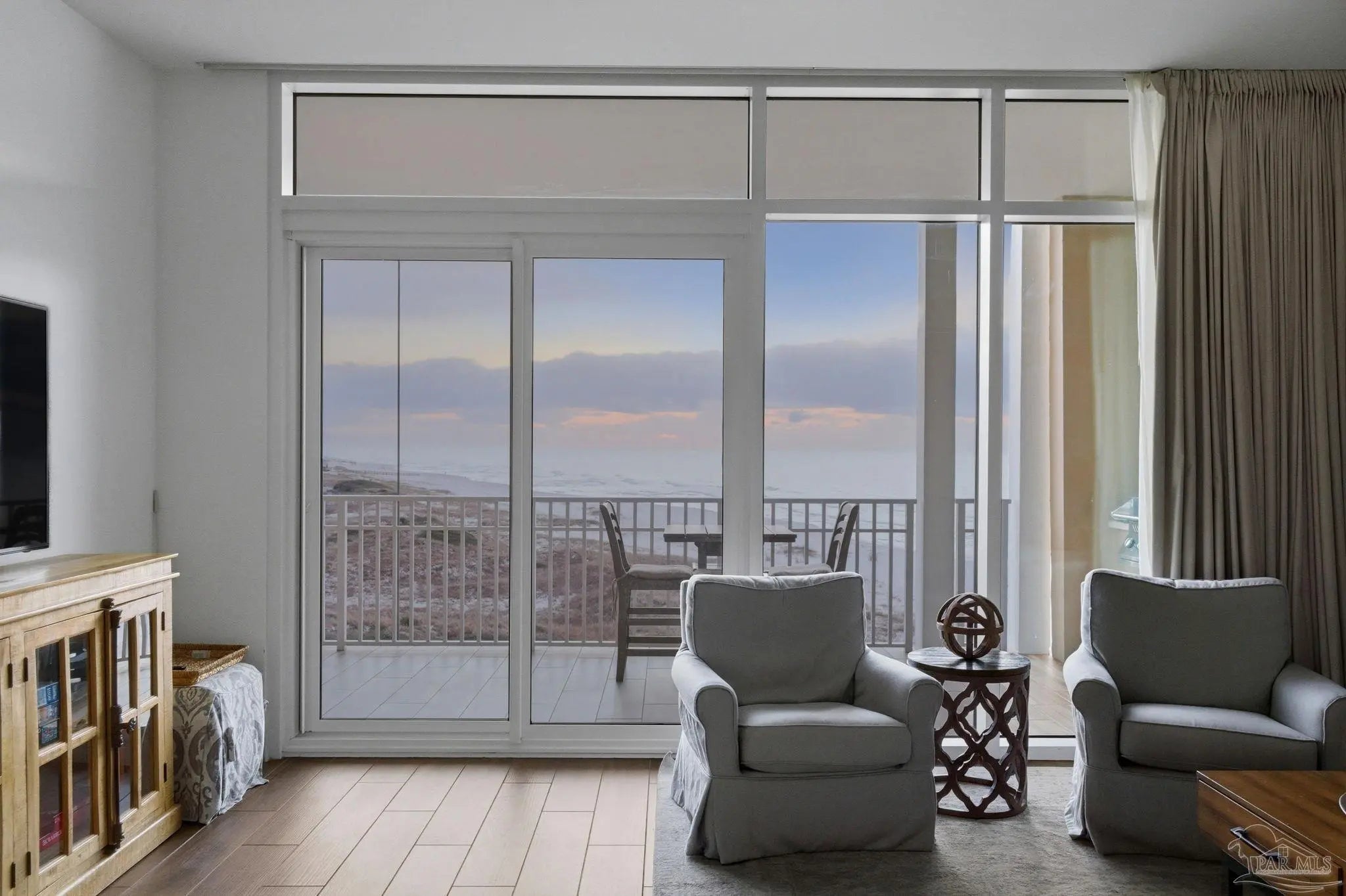 Experience unobstructed Gulf views from this exceptional 3-bedroom, 3.5-bath residence at Vista Del Mar. Positioned beside the protected shoreline of the Gulf Islands National Seashore, this 4th-floor unit offers panoramic views of miles of sugar-white sand & emerald waters. Inside, this furnished residence showcases an expansive open floor plan designed to maximize the views. Floor-to-ceiling impact-resistant glass fills the living spaces with natural light & frames the Gulf from nearly every angle. Stretching ceilings enhance the sense of volume, while elegant tile flooring runs throughout for a clean, coastal finish that is both refined & practical. The chef’s kitchen is equipped with premium appliances including a Sub-Zero refrigerator & Wolf gas range, along with custom cabinetry, a generous breakfast bar, & commercial-grade stainless finishes. A wet bar with under-counter ice maker & wine chiller adds an elevated touch for effortless entertaining. The spacious living & dining areas flow to the oversized beachfront balcony, complete with a brand-new gas grill & ample space for outdoor dining & lounging. With only 64 residences, Vista Del Mar delivers a rare sense of privacy & space along one of the most desirable stretches of uncrowded beachfront on the Gulf Coast + a gated entrance, assigned covered garage parking, & private owner storage. Take advantage of unmatched amenities to elevate everyday coastal living, which includes a grand lobby featuring multiple seating areas & refined finishes, indoor heated pool, fully equipped fitness center, massage rooms that create a true wellness retreat. The owner's club room with fireplace, bar, billiards, & televisions provides additional space for gathering. Outdoors, owners enjoy an expansive beachfront deck, pool with oasis features, hot tub, & covered gathering areas. This luxury condo offers it all - a rare combination of natural preservation, architectural quality, & premier amenities!
