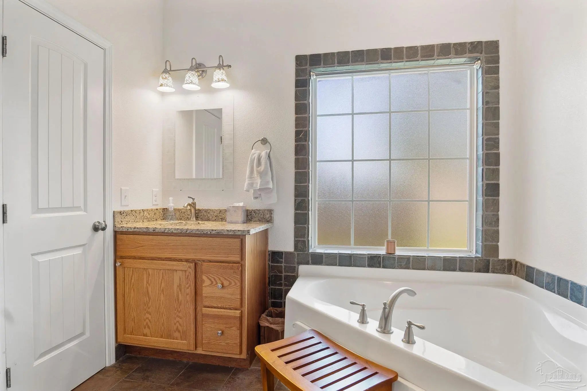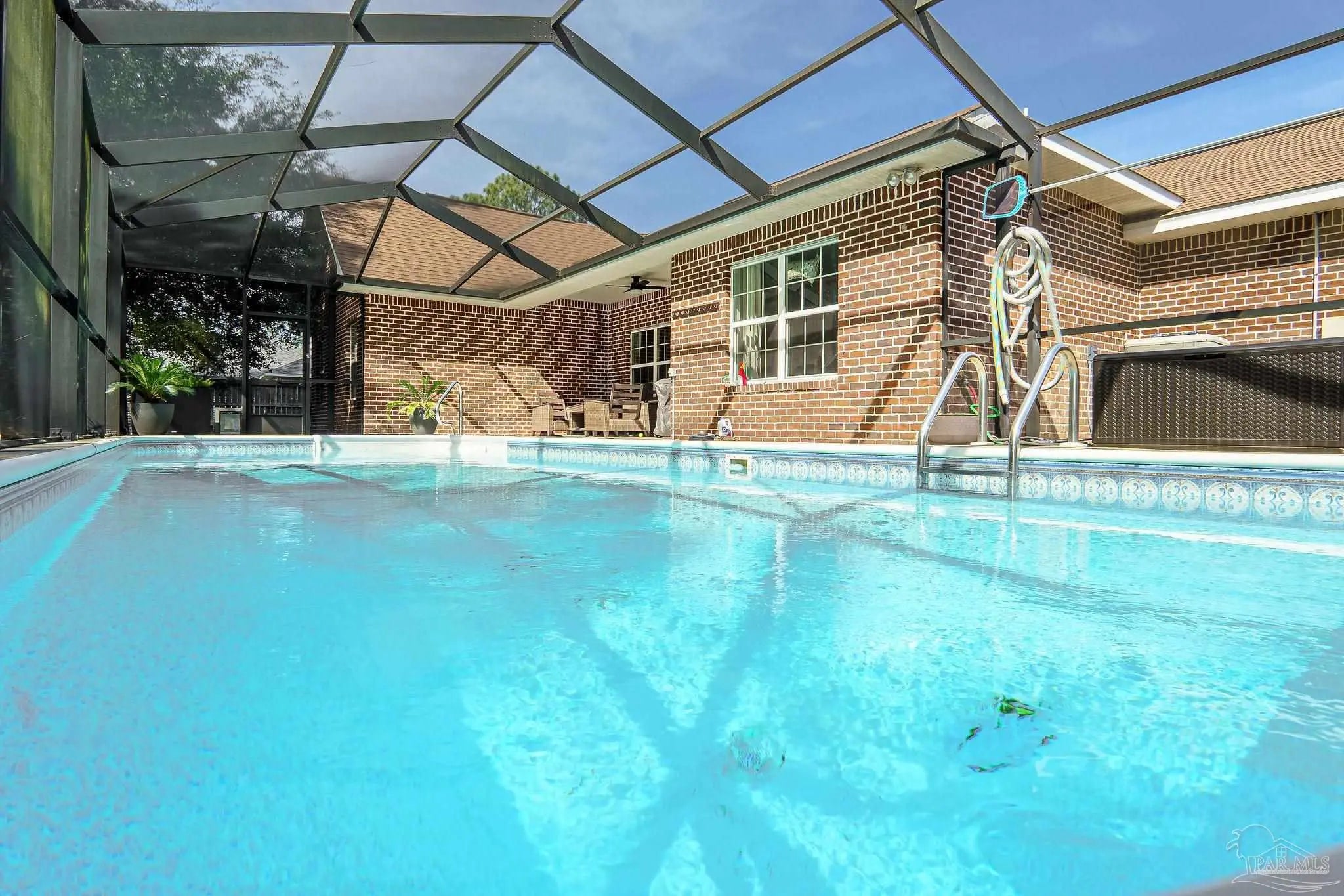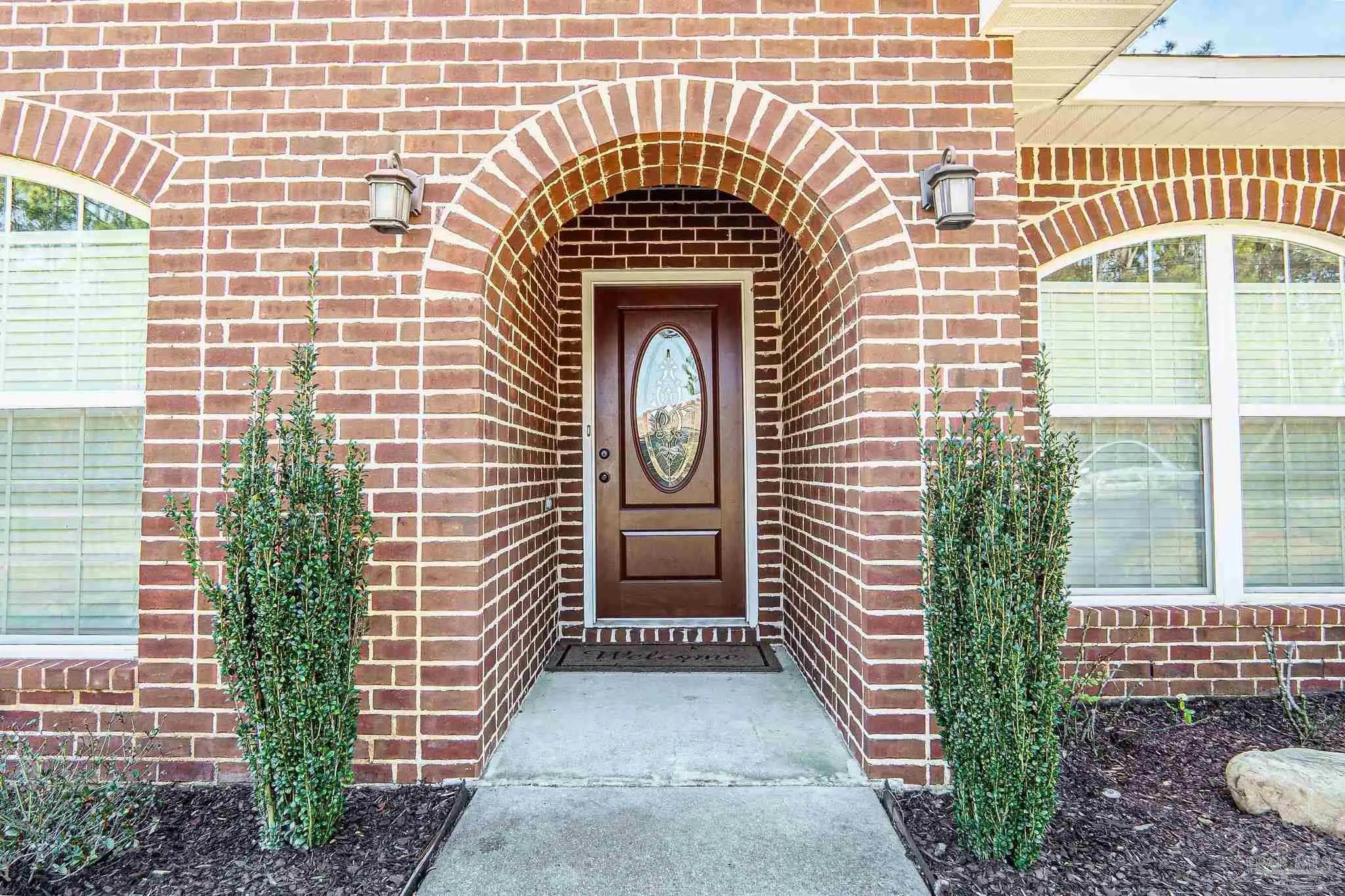All Brick French Country. 2071 Sq. ft. 4 bedroom, 2 baths, on .46 acre with public sewer. Home features: Raised-ceilings, tiled wet areas, ceramic tile flooring, stainless steel appliances, granite counter-tops, tiled walk-in shower, garden tub, 2 walk-in closets in master, separate vanities, double vanity in connecting bath. Exterior features: covered patio, sodded yard, native shrubs, sprinkler system and lawn pump, Enclosed Private Pool, 2-car garage. Located in Holley By The Sea.