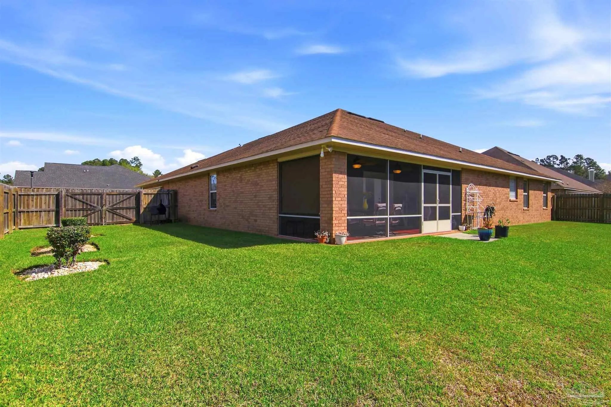 Welcome to this beautifully appointed 4-bedroom, 3-bath home offering over 3,000 square feet of thoughtfully designed living space in one of Pace’s most sought-after gated communities. The stately brick exterior, side-entry garage, and mature palm landscaping create an elegant first impression the moment you arrive. Inside, rich engineered hardwood flooring flows through the main living areas, paired with updated lighting and an inviting open layout ideal for both everyday comfort and memorable gatherings. The chef-inspired kitchen features granite countertops, stainless steel appliances, a custom backsplash, a center island, a walk-in pantry, and ample cabinetry—perfect for cooking, hosting, and staying organized. The spacious family room opens through double French doors with built-in blinds to a screen-enclosed covered porch, creating a seamless indoor-outdoor retreat for morning coffee or relaxing evenings. The fully fenced backyard offers privacy and space to enjoy the outdoors year-round. The primary suite with a tray ceiling, generous proportions, and a spa-like bath complete with a jetted garden tub, separate shower, and an expansive walk-in closet known for its exceptional storage. A central recreation room sits between the secondary bedrooms—an ideal setup for a media room, playroom, or private guest or in-laws space. The split-bedroom layout ensures comfort and privacy for everyone. Additional highlights include LVP flooring in all bedrooms, a surround-sound system, a transferable security system, exterior surveillance camera, hurricane window protection, partial gutters, updated light fixtures, faux-wood blinds throughout, and a side-entry garage. Set within a gated community with controlled access and beautifully maintained surroundings, this home offers the perfect blend of space, comfort, and peace of mind. Its prime Pace location keeps you close to top-rated schools, shopping, dining, and military bases. Seller is replacing the roof prior to closing.