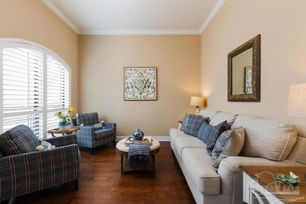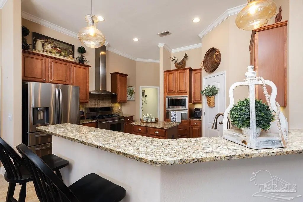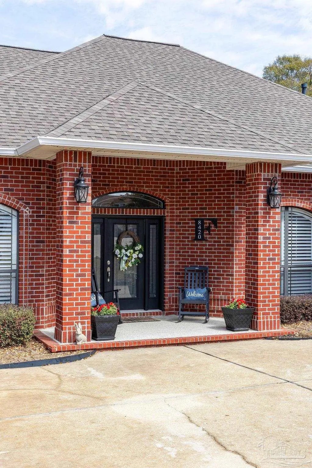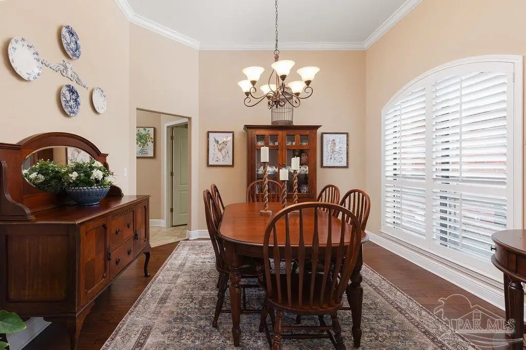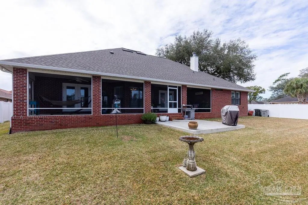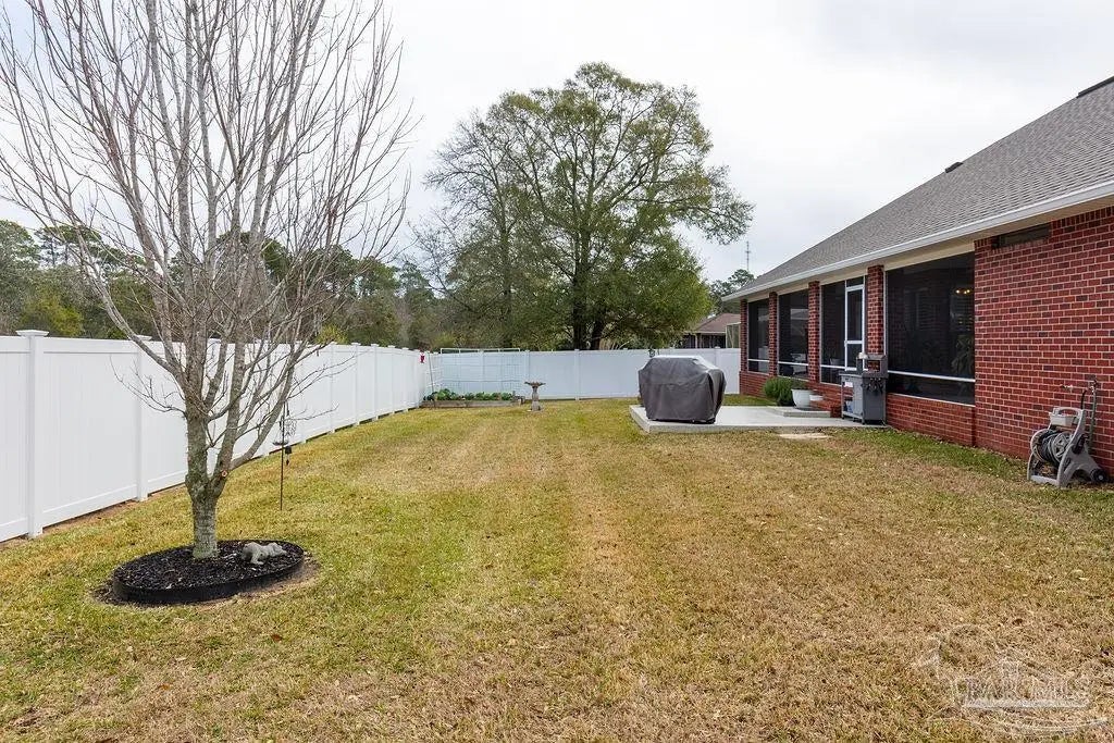 Exquisitely reimagined and masterfully refined, this distinguished corner-lot estate in White Cedar Gardens presents a rare offering of elevated design and effortless sophistication. Gracefully framed by mature trees and manicured grounds, the residence enjoys a prime setting just moments from the University of West Florida, premier medical facilities, top-rated schools, and the vibrant dining and cultural scene of Pensacola. Constructed in timeless brick, this custom home showcases a grand open-concept design accentuated by soaring vaulted ceilings, rich wood flooring, and curated designer finishes that create a seamless, elegant aesthetic throughout. The expansive living room is anchored by a striking fireplace, offering a refined yet welcoming atmosphere ideal for both intimate evenings and elevated entertaining. The chef’s kitchen is a statement of style and function, beautifully appointed with granite countertops, a textured tile backsplash, stainless KitchenAid appliances, a gas range, and an oversized breakfast bar that flows effortlessly into the dining and living spaces. The primary suite serves as a private sanctuary, featuring a recessed ceiling and a spa-inspired bath complete with a granite-topped vanity, soaking tub, and an impeccably designed walk-in shower. A thoughtfully executed split floor plan ensures privacy, with three guest bedrooms situated in their own wing alongside two beautifully appointed full baths—ideal for family or guests. Premium enhancements include a newer roof, plantation shutters, bespoke lighting, whole-house generator, elevated ceilings, remote-controlled fans, recessed lighting, and integrated smart home features. Outdoors, a fully fenced backyard reveals a freshly epoxy-coated screened veranda and extended patio designed for fire-lit gatherings, bbq nights, and sophisticated entertaining, with ample space for a future pool. A turnkey residence where craftsmanship, comfort, and location converge.