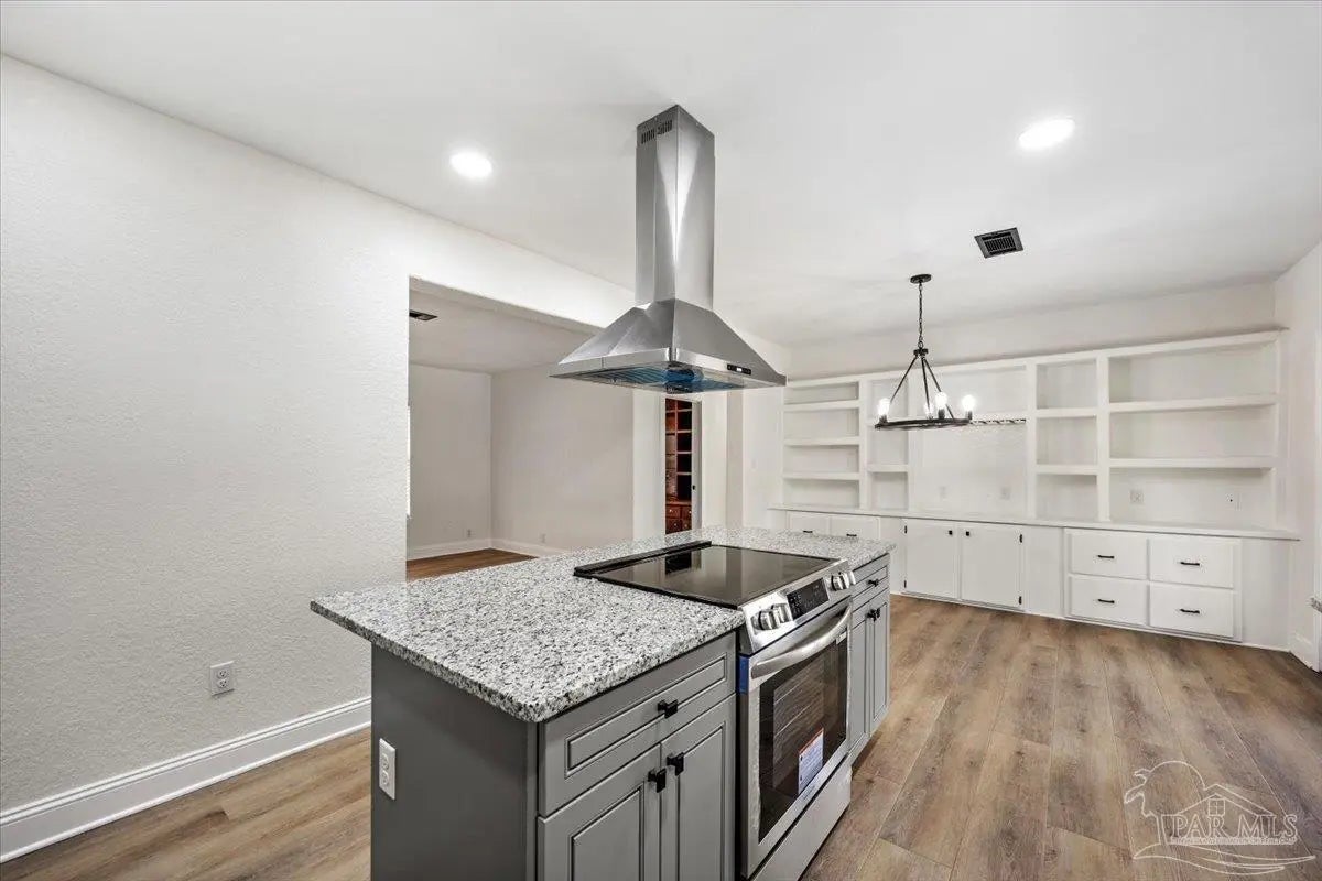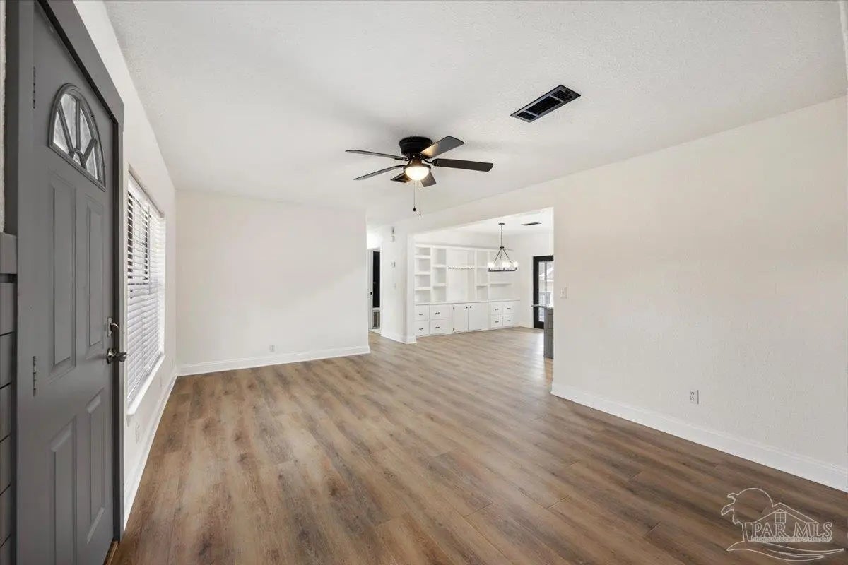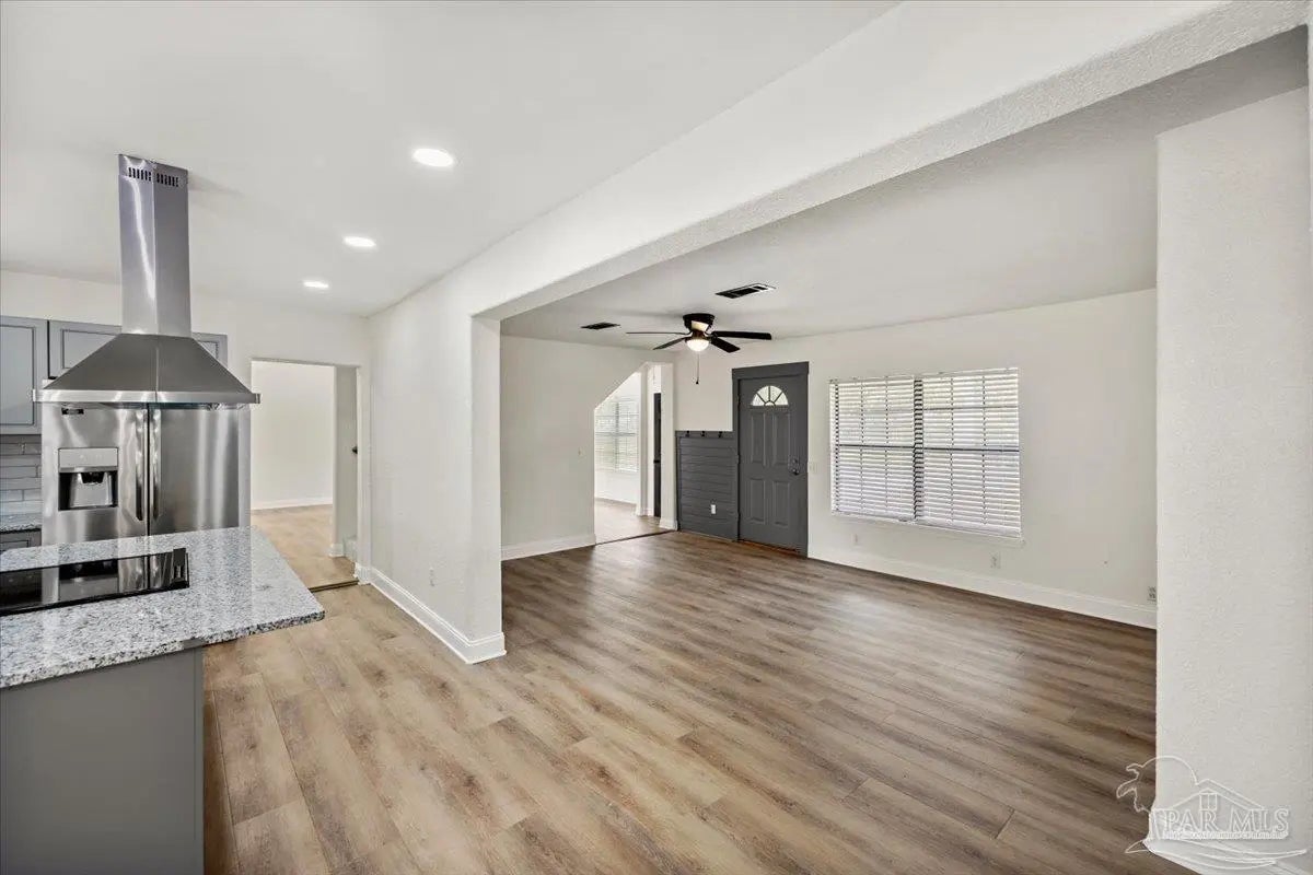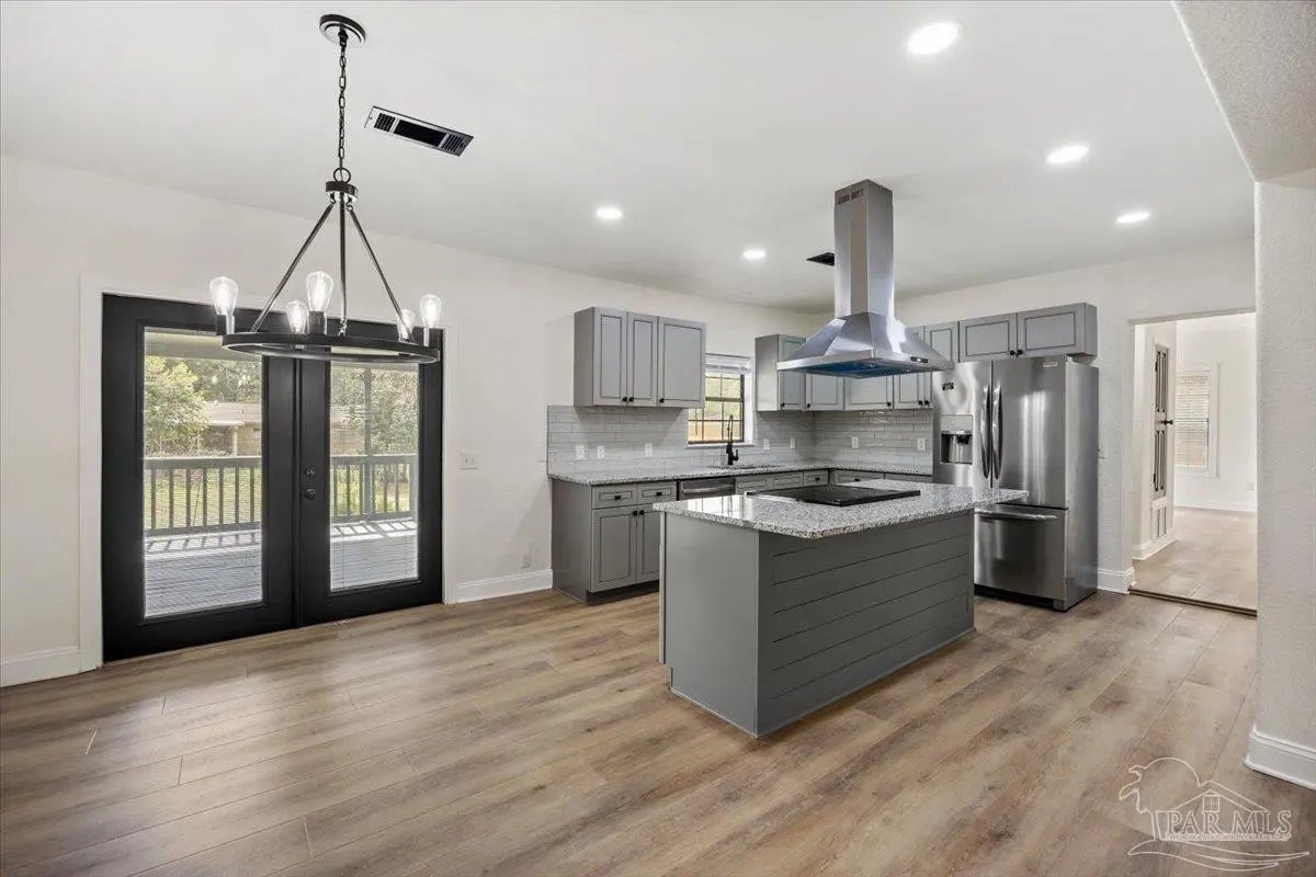 Completely renovated and move-in ready and seller offering Use Your Way Credit, this 4 bedroom, 3 bathroom home offers 2,552 square feet of updated living space plus a separate workshop building with office in the heart of Pace. From the moment you arrive, the new concrete driveway, refreshed exterior, and welcoming front porch set the tone for what’s inside. The interior has been thoughtfully transformed with updated lighting, modern fixtures, fresh finishes, and durable flooring throughout the main living areas. The remodeled kitchen serves as the centerpiece of the home, featuring granite countertops, stainless appliances, subway tile backsplash, updated cabinetry, and a large island with cooktop and vent hood, all opening seamlessly to the dining area with custom built-in cabinetry for added storage and character. Multiple living spaces provide flexibility for entertaining, working from home, or relaxing with family, and French doors lead to an expansive back deck that extends your living space outdoors. The spacious primary suite includes a well-appointed ensuite bath with double vanity, granite countertops, soaking tub, and separate tiled shower. Additional bedrooms are generously sized, and the secondary bathrooms have been updated with stylish, contemporary finishes. The detached workshop building with a small office space adds incredible versatility, offering room for hobbies, equipment, storage, or business use. This property delivers the rare combination of modern renovation, functional layout, and dedicated workspace—all in a convenient Pace location.