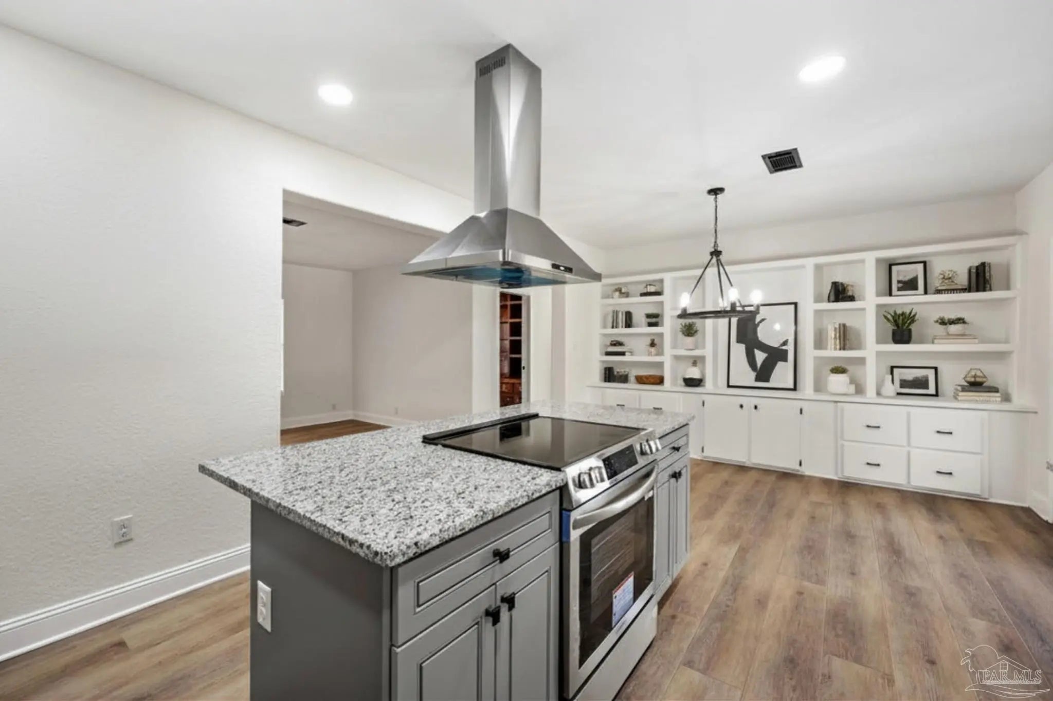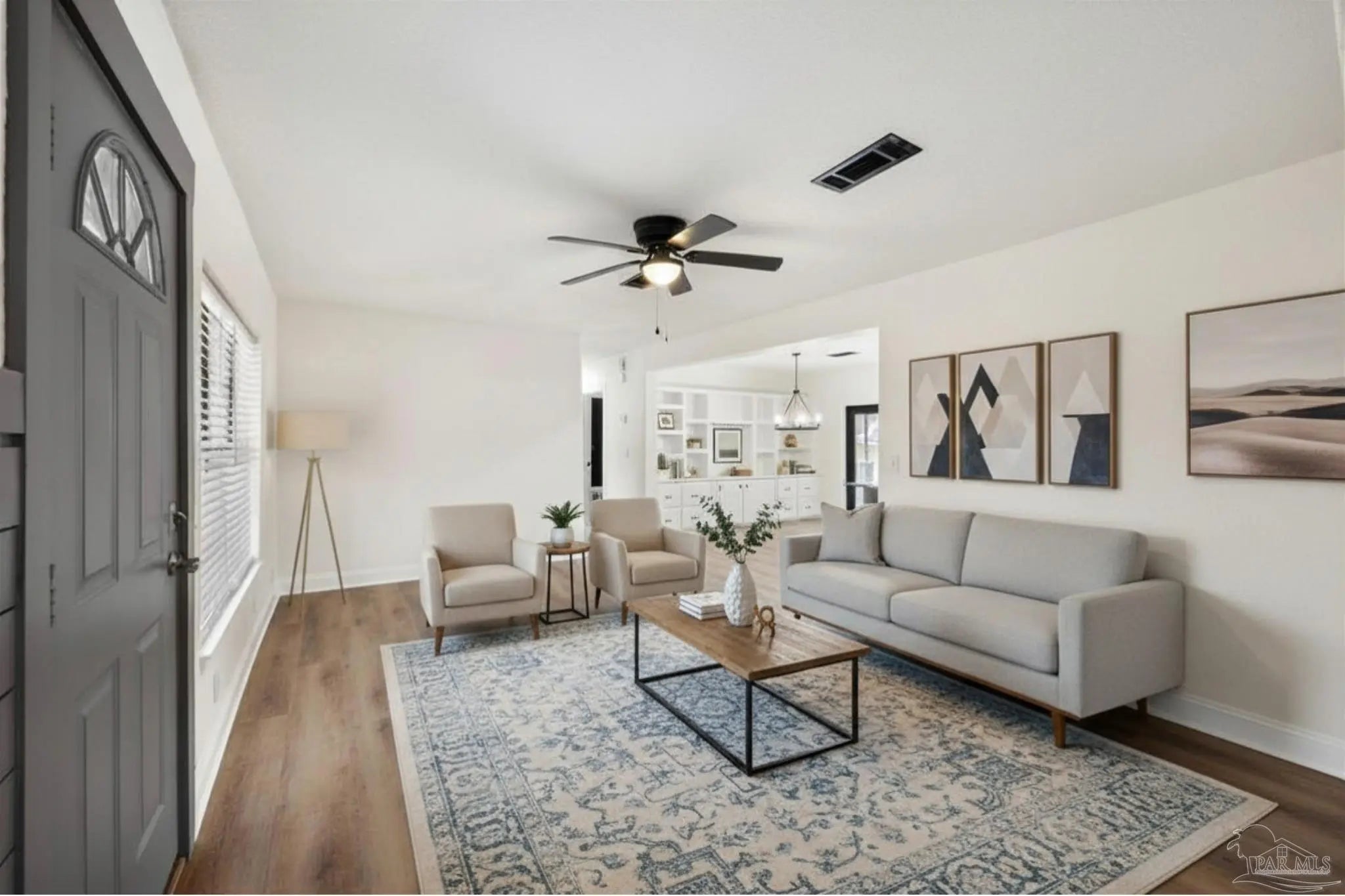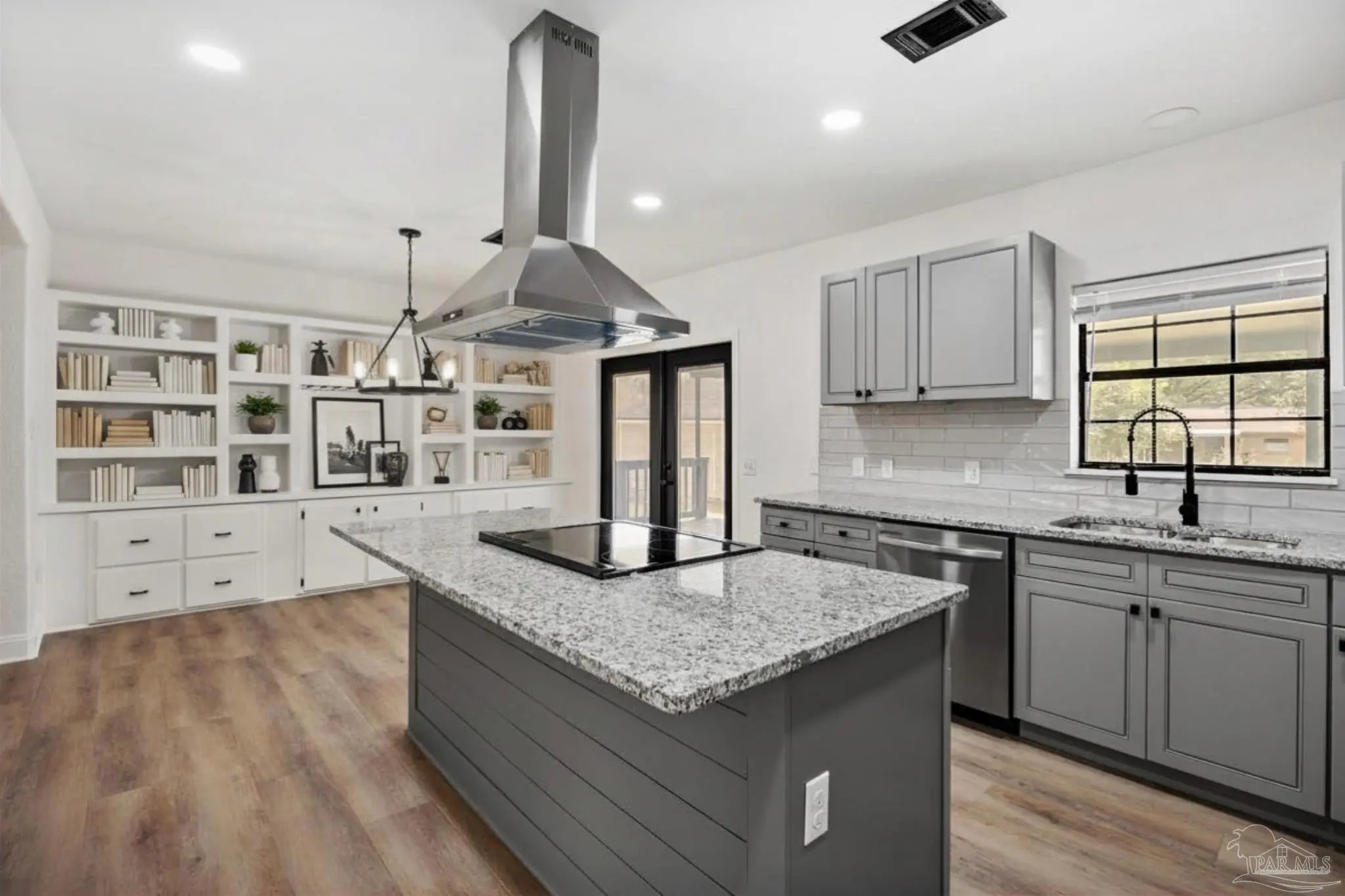 Completely renovated and move-in ready, this 4 bedroom, 3 bathroom home offers 2,552 square feet of updated living space plus a separate workshop building with office in the heart of Pace. From the moment you arrive, the new concrete driveway, refreshed exterior, and welcoming front porch set the tone for what’s inside. The interior has been thoughtfully transformed with updated lighting, modern fixtures, fresh finishes, and durable flooring throughout the main living areas. The remodeled kitchen serves as the centerpiece of the home, featuring granite countertops, stainless appliances, subway tile backsplash, updated cabinetry, and a large island with cooktop and vent hood, all opening seamlessly to the dining area with custom built-in cabinetry for added storage and character. Multiple living spaces provide flexibility for entertaining, working from home, or relaxing with family, and French doors lead to an expansive back deck that extends your living space outdoors. The spacious primary suite includes a well-appointed ensuite bath with double vanity, granite countertops, soaking tub, and separate tiled shower. Additional bedrooms are generously sized, and the secondary bathrooms have been updated with stylish, contemporary finishes. The detached workshop building with a small office space adds incredible versatility, offering room for hobbies, equipment, storage, or business use. This property delivers the rare combination of modern renovation, functional layout, and dedicated workspace—all in a convenient Pace location.