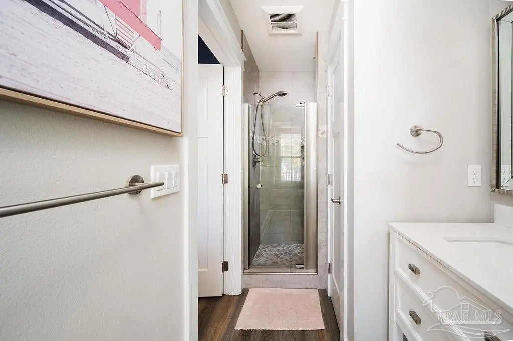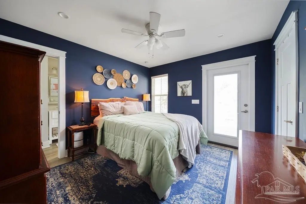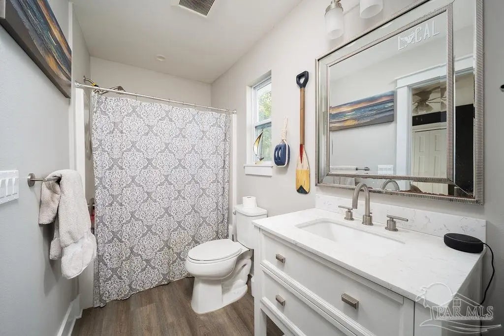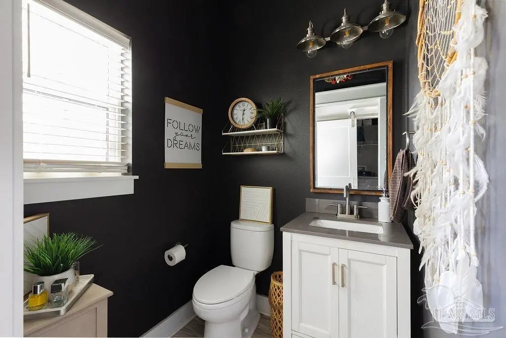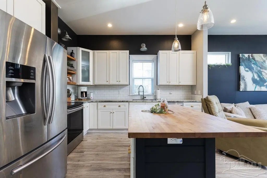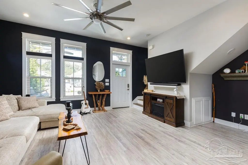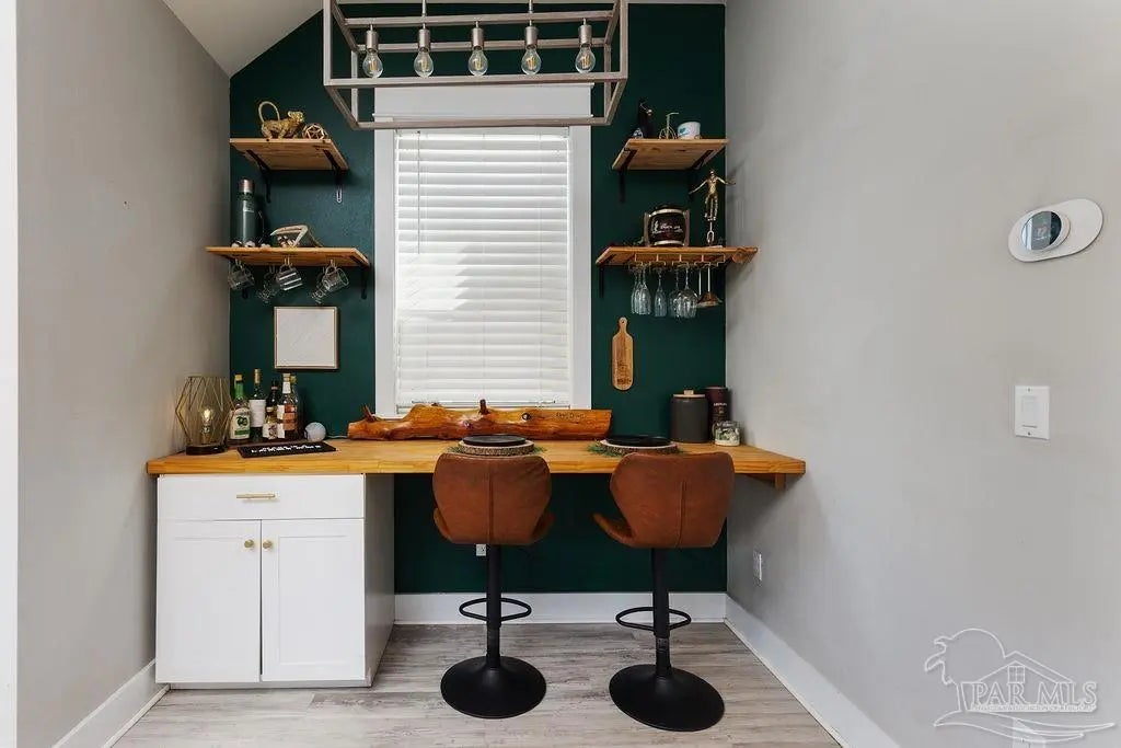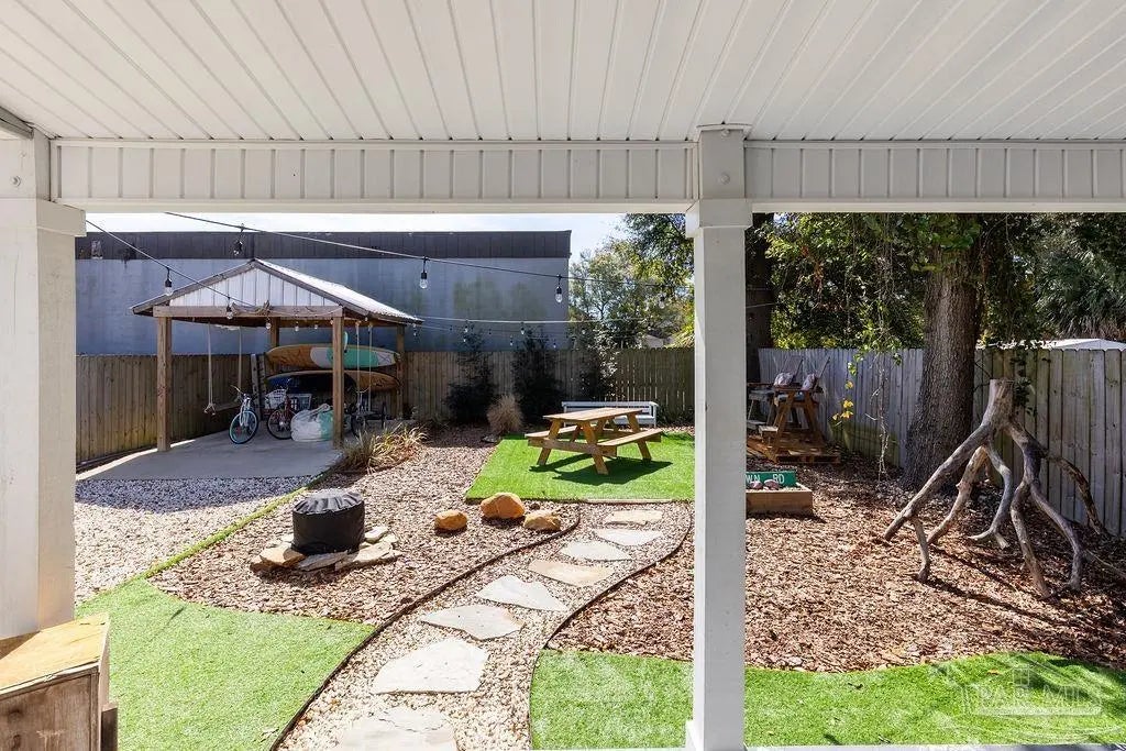 She's a whole VIBE; not your average cookie cutter. This one feels different. Inside, bold, rich tones meet bright natural light, creating a space that feels both open and cozy. Soaring ceilings and an airy layout keep it light and inviting, while deep accent walls, warm wood details, and modern finishes add depth and character. It’s just as perfect for slow mornings with coffee as it is for hosting friends on a Friday night. The kitchen is clean and modern with stainless appliances, crisp cabinetry, and a statement island that anchors the room. The custom bar nook adds just the right touch of personality; intimate, functional, and ready for happy hour. Upstairs, the bedrooms feel peaceful and tucked away, offering a quiet retreat while still maintaining the home’s stylish edge. But the real magic? The outdoor space. The backyard is thoughtfully designed for both relaxation and gathering. Artificial turf zones, natural rock beds, and string lights create a laid-back, low-maintenance oasis. There’s room for fire pit nights, picnic-table dinners, and space to unwind under the trees. The covered patio extends your living space outdoors giving you the ideal spot for gameday grill outs. Now let's talk functionality...long driveway with ample off-street parking, covered parking area for boat or vehicle storage, and a dedicated covered structure ideal for paddleboards, kayaks, bikes, and all other outdoor toys, plus it's fully fenced for privacy. BEST part? You're only 3 minutes from downtown Pensacola. This home doesn't just look good, it feels good. She's stylish, low maintence, in a dream location, and designed for real life. Come swoon over her!
