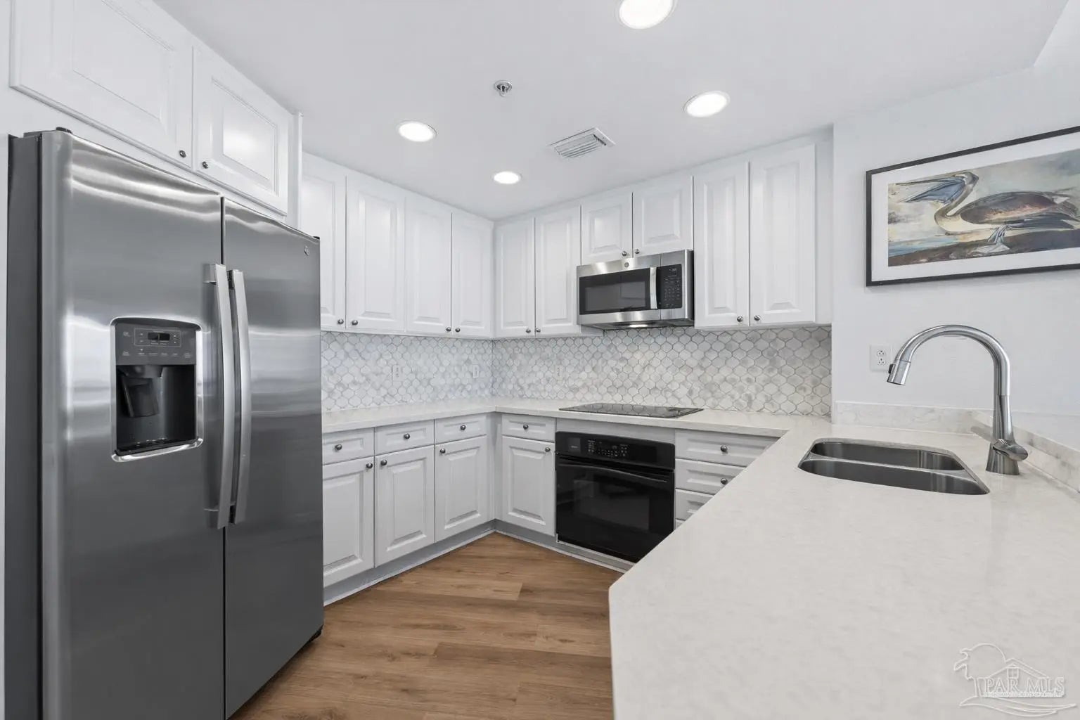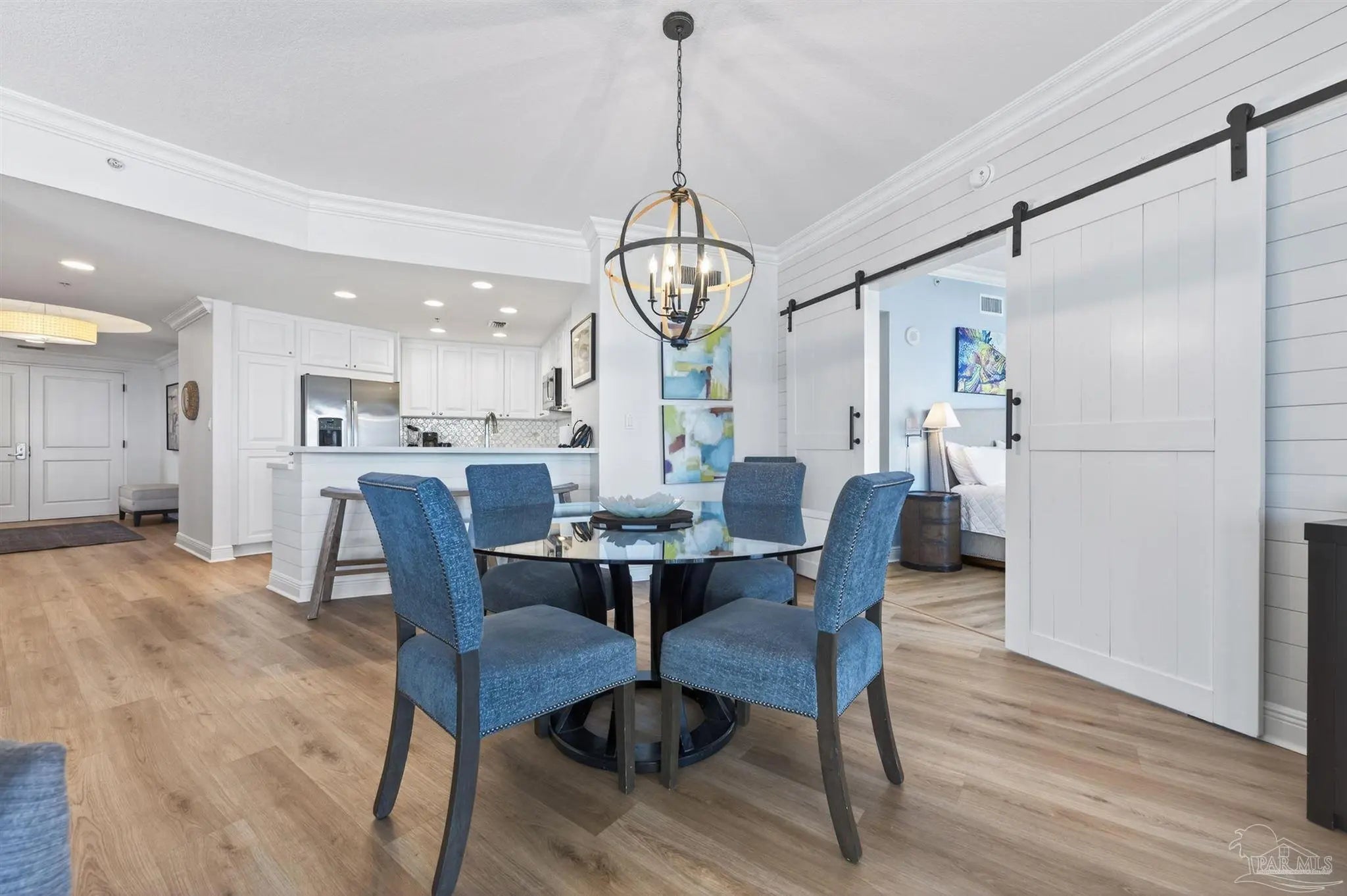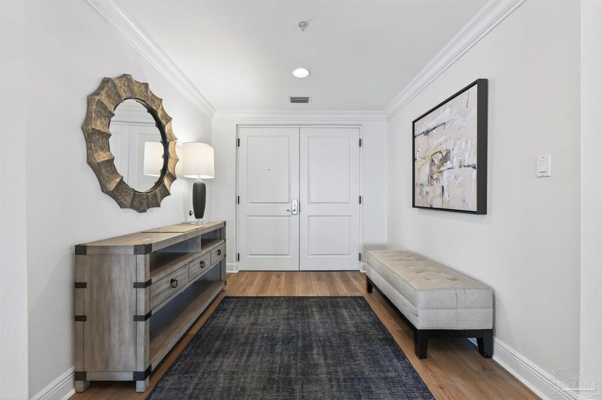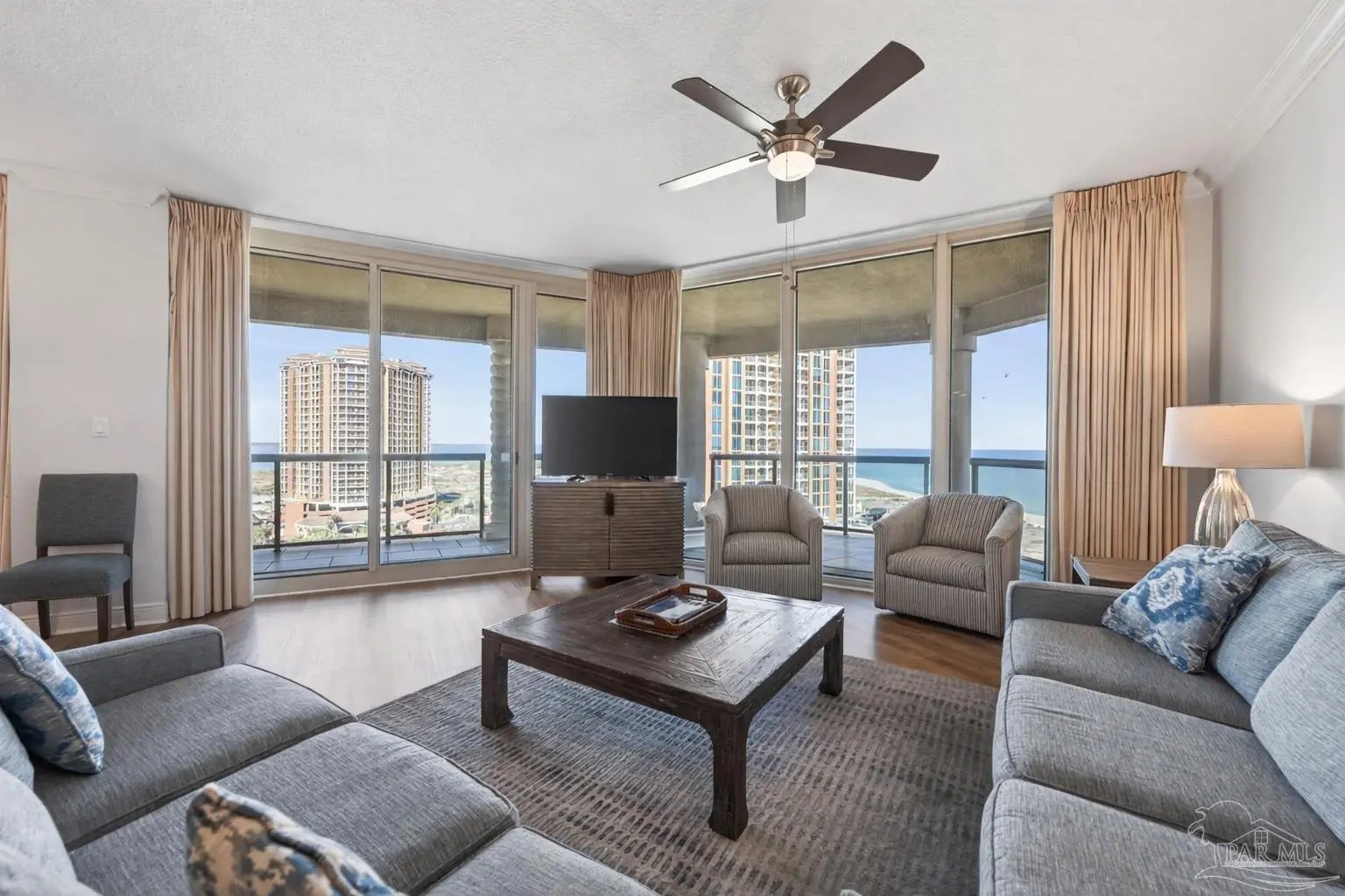 Welcome to luxury coastal living at Portofino Island Resort! This stunning, upgraded twelfth floor residence in Tower 5 showcases breathtaking 180-degree views of the Gulf and Santa Rosa Sound. The residence is being sold FULLY FURNISHED, offering a seamless move-in or rental ready opportunity. With rental history coming in at over $100k, this property offers excellent short term rental potential! This unit offers an expansive balcony (44x17ft) designed for entertaining or taking in the sparkling water views and sunsets. Inside, the open-concept areas are anchored by Gulf views and enhanced by high ceilings and crown molding. Luxury vinyl plank flooring runs throughout the entire unit, complemented by fresh, neutral paint. The kitchen is beautifully appointed with quartz countertops, white cabinetry, sleek backsplash, a breakfast bar, and an adjacent dining area. Each bedroom is privately positioned on its own corner of the unit and each features its own en suite bathroom. The primary suite offers direct balcony access, a spacious walk-in closet, and a beautifully upgraded tiled walk-in shower, double vanities, and a water closet. A second bedroom also enjoys balcony access, a walk-in closet, and an en suite bath with a tiled standing shower. The third bedroom is generously sized to accommodate two beds, includes two closets, and features a bathroom with a tub/shower combo. A half bath sits just off the main living area for guest use. Additional highlights include two assigned covered parking spaces, an assigned storage unit, and a built in grilling area on the balcony. Portofino Island Resort offers unparalleled amenities including direct access to both the Gulf of Mexico and the Santa Rosa Sound, multiple pools and spas, a full-service spa, a state-of-the-art fitness center, tennis courts, and on-site dining. Only minutes from the dog park and all that Pensacola Beach has to offer, this condo will make you feel at home and on vacation all year long!