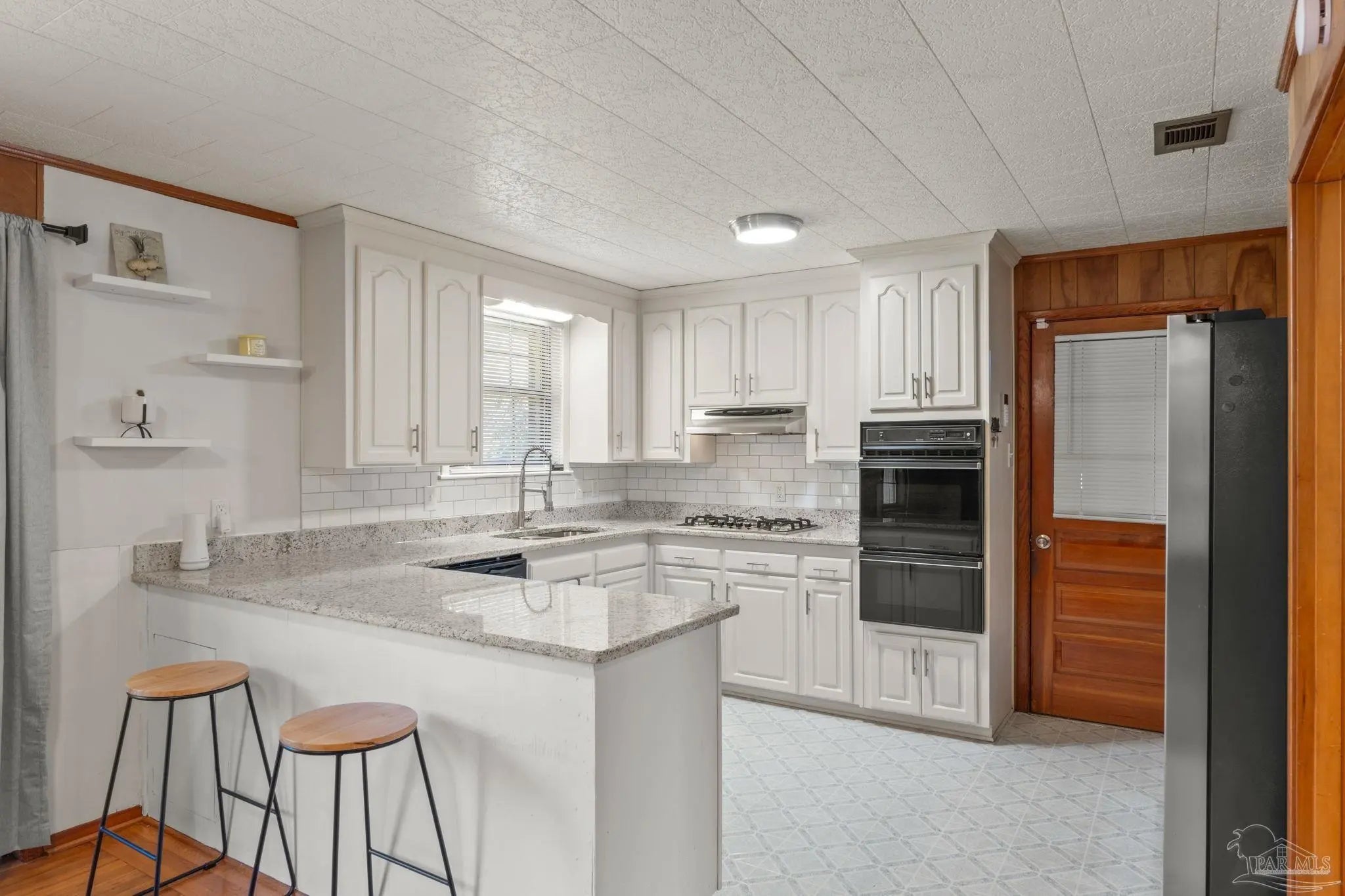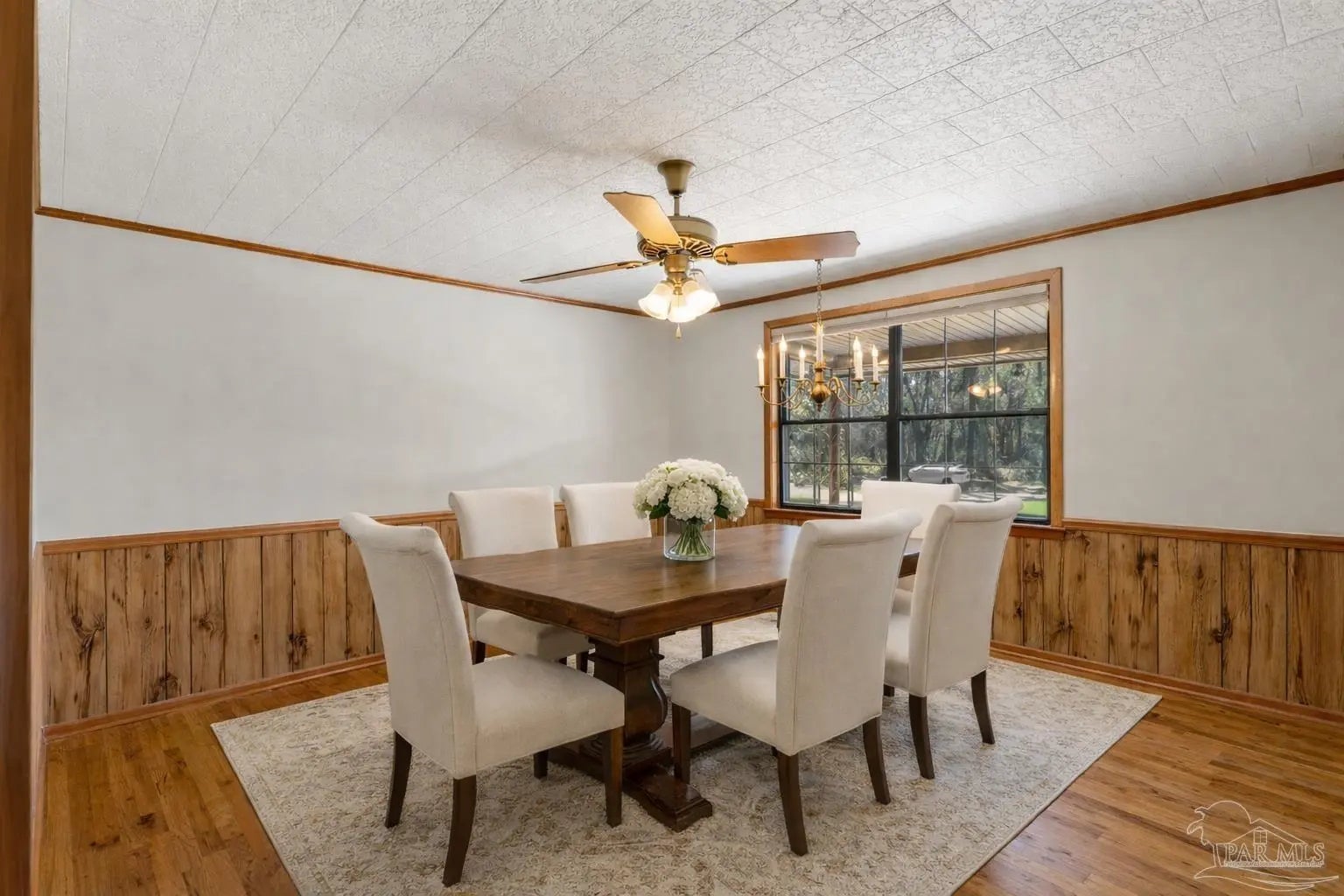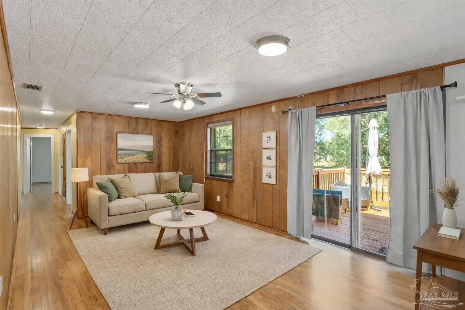 Back on Market! This property is situated far back from the road, on almost a full acre of land. With few neighbors and no HOA, you enjoy exceptional privacy along with ample parking for an RV or boat. As you walk up to the property, you will imagine quiet mornings on the inviting covered front porch with your favorite cup of coffee. Upon entry, notice gleaming hardwood floors that flow throughout the home. Warm wood paneling in the living and dining areas adds architectural character and a cozy, timeless touch that complements the home’s modern updates. The kitchen has been thoughtfully updated with newer cabinetry, new stainless gas cooktop, new stainless dishwasher, updated hardware, brand new countertops and a custom backsplash. It boasts a breakfast bar and opens seamlessly to the spacious den with a sliding door that overlooks the expansive backyard. In addition to the main living areas, a flexible room off the kitchen can serve as a formal dining space, while an additional front room offers endless possibilities as a formal living room, office, or playroom. Down the hallway, you will find two guest bedrooms and a beautifully remodeled hall bathroom. The generous primary suite is privately positioned at the end of the hall and includes a newly remodeled en-suite bathroom. The large, fenced backyard is shaded by mature trees, azaleas, and camellias, offering endless possibilities for entertaining, gardening, or hobbies. A spacious back deck provides the perfect outdoor gathering space, and the updated 12x24 storage shed includes electricity for added functionality. Major system upgrades provide peace of mind with a new roof installed in 2026, HVAC in 2022, water heater in 2019 and a whole home rewire. The home also features gutters, four-zone, well-fed sprinkler system, roll down hurricane shutters and a transferable termite bond. Conveniently located close to shopping, dining, medical facilities, entertainment and military bases. Schedule a tour today!