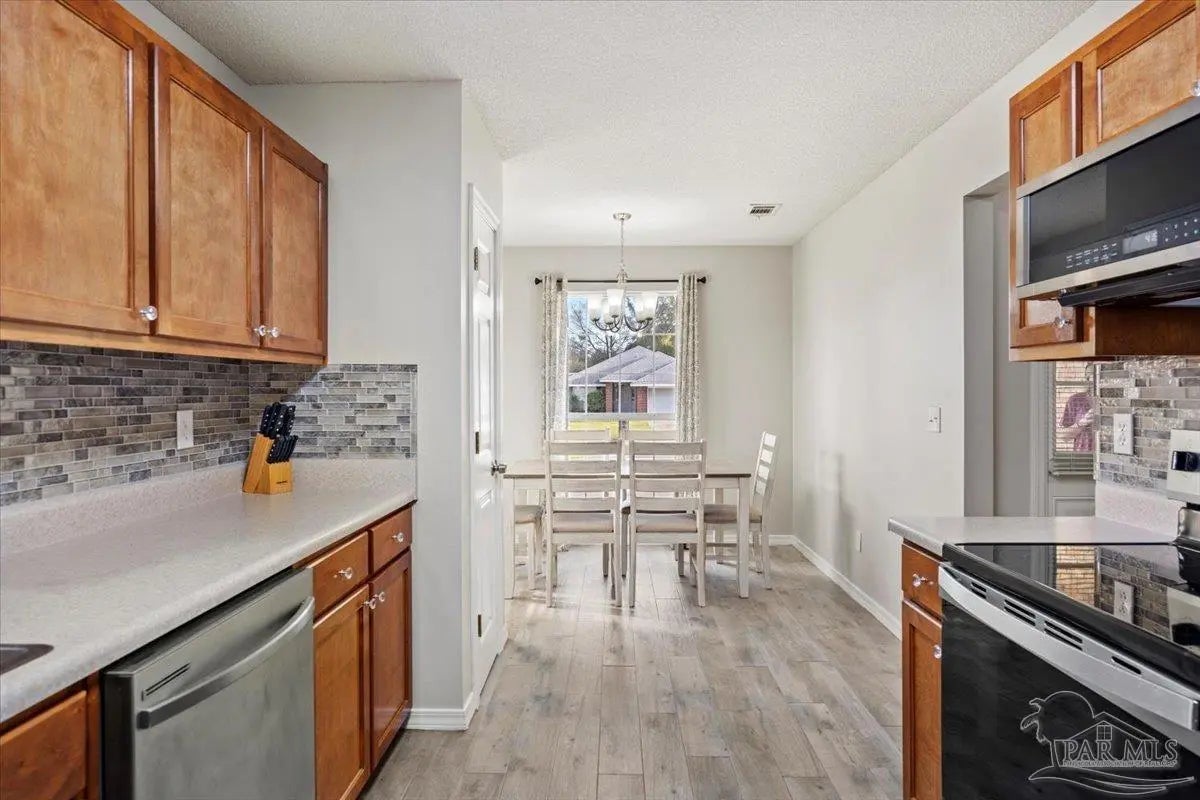 Move-in ready remodeled brick home in Pensacola near NAS! This beautifully updated 3-bedroom, 2-bath home in Amelia Place offers the solid construction buyers love with stylish modern finishes. Inside you’ll find stunning flooring Italian porcelain tile, bamboo in 2 bedrooms, fresh neutral décor, and tasteful lighting throughout. The spacious eat-in kitchen features beautiful solid wood cabinetry, stainless steel appliances, a brand-new stove and low-profile microwave, and designer backsplash. Major updates include a 2020 roof, newer HVAC and water heater for peace of mind. Enjoy a nicely sized fenced backyard and the added protection of a hurricane shutter system. Conveniently located minutes from NAS Pensacola, Cory Station, downtown Pensacola, shopping, dining, I-10, and the famous white sand beaches. 2 years of choice home warranty remain.