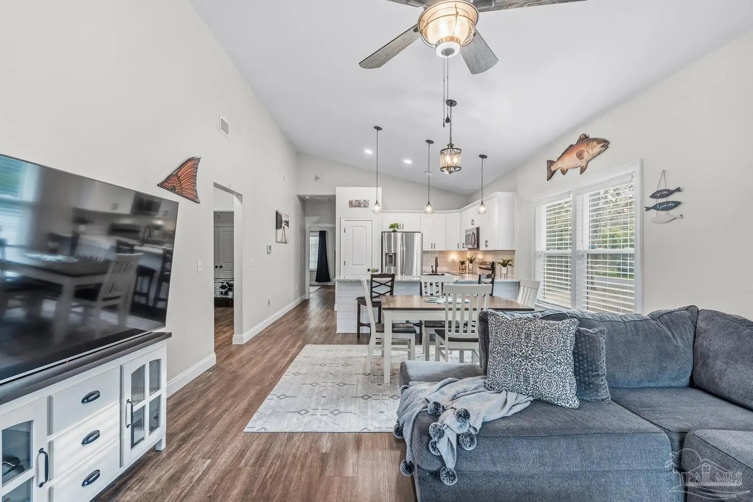 Like new and absolutely immaculate, this beautifully maintained Craftsman-style home sits on a quiet corner lot just under one-third of an acre near the historic Bagdad area. From the moment you step inside, you’re welcomed by a spacious living room that flows seamlessly into a stunning kitchen, creating an ideal layout for everyday living and entertaining. Luxury vinyl plank flooring, elegant fixtures, and soaring 14-foot vaulted ceilings add a bright, upscale feel throughout the home. The kitchen offers abundant workspace with granite countertops, white cabinetry, stainless steel appliances, a pantry, and a convenient breakfast bar. Two additional bedrooms and a full bath are located just off the living area, while the private primary suite is thoughtfully separated and features a large walk-in closet, granite-topped vanity, and a beautifully tiled walk-in shower. Outside, enjoy a fully fenced backyard with a double gate for easy boat or trailer storage, mature magnolia and oak trees draped in Spanish moss, and blooming azaleas and camellias that create a picturesque setting. With plenty of room for outdoor entertaining, projects, or simply relaxing, this property offers space, privacy, and flexibility—plus the added bonus of no HOA. This move-in-ready home truly has it all. Schedule your showing today!