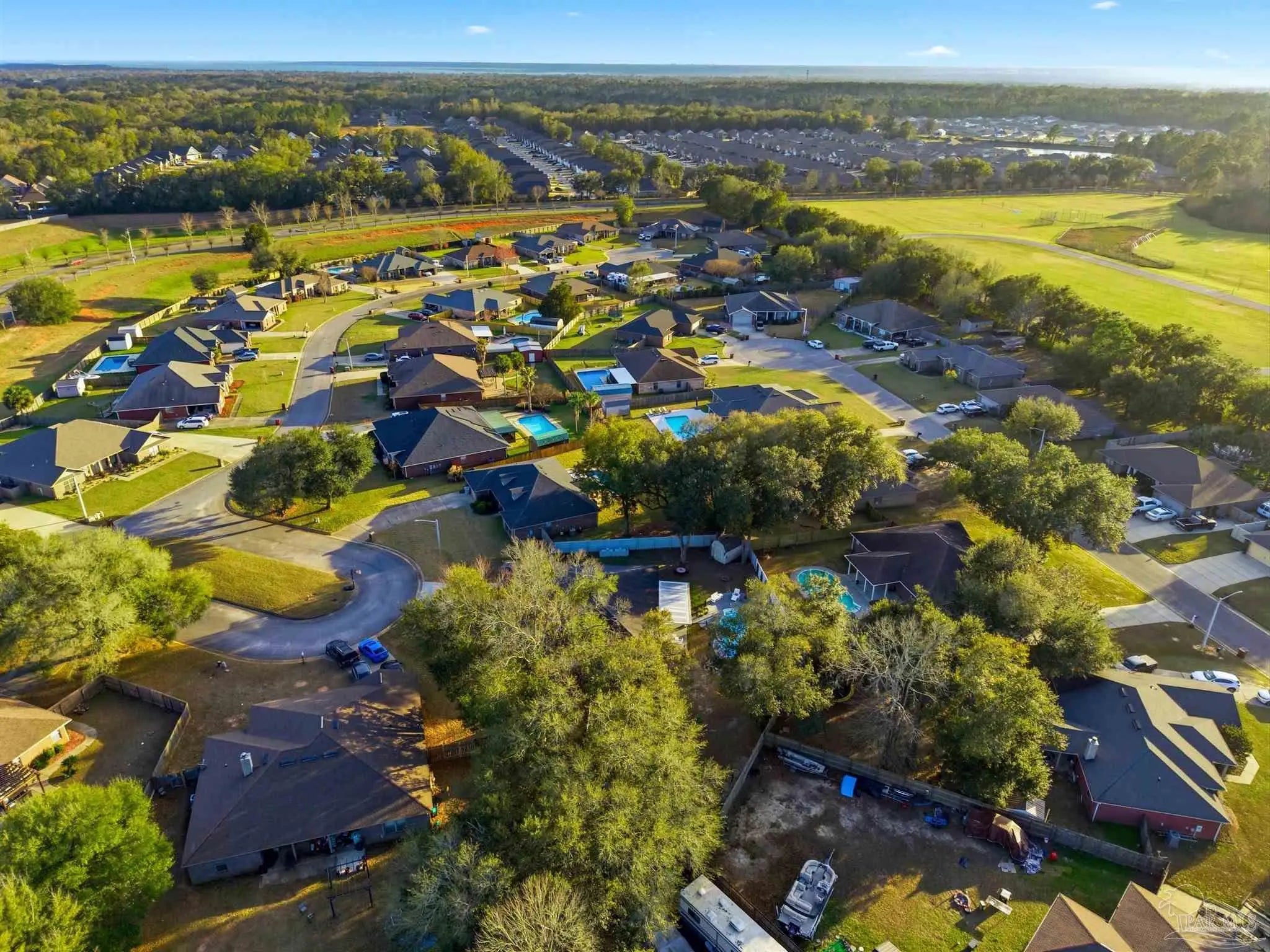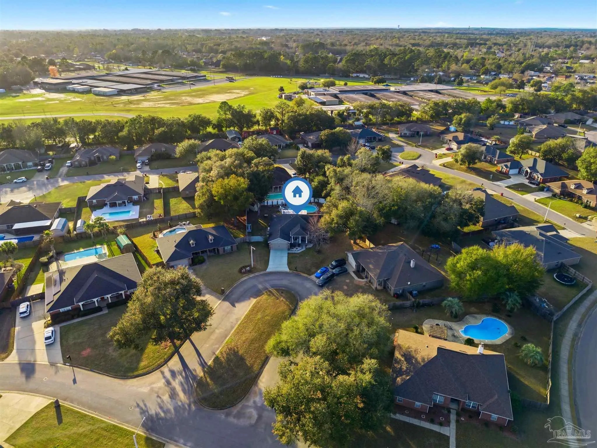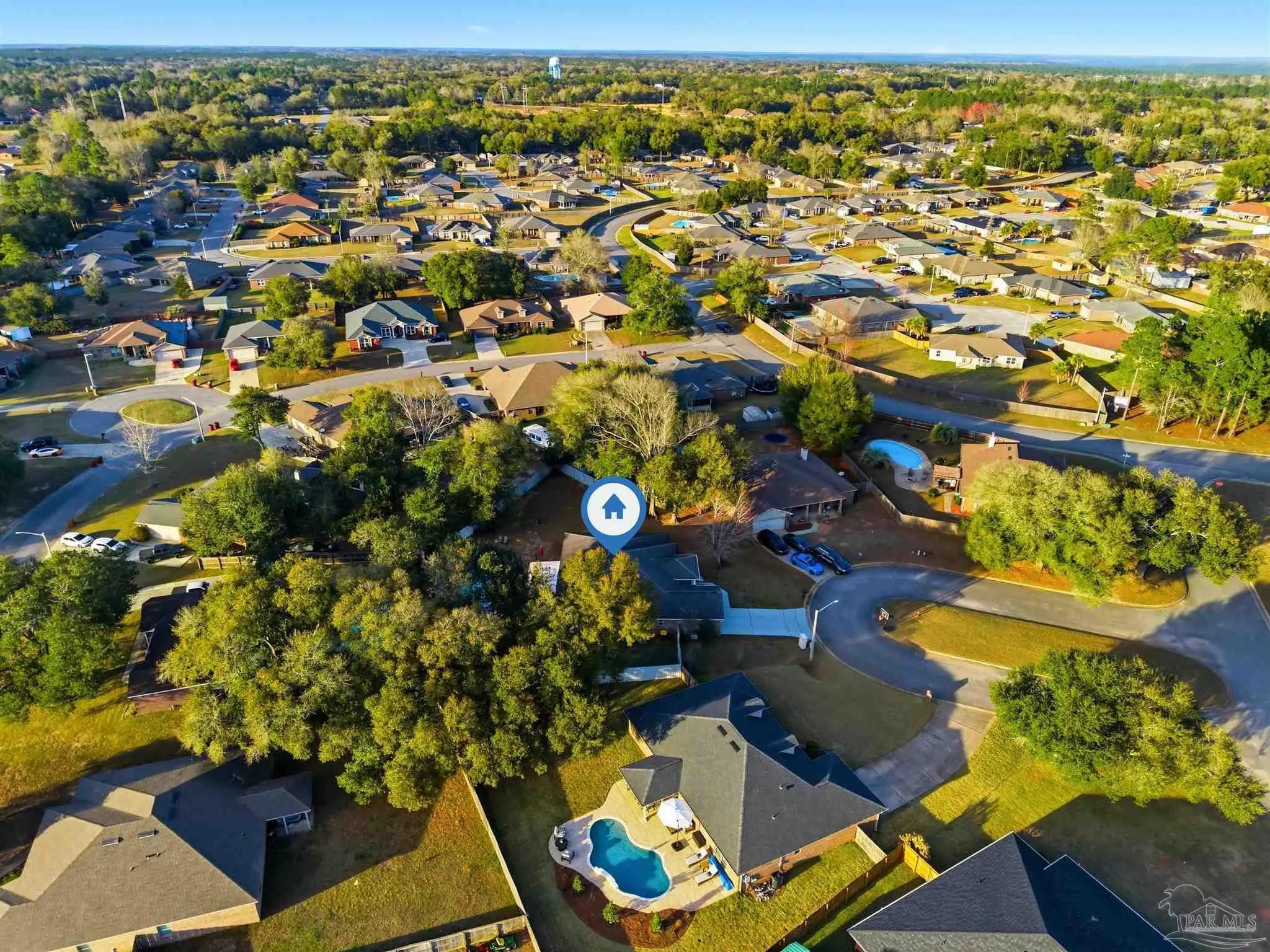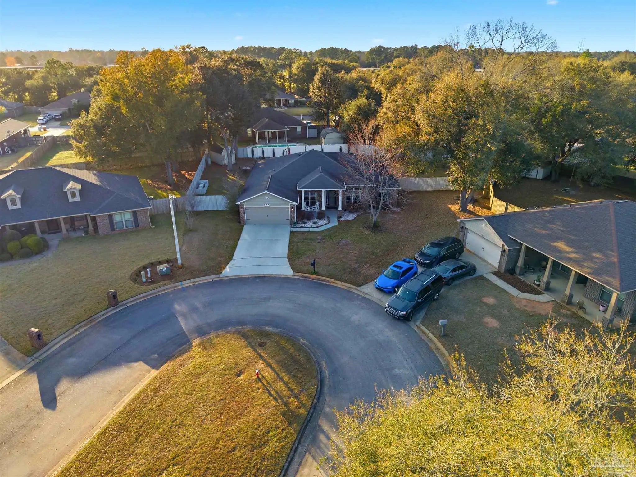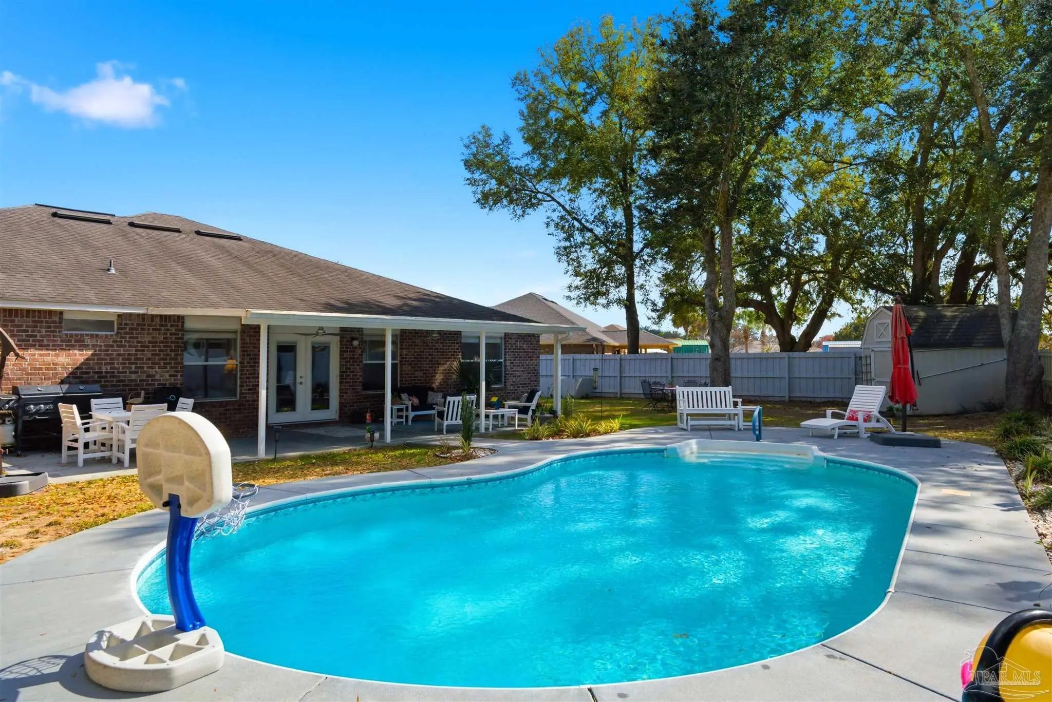 SALTWATER POOL HOME IN PACE! 5 bedrooms, 3 FULL baths, and no carpet anywhere. This all-brick home offers 2,683 square feet and sits on a quiet cul-de-sac just off Chumuckla Highway in Pace Mill Creek, minutes from shopping, dining, Benny Russell Park, and the scenic 4-mile walking path around Spencer Field. Inside, you'll find soaring ceilings, arched openings, and a spacious open layout filled with natural light. The Great Room flows into the kitchen, featuring granite countertops, rich wood cabinetry, stainless steel appliances, including a Bosch 3rd-rack dishwasher, a center island, breakfast bar seating, and decorative pot rack lighting. Flooring includes Luxury Vinyl Plank (LVP) in the main living areas and bedrooms, and tile in the kitchen and baths—no carpet anywhere in the home. Just off the living area is a bright Florida room/sunroom with tile flooring and French doors leading to the backyard. The split-bedroom layout offers privacy, with an oversized primary suite featuring double vanities, a walk-in tub, a separate shower, and TWO oversized closets. Four additional bedrooms and two more full baths provide flexibility for family, guests, or a home office. The fifth bedroom is tucked into its own corner of the home with a full bath nearby, offering added flexibility for guests or multi-purpose use. Out back, you'll find a sparkling in-ground pool with a liner replaced about 3 years ago, a 25x12 covered porch, and a 10x12 open patio perfect for entertaining. Additional features include a sprinkler system on city water, a finished two-car garage with pull-down attic stairs, a storage shed, a Dolphin pool cleaner, whole house generator, aluminum hurricane shutters, an electric car charging station, a Lorex 14 camera (8 exterior, 6 interior) POE system with DVR, and a fully fenced backyard.