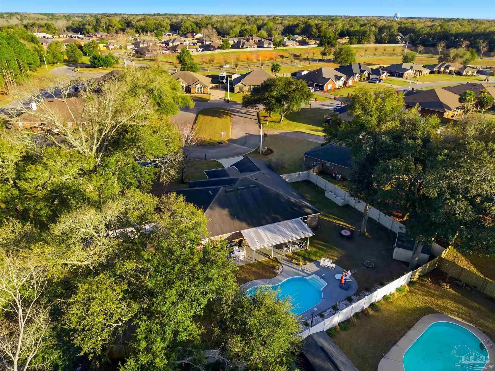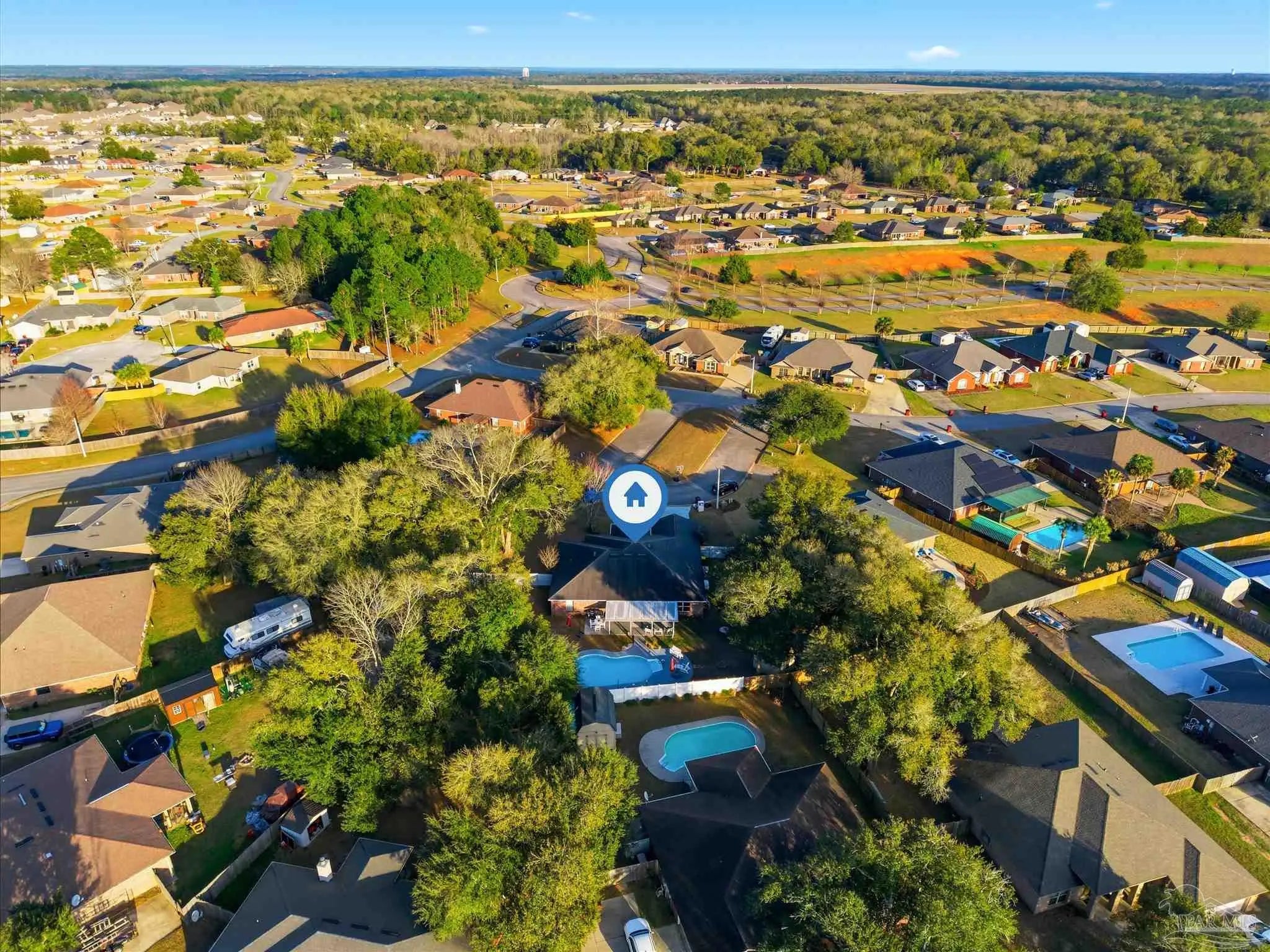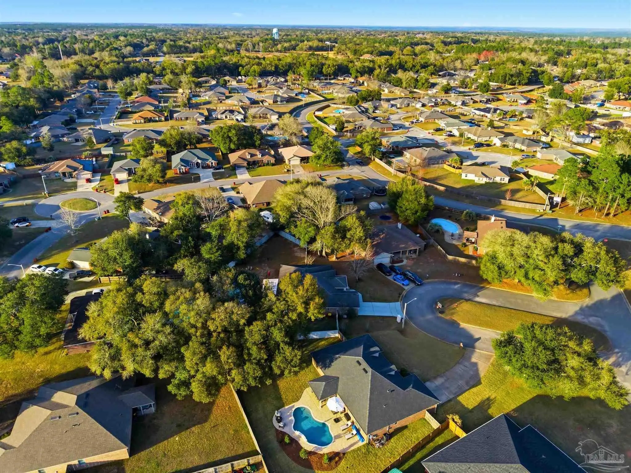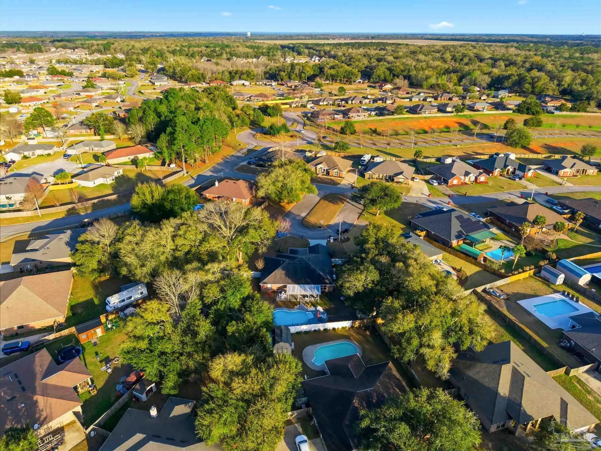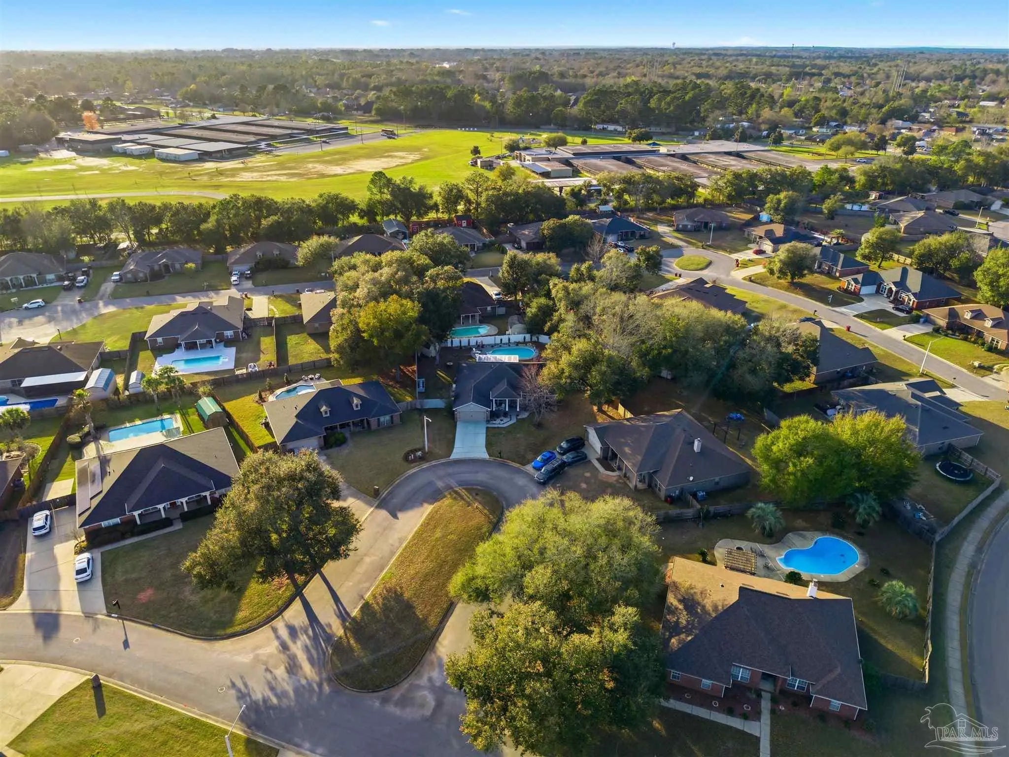 SALTWATER POOL HOME IN PACE! 5 bedrooms, 3 FULL baths, and no carpet anywhere. This all-brick home offers 2,683 square feet and sits on a quiet cul-de-sac just off Chumuckla Highway in Pace Mill Creek, minutes from shopping, dining, Benny Russell Park, and the scenic 4-mile walking path around Spencer Field. Inside, you'll find soaring ceilings, arched openings, and a spacious open layout filled with natural light. The Great Room flows into the kitchen, featuring granite countertops, rich wood cabinetry, stainless steel appliances, including a Bosch 3rd-rack dishwasher, a center island, breakfast bar seating, and decorative pot rack lighting. Flooring includes Luxury Vinyl Plank (LVP) in the main living areas and bedrooms, and tile in the kitchen and baths—no carpet anywhere in the home. Just off the living area is a bright Florida room/sunroom with tile flooring and French doors leading to the backyard. The split-bedroom layout offers privacy, with an oversized primary suite featuring double vanities, a walk-in tub, a separate shower, and TWO oversized closets. Four additional bedrooms and two more full baths provide flexibility for family, guests, or a home office. The fifth bedroom is tucked into its own corner of the home with a full bath nearby, offering added flexibility for guests or multi-purpose use. Out back, you'll find a sparkling in-ground pool with a liner replaced about 3 years ago, a 25x12 covered porch, and a 10x12 open patio perfect for entertaining. Additional features include a sprinkler system on city water, a finished two-car garage with pull-down attic stairs, a storage shed, a Dolphin pool cleaner, whole house generator, aluminum hurricane shutters, an electric car charging station, a Lorex 14 camera (8 exterior, 6 interior) POE system with DVR, and a fully fenced backyard.