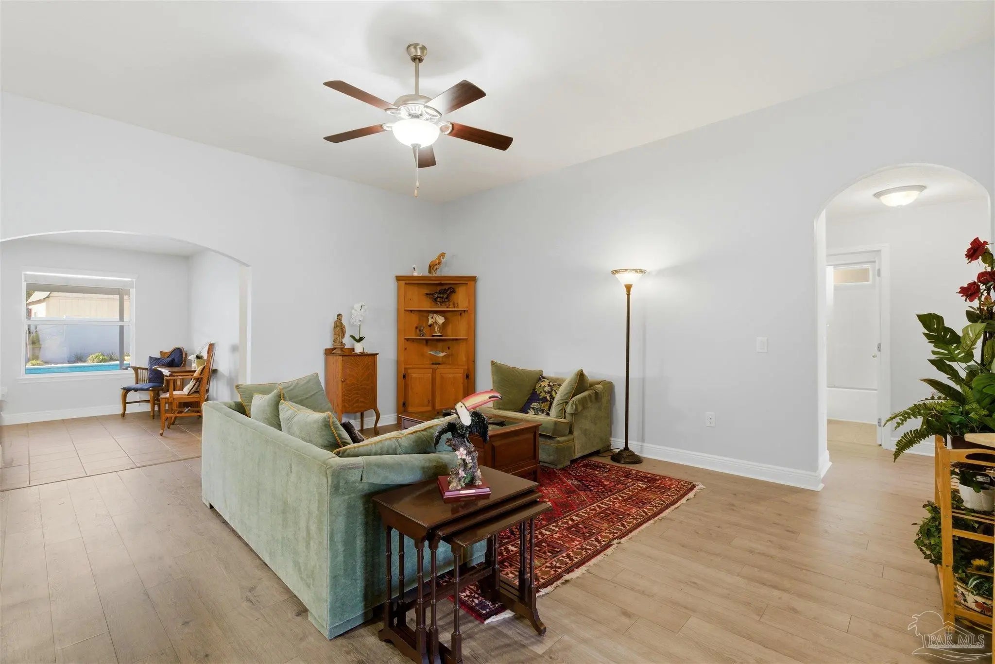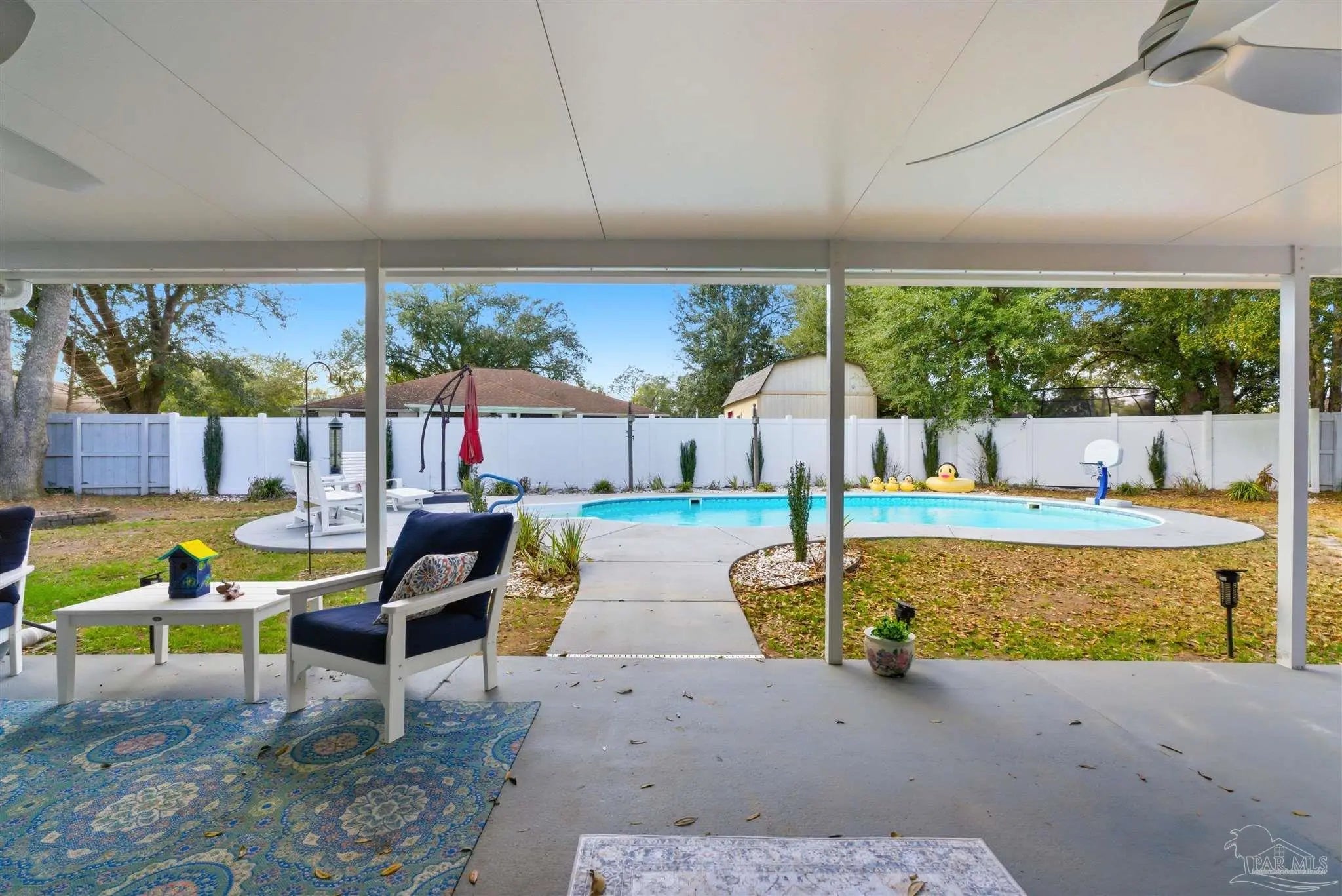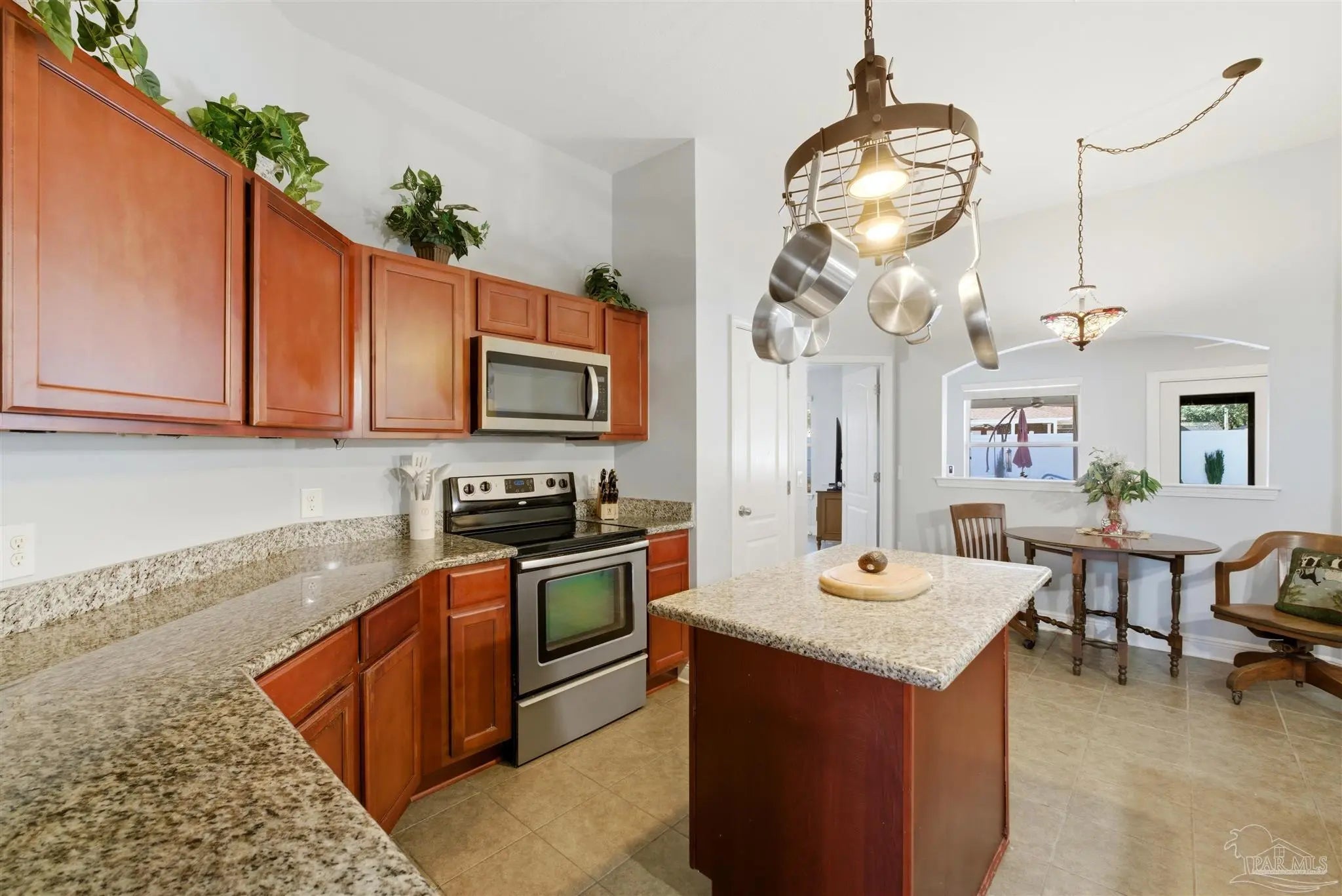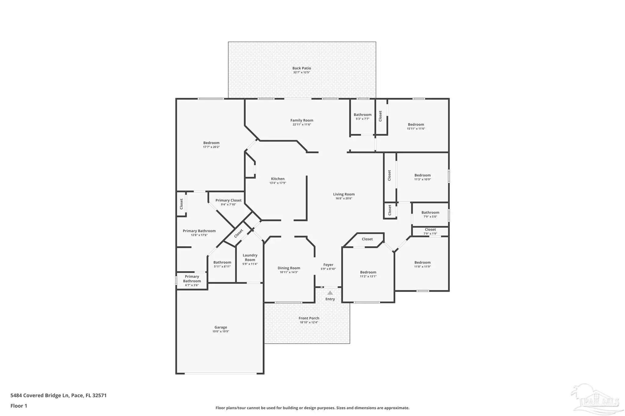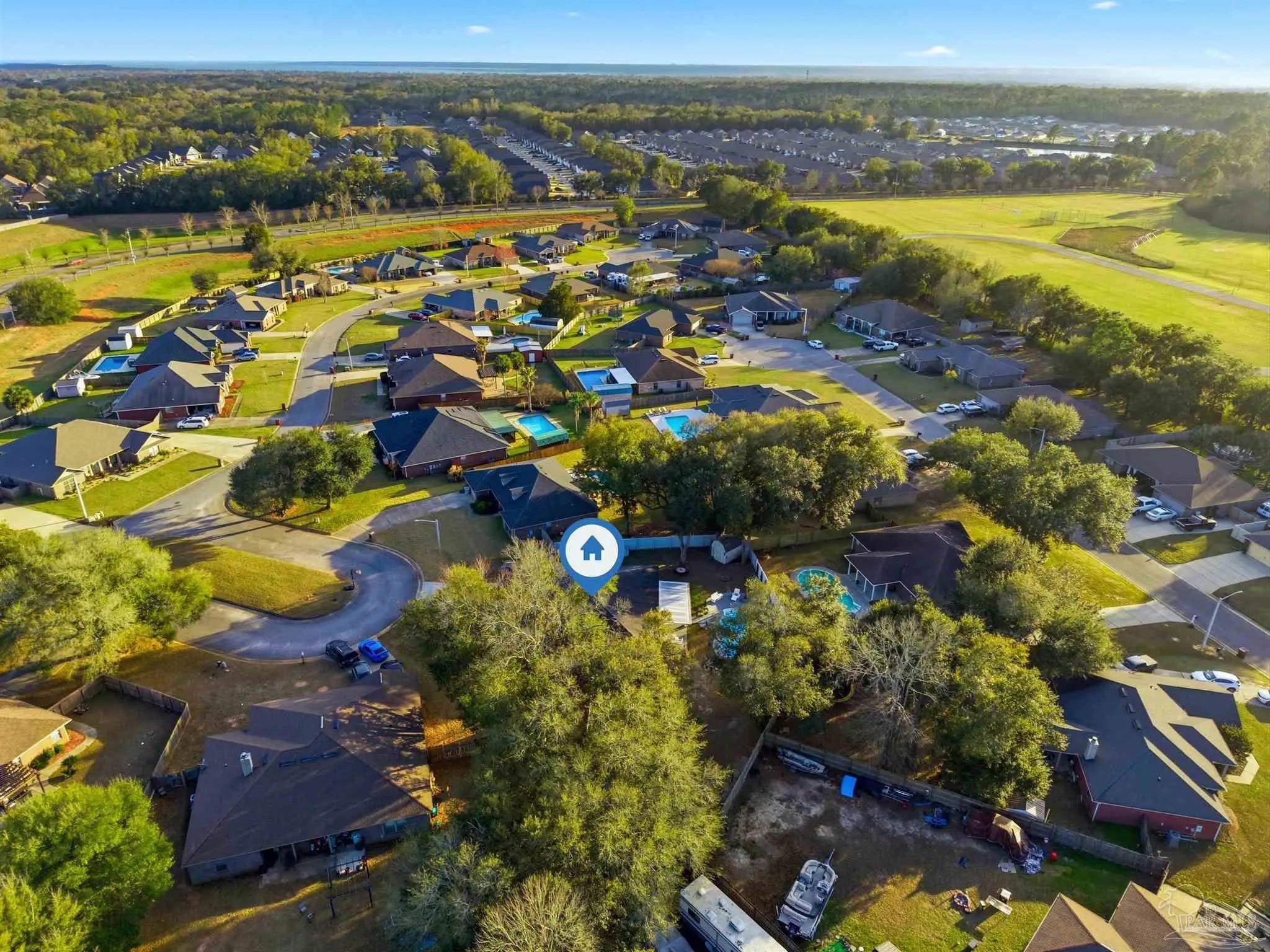 SALTWATER POOL HOME IN PACE! 5 bedrooms, 3 FULL baths, and no carpet anywhere. This all-brick home offers 2,683 square feet and sits on a quiet cul-de-sac just off Chumuckla Highway in Pace Mill Creek, minutes from shopping, dining, Benny Russell Park, and the scenic 4-mile walking path around Spencer Field. Inside, you'll find soaring ceilings, arched openings, and a spacious open layout filled with natural light. The Great Room flows into the kitchen, featuring granite countertops, rich wood cabinetry, stainless steel appliances, including a Bosch 3rd-rack dishwasher, a center island, breakfast bar seating, and decorative pot rack lighting. Flooring includes Luxury Vinyl Plank (LVP) in the main living areas and bedrooms, and tile in the kitchen and baths—no carpet anywhere in the home. Just off the living area is a bright Florida room/sunroom with tile flooring and French doors leading to the backyard. The split-bedroom layout offers privacy, with an oversized primary suite featuring double vanities, a walk-in tub, a separate shower, and TWO oversized closets. Four additional bedrooms and two more full baths provide flexibility for family, guests, or a home office. The fifth bedroom is tucked into its own corner of the home with a full bath nearby, offering added flexibility for guests or multi-purpose use. Out back, you'll find a sparkling in-ground pool with a liner replaced about 3 years ago, a 25x12 covered porch, and a 10x12 open patio perfect for entertaining. Additional features include a sprinkler system on city water, a finished two-car garage with pull-down attic stairs, a storage shed, a Dolphin pool cleaner, whole house generator, aluminum hurricane shutters, an electric car charging station, a Lorex 14 camera (8 exterior, 6 interior) POE system with DVR, and a fully fenced backyard.