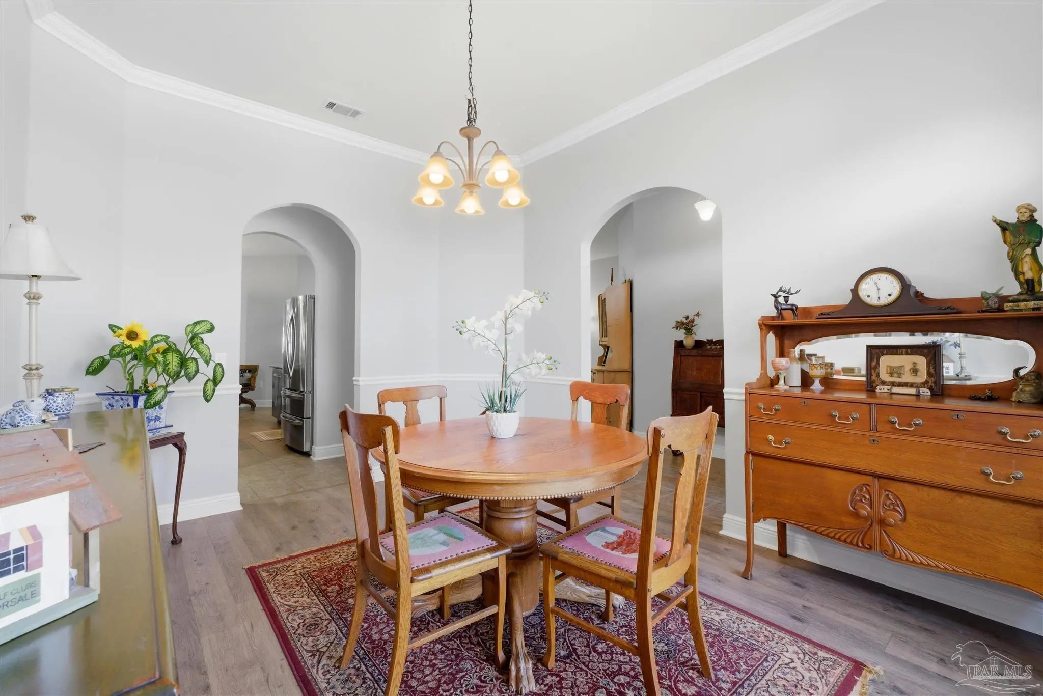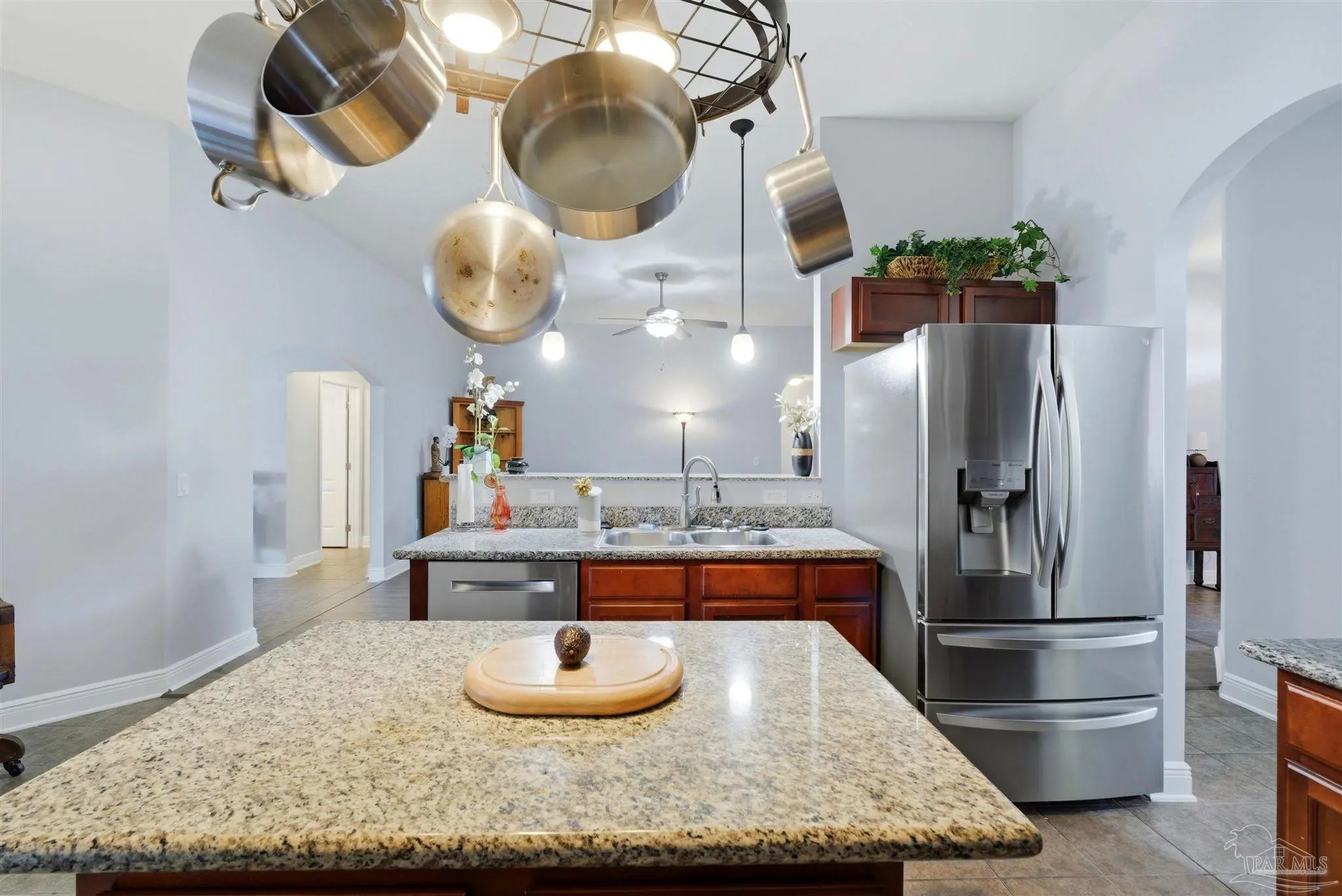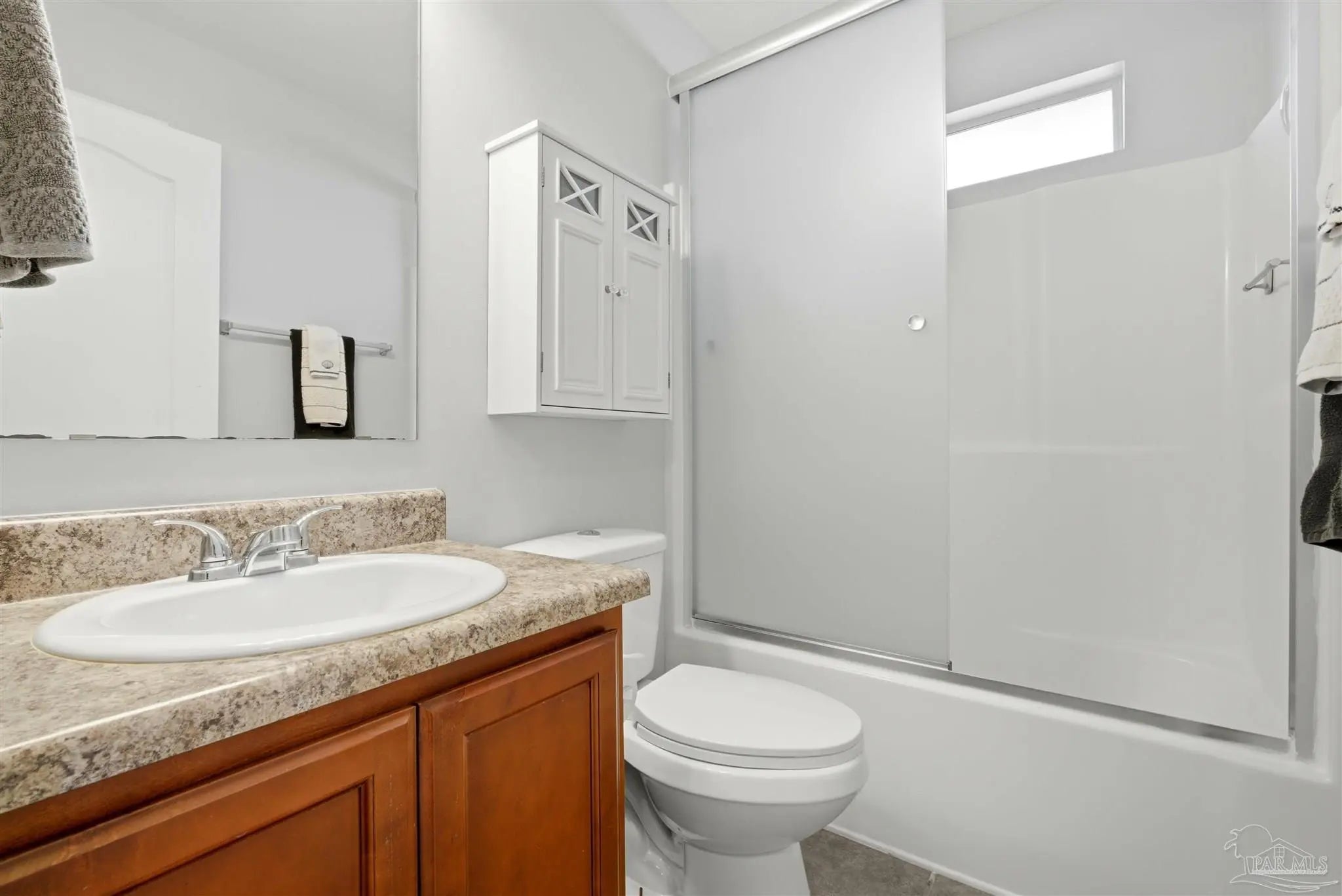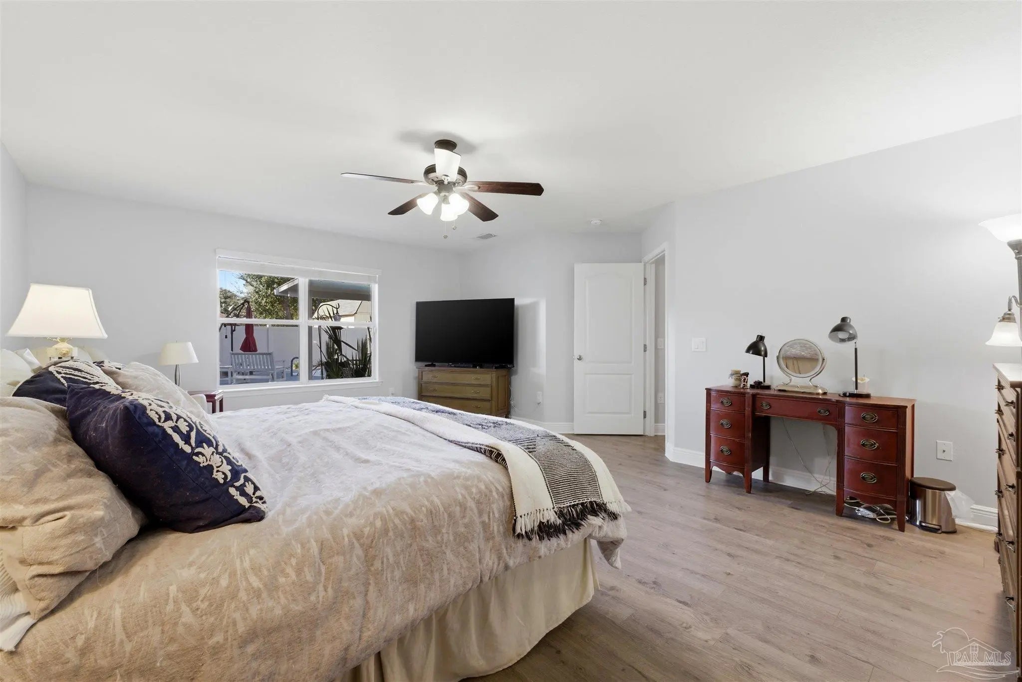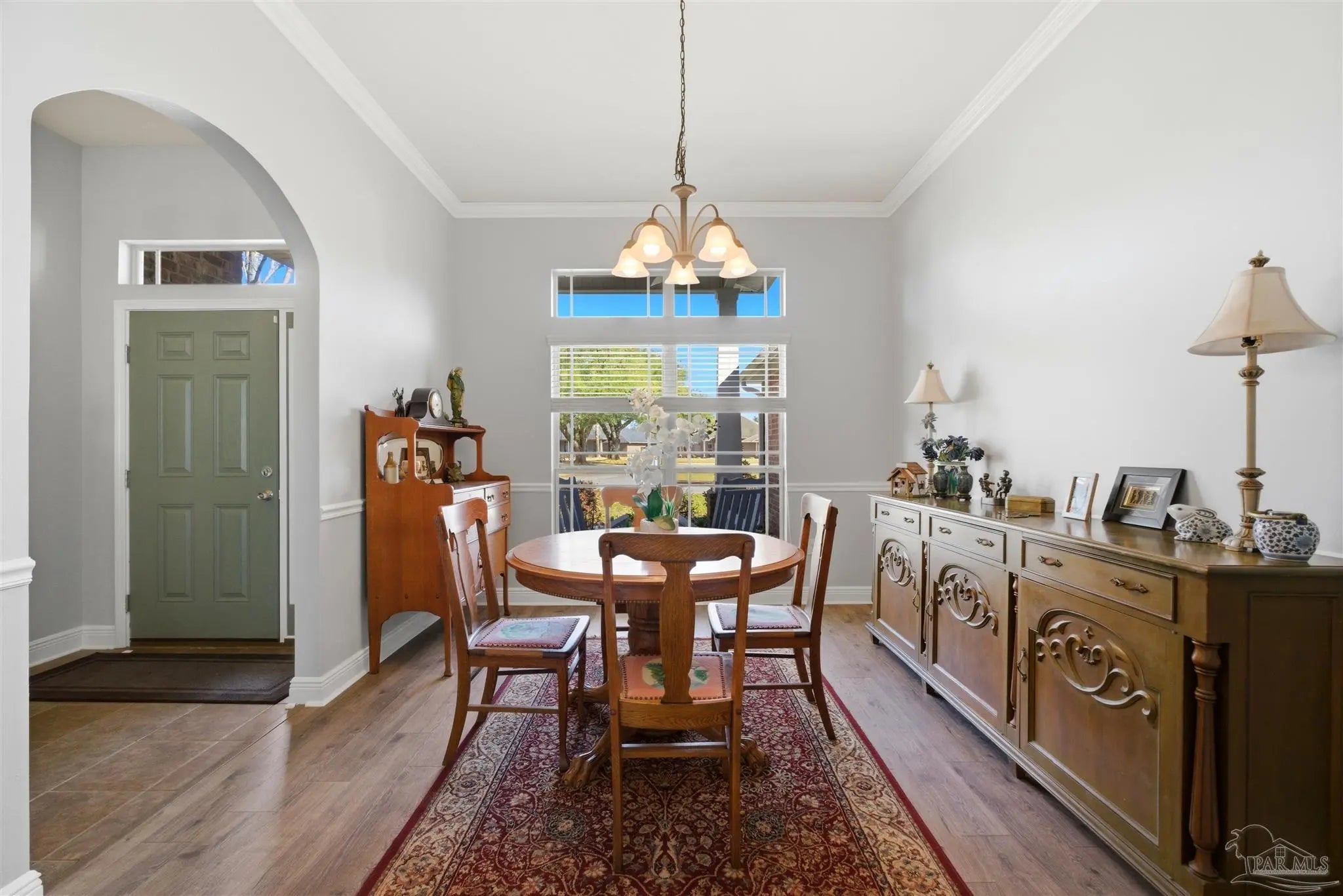SALTWATER POOL HOME IN PACE! 5 bedrooms, 3 FULL baths, and no carpet anywhere. This all-brick home offers 2,683 square feet and sits on a quiet cul-de-sac just off Chumuckla Highway in Pace Mill Creek, minutes from shopping, dining, Benny Russell Park, and the scenic 4-mile walking path around Spencer Field. Inside, you'll find soaring ceilings, arched openings, and a spacious open layout filled with natural light. The Great Room flows into the kitchen, featuring granite countertops, rich wood cabinetry, stainless steel appliances, including a Bosch 3rd-rack dishwasher, a center island, breakfast bar seating, and decorative pot rack lighting. Flooring includes Luxury Vinyl Plank (LVP) in the main living areas and bedrooms, and tile in the kitchen and baths—no carpet anywhere in the home. Just off the living area is a bright Florida room/sunroom with tile flooring and French doors leading to the backyard. The split-bedroom layout offers privacy, with an oversized primary suite featuring double vanities, a walk-in tub, a separate shower, and TWO oversized closets. Four additional bedrooms and two more full baths provide flexibility for family, guests, or a home office. The fifth bedroom is tucked into its own corner of the home with a full bath nearby, offering added flexibility for guests or multi-purpose use. Out back, you'll find a sparkling in-ground pool with a liner replaced about 3 years ago, a 25x12 covered porch, and a 10x12 open patio perfect for entertaining. Additional features include a sprinkler system on city water, a finished two-car garage with pull-down attic stairs, a storage shed, a Dolphin pool cleaner, whole house generator, aluminum hurricane shutters, an electric car charging station, a Lorex 14 camera (8 exterior, 6 interior) POE system with DVR, and a fully fenced backyard.