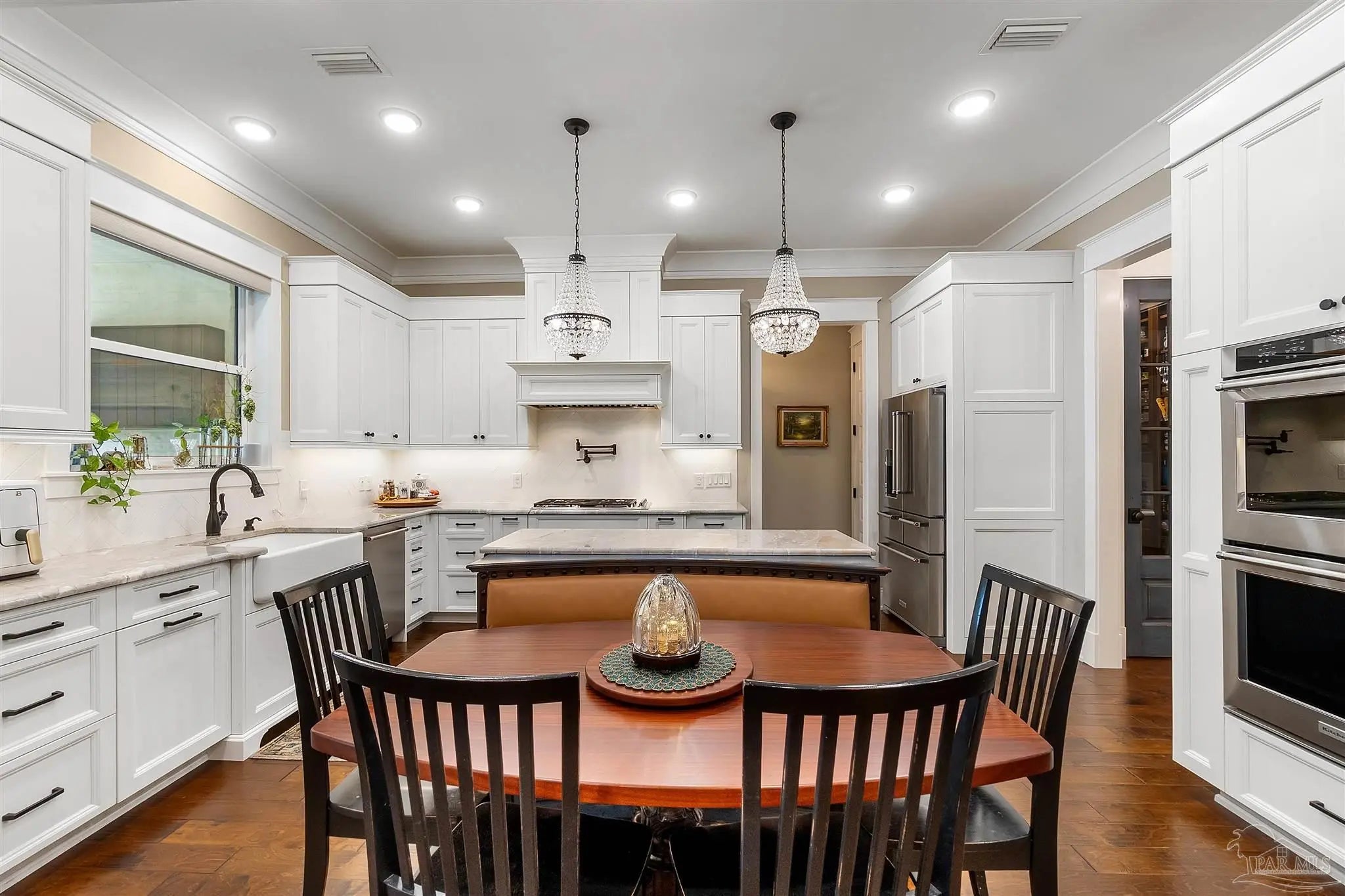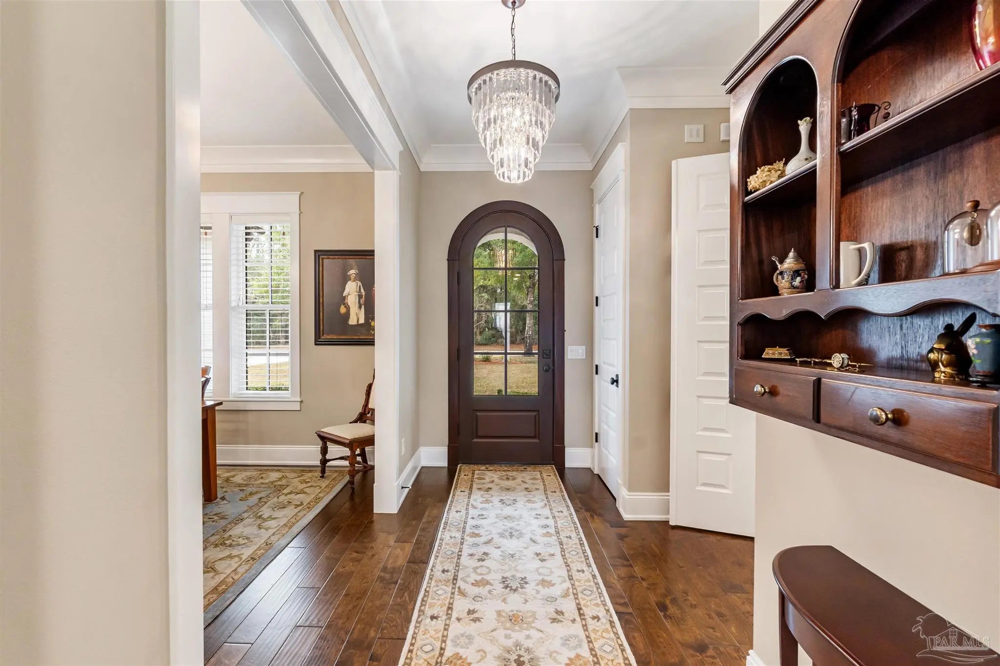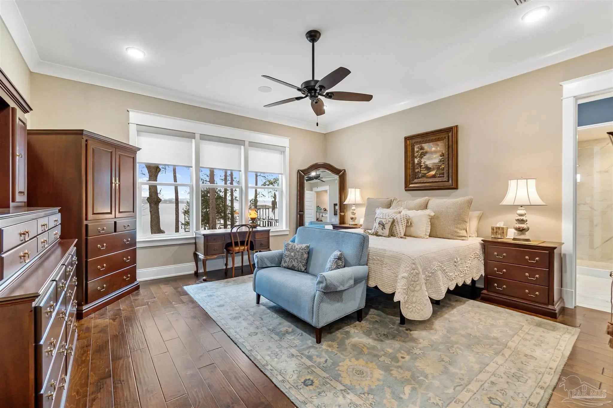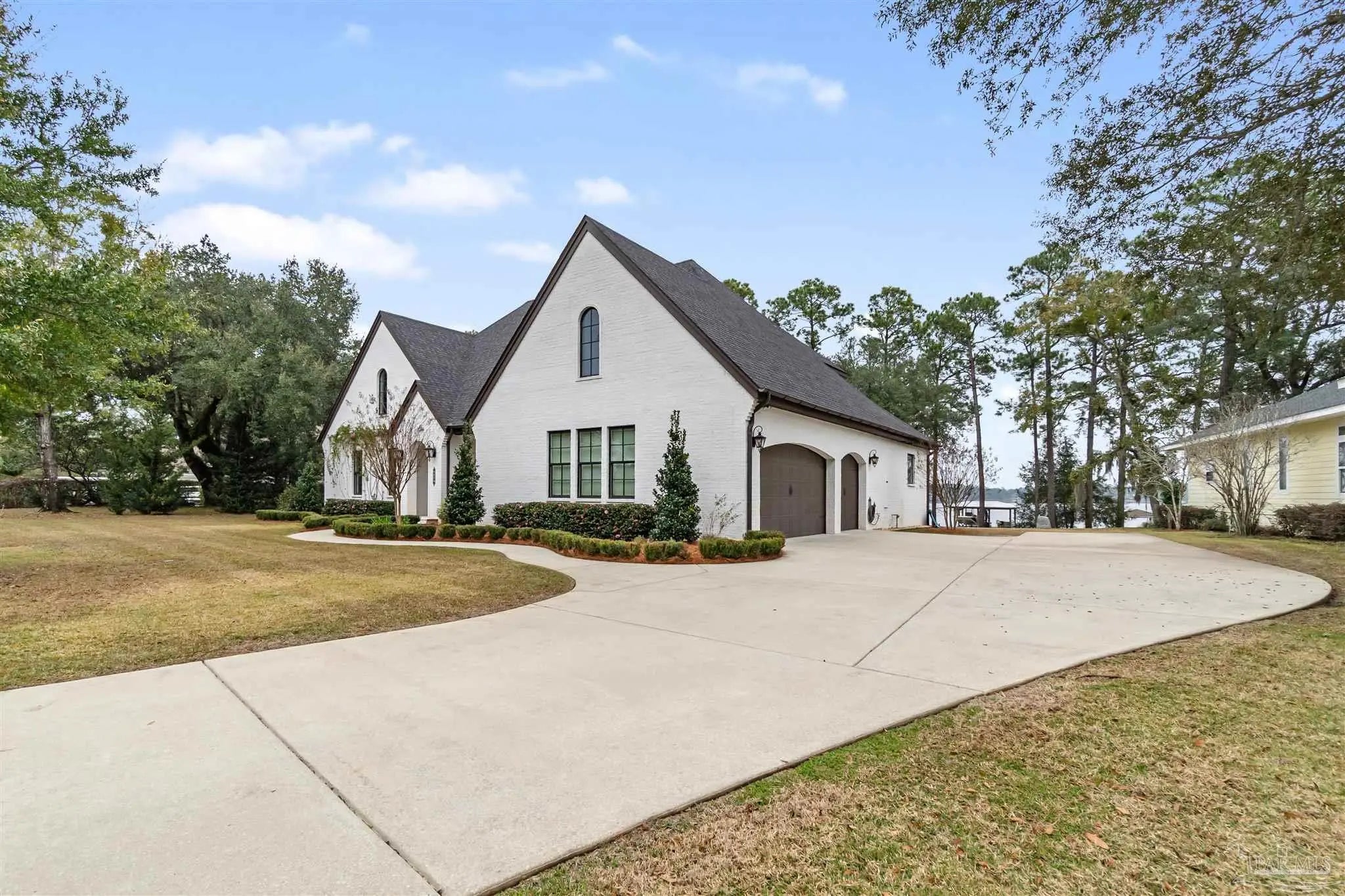 Waterfront brick home located on the largest lot in Bay Pointe Plantation offering panoramic views of Blackwater Bay in Milton. This 3,815 sq ft residence was completed in 2018 and is situated on an “X” lot. Features include low E impact glass throughout, custom cabinetry, custom closets, surround sound, exterior surveillance cameras, and generator readiness with transfer switch and gas stub-out. The open concept living area show-cases wood flooring bay front views, custom built-ins, and a brick gas fireplace. The kitchen offers quartzite countertops, double ovens, custom island with banquette seating, and a walk-in butler’s pantry with coffee nook, prep sink, and filtered water and ice maker. A formal dining room with custom built-ins is located off the foyer. The primary suite includes a spacious bedroom and bath with quartzite counters, double vanity, dressing vanity, soaking tub, separate shower, private water closet, and dual custom closet. Three additional bedrooms each feature en-suite baths, plus a hidden playroom closet. Upstairs includes an oversized game room with wet bar private office, large walk- around attic with electronic stair access, and a separate walk-in mechanical room. Over 900 sq ft of outdoor living includes a covered porch with honed granite countertops, outdoor kitchen, open deck, with enclosed outdoor shower. Additional features include a three-car garage with built-in shelving and large storage closet. The landscaped yard features a well and sprinkler system and leads to a covered boat dock built by Loftis Marine with smart lighting, covered boat storage and an extensive dock. Fish cleaning station includes oversized counter, sink, shower, and bar seating.