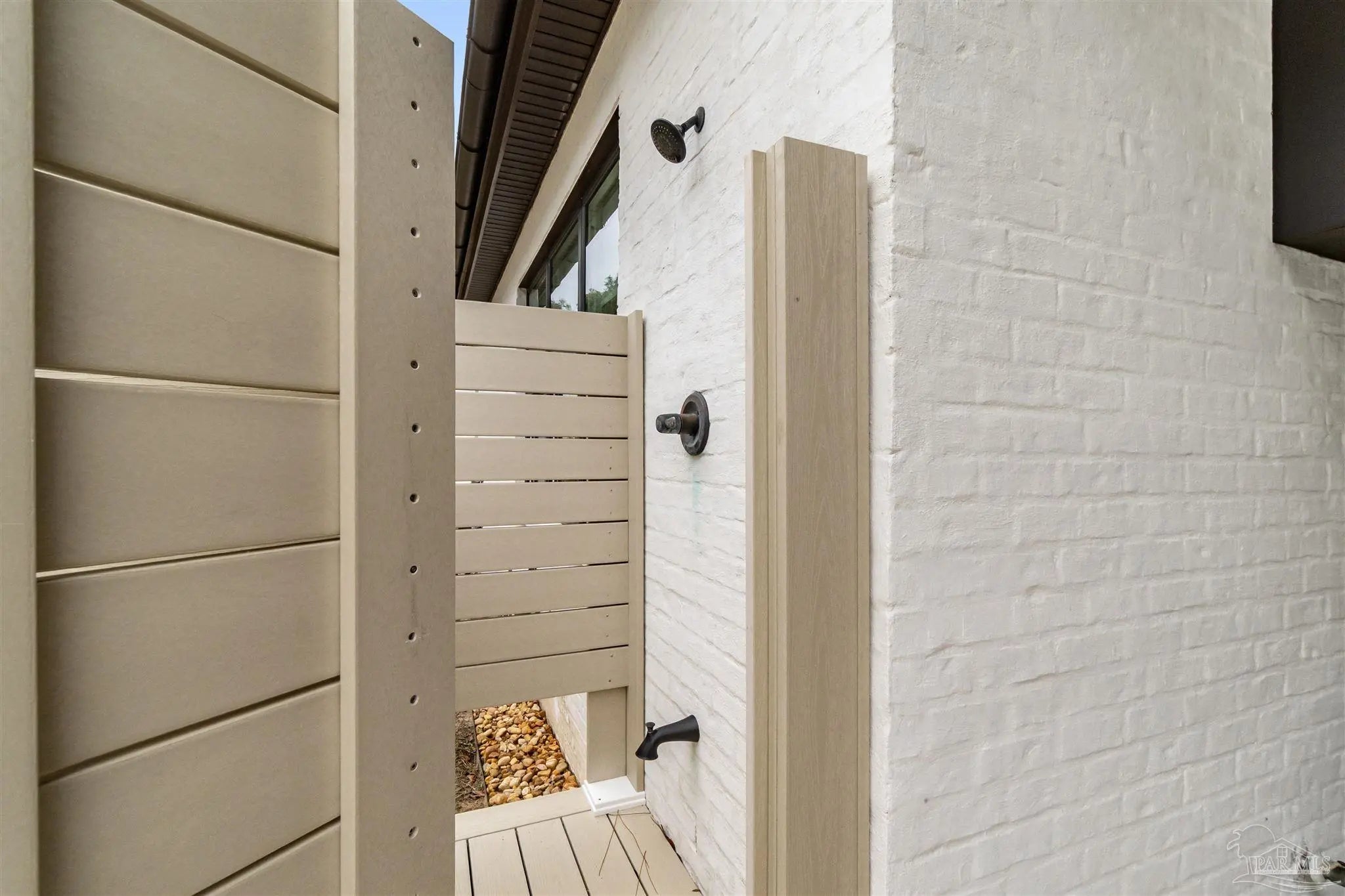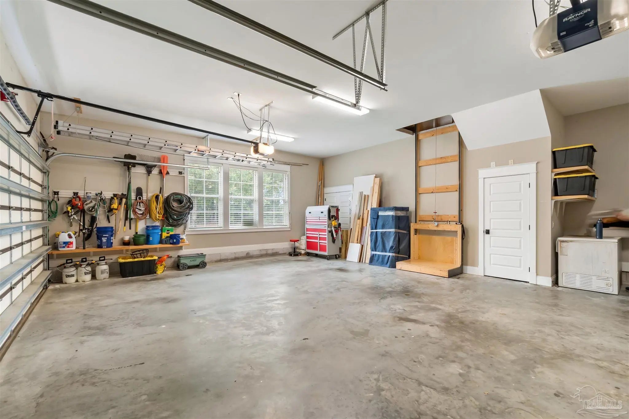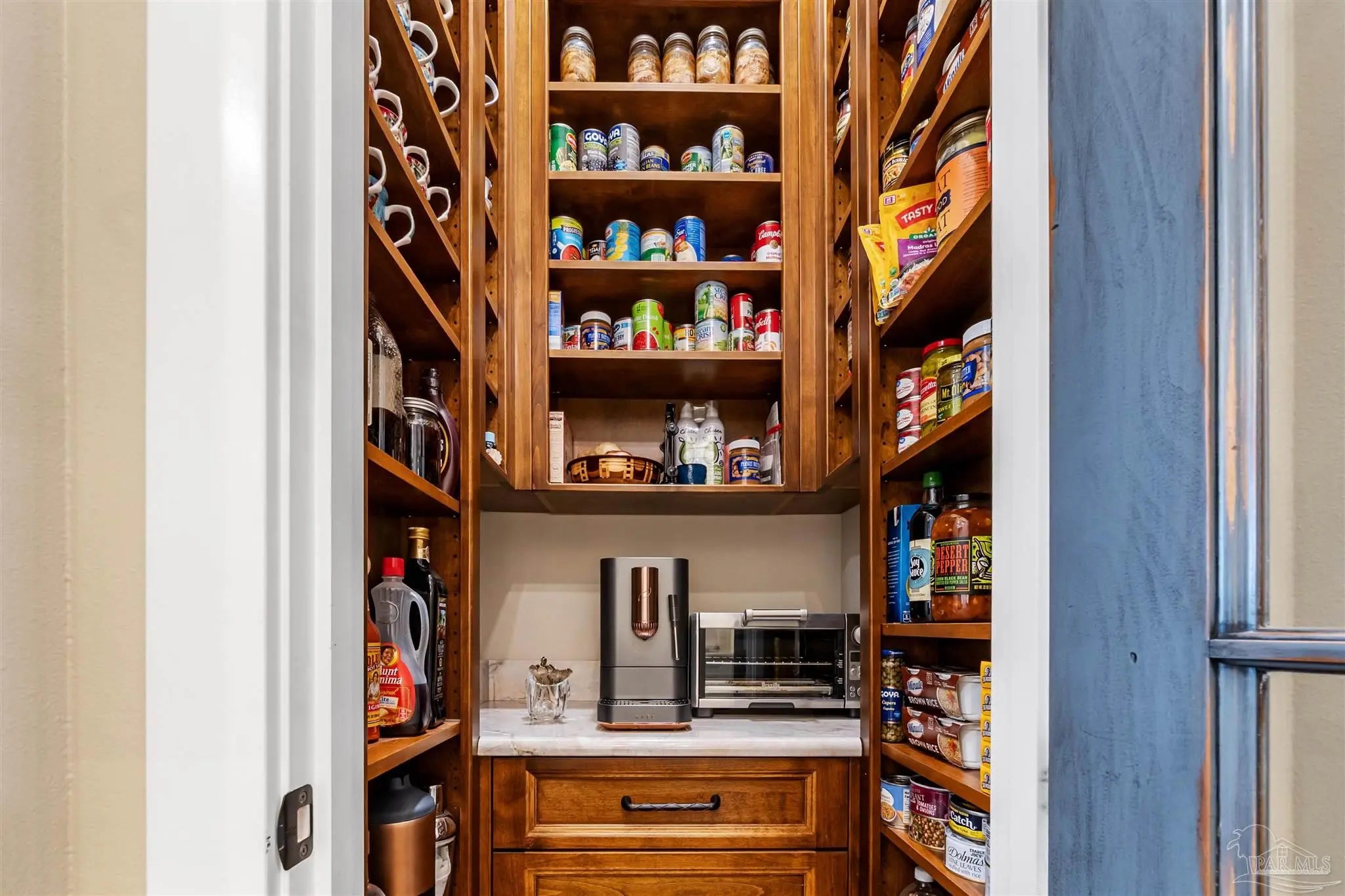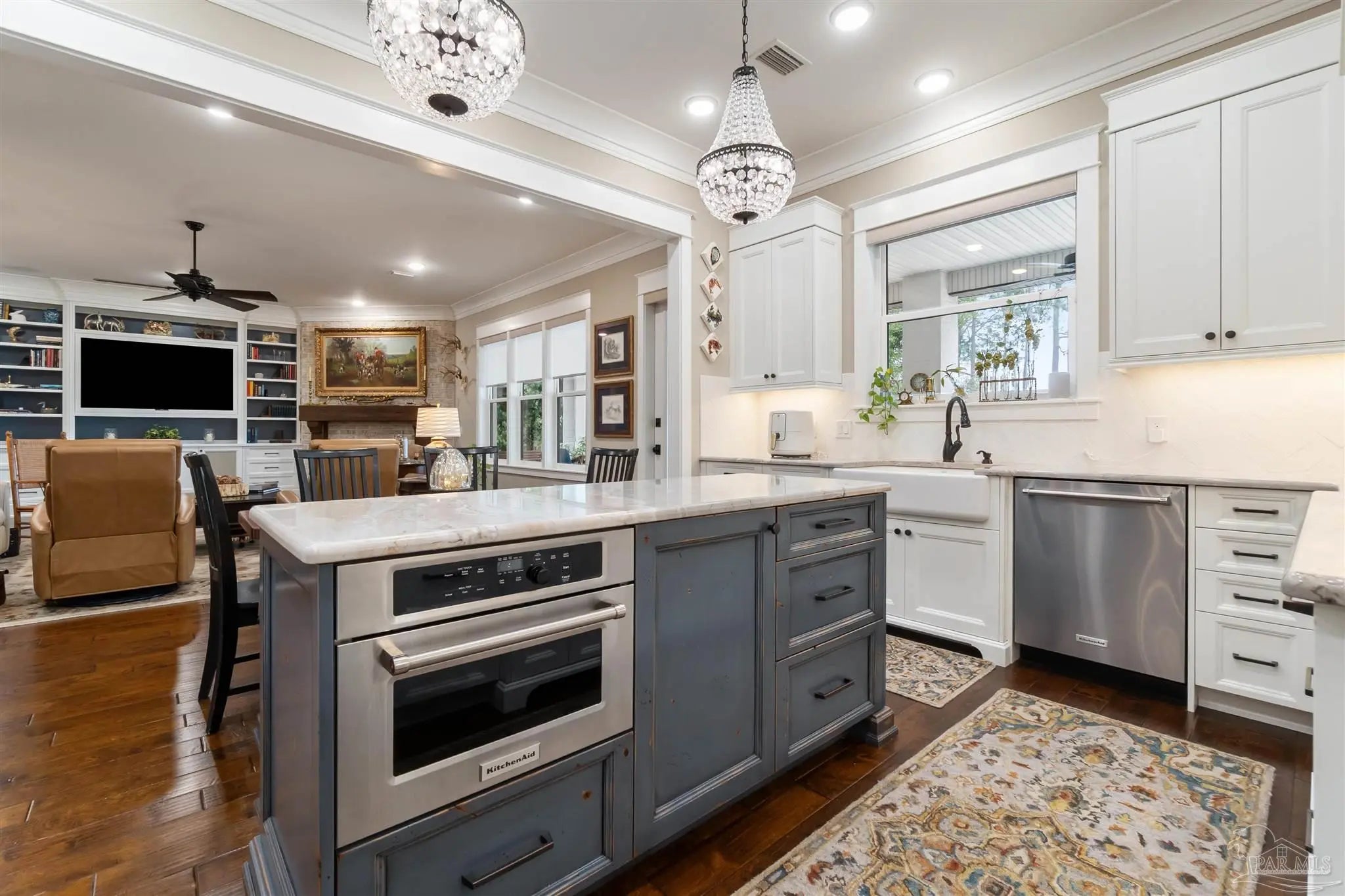 Waterfront brick home located on the largest lot in Bay Pointe Plantation offering panoramic views of Blackwater Bay in Milton. This 3,815 sq ft residence was completed in 2018 and is situated on an “X” lot. Features include low E impact glass throughout, custom cabinetry, custom closets, surround sound, exterior surveillance cameras, and generator readiness with transfer switch and gas stub-out. The open concept living area show-cases wood flooring bay front views, custom built-ins, and a brick gas fireplace. The kitchen offers quartzite countertops, double ovens, custom island with banquette seating, and a walk-in butler’s pantry with coffee nook, prep sink, and filtered water and ice maker. A formal dining room with custom built-ins is located off the foyer. The primary suite includes a spacious bedroom and bath with quartzite counters, double vanity, dressing vanity, soaking tub, separate shower, private water closet, and dual custom closet. Three additional bedrooms each feature en-suite baths, plus a hidden playroom closet. Upstairs includes an oversized game room with wet bar private office, large walk- around attic with electronic stair access, and a separate walk-in mechanical room. Over 900 sq ft of outdoor living includes a covered porch with honed granite countertops, outdoor kitchen, open deck, with enclosed outdoor shower. Additional features include a three-car garage with built-in shelving and large storage closet. The landscaped yard features a well and sprinkler system and leads to a covered boat dock built by Loftis Marine with smart lighting, covered boat storage and an extensive dock. Fish cleaning station includes oversized counter, sink, shower, and bar seating.