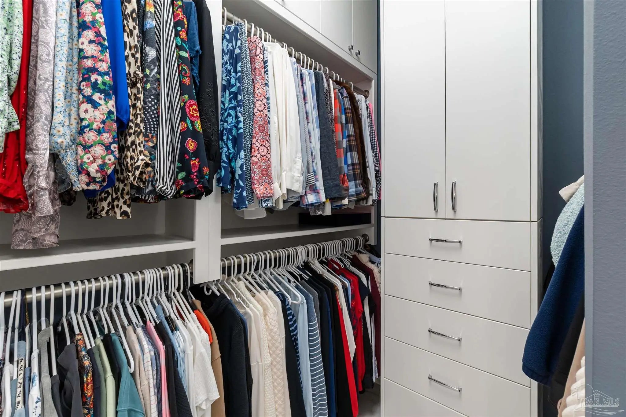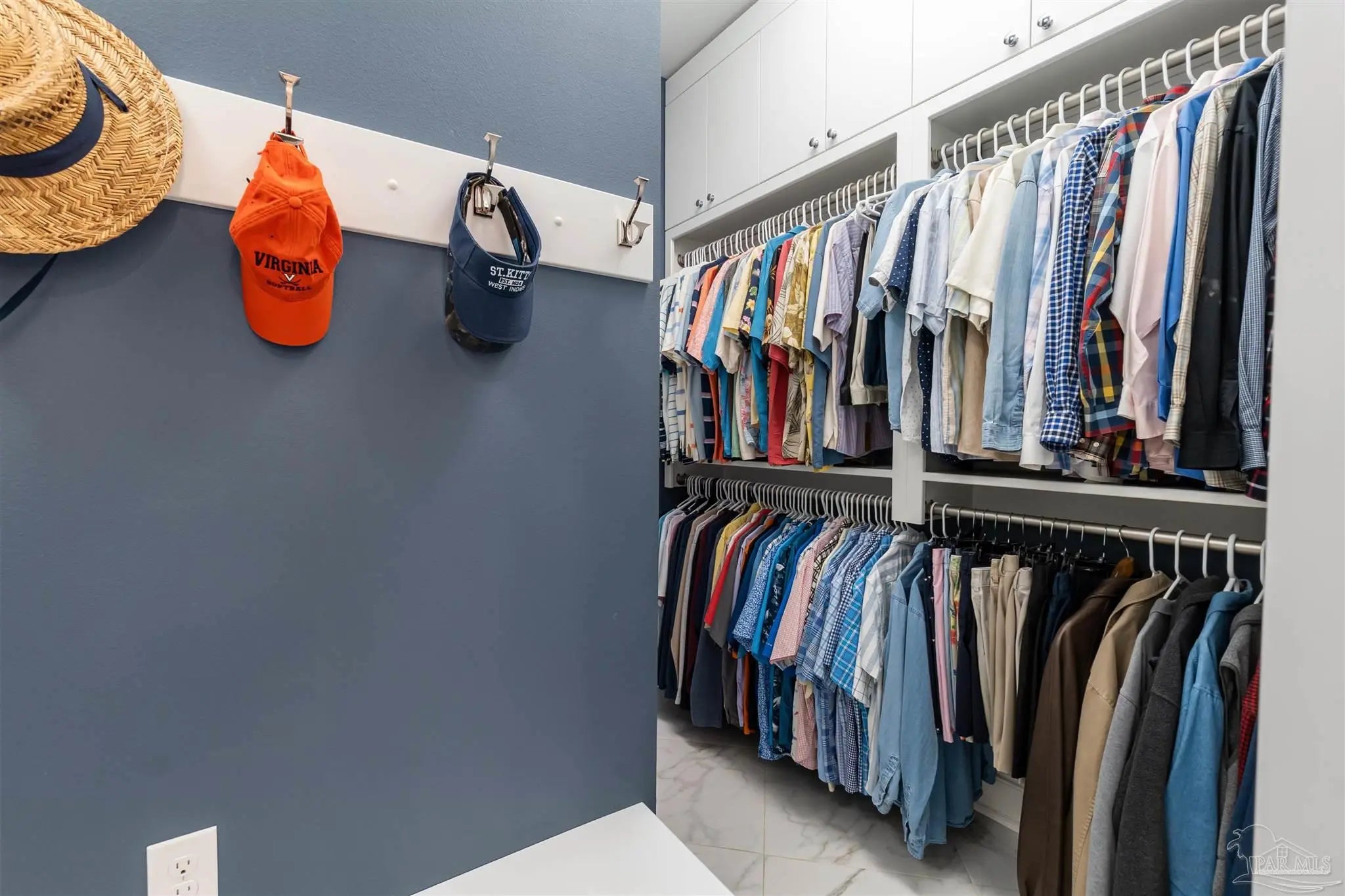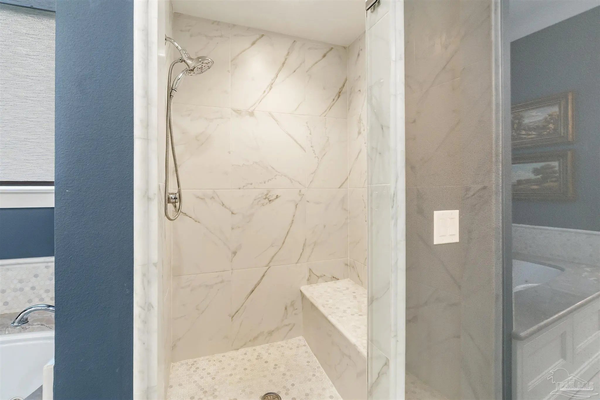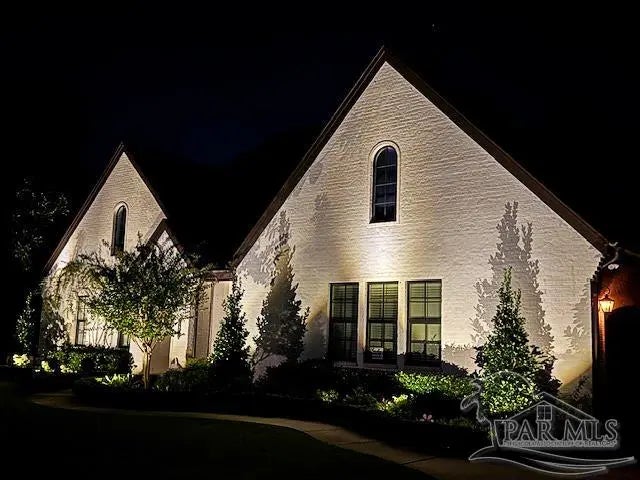Waterfront brick home located on the largest lot in Bay Pointe Plantation offering panoramic views of Blackwater Bay in Milton. This 3,815 sq ft residence was completed in 2018 and is situated on an “X” lot. Features include low E impact glass throughout, custom cabinetry, custom closets, surround sound, exterior surveillance cameras, and generator readiness with transfer switch and gas stub-out. The open concept living area show-cases wood flooring bay front views, custom built-ins, and a brick gas fireplace. The kitchen offers quartzite countertops, double ovens, custom island with banquette seating, and a walk-in butler’s pantry with coffee nook, prep sink, and filtered water and ice maker. A formal dining room with custom built-ins is located off the foyer. The primary suite includes a spacious bedroom and bath with quartzite counters, double vanity, dressing vanity, soaking tub, separate shower, private water closet, and dual custom closet. Three additional bedrooms each feature en-suite baths, plus a hidden playroom closet. Upstairs includes an oversized game room with wet bar private office, large walk- around attic with electronic stair access, and a separate walk-in mechanical room. Over 900 sq ft of outdoor living includes a covered porch with honed granite countertops, outdoor kitchen, open deck, with enclosed outdoor shower. Additional features include a three-car garage with built-in shelving and large storage closet. The landscaped yard features a well and sprinkler system and leads to a covered boat dock built by Loftis Marine with smart lighting, covered boat storage and an extensive dock. Fish cleaning station includes oversized counter, sink, shower, and bar seating.