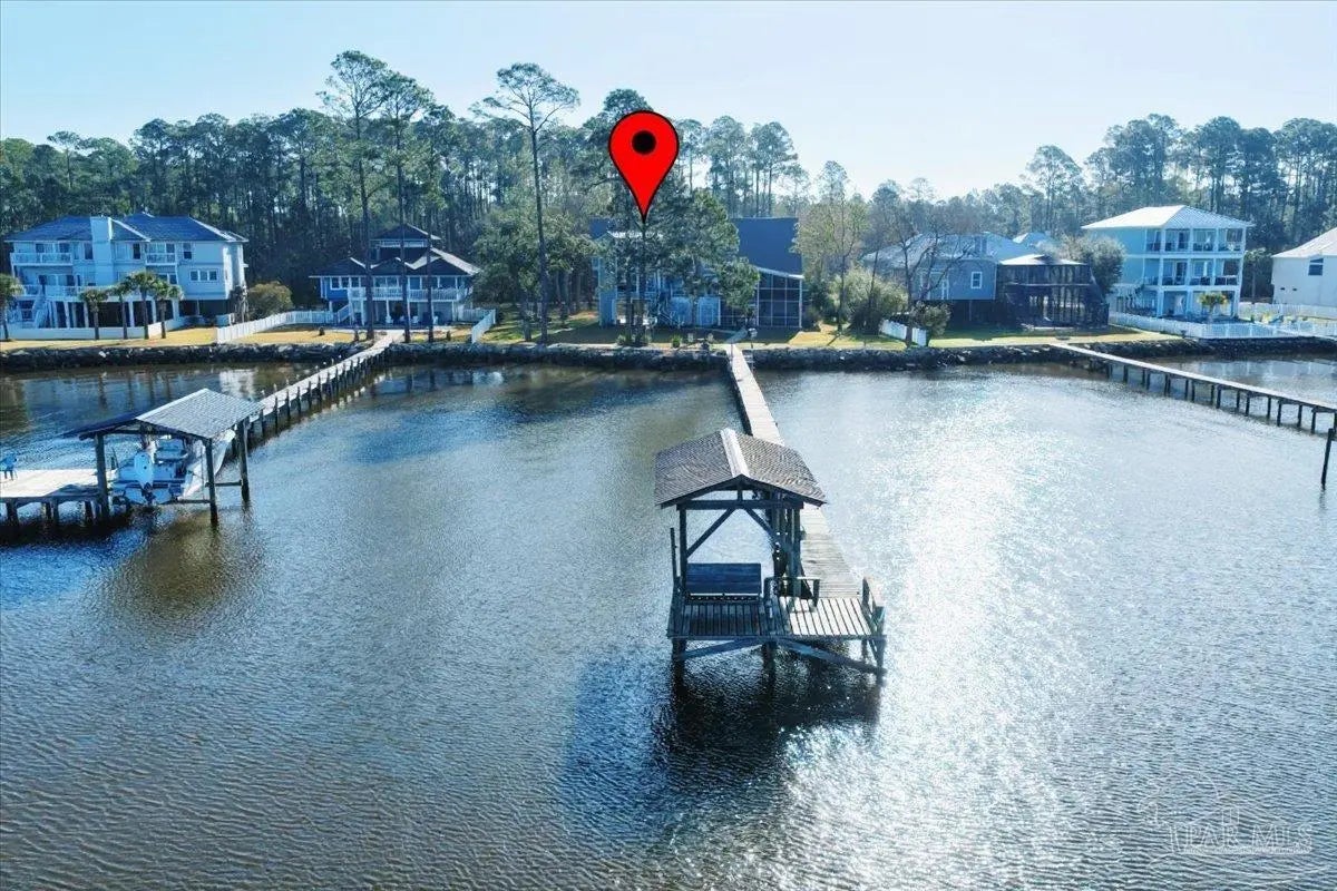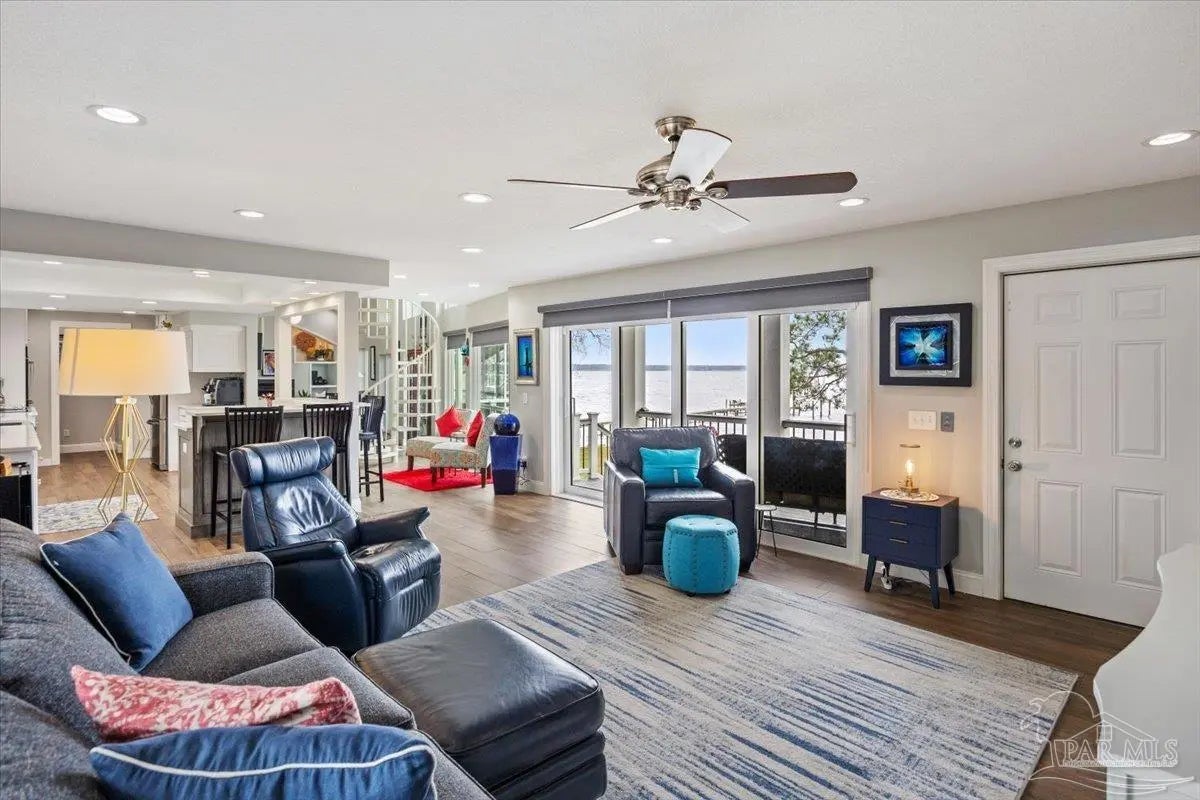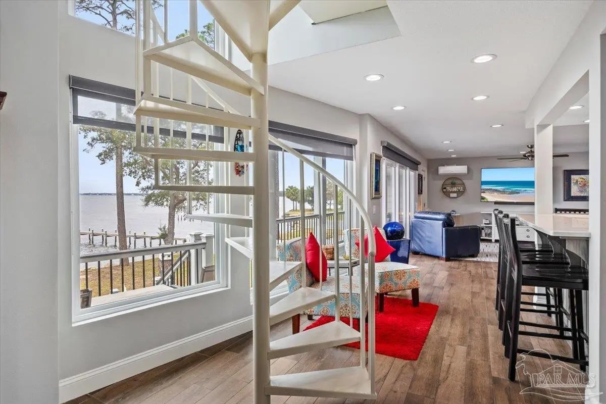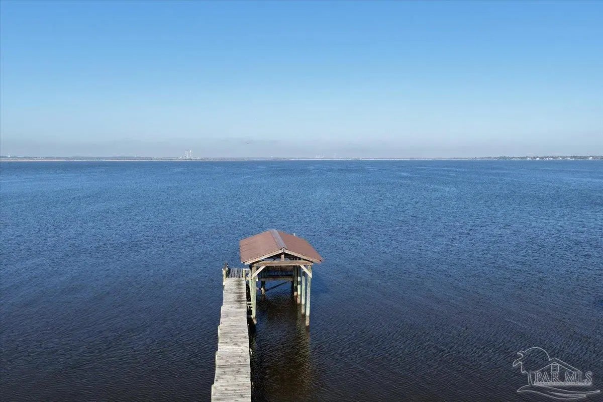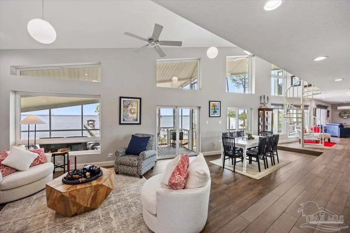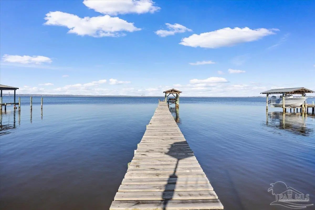 Experience breathtaking waterfront living on Escambia Bay at 4528 Bayside Drive in Milton. This fully renovated custom home offers 103 feet of bay frontage and was designed to capture the water from nearly every angle with dramatic vaulted ceilings and a stunning wall of windows filling the home with natural light and uninterrupted views of dolphins, sunsets, and the ever-changing beauty of the bay. The exterior features new Hardie board siding, reinforced framing and windows, hurricane shutters, and a metal roof. A winding pebble-style driveway leads to the elevated home where you’ll find two-car garage parking, additional parking area, and a large covered area beneath the home perfect for storage or entertaining. Outdoor living is exceptional with screened porches overlooking the water, expansive porches spanning the length of the home, and balconies from the living room and primary suite. A long private dock extends into Escambia Bay and includes a covered boathouse with seating area and direct access toward Pensacola Beach and the Gulf. Inside, wood-look tile plank flooring flows throughout the main living areas complemented by recessed lighting and oversized sliding doors framing the bay views. The open living space features soaring ceilings, a fireplace with custom built-ins, a sunken dining area, and both spiral and traditional staircases leading to the upper level. The updated kitchen includes two-tone soft close custom built cabinetry, quartz countertops, custom tile backsplash, bar seating, stainless Frigidaire Gallery appliances, double ovens, and a glass cooktop. The spacious primary suite offers balcony access, high ceilings, plantation shutters, elevator access, and a luxurious bath with double vanity, freestanding soaking tub, tiled walk-in shower with rain head, and walk-through closet with laundry. A rare opportunity to own a beautifully updated waterfront home designed for both everyday living and unforgettable bayfront views.