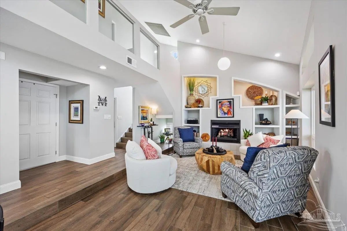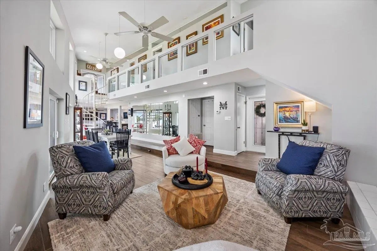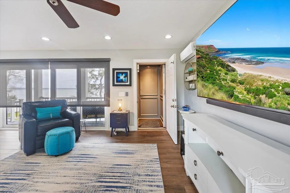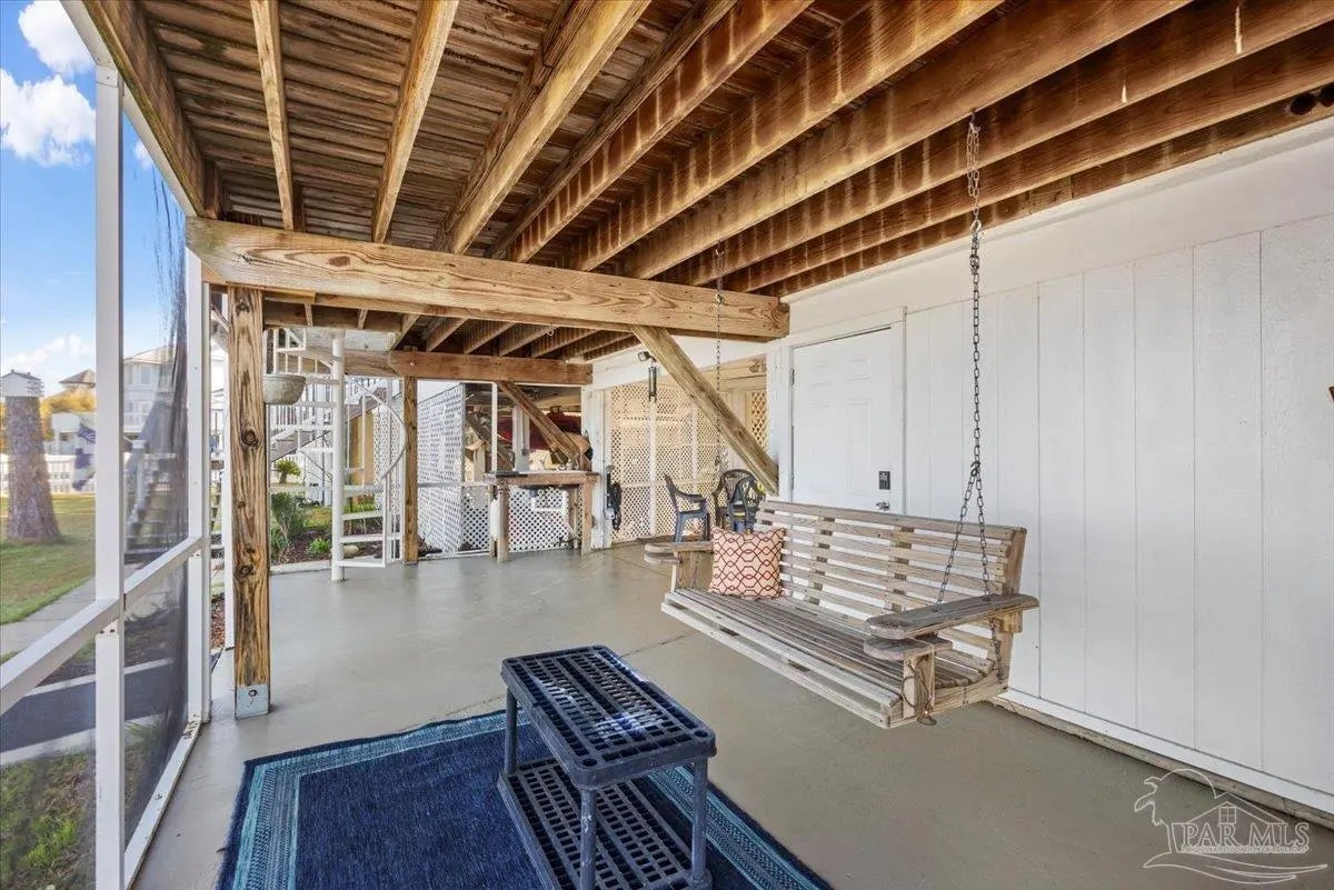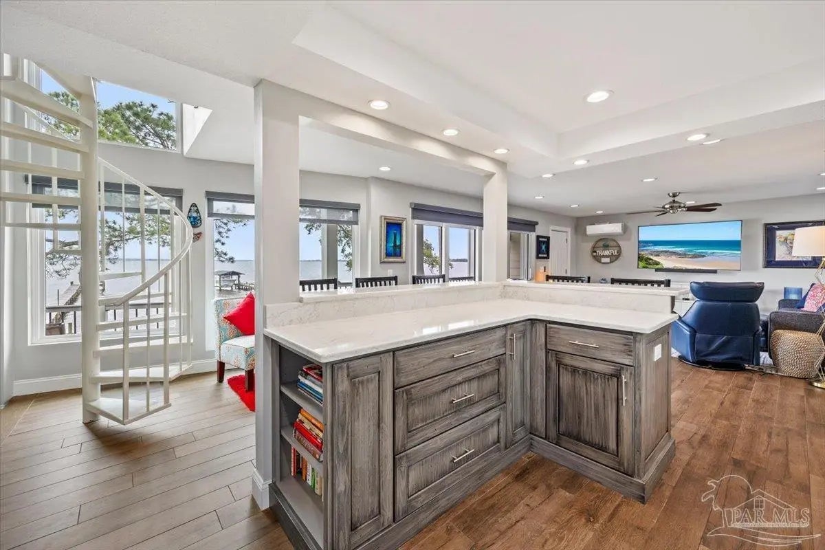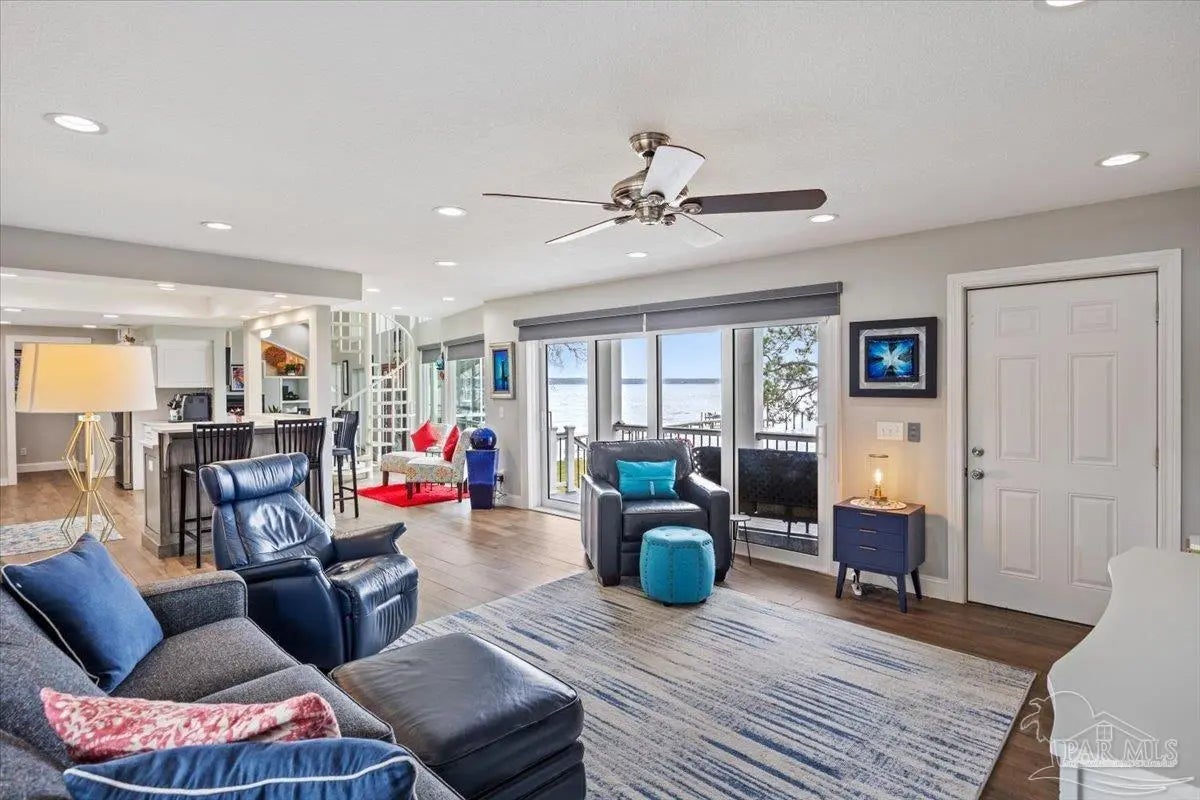 Experience breathtaking waterfront living on Escambia Bay at 4528 Bayside Drive in Milton. This fully renovated custom home offers 103 feet of bay frontage and was designed to capture the water from nearly every angle with dramatic vaulted ceilings and a stunning wall of windows filling the home with natural light and uninterrupted views of dolphins, sunsets, and the ever-changing beauty of the bay. The exterior features new Hardie board siding, reinforced framing and windows, hurricane shutters, and a metal roof. A winding pebble-style driveway leads to the elevated home where you’ll find two-car garage parking, additional parking area, and a large covered area beneath the home perfect for storage or entertaining. Outdoor living is exceptional with screened porches overlooking the water, expansive porches spanning the length of the home, and balconies from the living room and primary suite. A long private dock extends into Escambia Bay and includes a covered boathouse with seating area and direct access toward Pensacola Beach and the Gulf. Inside, wood-look tile plank flooring flows throughout the main living areas complemented by recessed lighting and oversized sliding doors framing the bay views. The open living space features soaring ceilings, a fireplace with custom built-ins, a sunken dining area, and both spiral and traditional staircases leading to the upper level. The updated kitchen includes two-tone soft close custom built cabinetry, quartz countertops, custom tile backsplash, bar seating, stainless Frigidaire Gallery appliances, double ovens, and a glass cooktop. The spacious primary suite offers balcony access, high ceilings, plantation shutters, elevator access, and a luxurious bath with double vanity, freestanding soaking tub, tiled walk-in shower with rain head, and walk-through closet with laundry. A rare opportunity to own a beautifully updated waterfront home designed for both everyday living and unforgettable bayfront views.