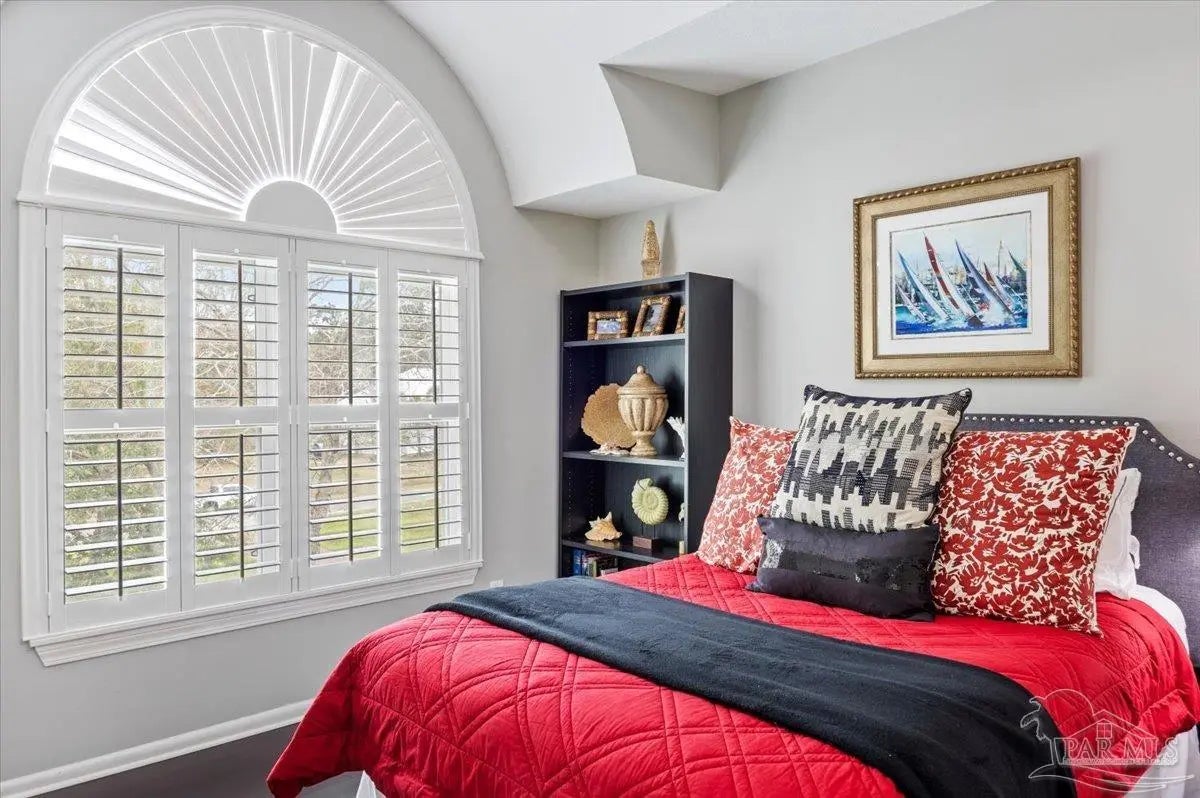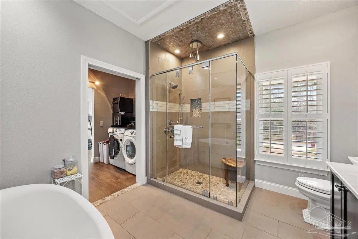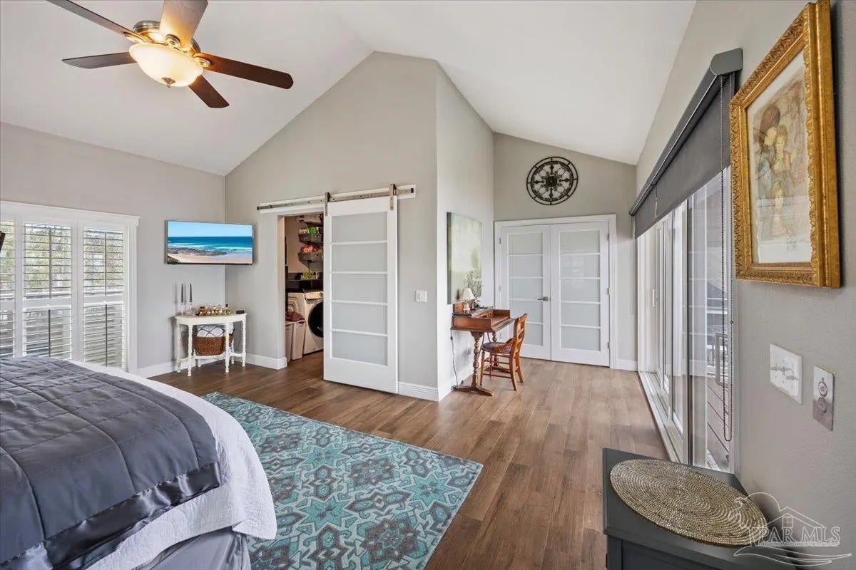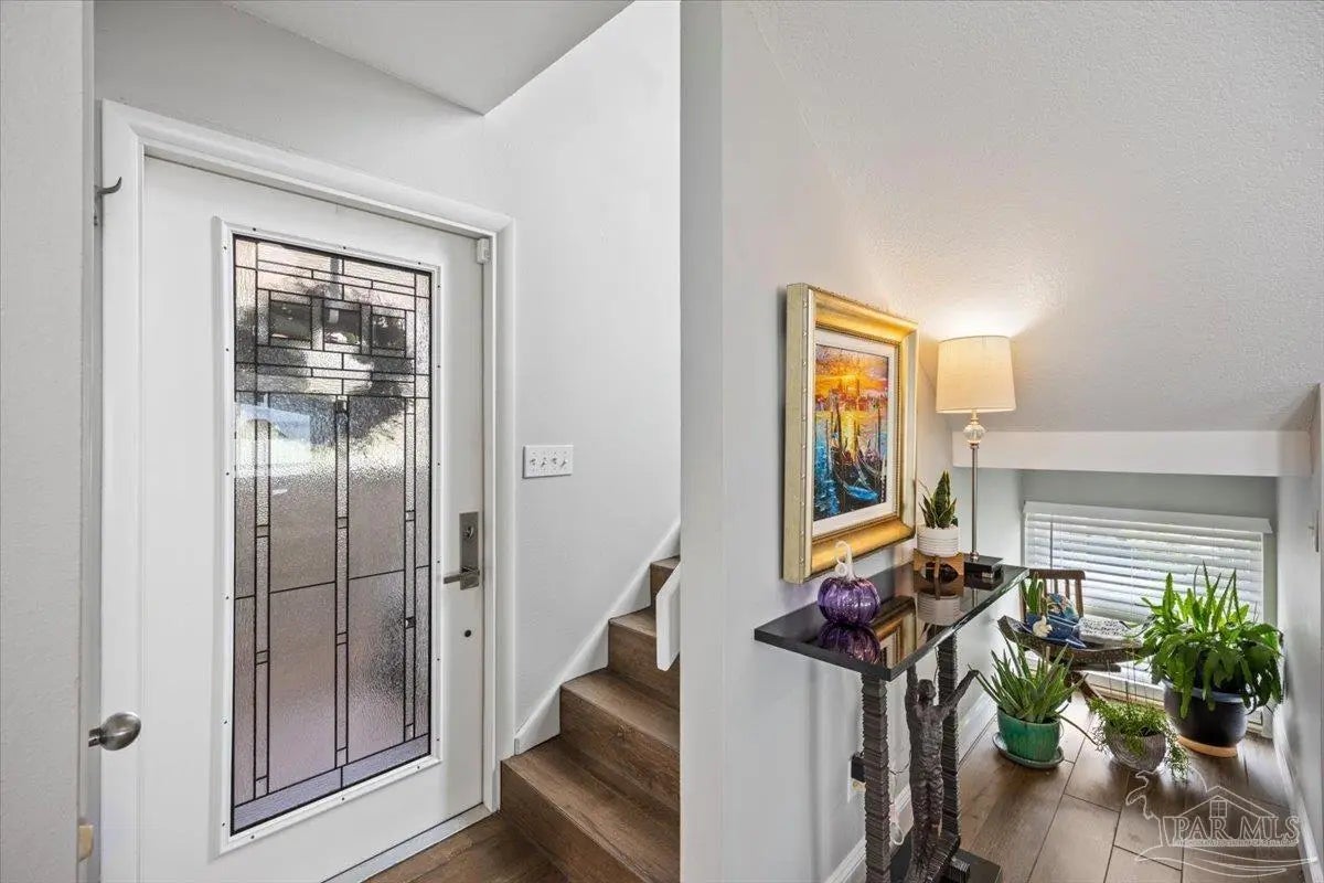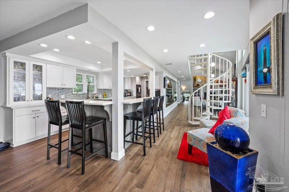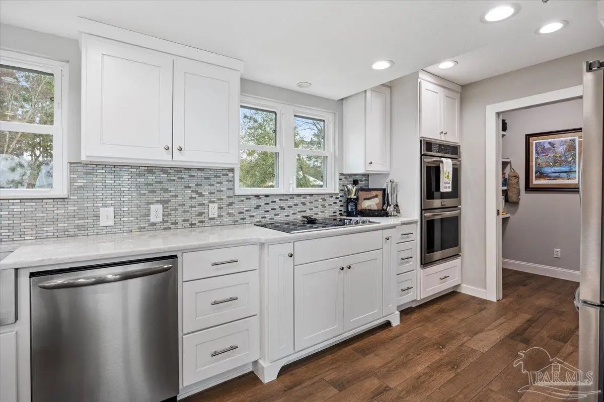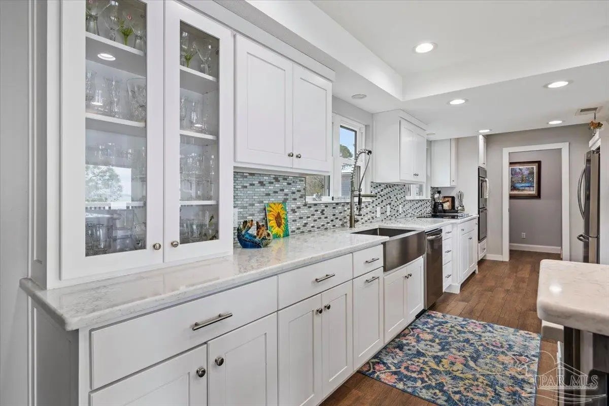 Experience breathtaking waterfront living on Escambia Bay at 4528 Bayside Drive in Milton. This fully renovated custom home offers 103 feet of bay frontage and was designed to capture the water from nearly every angle with dramatic vaulted ceilings and a stunning wall of windows filling the home with natural light and uninterrupted views of dolphins, sunsets, and the ever-changing beauty of the bay. The exterior features new Hardie board siding, reinforced framing and windows, hurricane shutters, and a metal roof. A winding pebble-style driveway leads to the elevated home where you’ll find two-car garage parking, additional parking area, and a large covered area beneath the home perfect for storage or entertaining. Outdoor living is exceptional with screened porches overlooking the water, expansive porches spanning the length of the home, and balconies from the living room and primary suite. A long private dock extends into Escambia Bay and includes a covered boathouse with seating area and direct access toward Pensacola Beach and the Gulf. Inside, wood-look tile plank flooring flows throughout the main living areas complemented by recessed lighting and oversized sliding doors framing the bay views. The open living space features soaring ceilings, a fireplace with custom built-ins, a sunken dining area, and both spiral and traditional staircases leading to the upper level. The updated kitchen includes two-tone soft close custom built cabinetry, quartz countertops, custom tile backsplash, bar seating, stainless Frigidaire Gallery appliances, double ovens, and a glass cooktop. The spacious primary suite offers balcony access, high ceilings, plantation shutters, elevator access, and a luxurious bath with double vanity, freestanding soaking tub, tiled walk-in shower with rain head, and walk-through closet with laundry. A rare opportunity to own a beautifully updated waterfront home designed for both everyday living and unforgettable bayfront views.