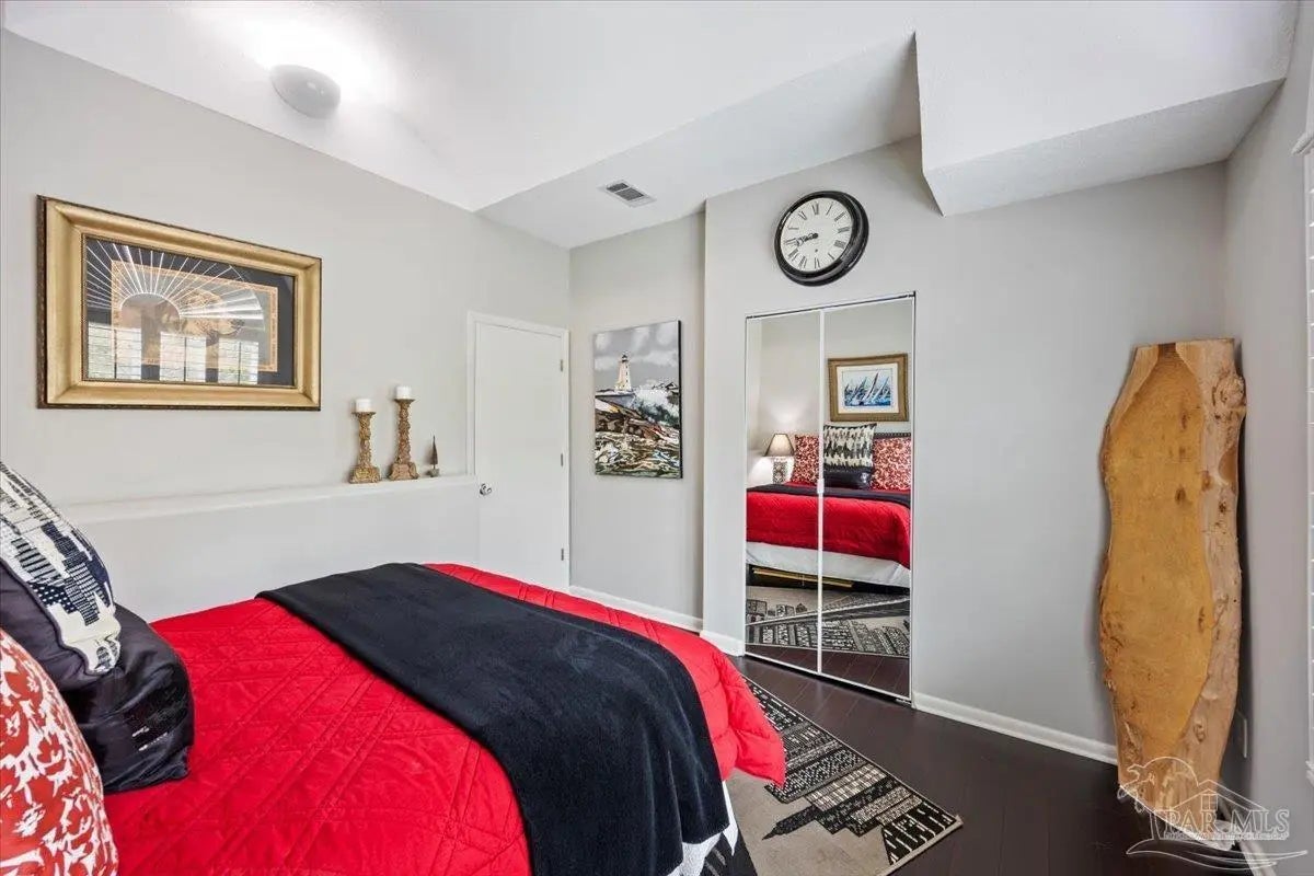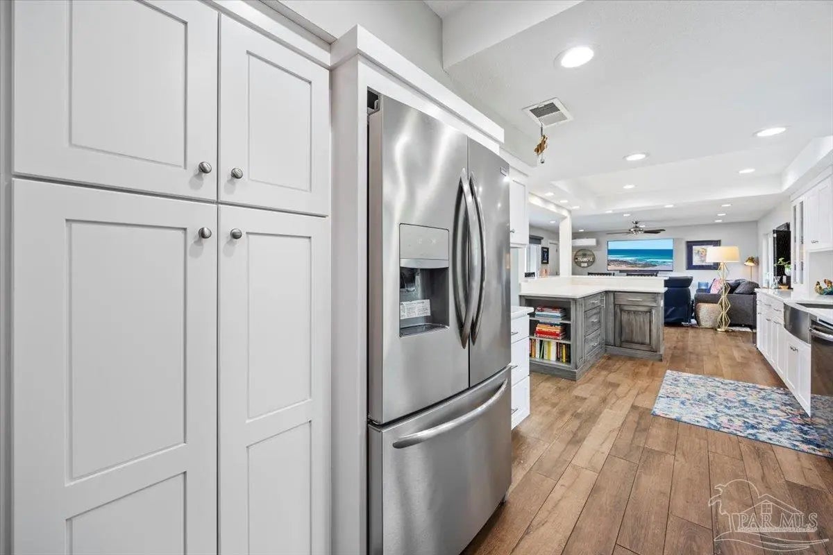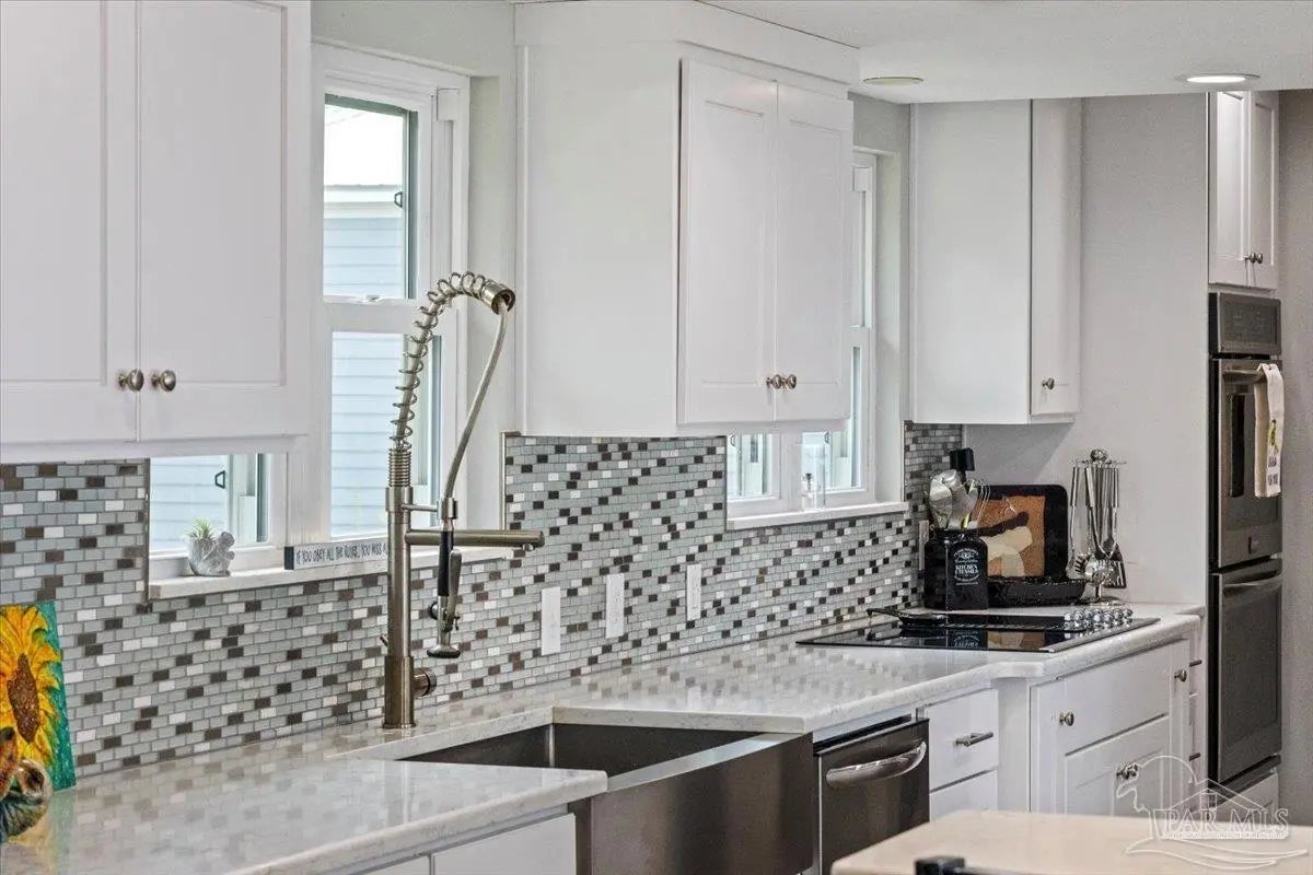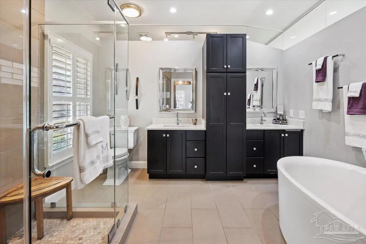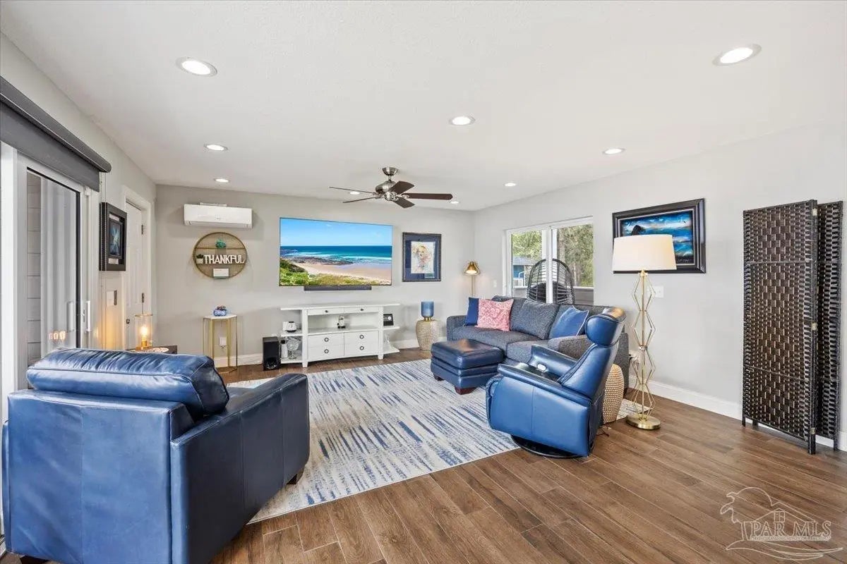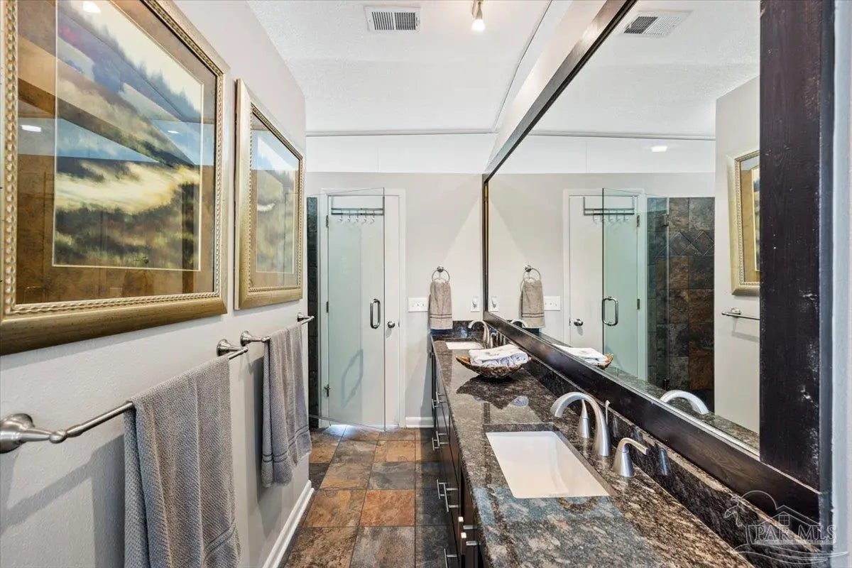 Experience breathtaking waterfront living on Escambia Bay at 4528 Bayside Drive in Milton. This fully renovated custom home offers 103 feet of bay frontage and was designed to capture the water from nearly every angle with dramatic vaulted ceilings and a stunning wall of windows filling the home with natural light and uninterrupted views of dolphins, sunsets, and the ever-changing beauty of the bay. The exterior features new Hardie board siding, reinforced framing and windows, hurricane shutters, and a metal roof. A winding pebble-style driveway leads to the elevated home where you’ll find two-car garage parking, additional parking area, and a large covered area beneath the home perfect for storage or entertaining. Outdoor living is exceptional with screened porches overlooking the water, expansive porches spanning the length of the home, and balconies from the living room and primary suite. A long private dock extends into Escambia Bay and includes a covered boathouse with seating area and direct access toward Pensacola Beach and the Gulf. Inside, wood-look tile plank flooring flows throughout the main living areas complemented by recessed lighting and oversized sliding doors framing the bay views. The open living space features soaring ceilings, a fireplace with custom built-ins, a sunken dining area, and both spiral and traditional staircases leading to the upper level. The updated kitchen includes two-tone soft close custom built cabinetry, quartz countertops, custom tile backsplash, bar seating, stainless Frigidaire Gallery appliances, double ovens, and a glass cooktop. The spacious primary suite offers balcony access, high ceilings, plantation shutters, elevator access, and a luxurious bath with double vanity, freestanding soaking tub, tiled walk-in shower with rain head, and walk-through closet with laundry. A rare opportunity to own a beautifully updated waterfront home designed for both everyday living and unforgettable bayfront views.