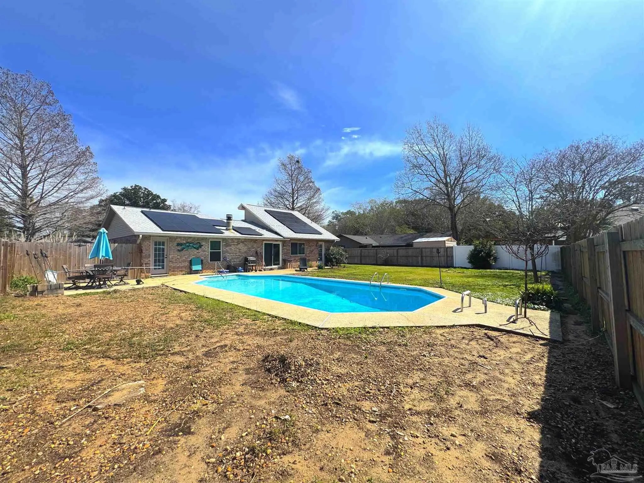 Pulling up to the home, you are greeted by a well-maintained property with charming curb appeal, low-maintenance landscaping, and a long driveway that provides ample parking for guests. Located in the desirable Baycliff Estates neighborhood off Scenic Highway, the home offers a convenient location just minutes from downtown Pensacola, Beach, Mall, and Airport. Major exterior updates include a new roof and paid-off solar panels installed in 2022, hurricane-rated windows replaced in 2023, and storm shutters for every window. Inside, the home opens to a spacious living area centered around a wood-burning fireplace, creating a warm and inviting space to relax or gather with family and friends. Abundant natural light pours in through a dramatic 17-foot dormer, highlighting the clean, updated interior. The living space features tile and new luxury vinyl plank flooring throughout, along with freshly textured and painted walls and updated lighting. To the left of the living area is a deep galley kitchen with ample counter space and cabinetry, along with shiplap accents and additional storage from a peninsula of cabinets in the living area. Just off the kitchen is a large laundry room connecting to the oversized two-car garage and featuring a one-year-old 50-gallon energy-efficient water heater installed in 2025. The right side of the home features the private primary suite with its own en-suite bathroom, walk-in closet, and direct access to the backyard. Two additional bedrooms and a newly remodeled guest bathroom with dual-sink vanity and soaking tub offer a functional layout for family, guests, or a home office. Out back, the property opens to a massive fully fenced backyard with a 22,000-gallon in-ground saltwater pool and new chlorinator system—perfect for entertaining and enjoying Florida living. With major updates completed, including new HVAC and ductwork in 2025, this home is move-in ready. Schedule your private showing today.