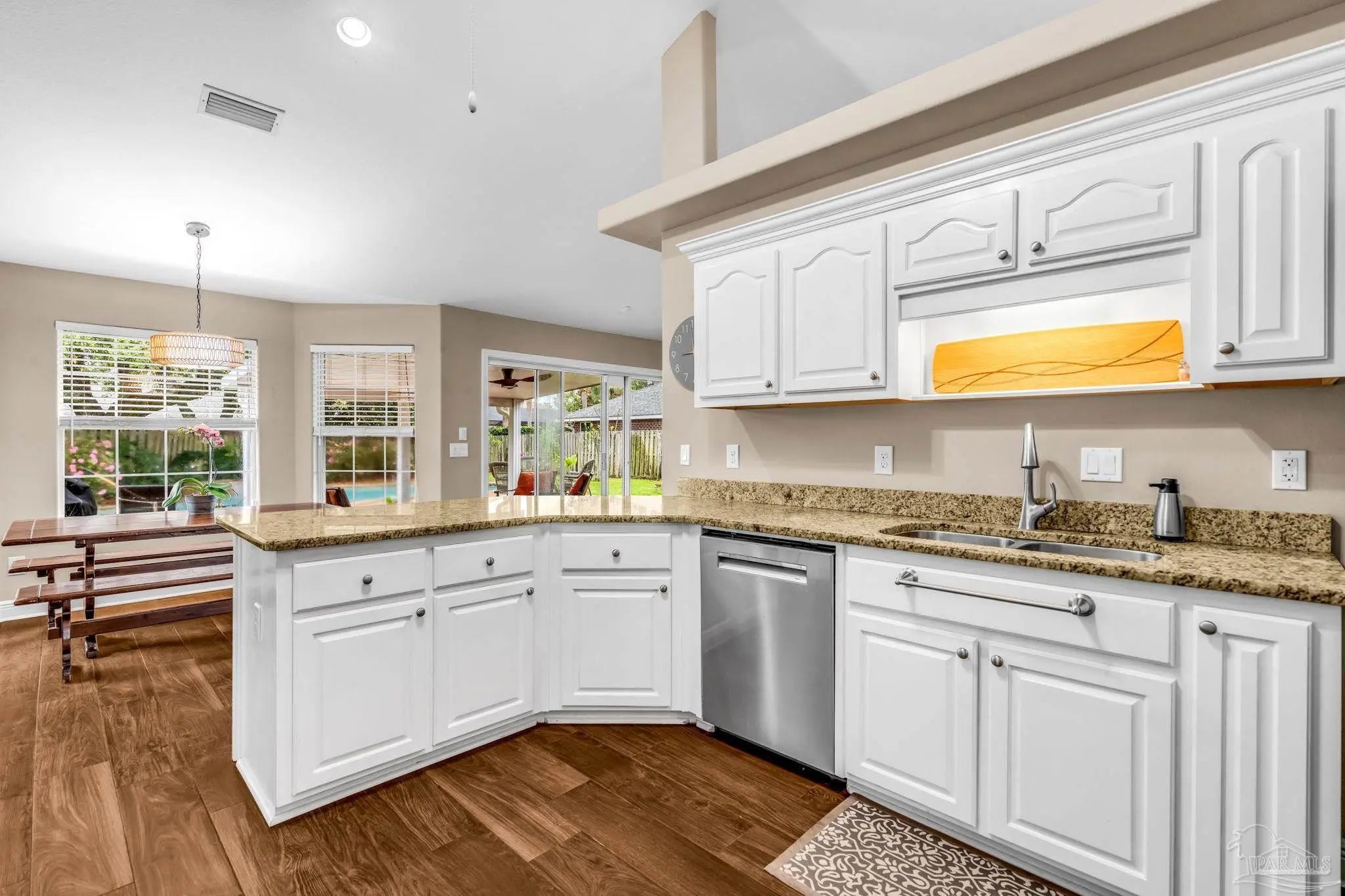 Welcome to this beautifully maintained 4-bedroom, 3-bathroom home offering 2,306 square feet of thoughtfully designed living space in the desirable Woodlawn Heights subdivision. Known for its established setting and convenient location, Woodlawn Heights provides a welcoming neighborhood atmosphere that homeowners love. Inside, you’ll find a spacious and functional floor plan with a large main living area that has a wood burning fireplace, generously sized bedrooms, and plenty of room for both everyday living and entertaining. The home has hardwood styled tile flooring through the main living area, granite countertops in the kitchen, and tile floors with quartz countertops in the bathrooms. The layout offers flexibility for families, guests, or a home office while maintaining a comfortable flow throughout the home. Step outside to enjoy your own private backyard retreat featuring a covered back patio, a sparkling in-ground saltwater pool, perfect for relaxing, hosting gatherings, or simply enjoying the Florida lifestyle. RV/boat parking is available to homeowners through the association for an additional storage fee!