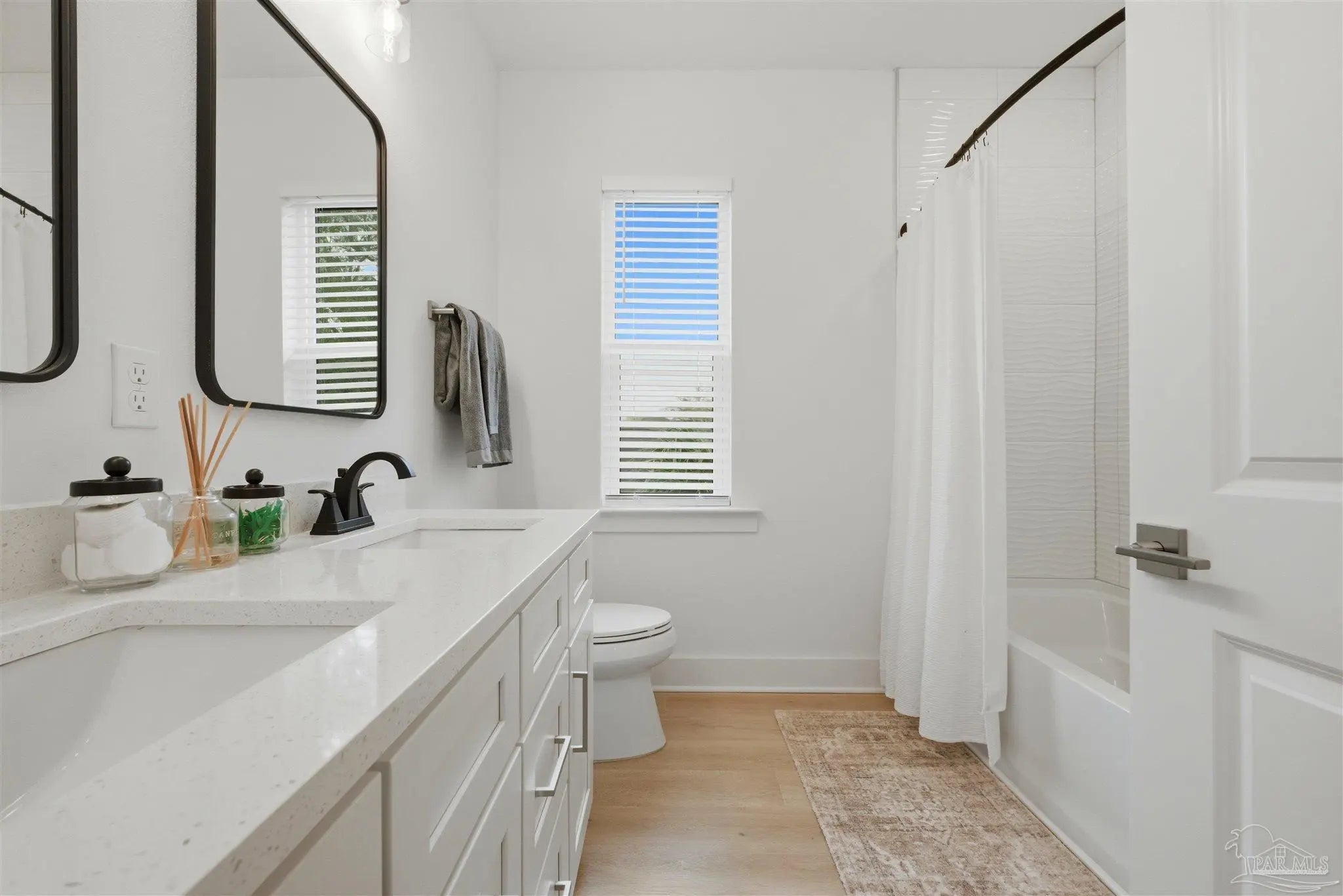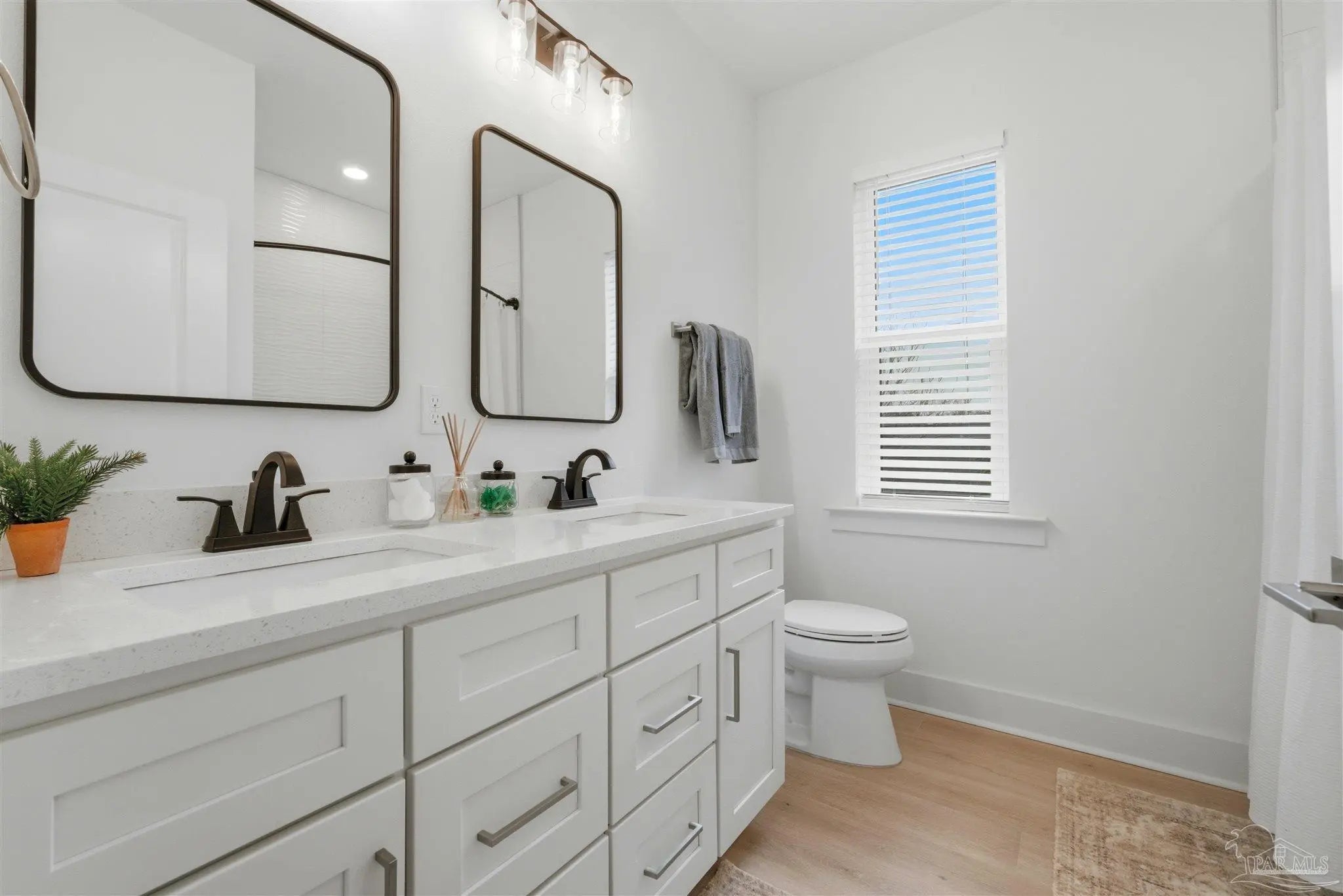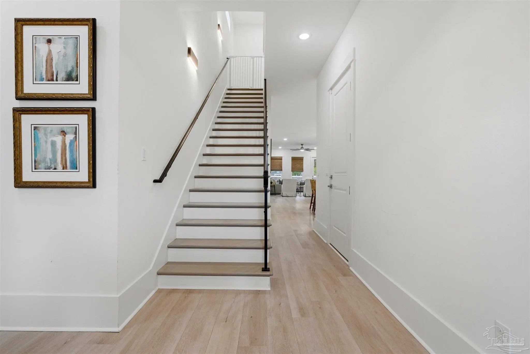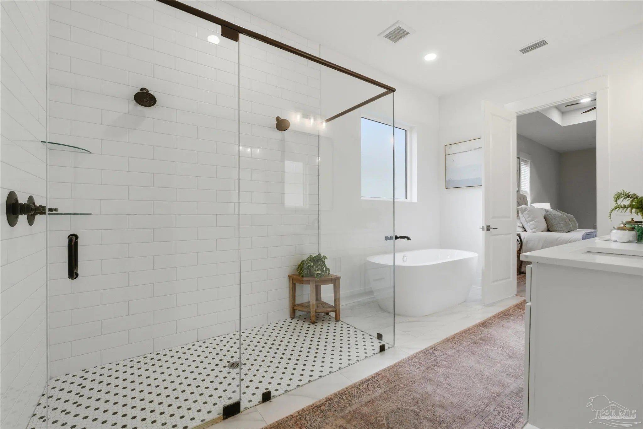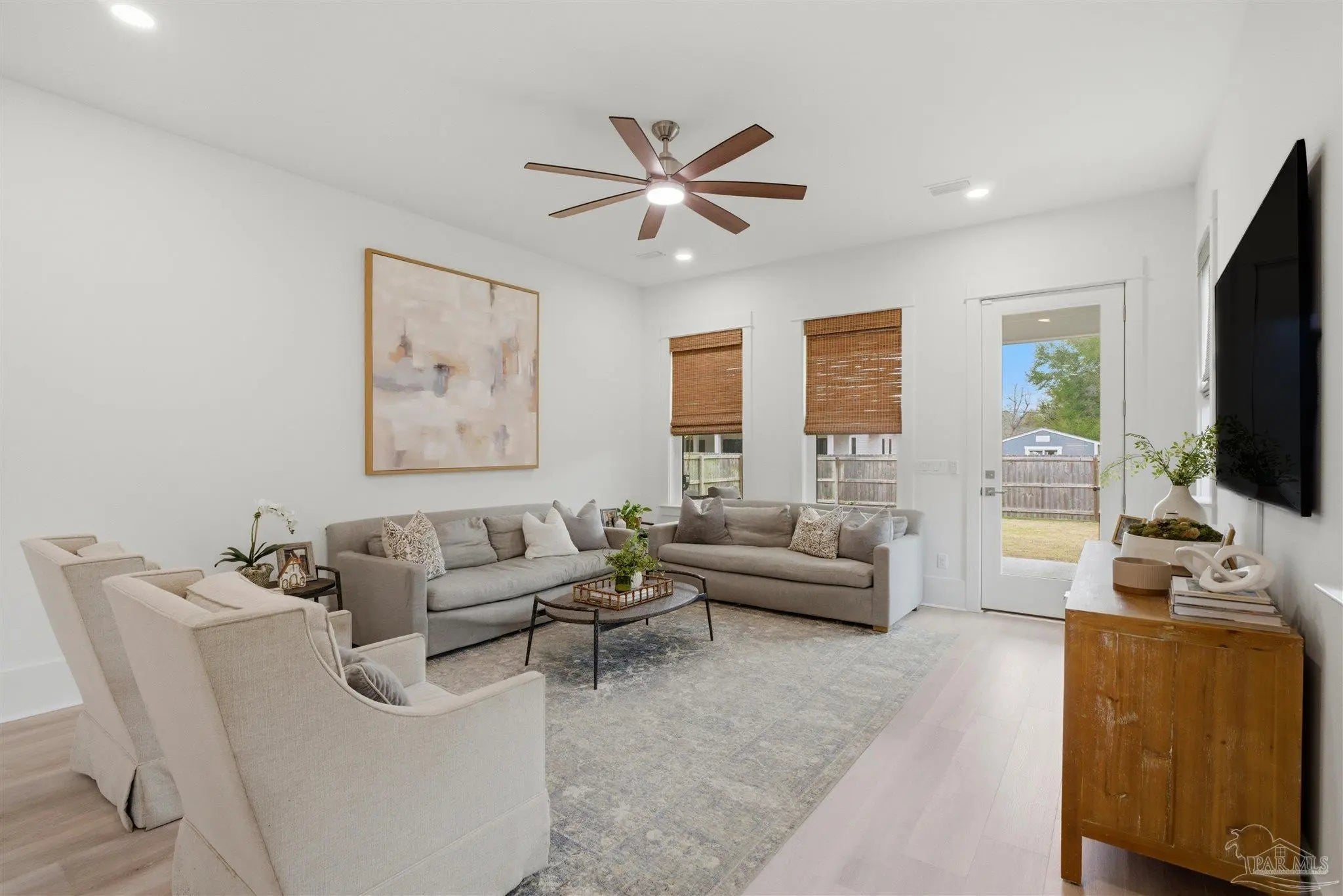 In the heart of East Hill, where tree lined streets, neighborhood parks, and local favorites create one of Pensacola’s most beloved communities, this home captures the easy rhythm of the neighborhood perfectly. Morning walks to grab coffee or pastries, evenings meeting friends at nearby restaurants, and a quick drive down 9th Avenue to downtown or the mall. It is the kind of location people fall in love with and never want to leave. From the street, the curb appeal immediately stands out with lush Empire Zoysia sod, irrigation, and a beautifully finished exterior. Step inside and you are welcomed by 10 foot ceilings and a bright, open layout that immediately feels inviting. The family room, dining area, and kitchen flow seamlessly together, creating a spacious gathering space designed for everyday living and effortless entertaining. The kitchen anchors the room with quartz countertops, modern finishes, and a gas Wolf range with oven that will make any home chef smile. Just off the family room, a large covered patio extends the living space outdoors and overlooks a spacious, fully fenced backyard with a 6 foot privacy fence and gate. It is the perfect setting for outdoor dinner or weekend gatherings. The primary suite on the main level offers a private retreat with a recessed ceiling and sitting area, along with French doors that open directly to the covered patio. The spa inspired bath features a freestanding soaking tub, oversized double head shower, private water closet, and a walk in closet that conveniently connects to the laundry room, blending comfort and thoughtful design. Upstairs you will find four additional bedrooms and two full bathrooms, both featuring double vanities and tub and shower combos with tile extending to the ceiling. One of the bedrooms is oversized with a vaulted ceiling and its own back porch, offering incredible flexibility as a second primary suite, bonus room, home theater, or playroom. Enjoy East Hill Living!