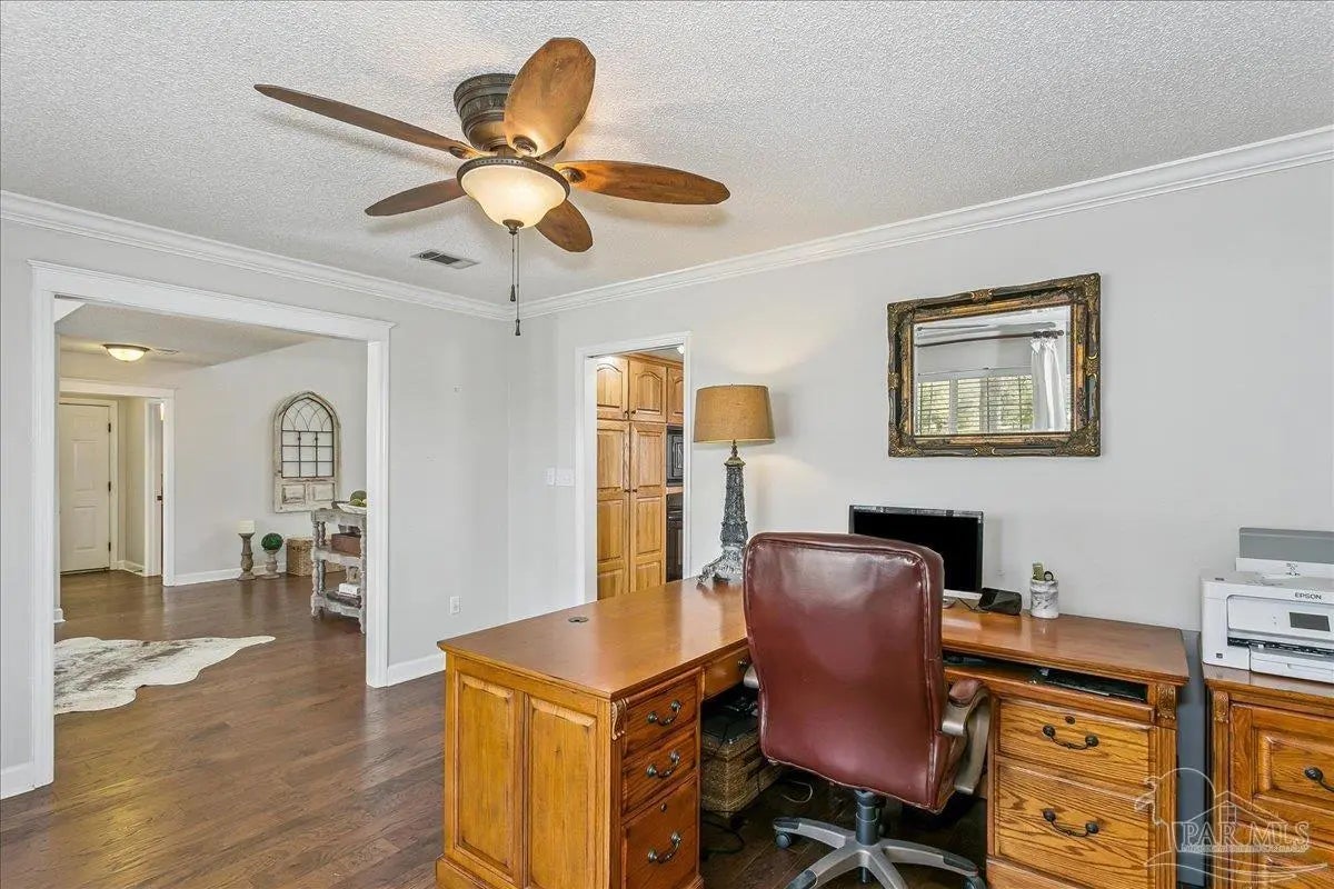 - Storage, Baseboards, Cathedral Ceiling(s), Ceiling Fan(s), Crown Molding, Recessed Lighting, Office/Study