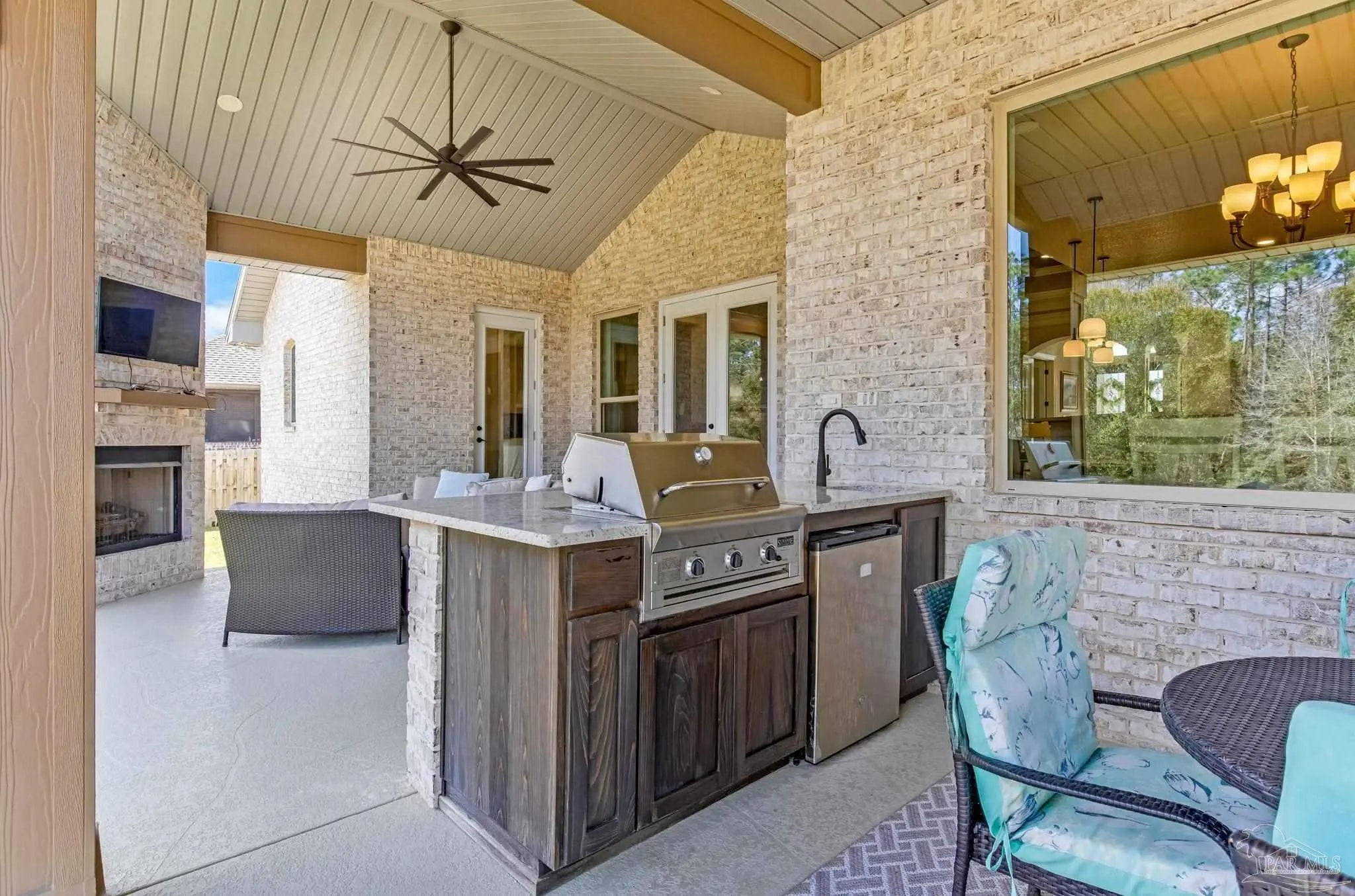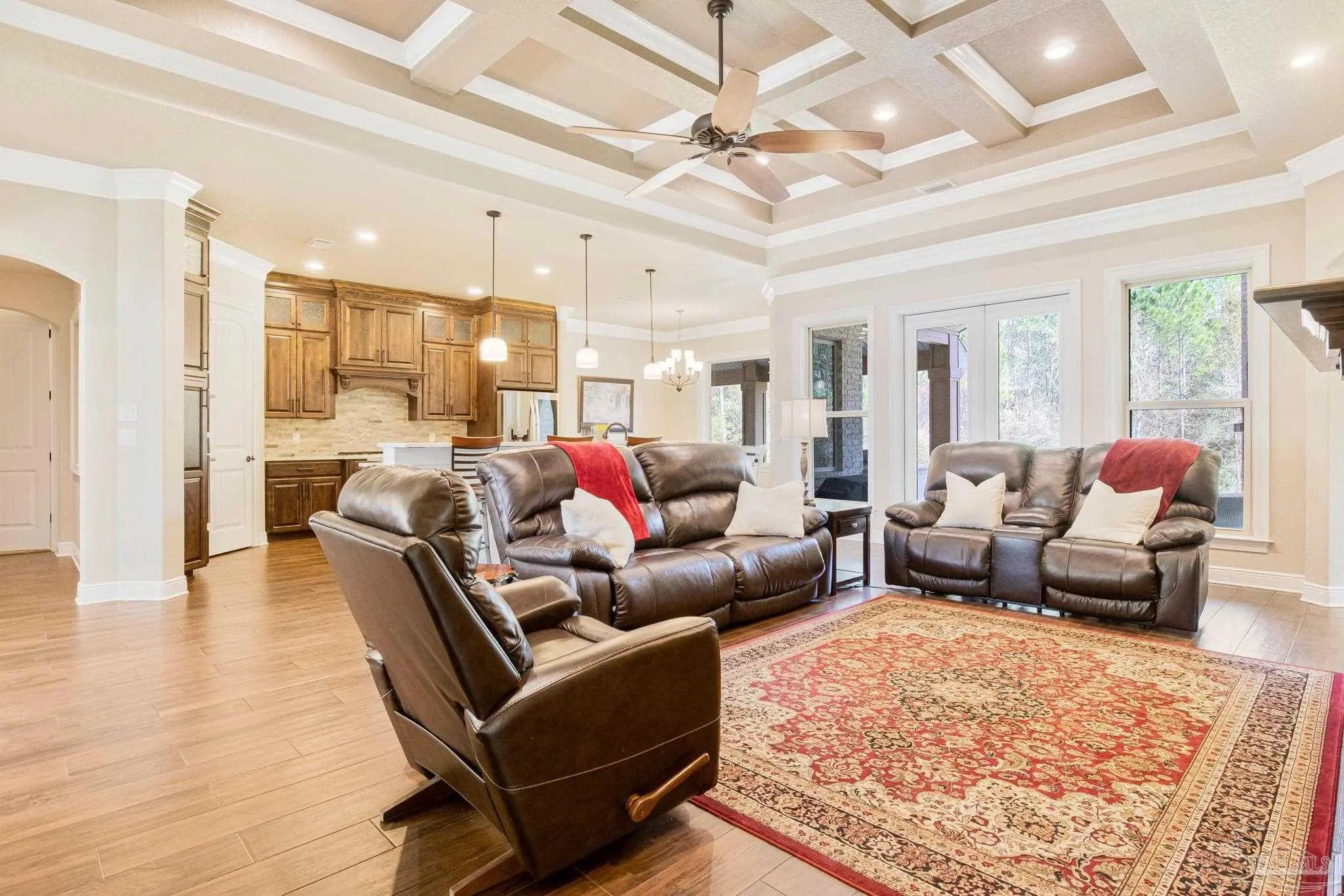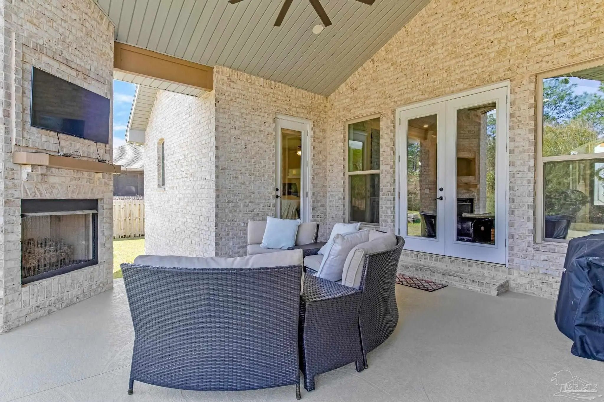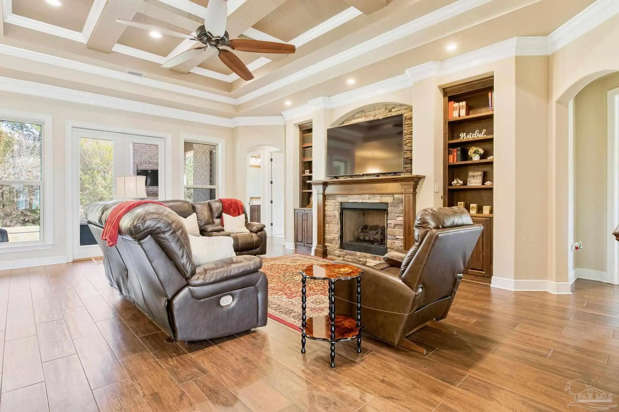 Luxury, privacy, and exceptional craftsmanship come together in this stunning custom home located in the gated community of Huntington Creek. Inside, soaring ceilings and beautiful wood-look tile flooring set the tone for the home’s elegant design. Coffered ceilings accent the living and dining areas while the open-concept layout creates an inviting space for both entertaining and everyday living. The gourmet kitchen is a chef’s dream featuring ceiling-height solid wood cabinetry, quartz countertops, a gas cooktop, wall oven, convection microwave, island, and generous bar seating. All appliances are high end Bosch brand appliances. The grand living room showcases custom built-ins and a gas fireplace, creating the perfect gathering space. The primary suite offers a private retreat with a double tray ceiling, patio access, dual walk-in closets, and a spa-inspired bathroom featuring a freestanding soaking tub, expansive rainfall shower, and dual vanities. Additional bedrooms offer excellent flexibility including a private upstairs suite ideal for a media room or guest retreat and a dedicated home office near the front of the home. Outdoor living takes center stage with a vaulted covered patio complete with an outdoor kitchen and gas fireplace overlooking a peaceful backyard with no rear neighbors. Additional upgrades include a 3-car garage with epoxy floors, generator transfer switch, spray foam insulation, and an energy-efficient SEER 17 HVAC system with dehumidifier. Located next to the Equestrian Center as well as the popular Beulah Regional Park, which features a playground, walking trail, basketball court, upcoming pickleball courts, and more! This home delivers the perfect blend of luxury, comfort, and privacy.
