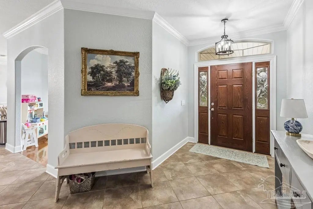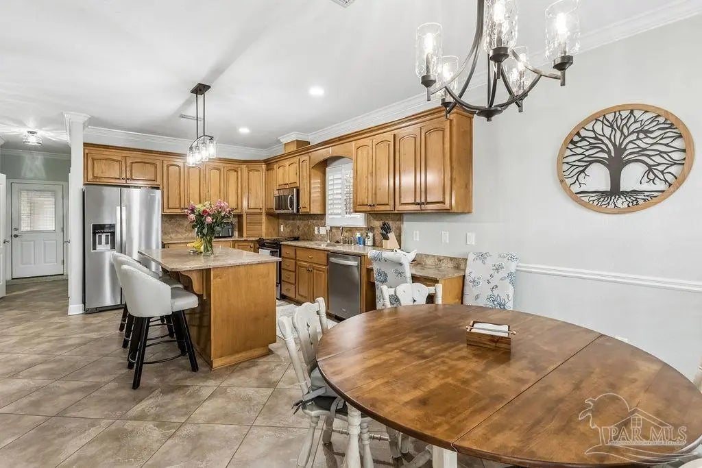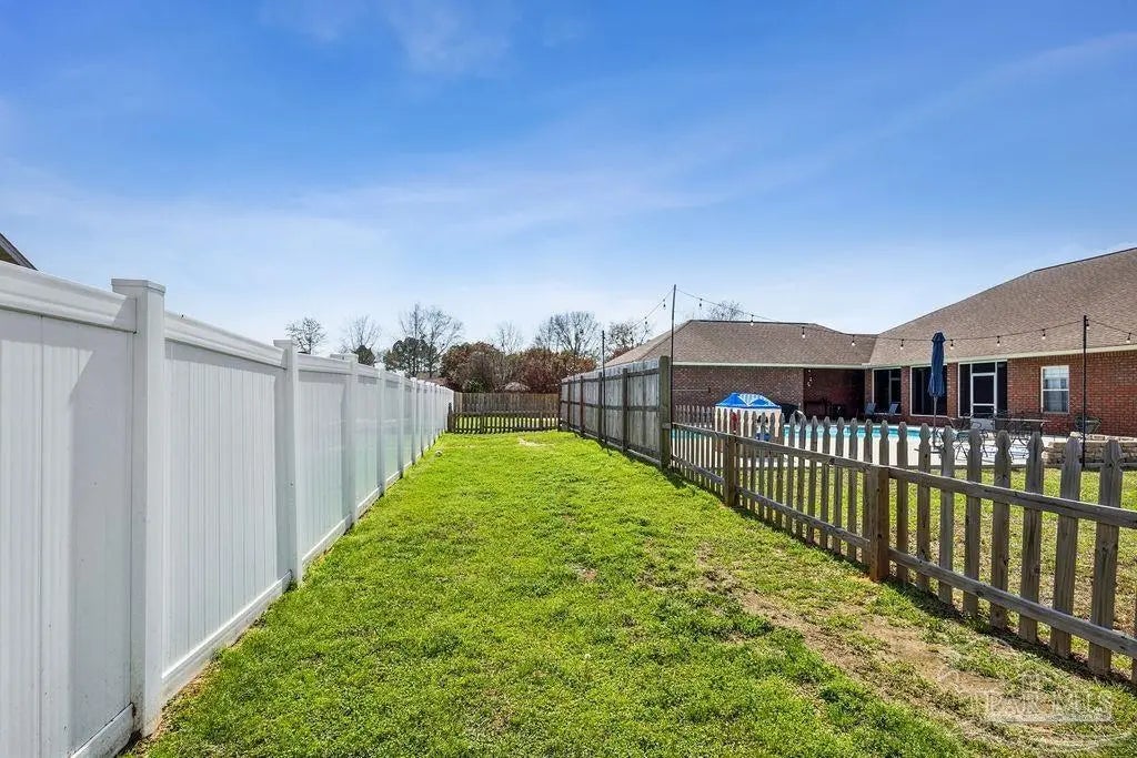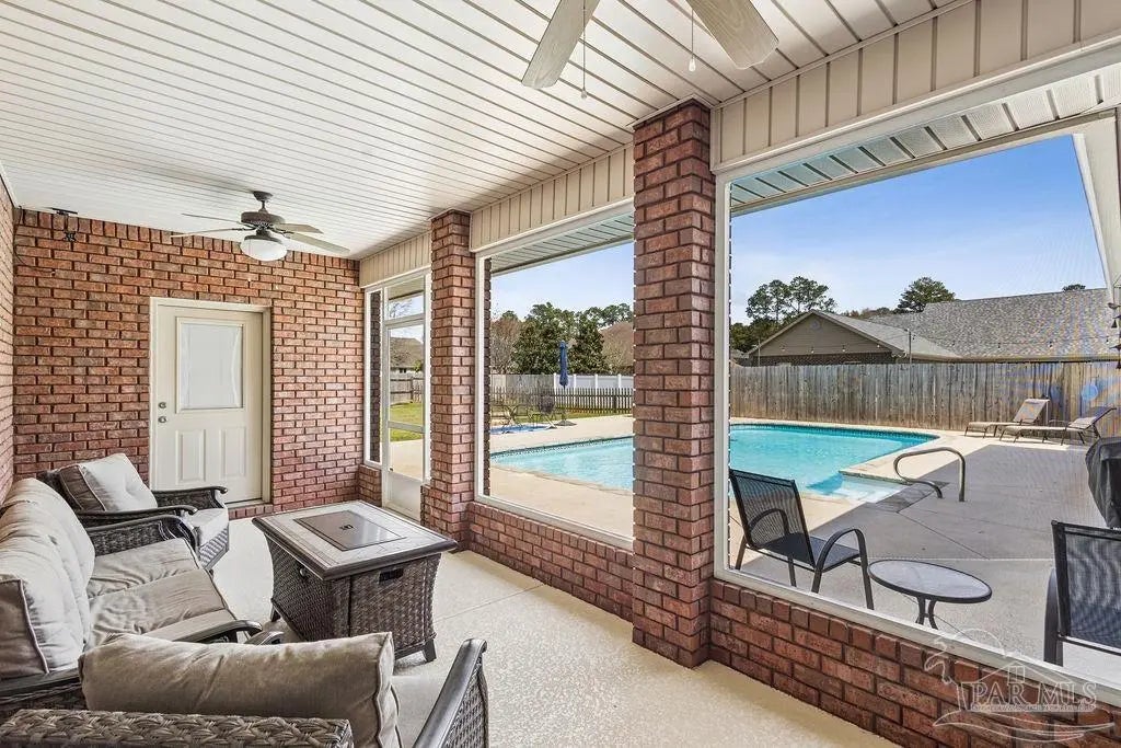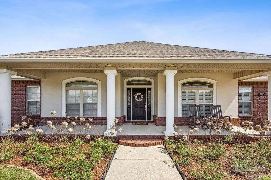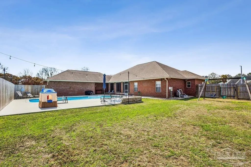 Welcome to this stunning Custom French Creole brick home in the highly sought-after Laurelwood Subdivision of Pace, FL. Perfectly designed for entertaining, this spacious residence features an open floor plan and a huge kitchen with abundant cabinet space, walk-in pantry, elegant travertine countertops, and stainless steel appliances. The large family room impresses with double tray ceilings, accent lighting, and a ceiling fan, creating a warm and inviting atmosphere. Enjoy the charm of custom plantation shutters throughout most of the home and a versatile study/formal dining room with hardwood floors and a bright window with transom. The expansive master suite boasts a tray ceiling, a generous walk-in closet, and a luxurious bath with double vanities, a walk-in shower, and an oversized jetted tub. Additional bedrooms include large closets, with the fourth bedroom ideal as a mother-in-law suite featuring a full bath and walk-in closet. Step outside to a screened porch with 2 fans, perfect for relaxing or entertaining. Pet lovers will appreciate the dedicated dog room, dog door, and fenced dog run. Over $150,000 in upgrades in the last 5 years include a new roof (to be installed by seller with buyer’s choice of shingle color), new HVAC, remodeled fireplace and master bath shower, updated water heaters, new garage door and opener, dishwasher, refrigerator, 18x36 pool with oversized concrete pad, front landscaping, interior paint, and added parking spots. Additional perks: garage fridge, pool security fence, and swing set all included. Flooring allowance at closing.