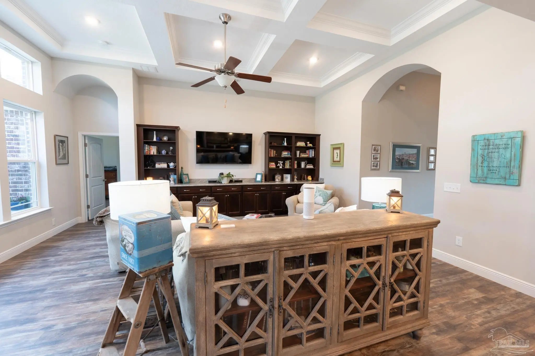 Step into nearly 3,000 square feet of inviting living space in this beautifully maintained Craftsman-style home in Daniels Grove. Built in 2017, this 5 bedroom, 3 bathroom home offers an open layout that feels both spacious and connected from the moment you walk in. High ceilings and architectural details immediately stand out, including a coffered ceiling in the living room and tray ceilings in both the dining room and primary bedroom. The main living area flows effortlessly into the kitchen and dining spaces, creating a natural setting for gatherings, quiet evenings, or entertaining. The kitchen serves as a central hub, featuring a large island, breakfast bar, pantry, designated space for a butler’s pantry, and stainless appliances including a built-in microwave, electric range, dishwasher, and refrigerator. Pull-out shelves in all lower cabinets add everyday convenience and easy organization. The primary bedroom offers a comfortable retreat with a large walk-in closet and ample space to unwind. Additional bedrooms provide flexibility for guests, work-from-home needs, or hobbies. A bright sunroom creates a peaceful spot to relax while overlooking the backyard. Situated on approximately 0.30 acres at the end of a cul-de-sac, the property offers both privacy and room to enjoy the outdoors. Additional features include a two-car garage, sprinkler system, and energy-efficient elements such as double-pane windows, insulated ceilings and doors, and a heat pump system. Conveniently located in west Pensacola near Beulah and just minutes from I-10, this home provides easy access to shopping, dining, and everyday conveniences.