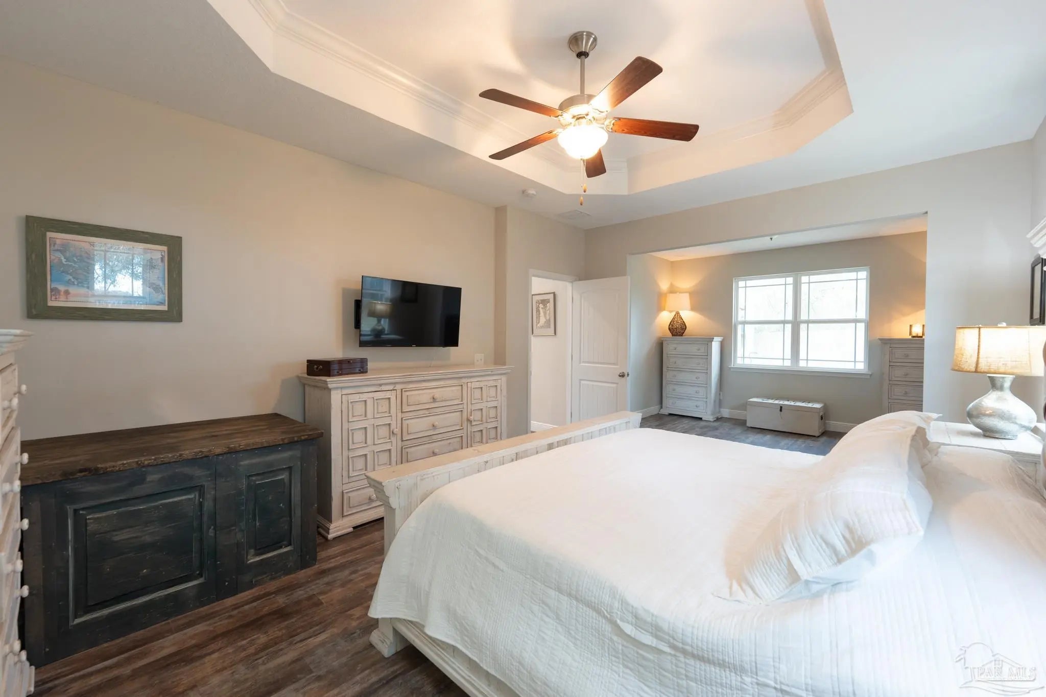 - Ceiling Fan(s), Crown Molding, High Ceilings, Sun Room