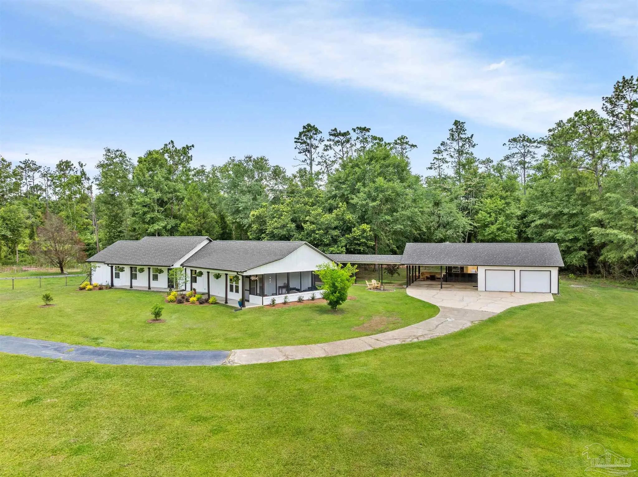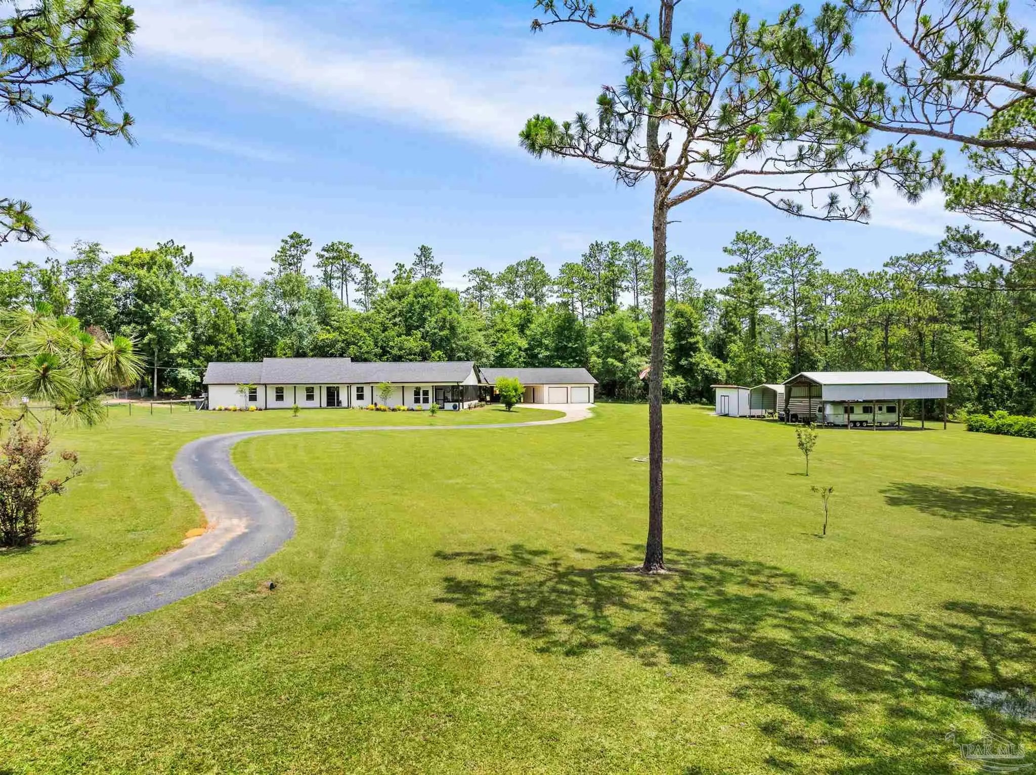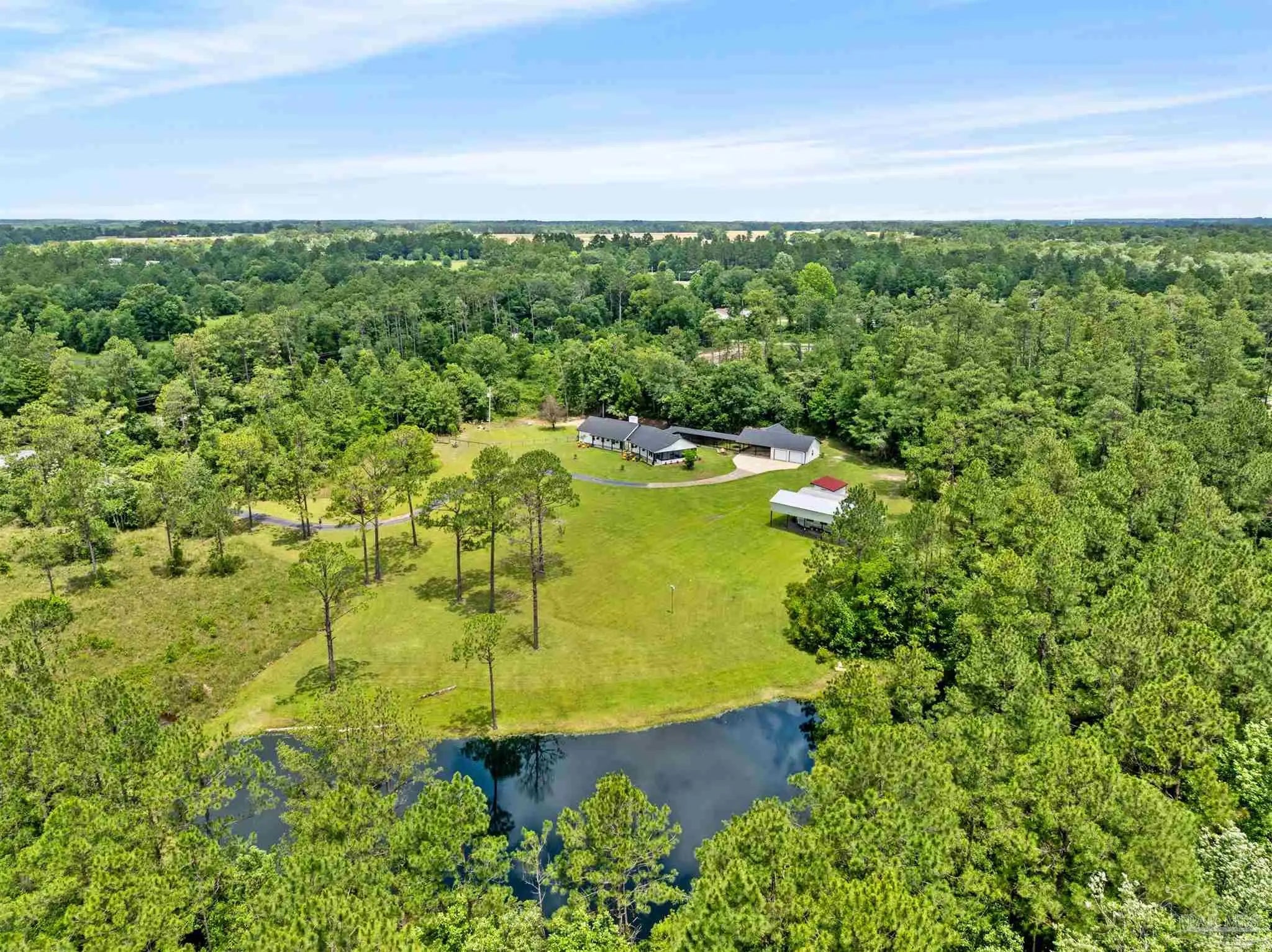 32 ACRES + FULLY RENOVATED HOME + STOCKED POND + BOAT & RV STORAGE + AIRBNB POTENTIAL + 20 MINUTES TO THE BEACHFully renovated private estate on 32 acres just 10 minutes from Hwy 90 & I-10, 20 minutes to the white sand beaches of Gulf Shores and Orange Beach. The beautifully updated 3 bedroom, 2 bath home features a bright open-concept floor plan with soaring ceilings, abundant natural light, and luxury vinyl plank flooring throughout. Quality craftsmanship is evident throughout with custom built-ins, designer finishes, and a gas fireplace anchoring the spacious living area.The chef’s kitchen is thoughtfully designed with granite countertops, custom cabinetry, and high-end appliances, seamlessly connecting the kitchen, dining, and living spaces—perfect for entertaining.The primary suite serves as a private retreat featuring a large walk-in closet, electric fireplace, spa-style bathroom with dual vanities, custom tiled shower, and a relaxing jacuzzi soaking tub. A private screened porch off the suite overlooks the scenic acreage and peaceful landscape.Step outside to an incredible covered outdoor kitchen and entertainment area complete with grill, double sink, refrigerator, mounted TV, sound system, and ample storage, making it ideal for year-round entertaining.The property also includes a detached garage, covered carport, and dedicated covered boat and RV storage, providing exceptional space for vehicles, equipment, and recreational toys.Enjoy landscaped grounds, a fully stocked pond with bass and brim, raised garden beds for organic gardening, and abundant wildlife, creating a true private countryside retreat.With 32 acres, privacy, outdoor amenities, and proximity to the Gulf Coast, this property would also make an excellent Airbnb or short-term rental opportunity, perfect for guests seeking a peaceful getaway near the beaches. Buyer to verify all information during due diligence period. Buyer to verify all information during due diligence.