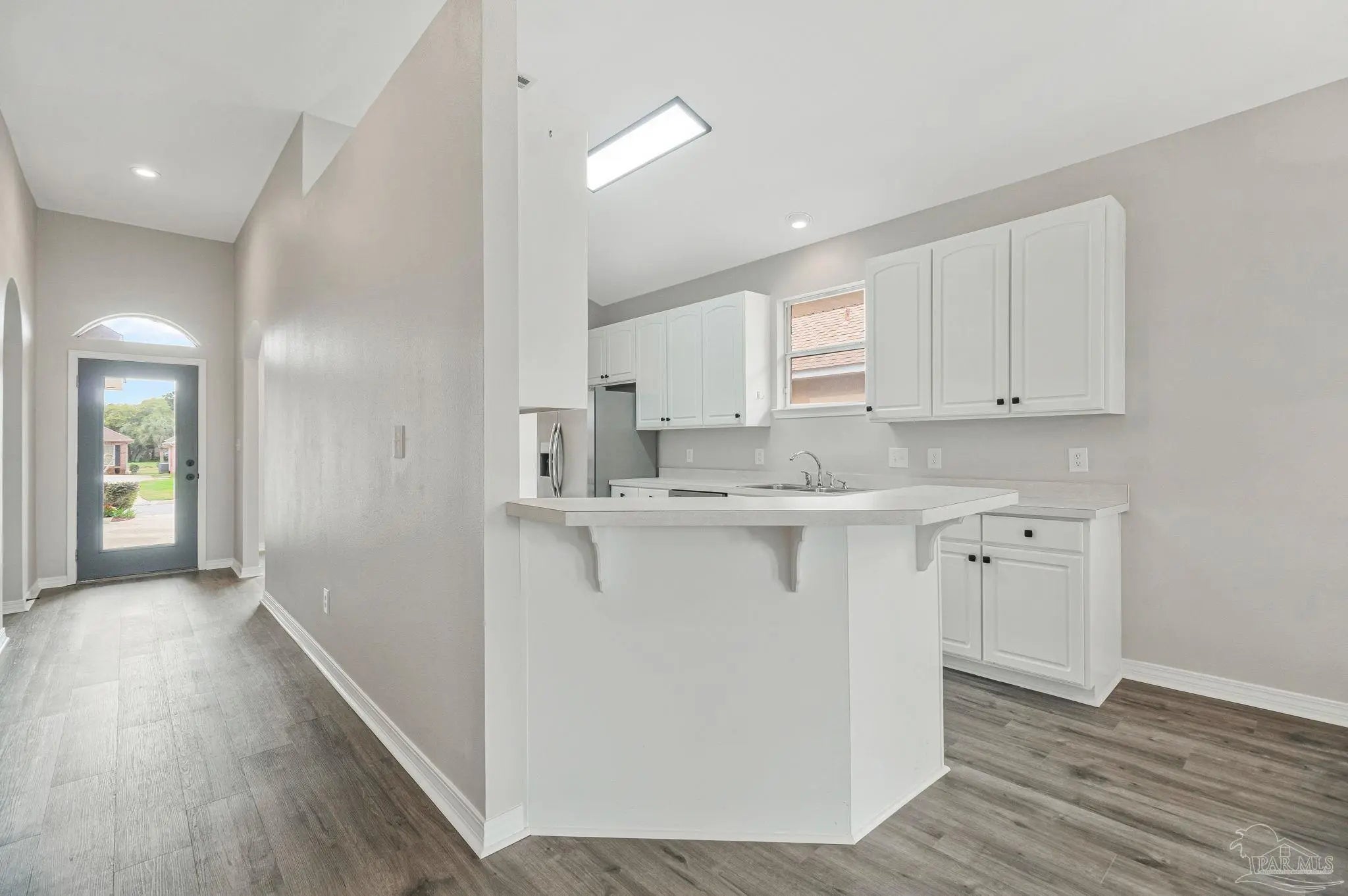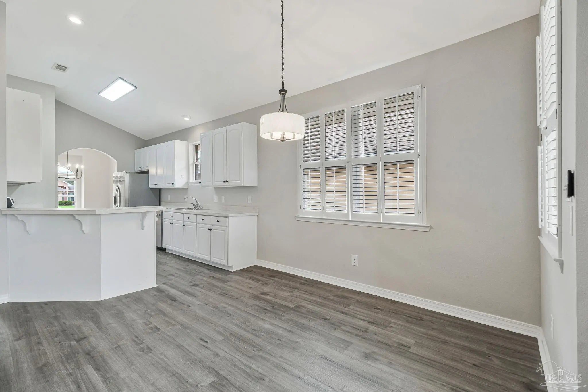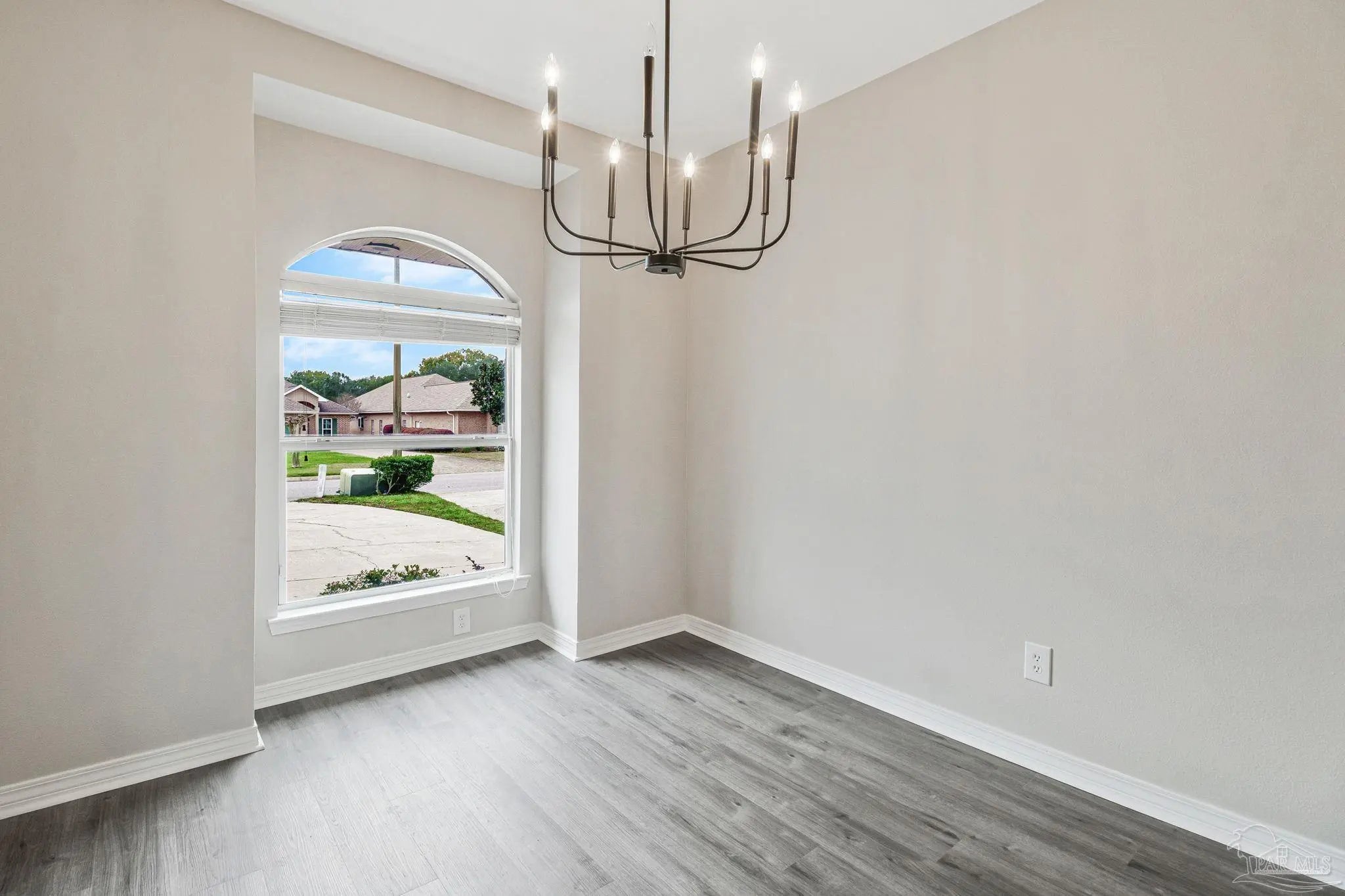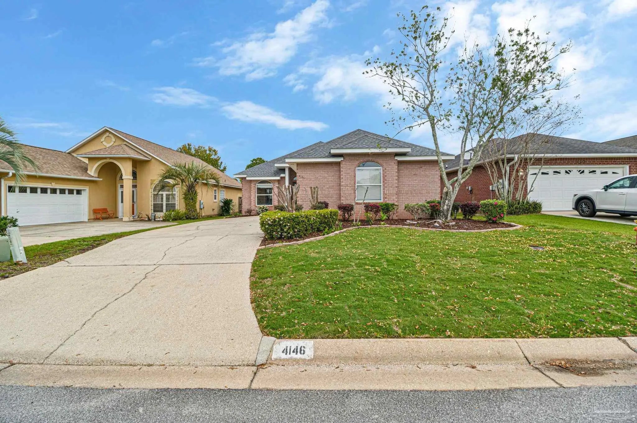 Beautifully updated brick home in desirable Oak Pointe! This contemporary, low-maintenance residence features fresh paint, new fixtures, and updated flooring throughout. The welcoming foyer and spacious family room boast soaring 12-foot ceilings and an abundance of natural light. The bright kitchen offers a pantry, breakfast bar, and stainless steel appliances, including a 5-burner smooth-top self-cleaning range. A formal dining area with a modern chandelier provides the perfect setting for entertaining, while an additional eat-in space connects the kitchen and family room for everyday convenience. The primary suite features a huge walk-in closet, dual vanities, a relaxing garden tub, and a separate shower. Two guest bedrooms share a full hall bath, and a deep linen closet offers extra storage. One of the guest bedrooms even includes a built-in wall safe. Enjoy relaxing on the covered porch just off the breakfast nook, overlooking a cozy, privacy-fenced backyard with a spacious patio ideal for outdoor living. The yard features mature landscaping, new sod, and an irrigation system supplied by a private well. Situated on a quaint cul-de-sac with virtually no through traffic, the home is just across the street from Tiger Point Golf Course. Oak Pointe offers higher elevation with no flood insurance required. Excellent shopping and dining are only 3–5 minutes away and easily accessible by golf cart. Pensacola Beach and Historic Downtown Pensacola are both just a 20-minute drive away. This truly move-in ready gem is a must-see!