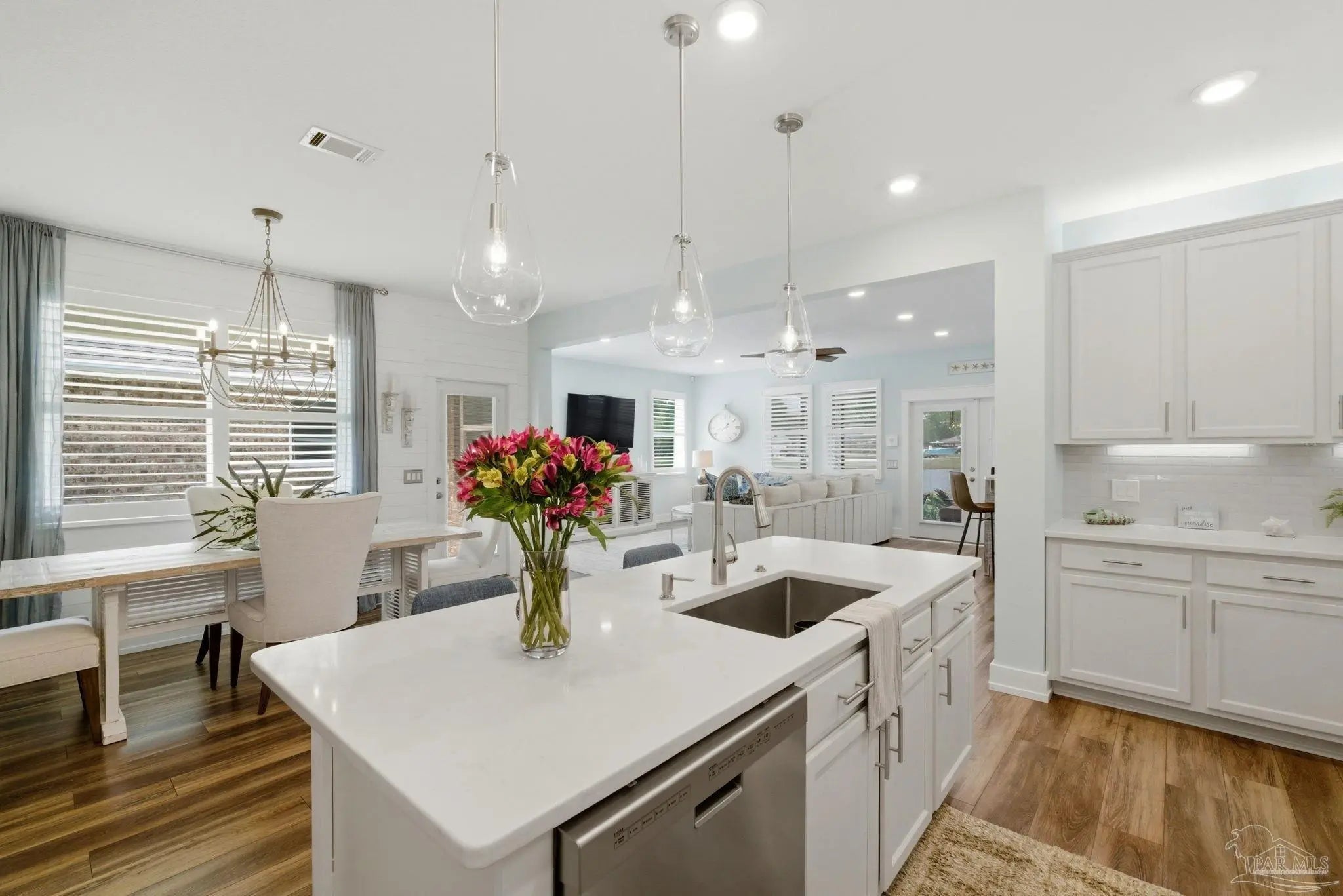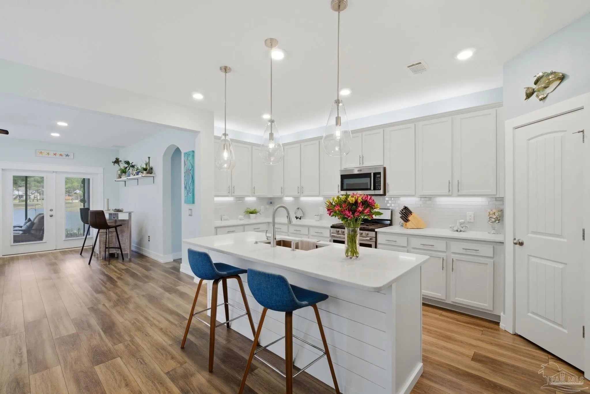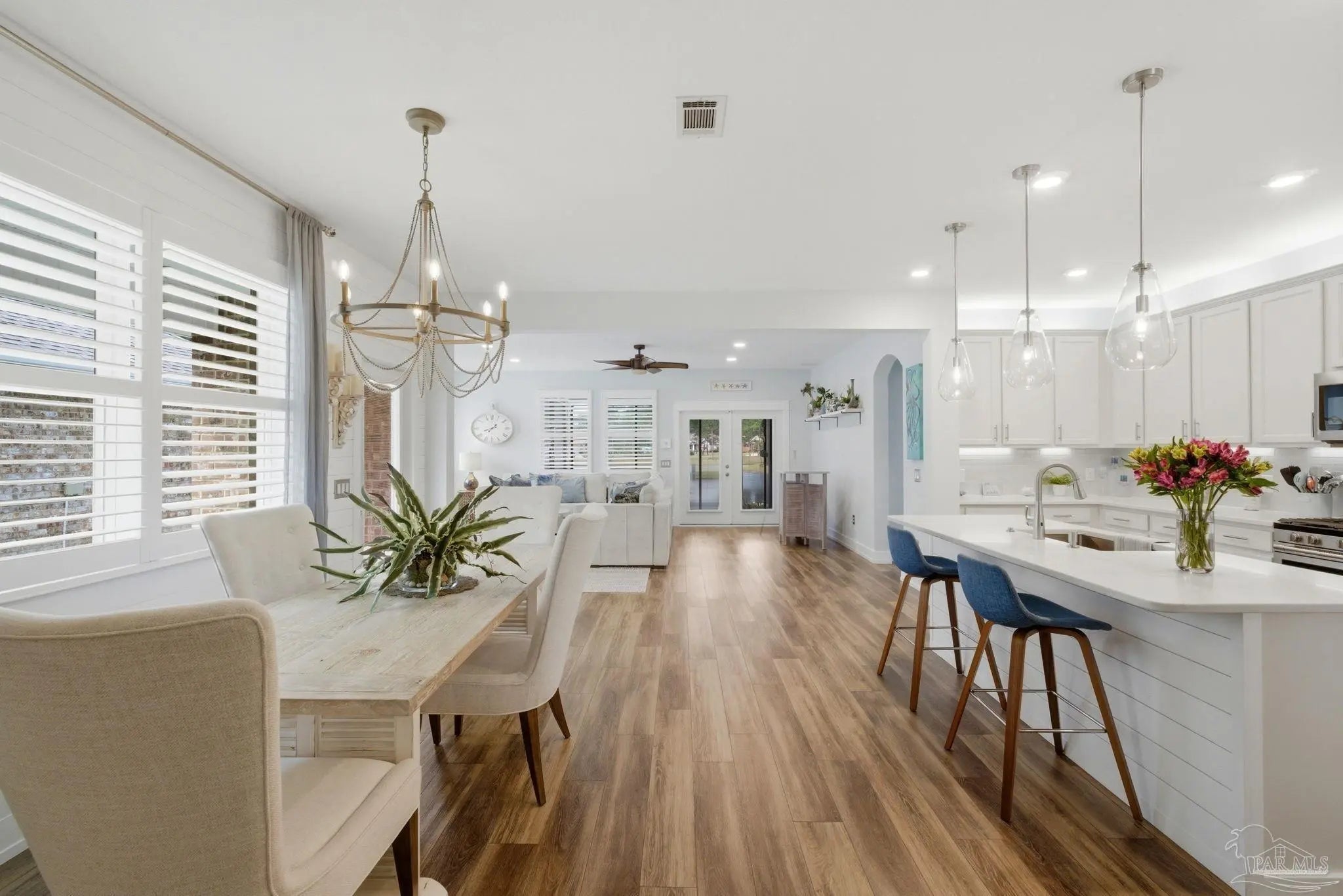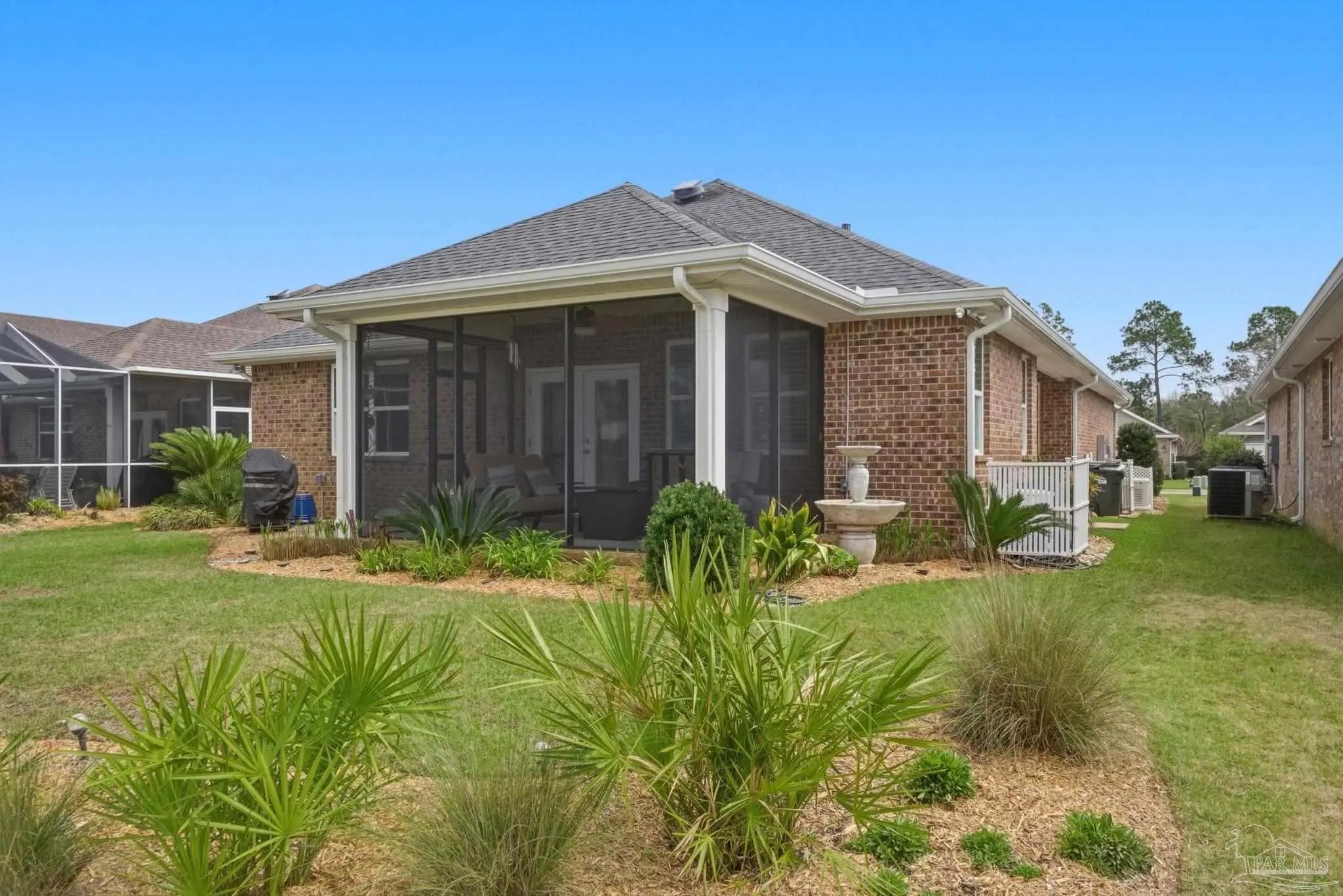 WELCOME TO YOUR TOTALLY REMODELED DREAM HOME IN THE GATED, SUNRISE COMMUNITY- WHERE MODERN LUXURY MEETS COASTAL COMFORT JUST MINUTES FROM PERDIDO KEY AND NAS PENSACOLA! This immaculate 4-bedroom, 2-bathroom residence has been meticulously upgraded, featuring craftsman-style baseboards and trim throughout (2022) and luxury vinyl plank flooring in every bedroom (2021). The heart of the home is a stunning kitchen remodeled in 2021-22, boasting quartz countertops, a shiplap bar front, a Moen touchless faucet, and a custom-remodeled pantry. Relax in the primary suite, which offers a 10-foot custom floor-to-ceiling bookcase and a spa-like bathroom remodeled in 2023 with dolomite countertops and a custom walk-in shower featuring 12×24 polished wall tile. Feel safe and secure as this high-tech home is equipped with a Generac home generator (2023), Ring security system, and an Ecobee smart thermostat. Enjoy the Florida breeze and stunning sunsets on your screened-in back porch—recently updated with "no-see-um" fabric (2026)—while overlooking the peaceful pond and colorful landscaping. Every detail of this home has been polished for its next owner - truly a must see home!