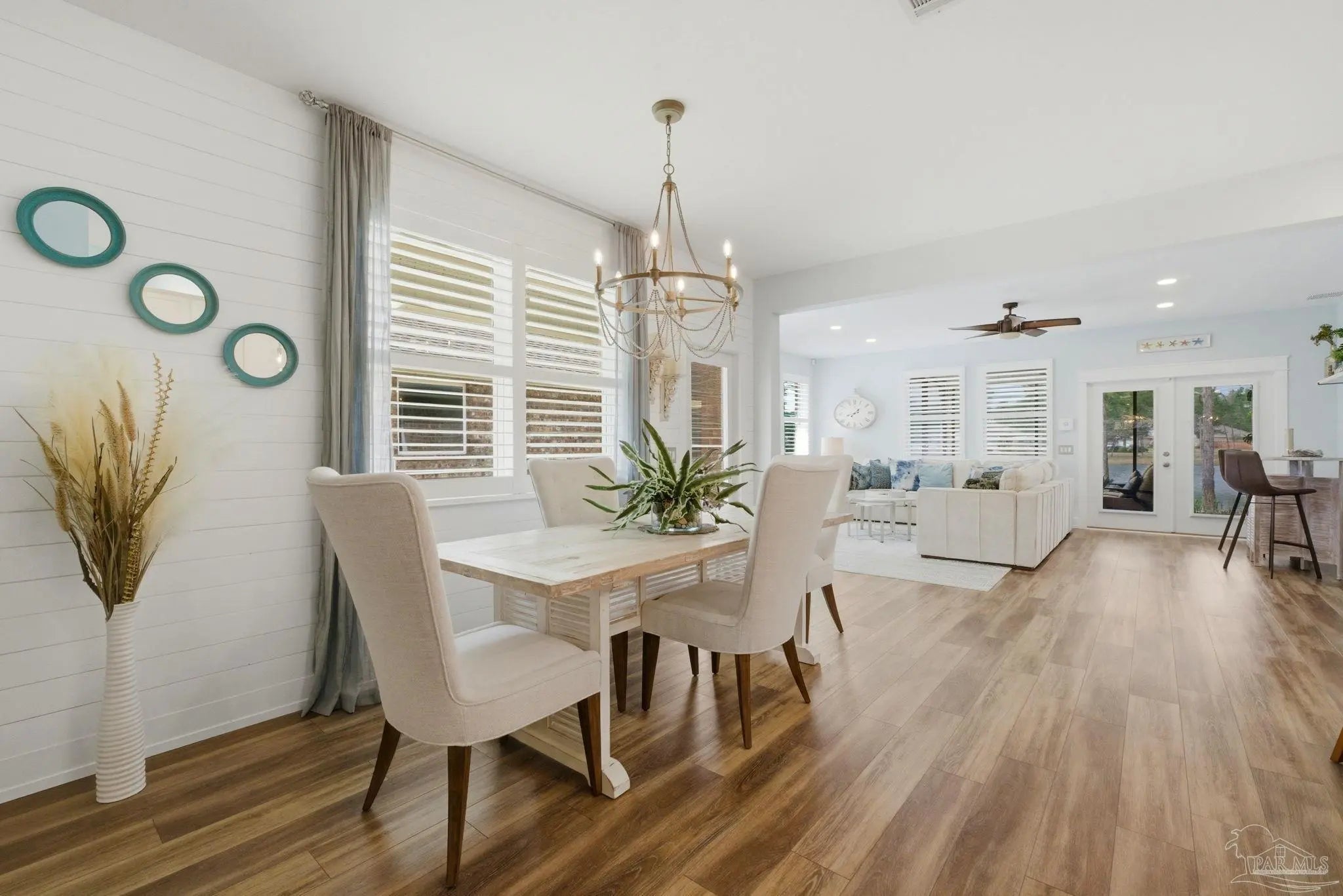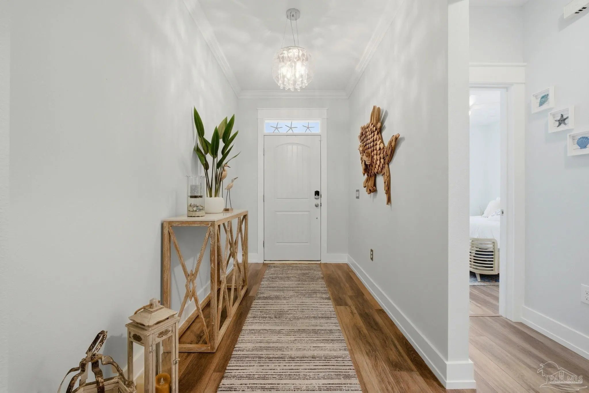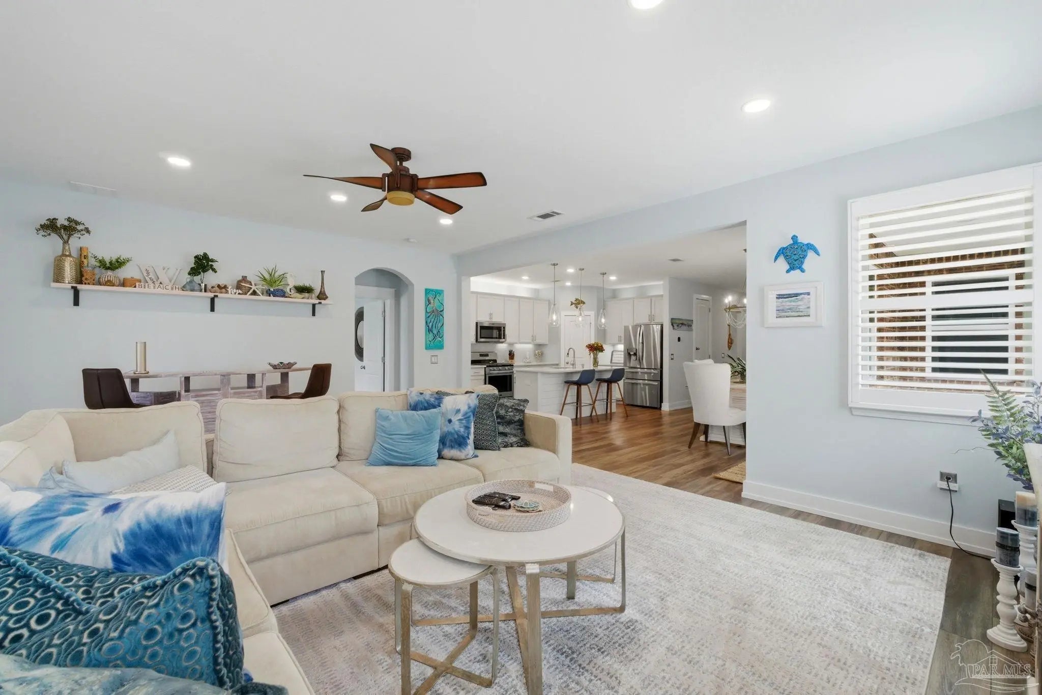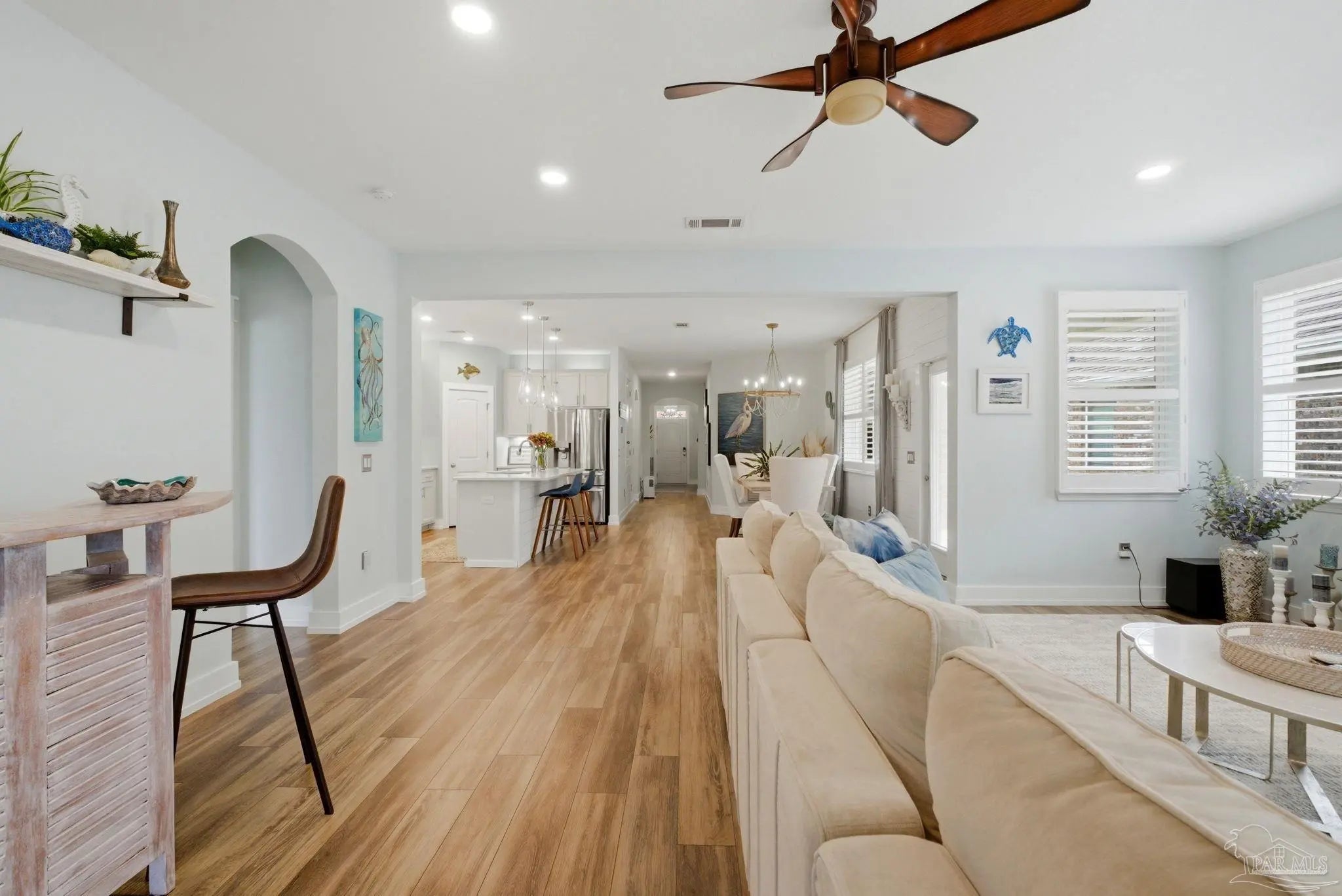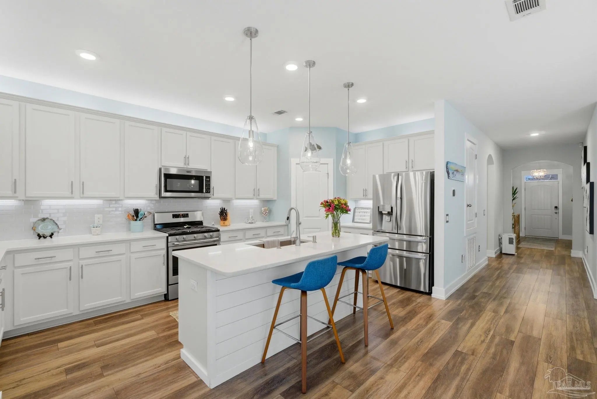 WELCOME TO YOUR TOTALLY REMODELED DREAM HOME IN THE GATED, SUNRISE COMMUNITY- WHERE MODERN LUXURY MEETS COASTAL COMFORT JUST MINUTES FROM PERDIDO KEY AND NAS PENSACOLA! This immaculate 4-bedroom, 2-bathroom residence has been meticulously upgraded, featuring craftsman-style baseboards and trim throughout (2022) and luxury vinyl plank flooring in every bedroom (2021). The heart of the home is a stunning kitchen remodeled in 2021-22, boasting quartz countertops, a shiplap bar front, a Moen touchless faucet, and a custom-remodeled pantry. Relax in the primary suite, which offers a 10-foot custom floor-to-ceiling bookcase and a spa-like bathroom remodeled in 2023 with dolomite countertops and a custom walk-in shower featuring 12×24 polished wall tile. Feel safe and secure as this high-tech home is equipped with a Generac home generator (2023), Ring security system, and an Ecobee smart thermostat. Enjoy the Florida breeze and stunning sunsets on your screened-in back porch—recently updated with "no-see-um" fabric (2026)—while overlooking the peaceful pond and colorful landscaping. Every detail of this home has been polished for its next owner - truly a must see home!