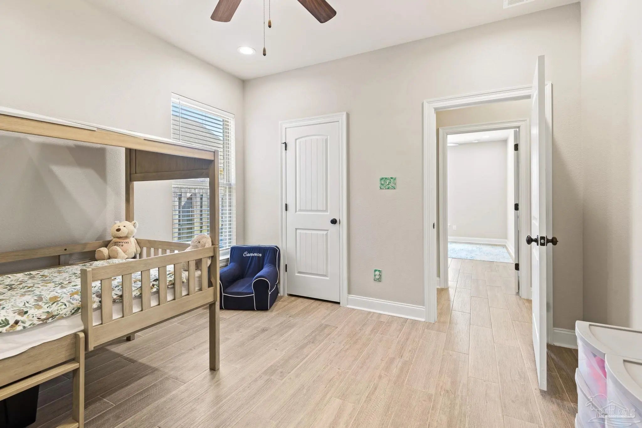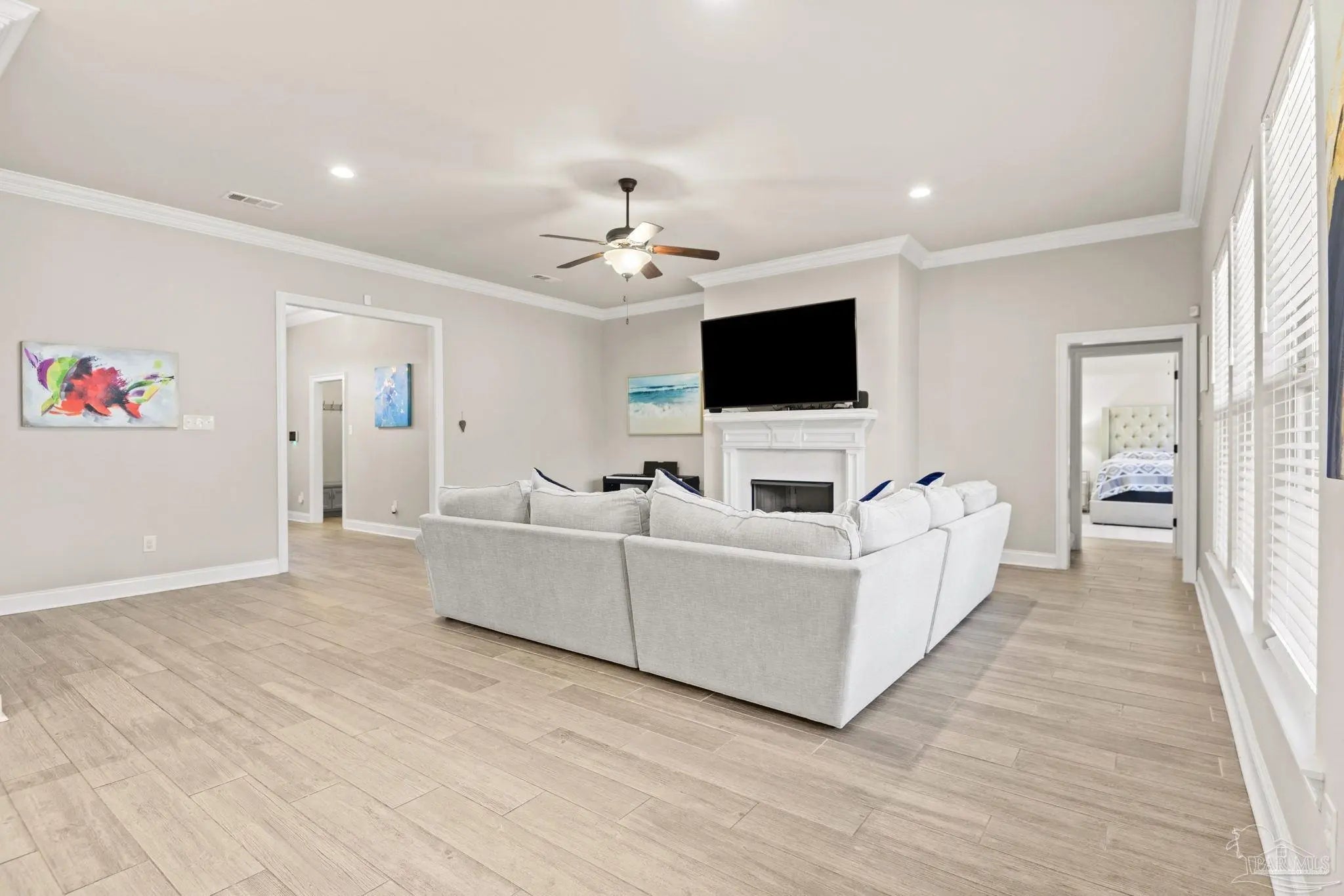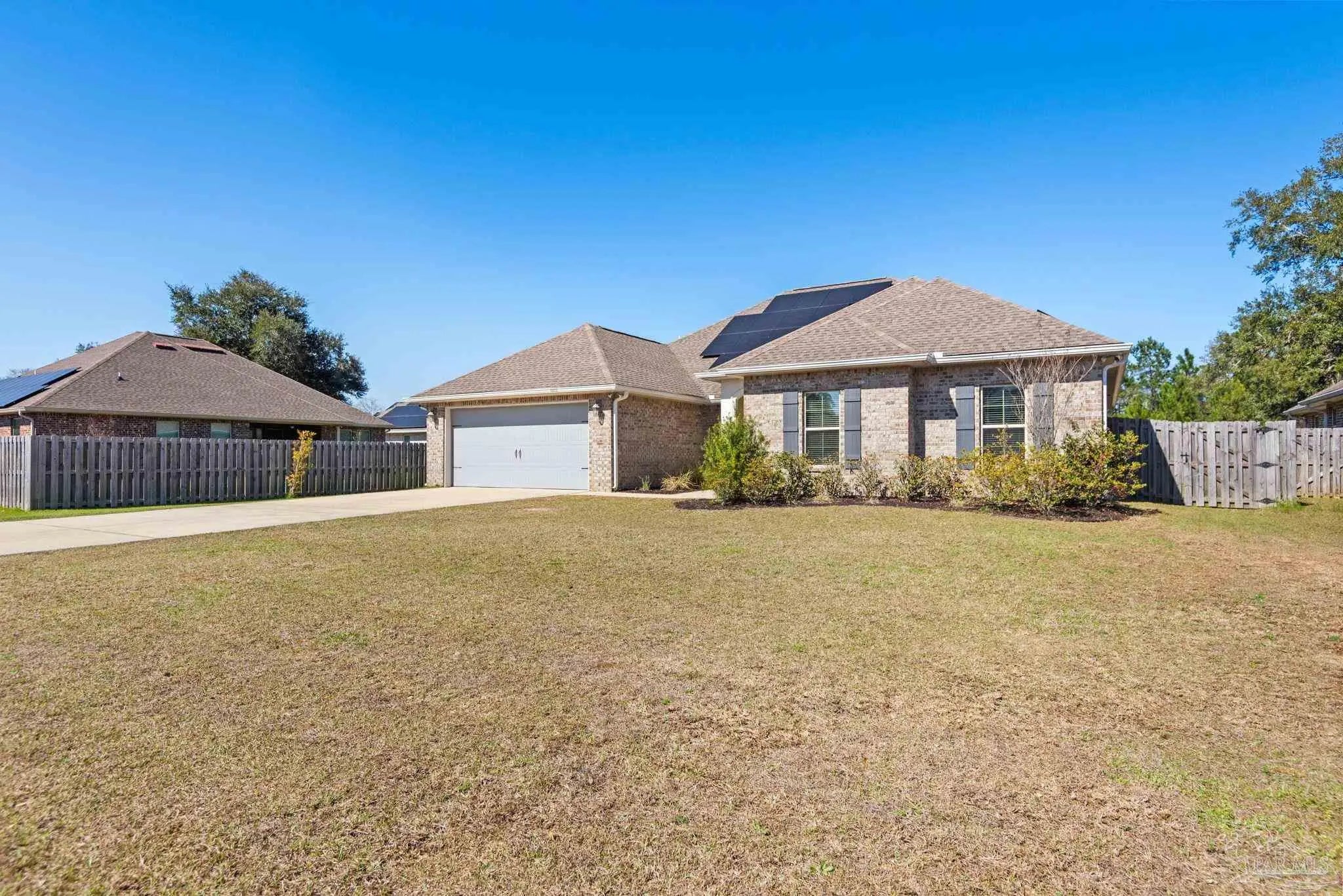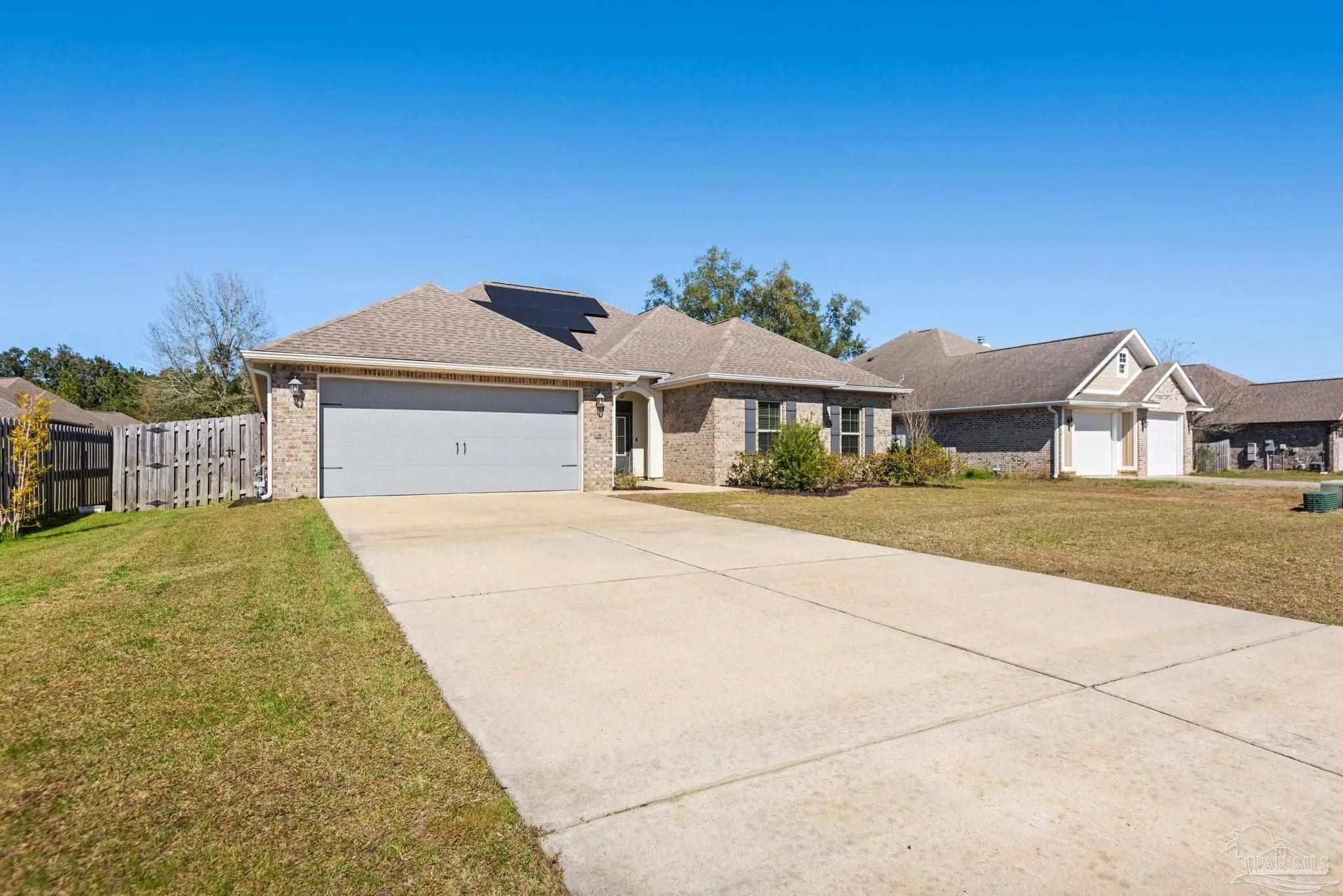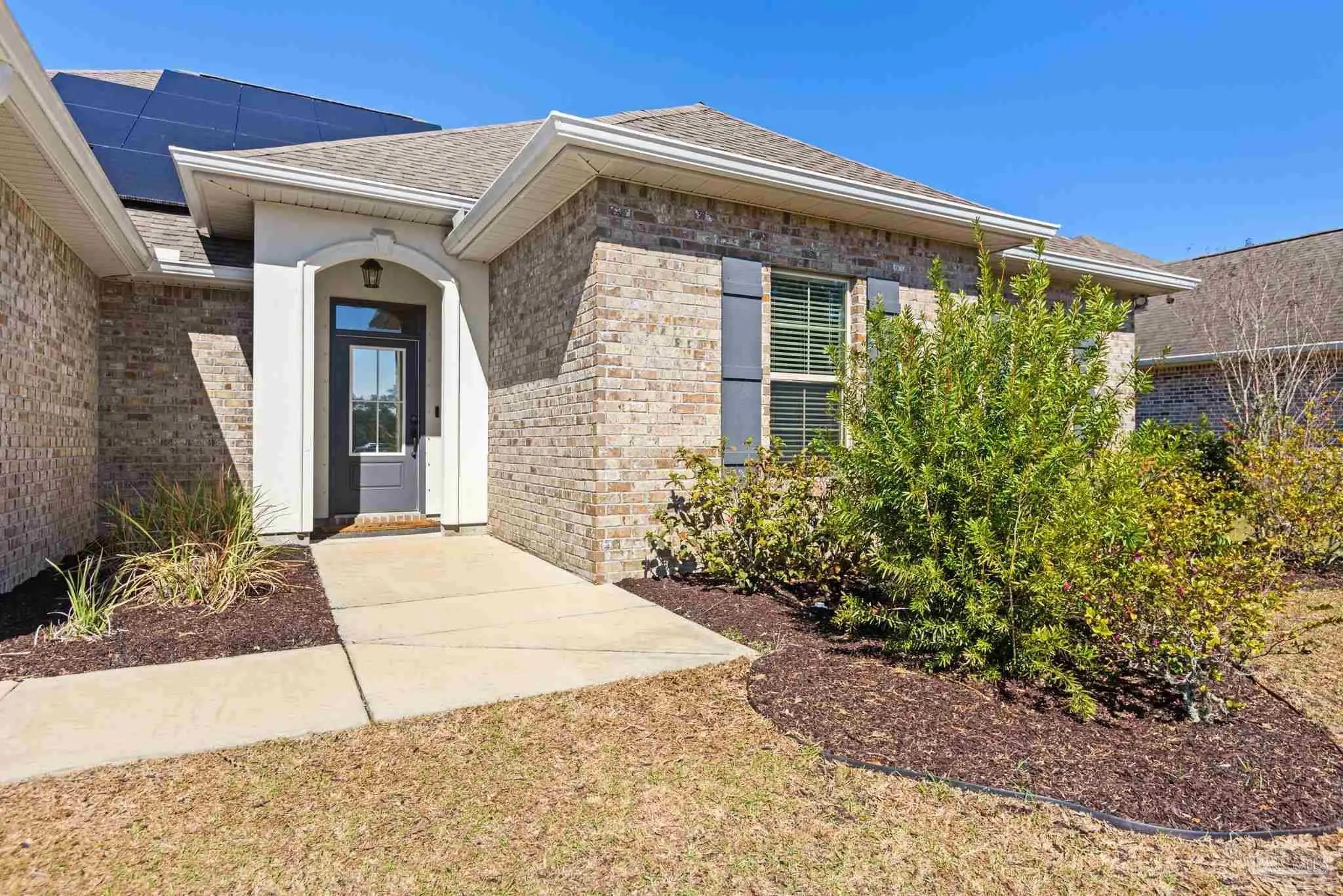 May I have the pleasure of presenting this very attractive and well-kept five-bedroom, three-bath gem tucked away in the welcoming Hawthorne Grove neighborhood of Beulah! This commanding residence is absolutely gorgeous and will check all your boxes. With over 3,000+ square feet of well-designed spaces, appealing color palettes, modern accents, and abundant natural light throughout, this home is perfect for comfort, style, and entertaining. As you step inside, high ceilings wrapped in crown molding greet you, with beautiful wood-look tile that flows into the massive grand room featuring a gas fireplace. The chef’s kitchen is a highlight, showcasing an oversized island, polished quartz countertops, stainless steel appliances, gas range, ceramic tile backsplash, and an abundance of wood cabinetry with under mount lighting. The private master suite serves as a perfect sanctuary, boasting a primary bath with wrap-around double corner vanity sinks, a walk-in tile shower, a garden soaking tub, and a walk-through closet that connects to the laundry room for convenience. The three secondary bedrooms, all generously sized with spacious closets, are located across the home. On the second level, an enormous bonus area offers flexibility as a home gym, office, man-cave, or playroom. The fifth bedroom upstairs, with a walk-in closet and full bath, is secluded and perfect for visiting guests. Step outside under the shaded, covered lanai to enjoy the wide-open backyard, ideal for outdoor dining, gardening, and family fun. Additional features include no rear neighbors, paid-for solar panels (average monthly electric bill $30), hurricane door & window protection, rain gutters, privacy fence, landscape irrigation, tankless gas water heater, and a transferable termite bond. Top-rated schools, parks, shopping, dining, stunning sugar-white beaches, and military installations are all easily accessible. Welcome Home!