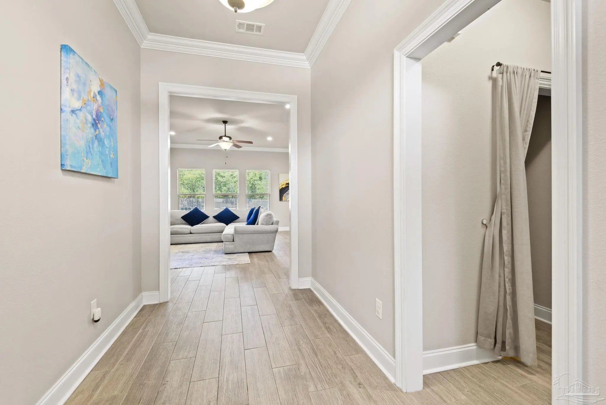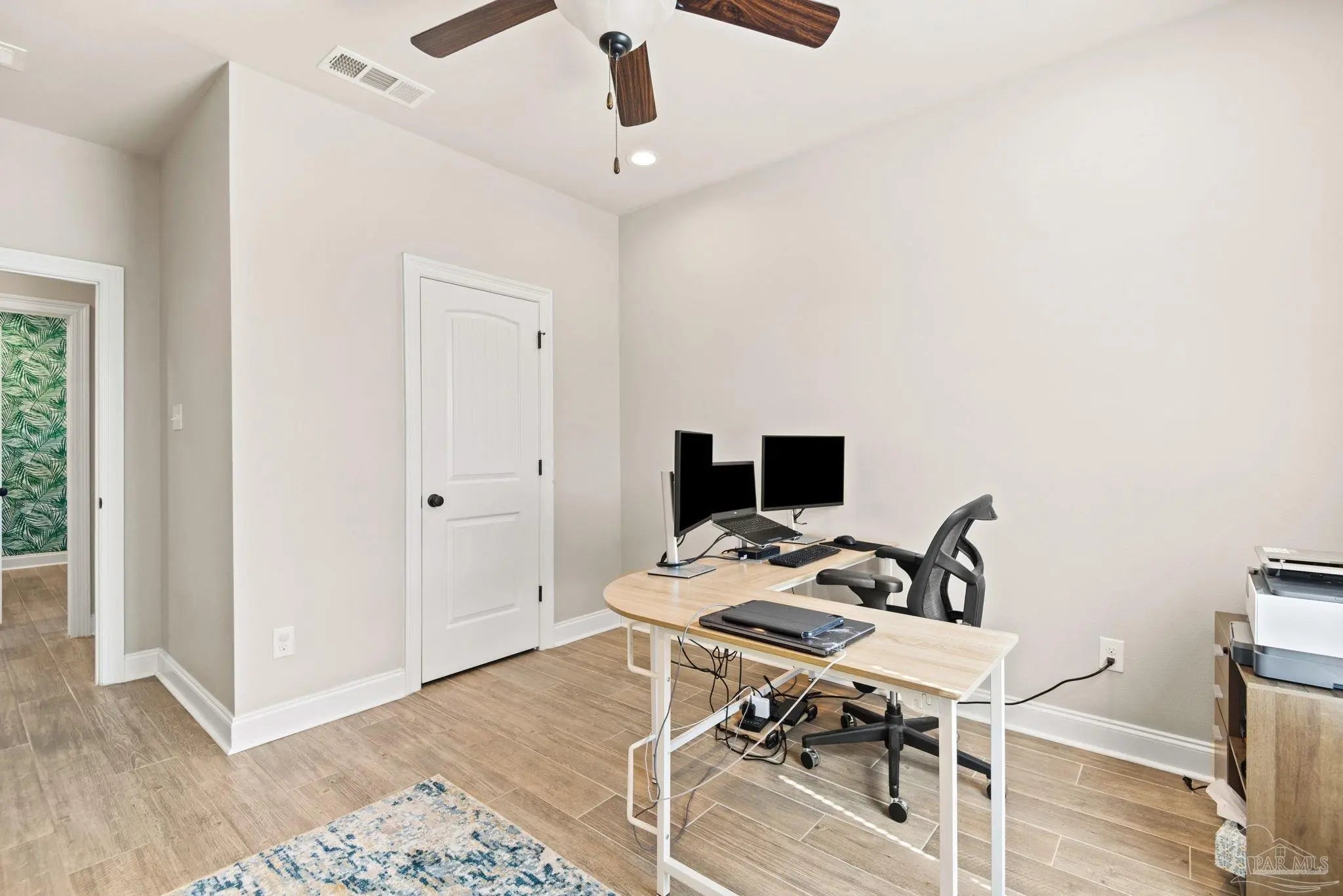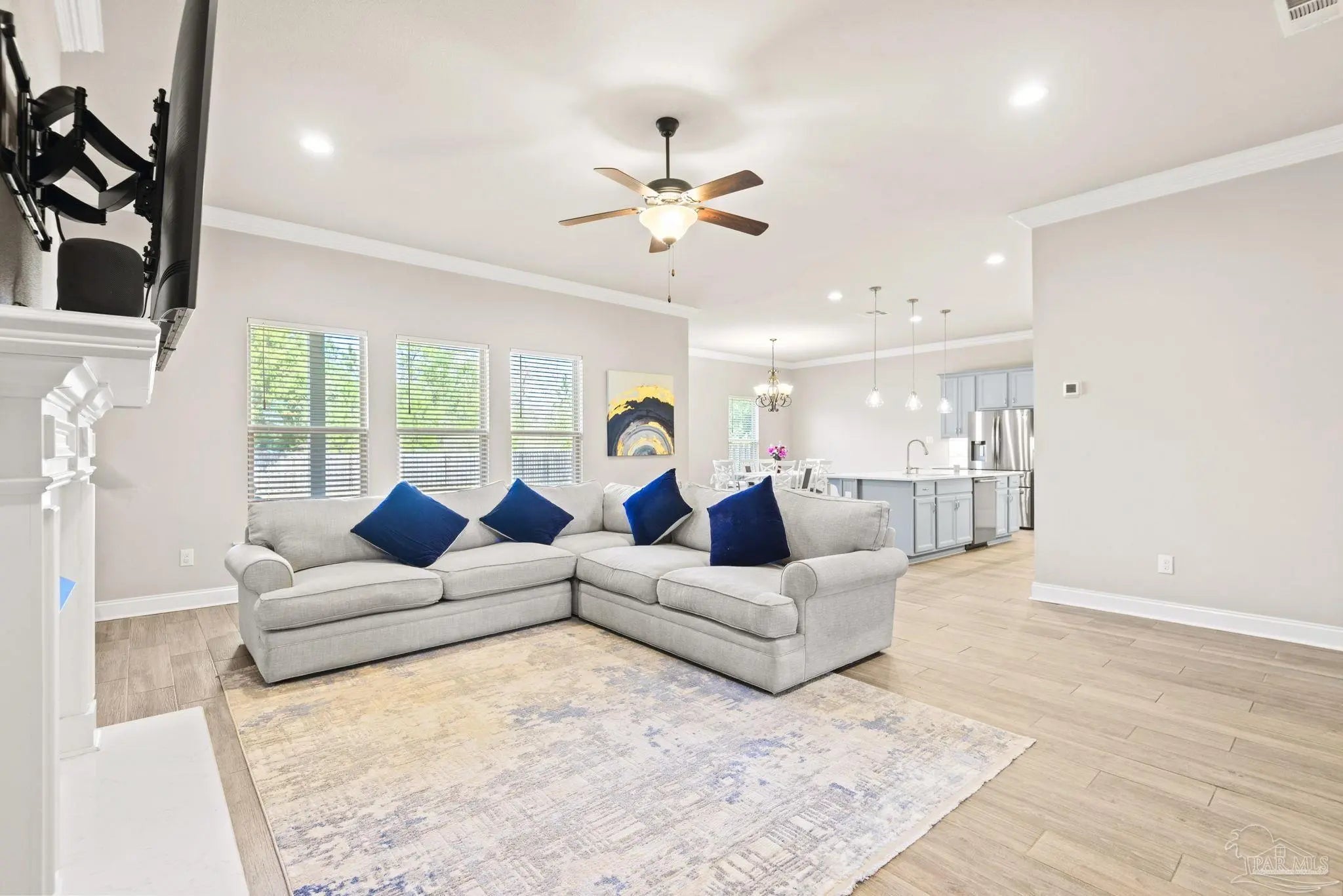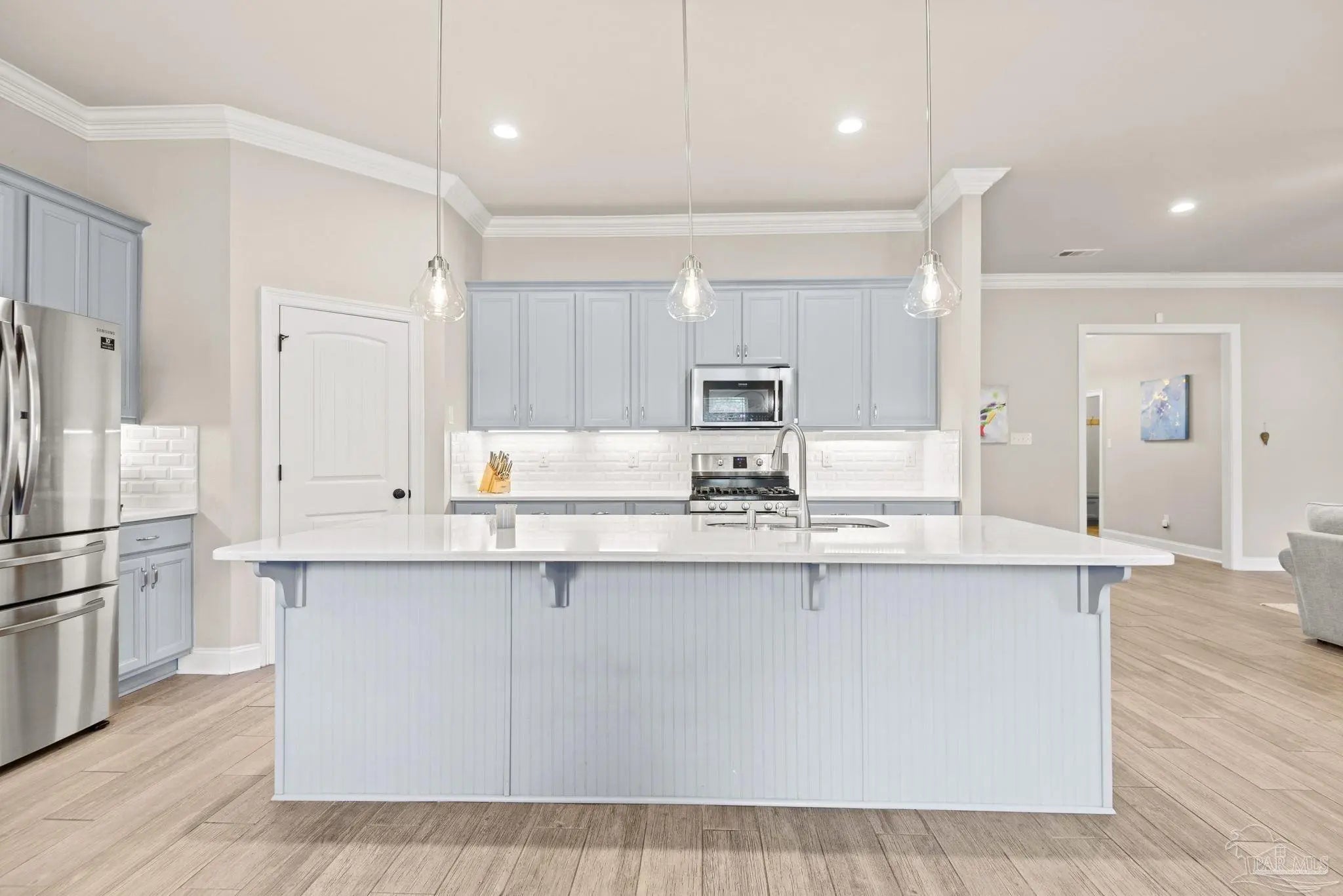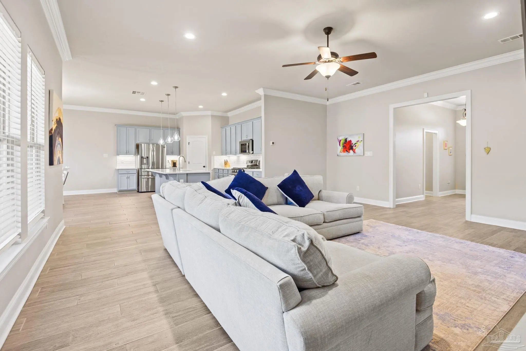 May I have the pleasure of presenting this very attractive and well-kept five-bedroom, three-bath gem tucked away in the welcoming Hawthorne Grove neighborhood of Beulah! This commanding residence is absolutely gorgeous and will check all your boxes. With over 3,000+ square feet of well-designed spaces, appealing color palettes, modern accents, and abundant natural light throughout, this home is perfect for comfort, style, and entertaining. As you step inside, high ceilings wrapped in crown molding greet you, with beautiful wood-look tile that flows into the massive grand room featuring a gas fireplace. The chef’s kitchen is a highlight, showcasing an oversized island, polished quartz countertops, stainless steel appliances, gas range, ceramic tile backsplash, and an abundance of wood cabinetry with under mount lighting. The private master suite serves as a perfect sanctuary, boasting a primary bath with wrap-around double corner vanity sinks, a walk-in tile shower, a garden soaking tub, and a walk-through closet that connects to the laundry room for convenience. The three secondary bedrooms, all generously sized with spacious closets, are located across the home. On the second level, an enormous bonus area offers flexibility as a home gym, office, man-cave, or playroom. The fifth bedroom upstairs, with a walk-in closet and full bath, is secluded and perfect for visiting guests. Step outside under the shaded, covered lanai to enjoy the wide-open backyard, ideal for outdoor dining, gardening, and family fun. Additional features include no rear neighbors, paid-for solar panels (average monthly electric bill $30), hurricane door & window protection, rain gutters, privacy fence, landscape irrigation, tankless gas water heater, and a transferable termite bond. Top-rated schools, parks, shopping, dining, stunning sugar-white beaches, and military installations are all easily accessible. Welcome Home!