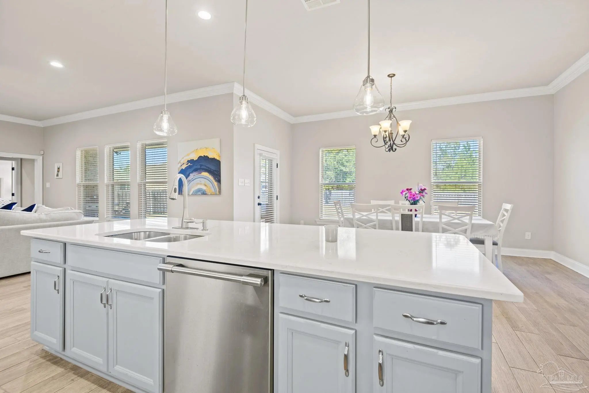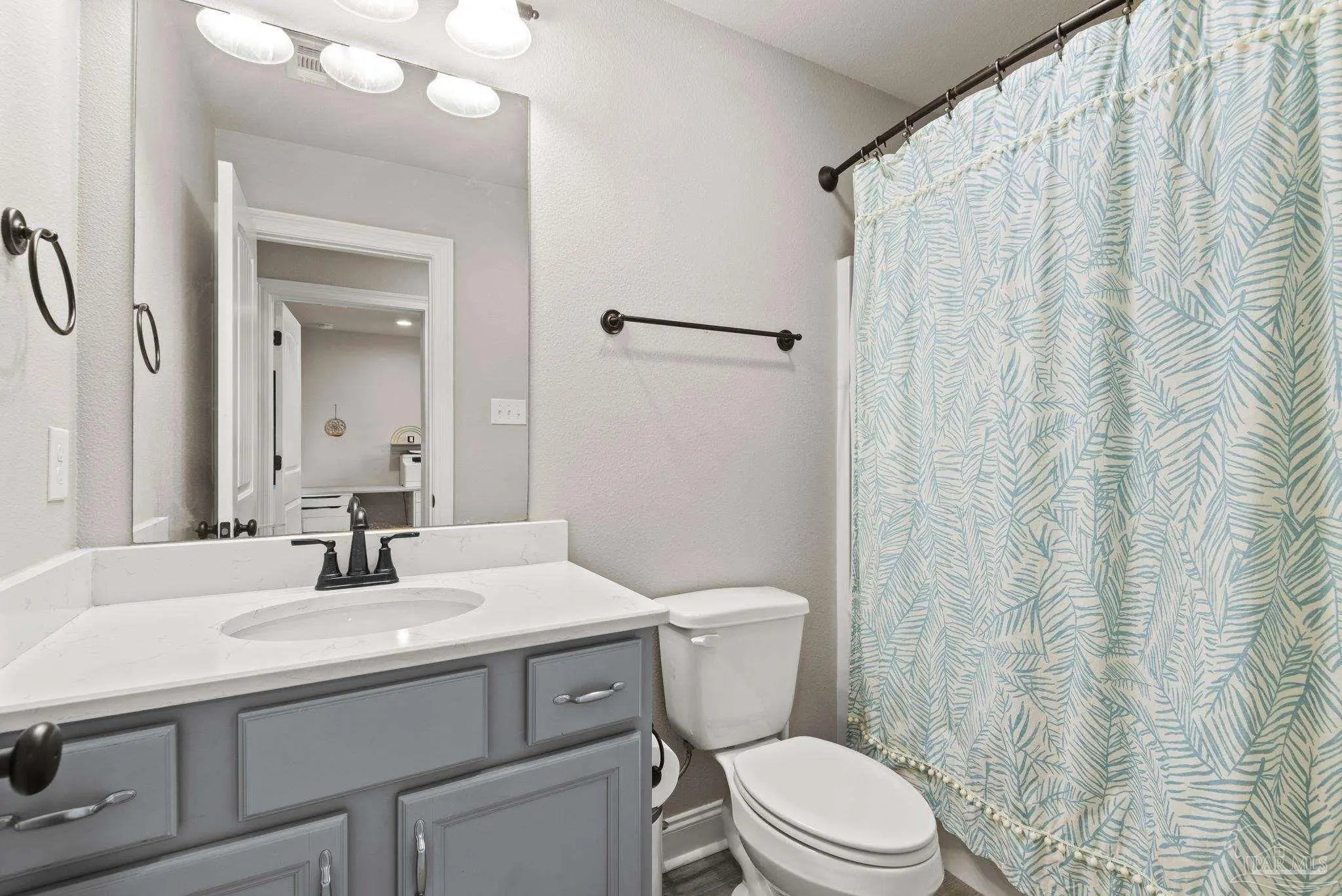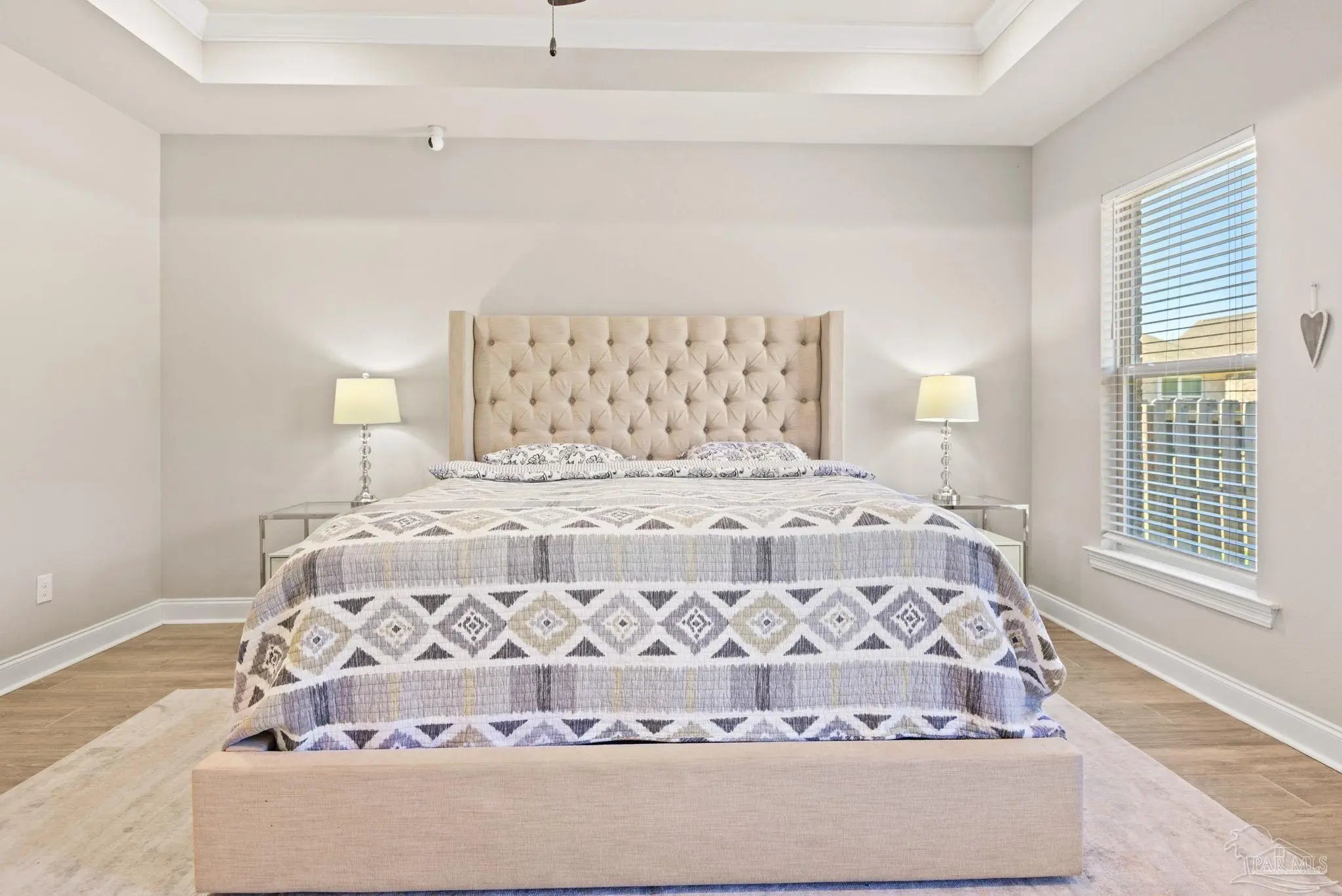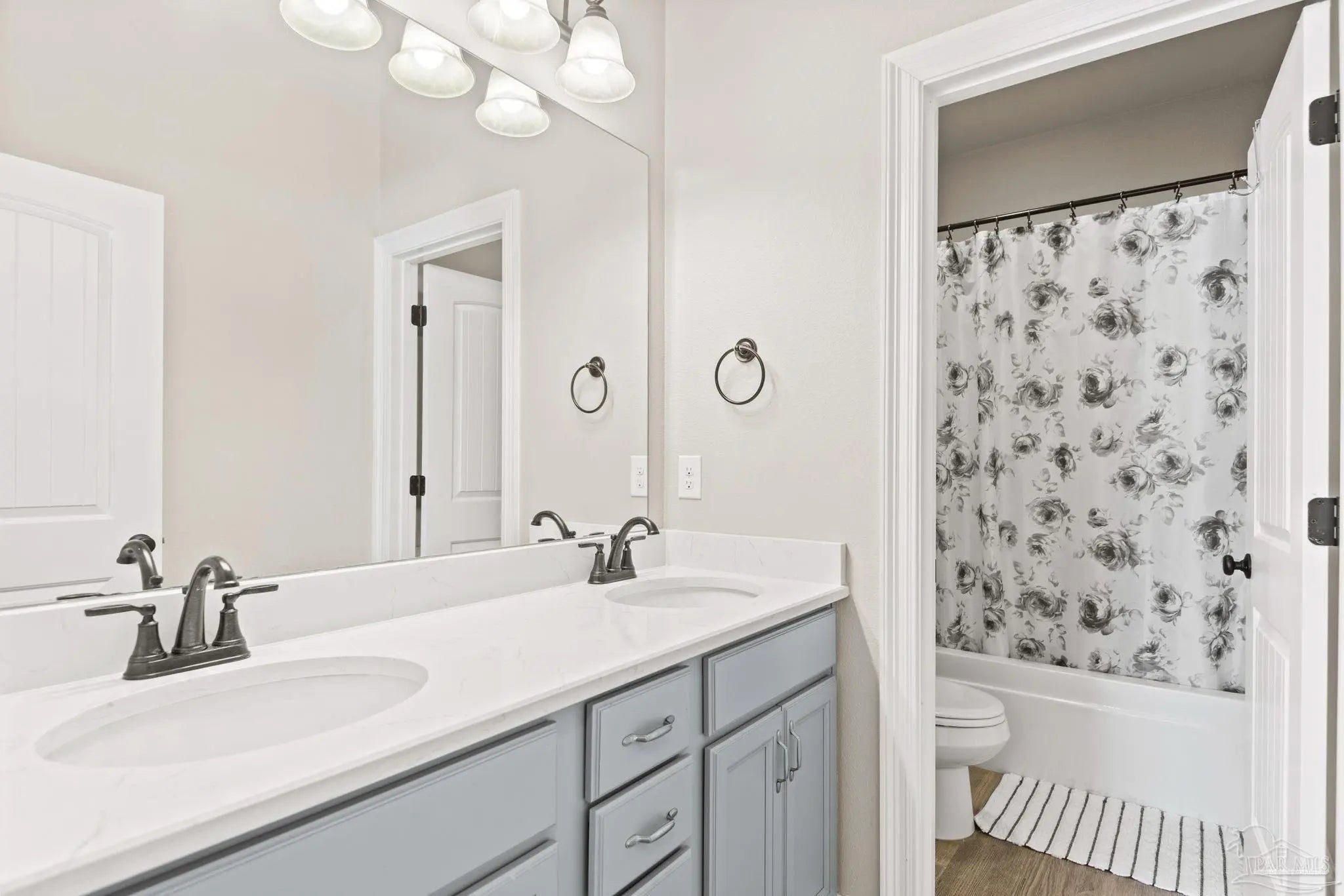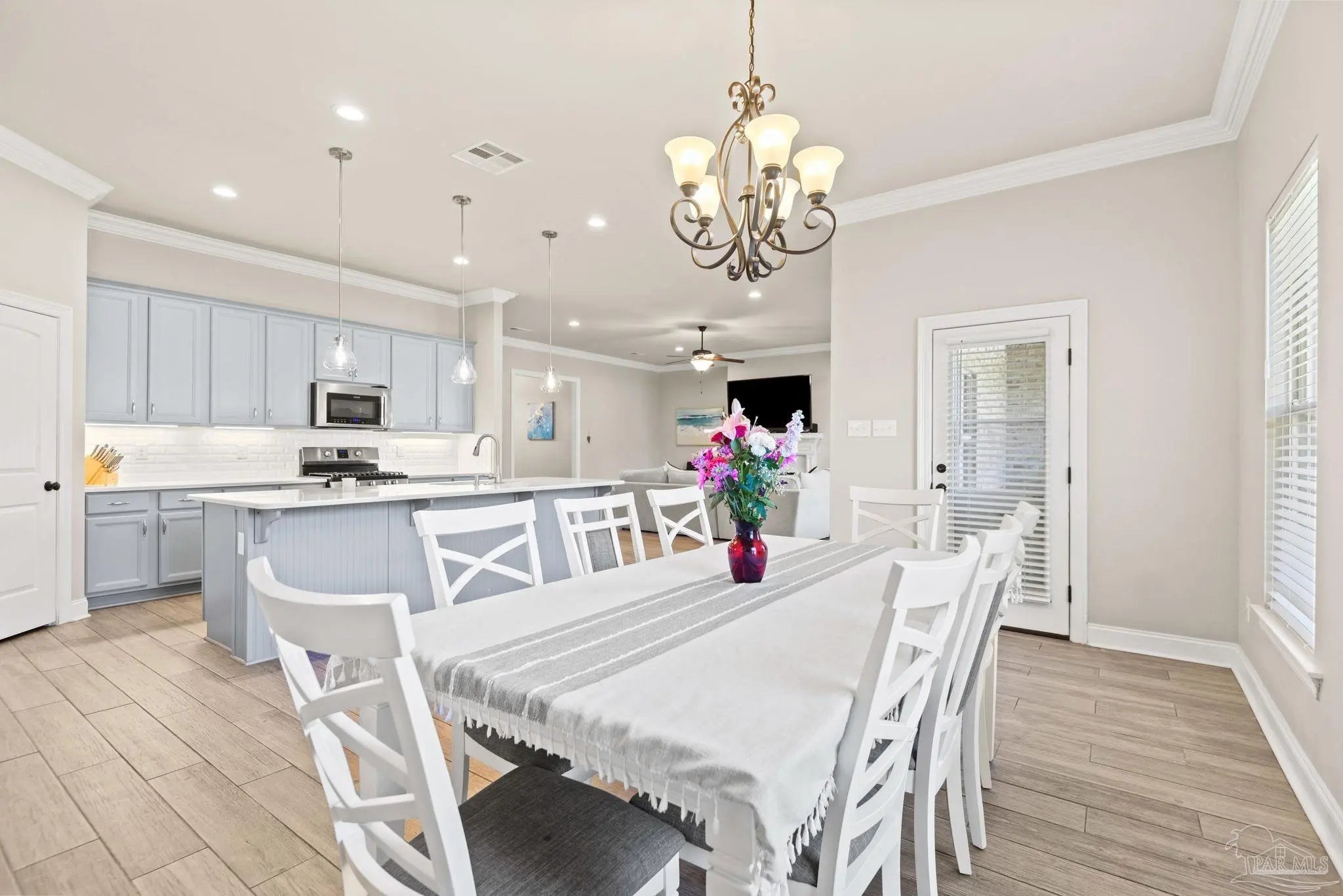 May I have the pleasure of presenting this very attractive and well-kept five-bedroom, three-bath gem tucked away in the welcoming Hawthorne Grove neighborhood of Beulah! This commanding residence is absolutely gorgeous and will check all your boxes. With over 3,000+ square feet of well-designed spaces, appealing color palettes, modern accents, and abundant natural light throughout, this home is perfect for comfort, style, and entertaining. As you step inside, high ceilings wrapped in crown molding greet you, with beautiful wood-look tile that flows into the massive grand room featuring a gas fireplace. The chef’s kitchen is a highlight, showcasing an oversized island, polished quartz countertops, stainless steel appliances, gas range, ceramic tile backsplash, and an abundance of wood cabinetry with under mount lighting. The private master suite serves as a perfect sanctuary, boasting a primary bath with wrap-around double corner vanity sinks, a walk-in tile shower, a garden soaking tub, and a walk-through closet that connects to the laundry room for convenience. The three secondary bedrooms, all generously sized with spacious closets, are located across the home. On the second level, an enormous bonus area offers flexibility as a home gym, office, man-cave, or playroom. The fifth bedroom upstairs, with a walk-in closet and full bath, is secluded and perfect for visiting guests. Step outside under the shaded, covered lanai to enjoy the wide-open backyard, ideal for outdoor dining, gardening, and family fun. Additional features include no rear neighbors, paid-for solar panels (average monthly electric bill $30), hurricane door & window protection, rain gutters, privacy fence, landscape irrigation, tankless gas water heater, and a transferable termite bond. Top-rated schools, parks, shopping, dining, stunning sugar-white beaches, and military installations are all easily accessible. Welcome Home!