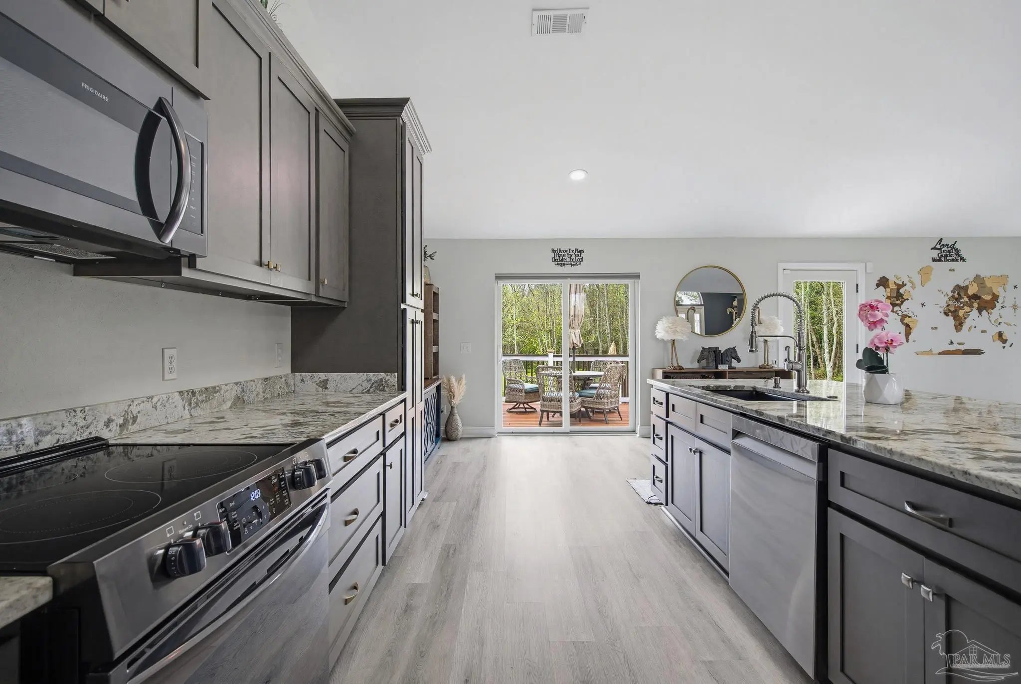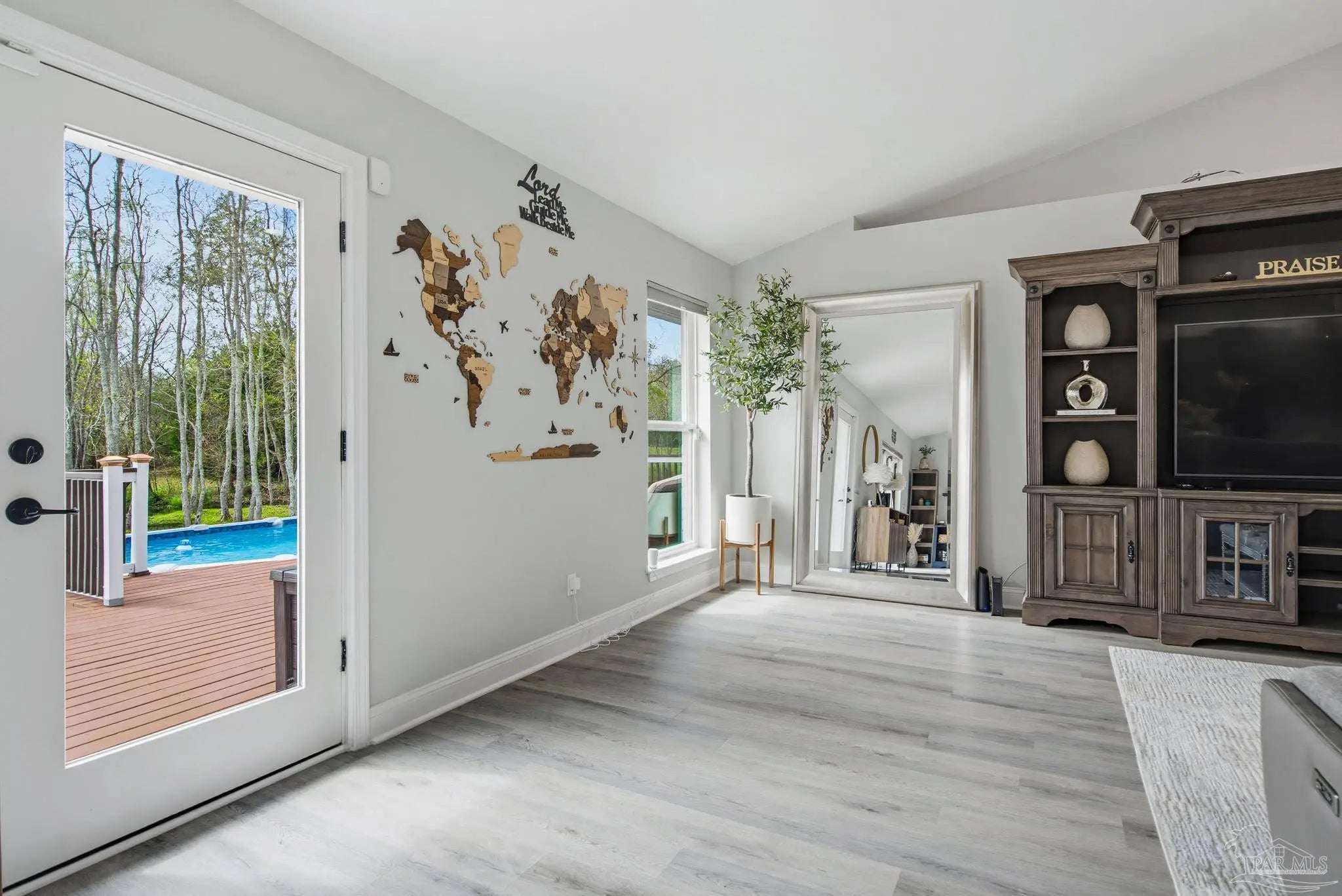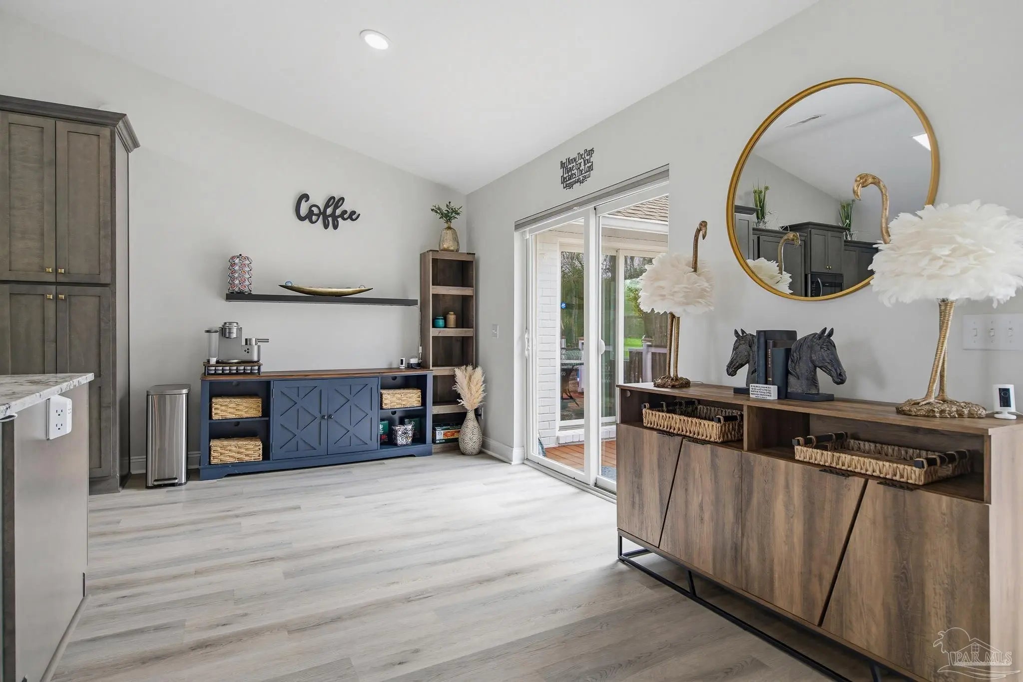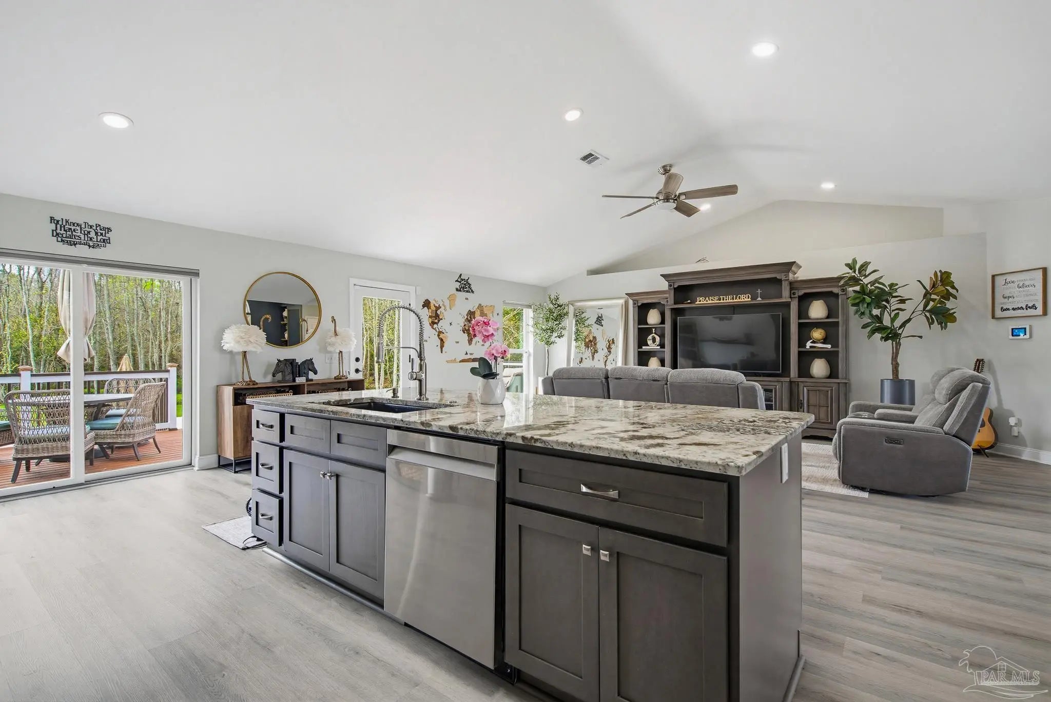 Welcome to this stunning, remodeled home on 2.09 acres in the desirable Meander Farms subdivision, offering privacy and a peaceful setting with convenient access to Navy Federal, I-10, shopping, and dining. This 4-bedroom, 2.5-bathroom home features designer paint colors, architectural details such as arched windows, and a thoughtfully designed split floor plan. Natural light fills the main living areas, where luxury vinyl plank flooring, vaulted ceilings, and recessed lighting create a bright and inviting atmosphere. The living and dining spaces flow seamlessly into the kitchen, providing an ideal layout for both everyday living and entertaining. The kitchen blends style and functionality with granite countertops, Espresso shaker-style cabinetry, stainless steel appliances, contemporary hardware, and a center island with breakfast bar seating. The primary suite offers a comfortable retreat with double vanities featuring granite countertops, a spacious tiled shower, and a walk-in closet. Additional bedrooms are positioned on the opposite side of the home and share a full bathroom, offering flexibility for guests, a home office, or additional living needs. Step outside to the covered patio overlooking the backyard, where an above-ground pool with decking and surrounding landscaping creates a relaxing outdoor setting. With more than two acres, the property provides plenty of room to unwind, host gatherings, or simply enjoy the quiet of country living while enjoying the backyard creek with swans, turtles, and geese, and still remaining close to town. Additional highlights include an oversized three-car garage with space for the outdoor enthusiast's gear and a roof replaced in 2021 for added peace of mind.