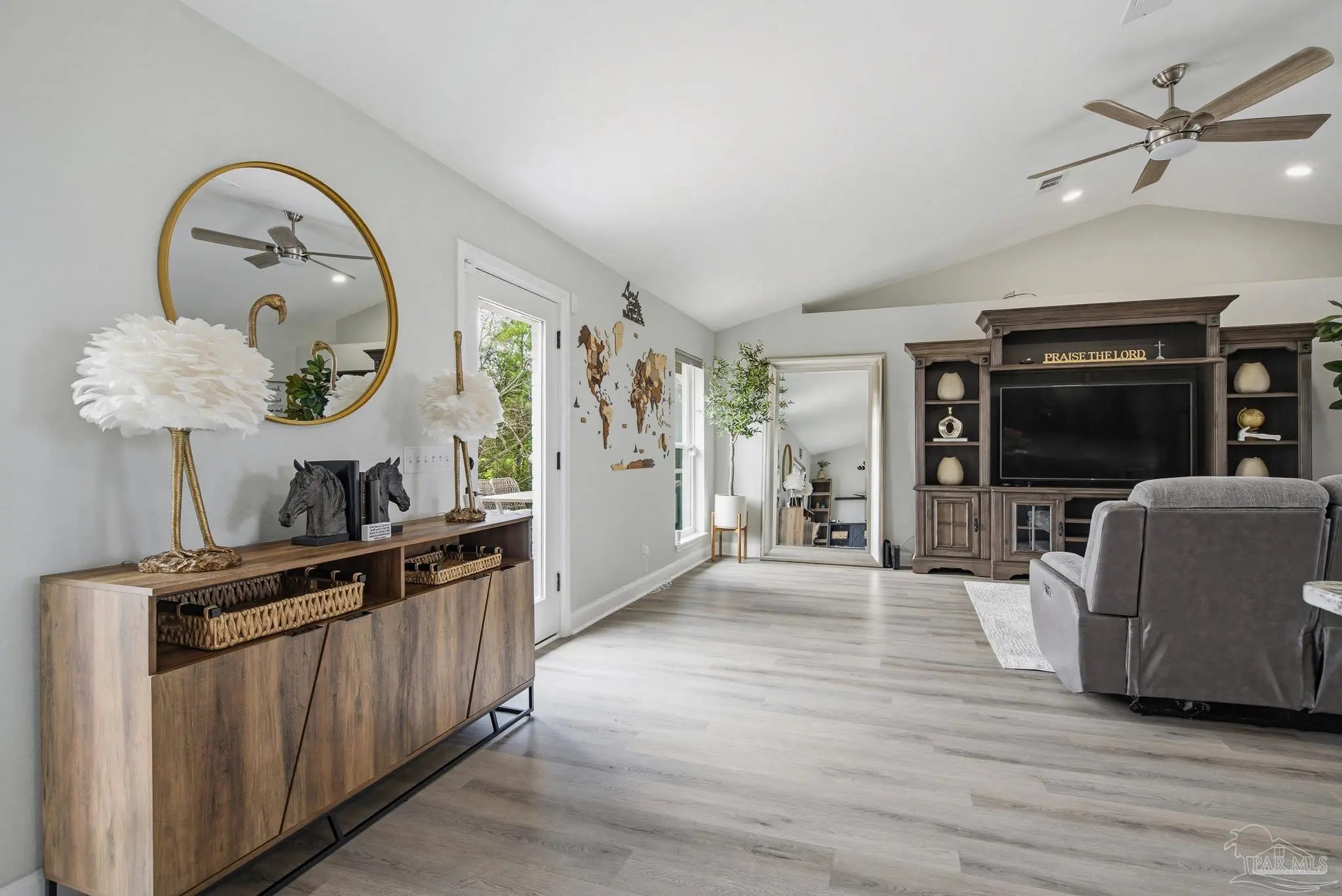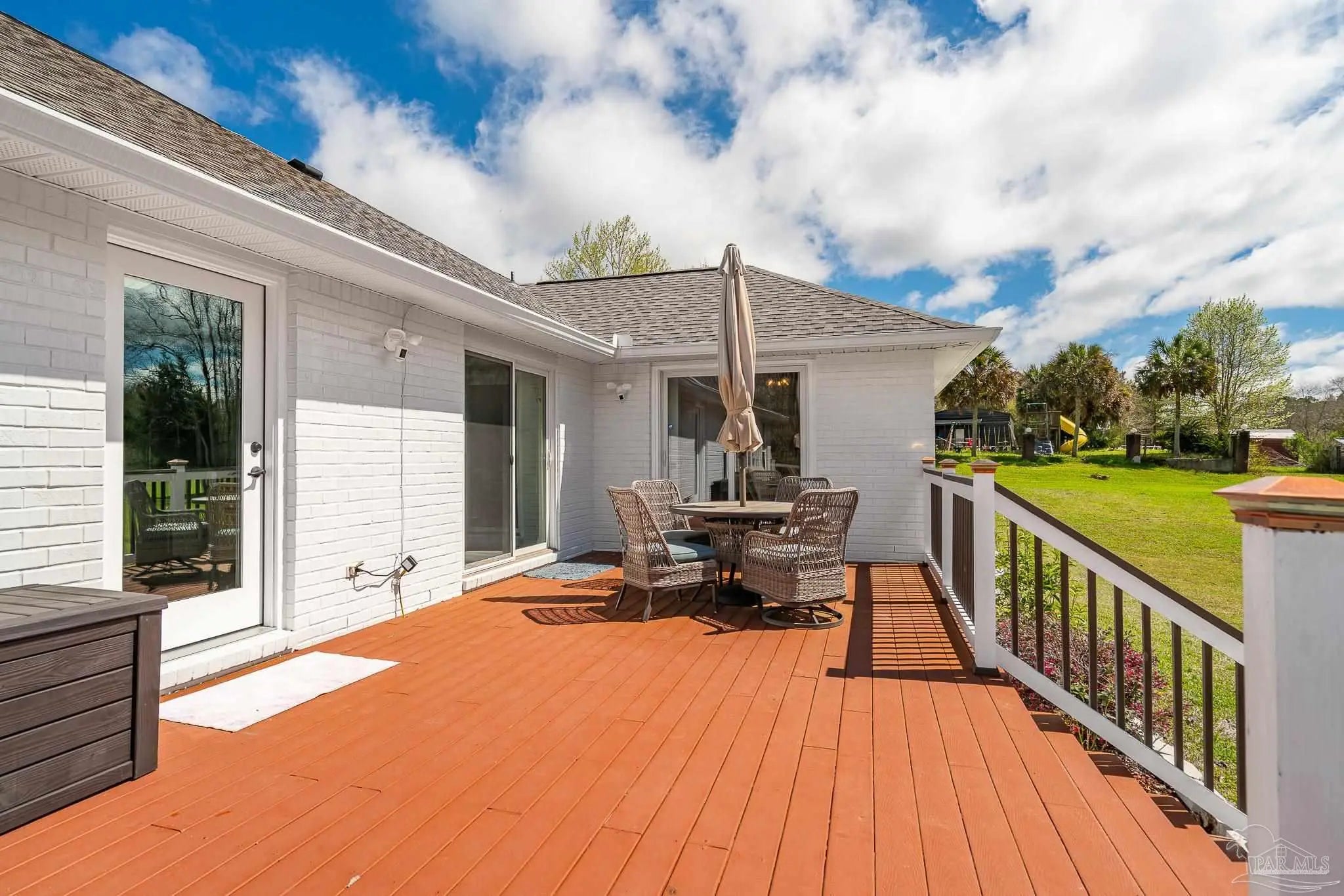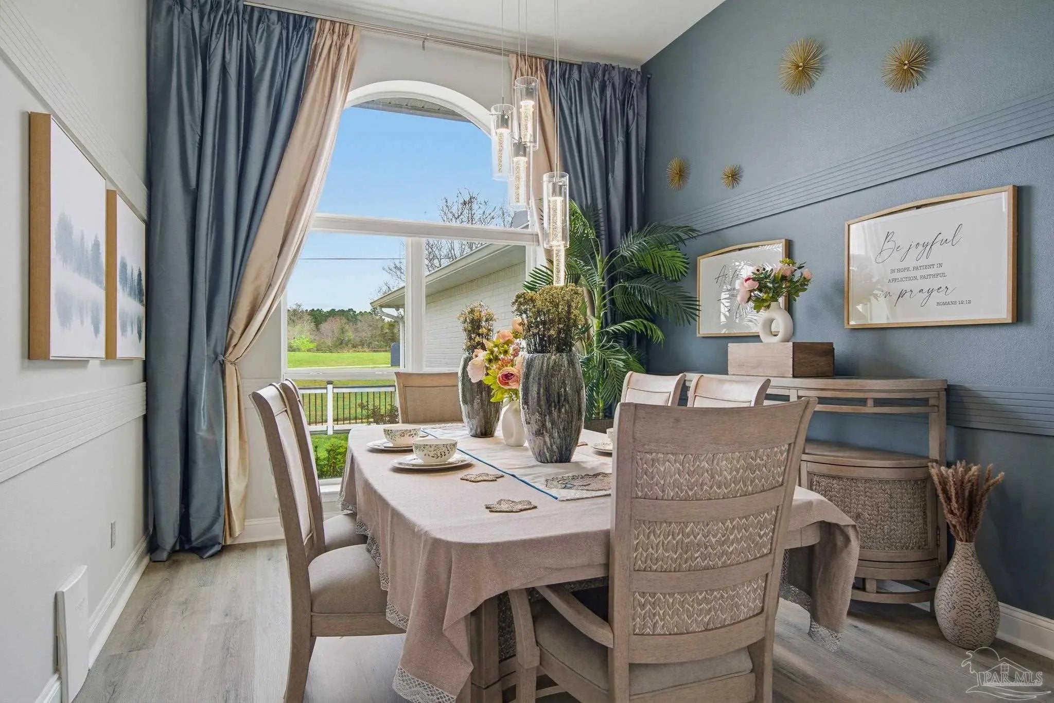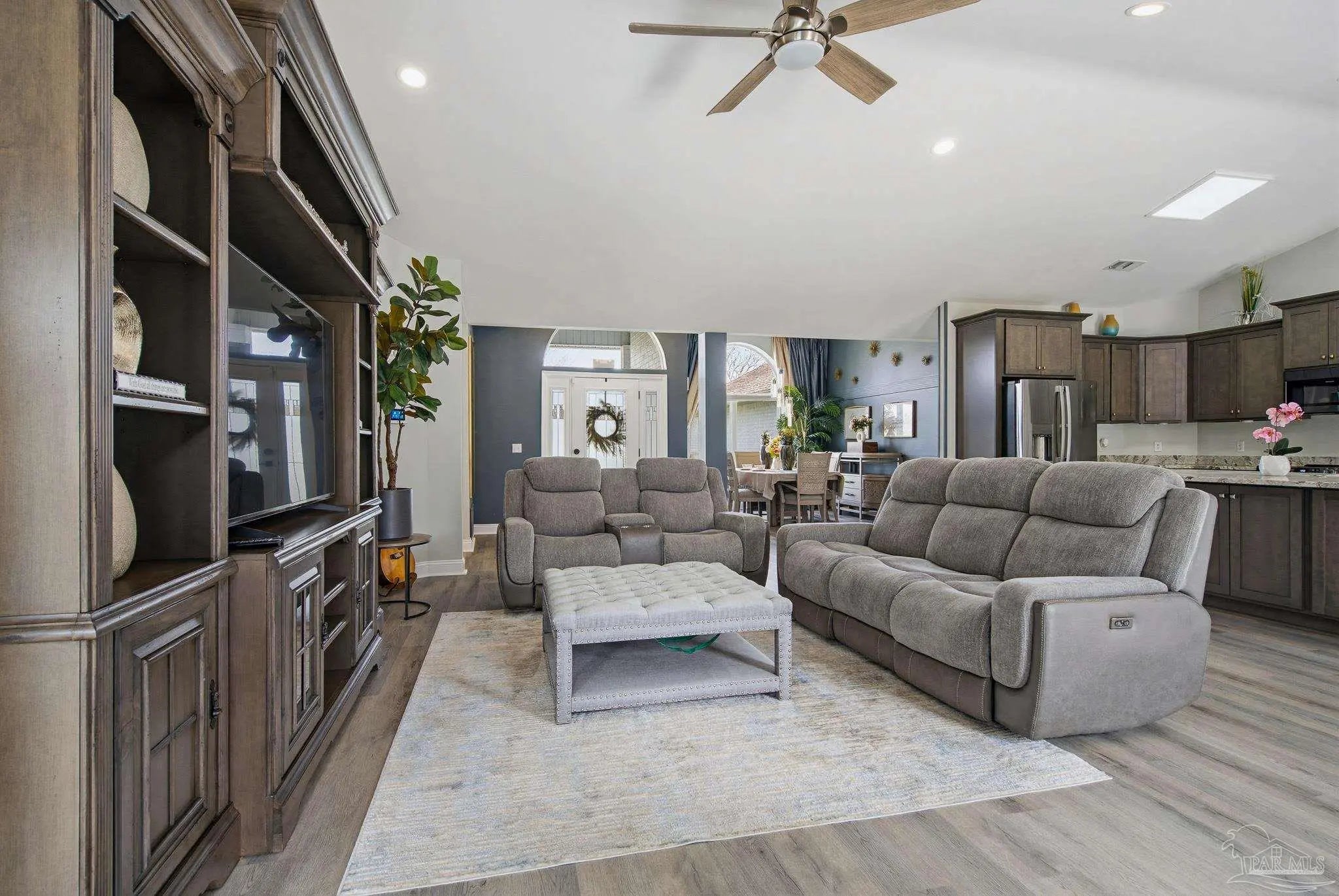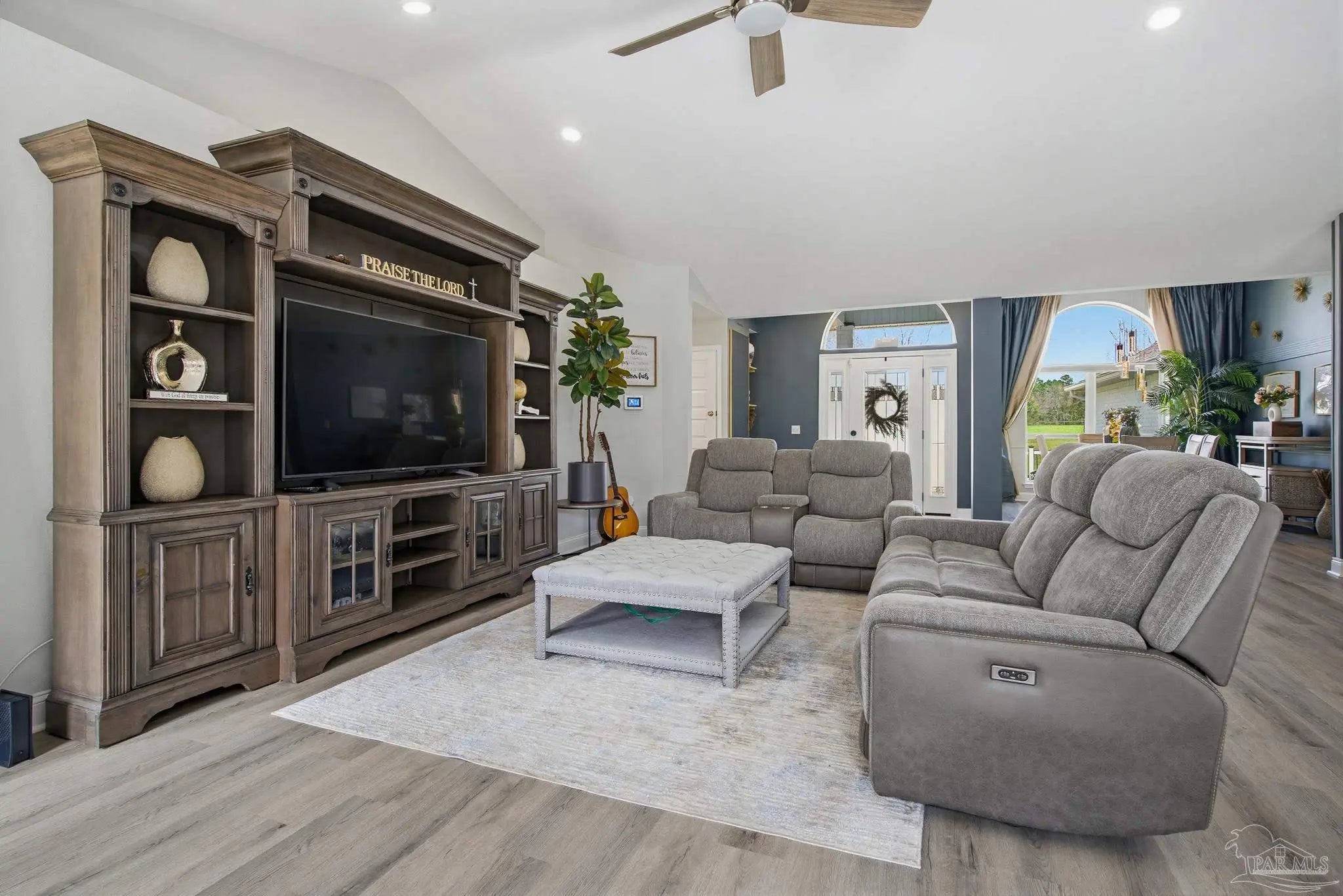 Welcome to this stunning, remodeled home on 2.09 acres in the desirable Meander Farms subdivision, offering privacy and a peaceful setting with convenient access to Navy Federal, I-10, shopping, and dining. This 4-bedroom, 2.5-bathroom home features designer paint colors, architectural details such as arched windows, and a thoughtfully designed split floor plan. Natural light fills the main living areas, where luxury vinyl plank flooring, vaulted ceilings, and recessed lighting create a bright and inviting atmosphere. The living and dining spaces flow seamlessly into the kitchen, providing an ideal layout for both everyday living and entertaining. The kitchen blends style and functionality with granite countertops, Espresso shaker-style cabinetry, stainless steel appliances, contemporary hardware, and a center island with breakfast bar seating. The primary suite offers a comfortable retreat with double vanities featuring granite countertops, a spacious tiled shower, and a walk-in closet. Additional bedrooms are positioned on the opposite side of the home and share a full bathroom, offering flexibility for guests, a home office, or additional living needs. Step outside to the covered patio overlooking the backyard, where an above-ground pool with decking and surrounding landscaping creates a relaxing outdoor setting. With more than two acres, the property provides plenty of room to unwind, host gatherings, or simply enjoy the quiet of country living while enjoying the backyard creek with swans, turtles, and geese, and still remaining close to town. Additional highlights include an oversized three-car garage with space for the outdoor enthusiast's gear and a roof replaced in 2021 for added peace of mind.
