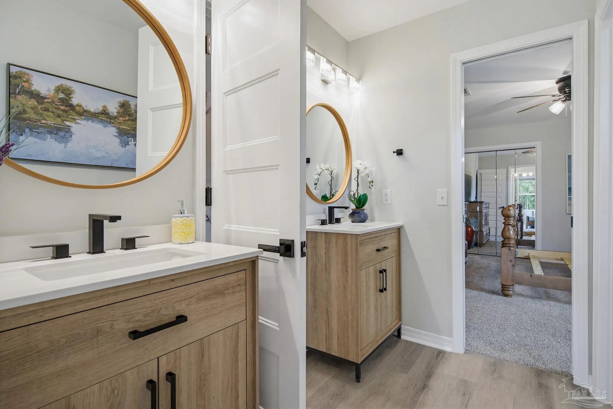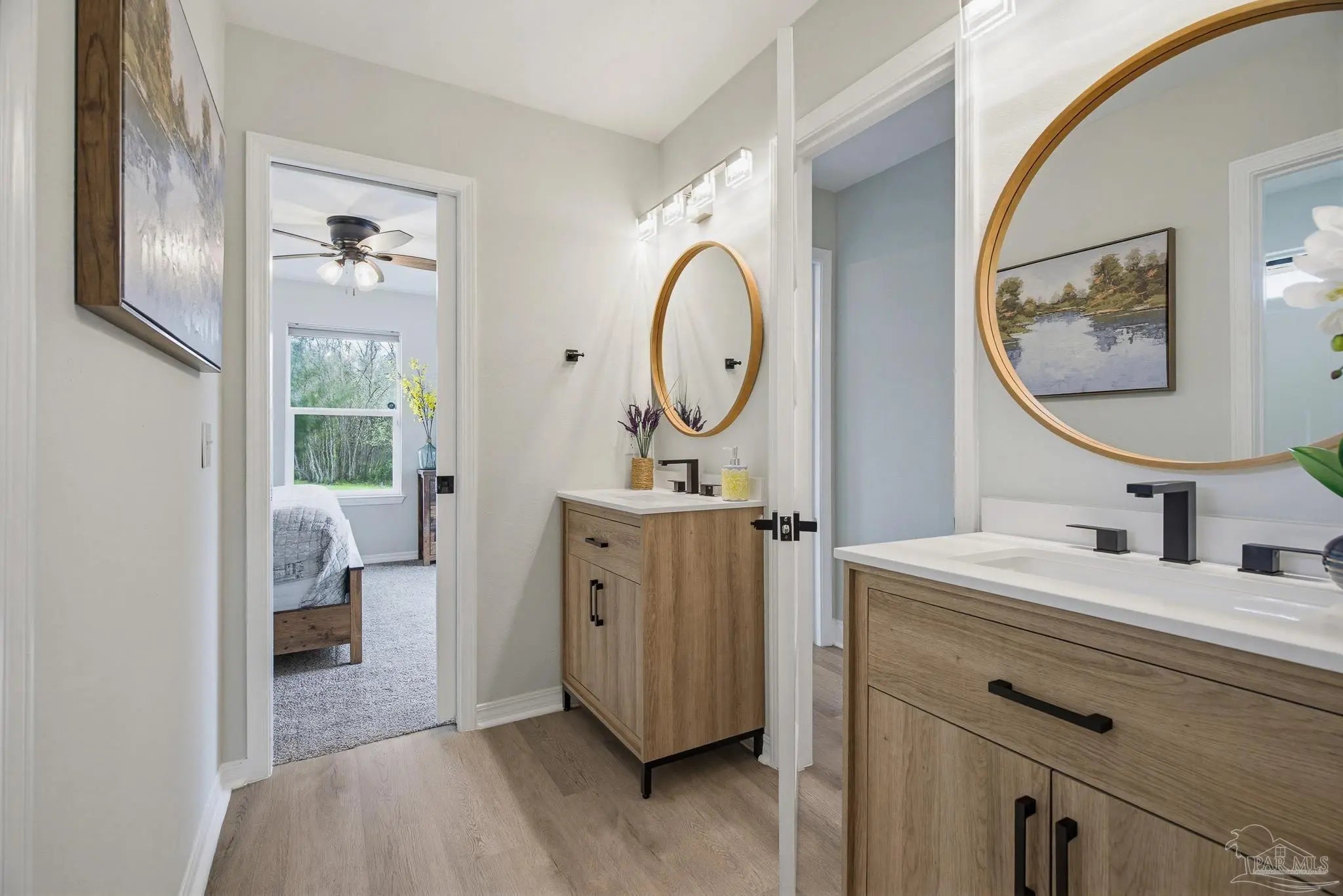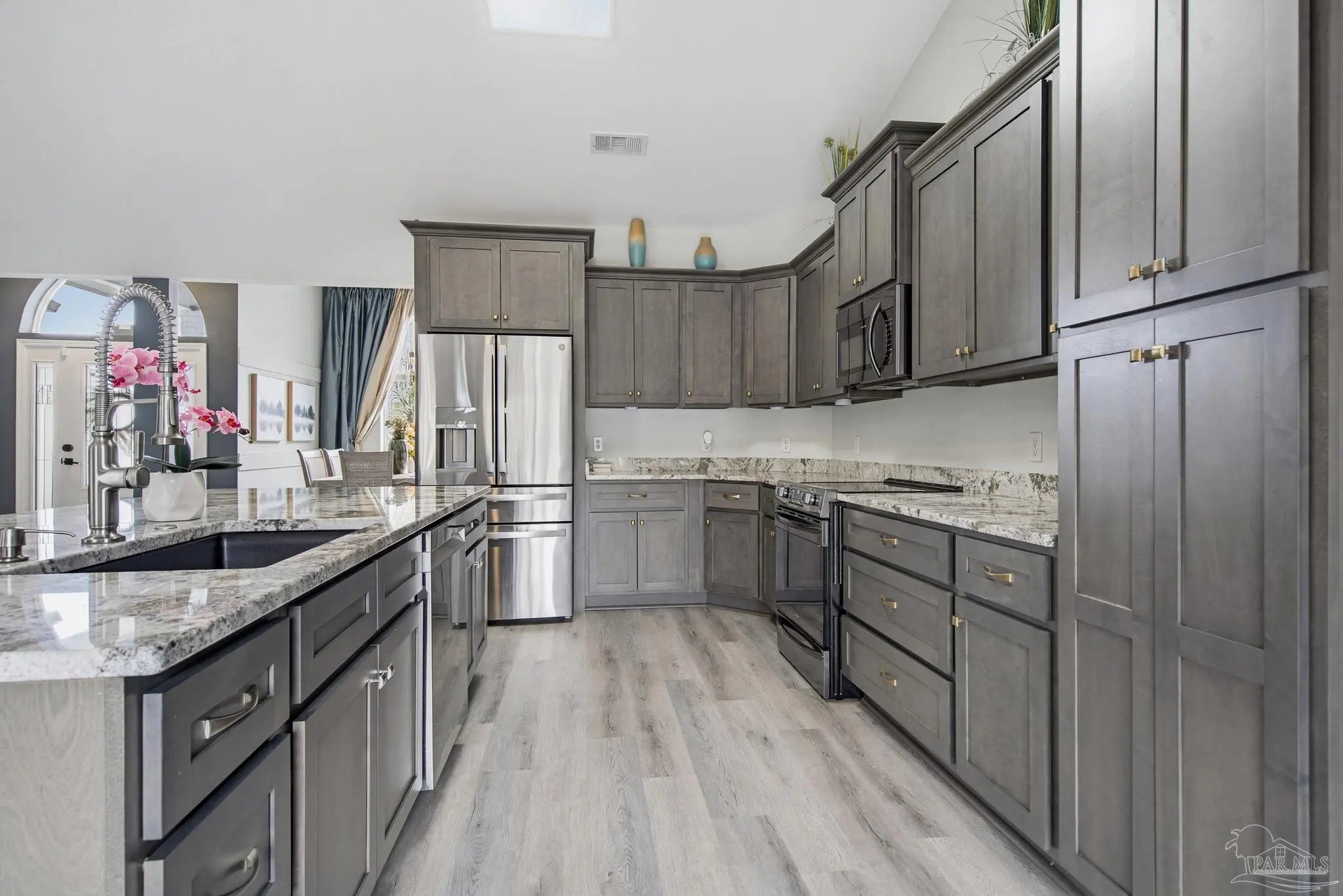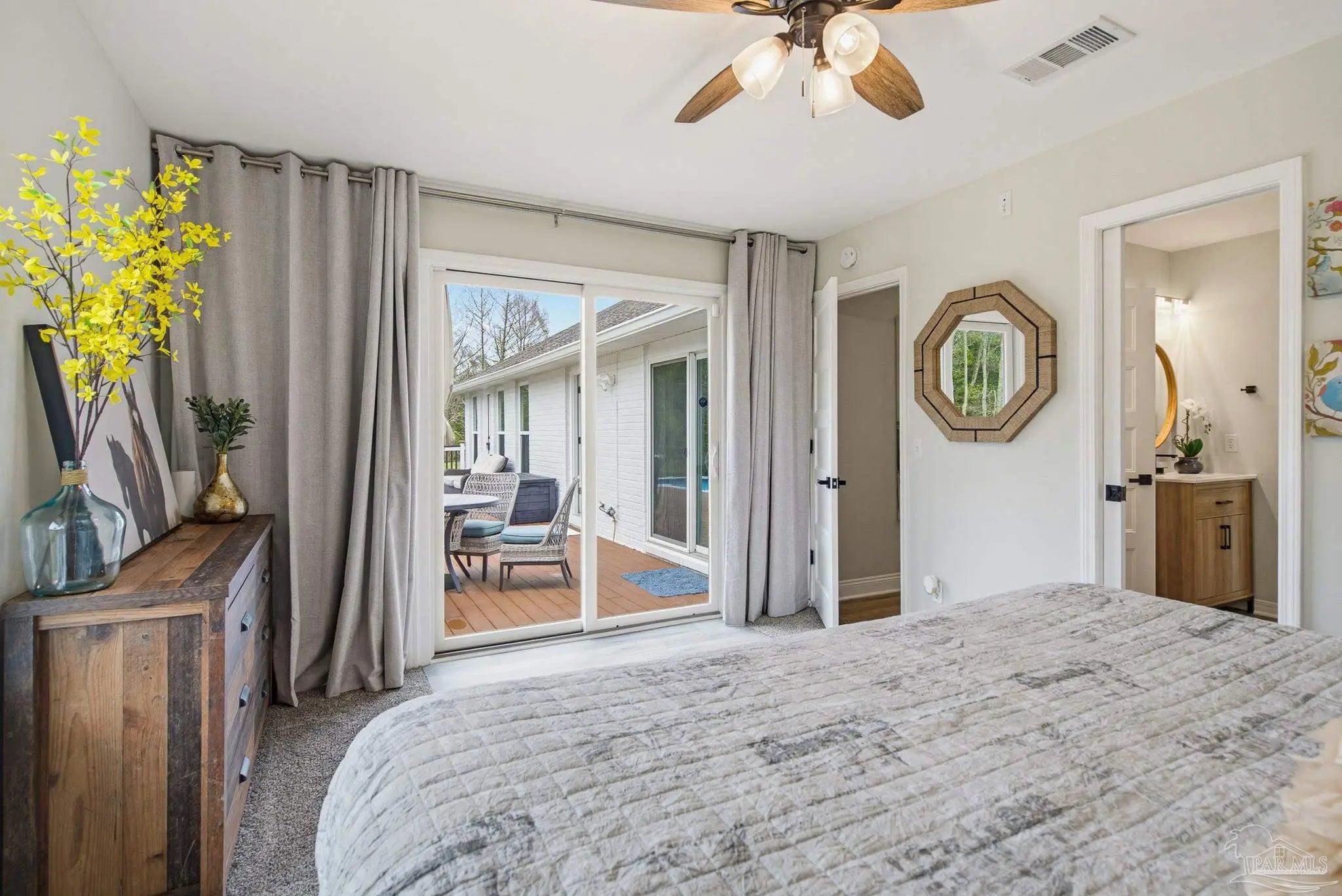 Welcome to this stunning, remodeled home on 2.09 acres in the desirable Meander Farms subdivision, offering privacy and a peaceful setting with convenient access to Navy Federal, I-10, shopping, and dining. This 4-bedroom, 2.5-bathroom home features designer paint colors, architectural details such as arched windows, and a thoughtfully designed split floor plan. Natural light fills the main living areas, where luxury vinyl plank flooring, vaulted ceilings, and recessed lighting create a bright and inviting atmosphere. The living and dining spaces flow seamlessly into the kitchen, providing an ideal layout for both everyday living and entertaining. The kitchen blends style and functionality with granite countertops, Espresso shaker-style cabinetry, stainless steel appliances, contemporary hardware, and a center island with breakfast bar seating. The primary suite offers a comfortable retreat with double vanities featuring granite countertops, a spacious tiled shower, and a walk-in closet. Additional bedrooms are positioned on the opposite side of the home and share a full bathroom, offering flexibility for guests, a home office, or additional living needs. Step outside to the covered patio overlooking the backyard, where an above-ground pool with decking and surrounding landscaping creates a relaxing outdoor setting. With more than two acres, the property provides plenty of room to unwind, host gatherings, or simply enjoy the quiet of country living while enjoying the backyard creek with swans, turtles, and geese, and still remaining close to town. Additional highlights include an oversized three-car garage with space for the outdoor enthusiast's gear and a roof replaced in 2021 for added peace of mind.